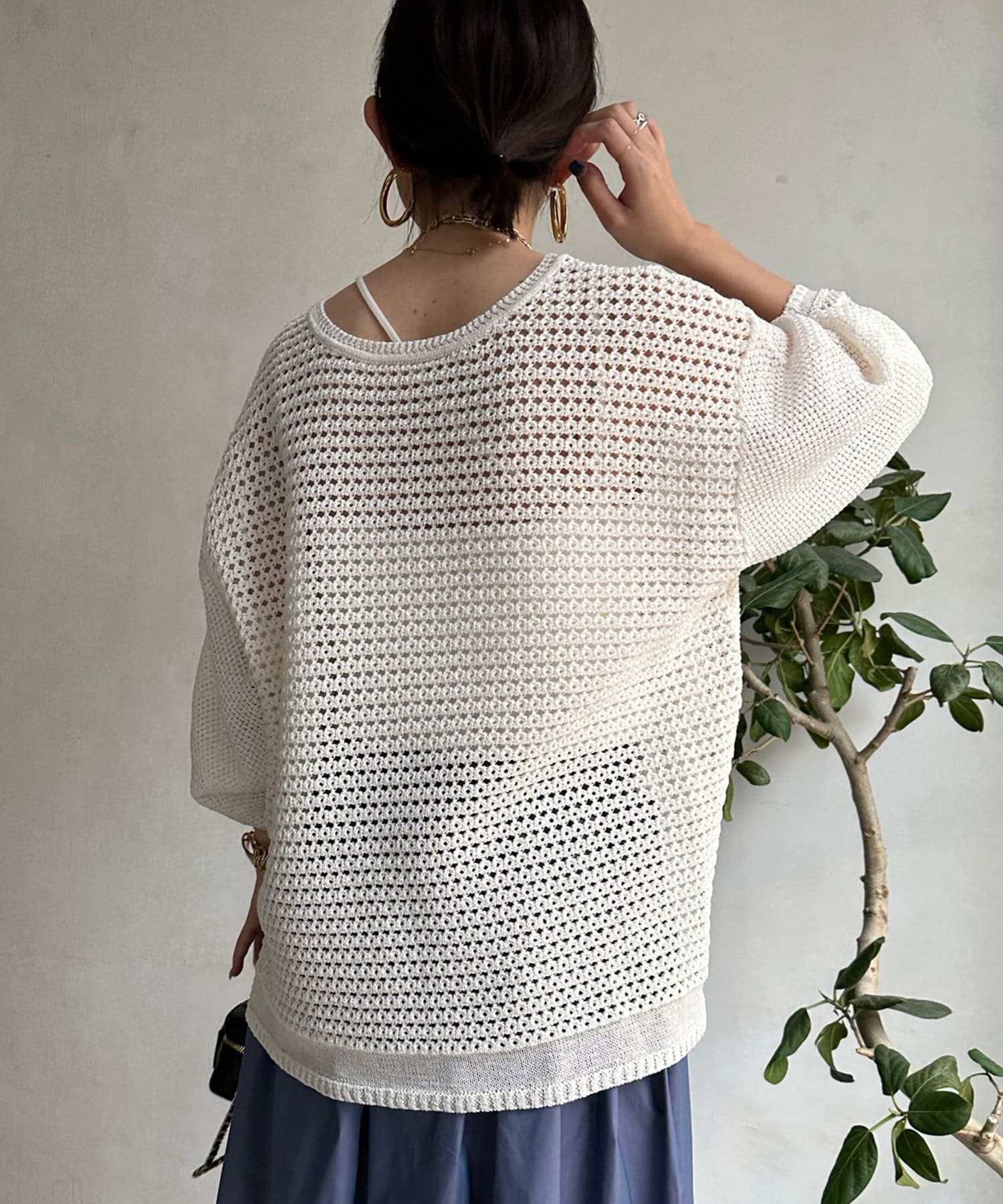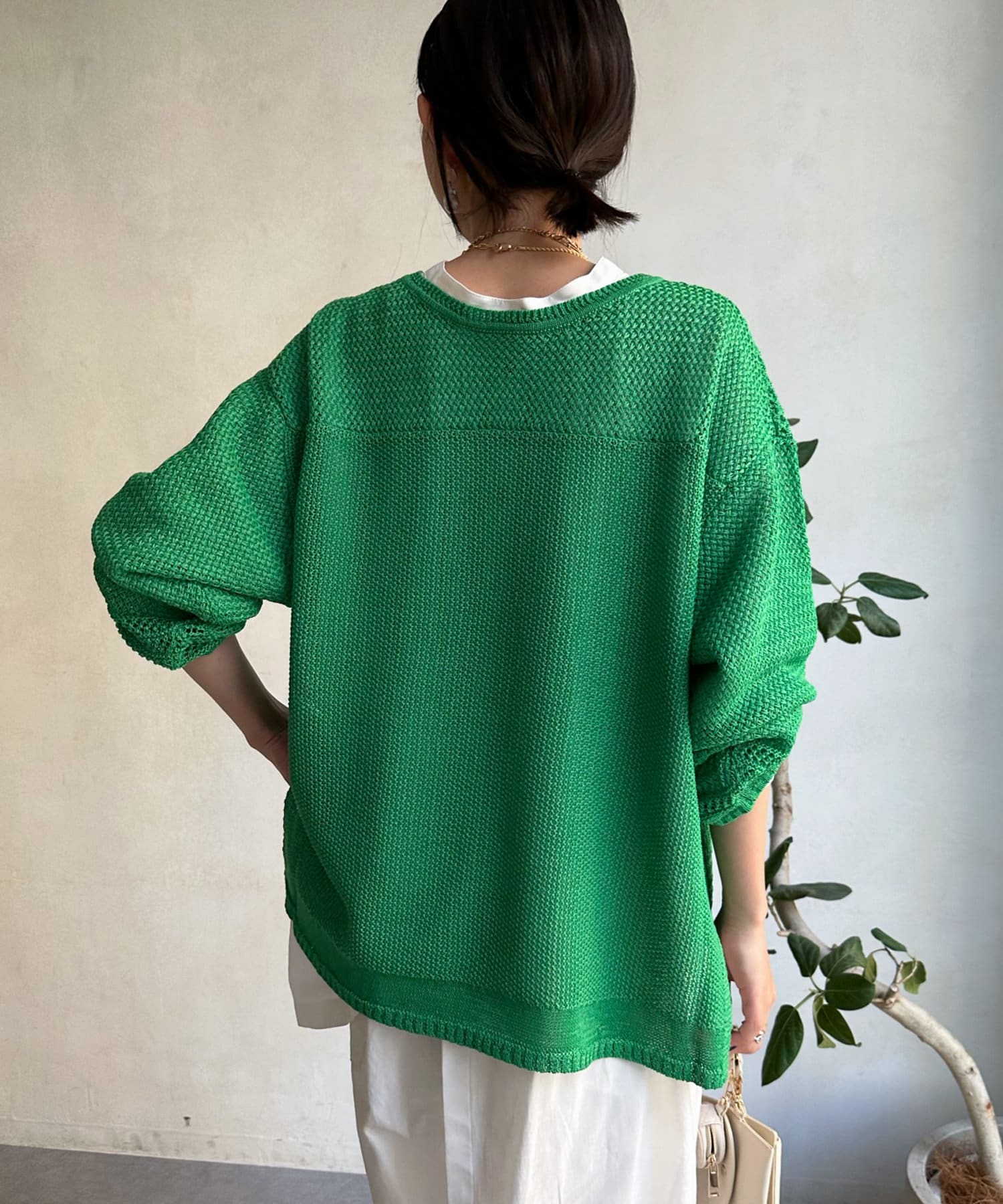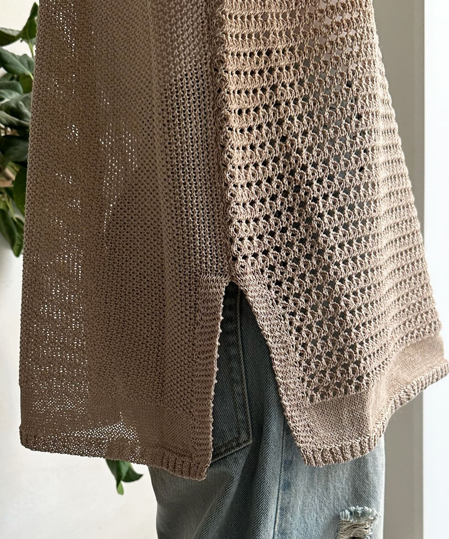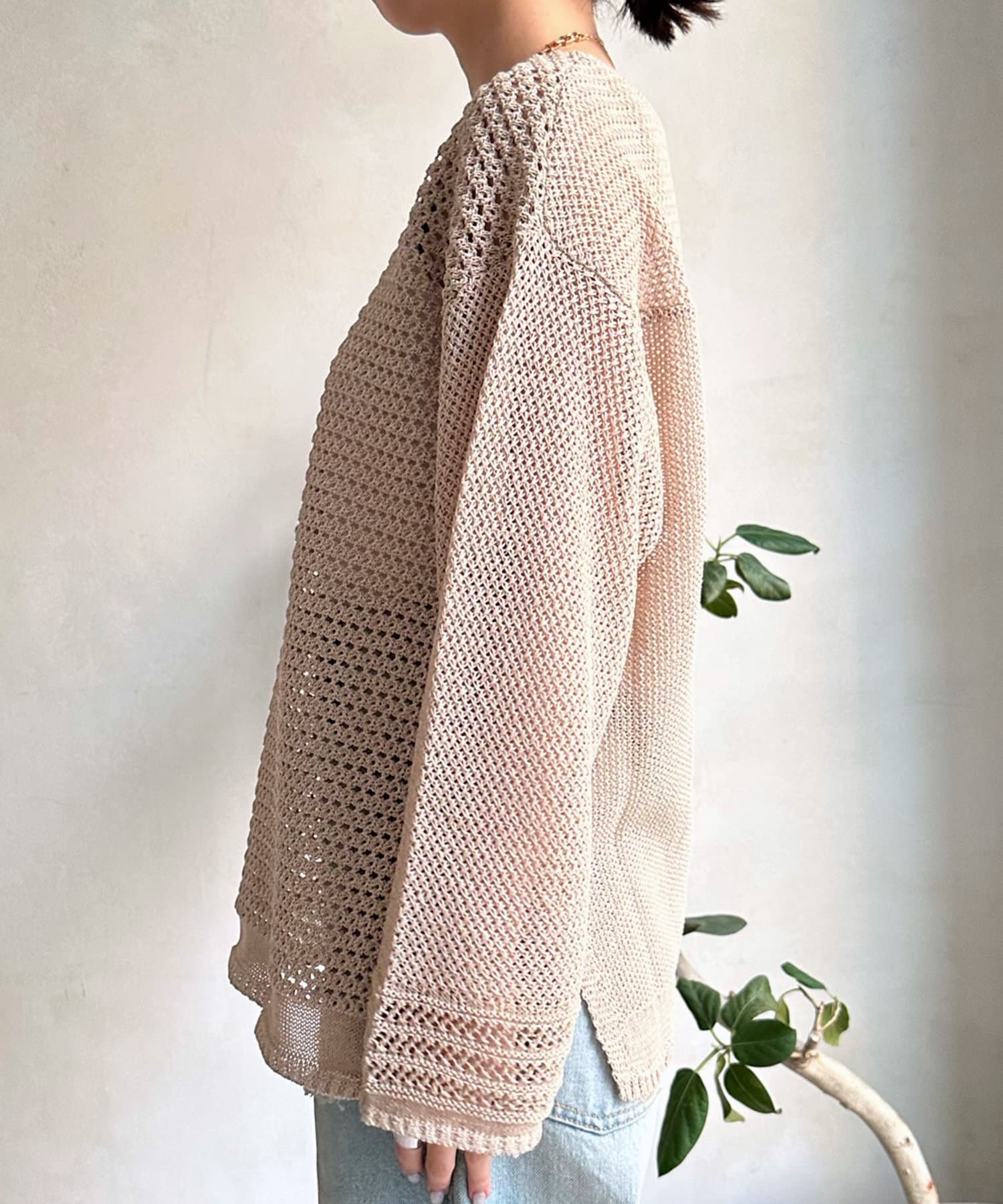 素材は擬痲加工した綿糸を使用し、麻のような清涼感のあるさらりとした肌触りに仕上げました。涼し気でざっくりとした編み地がナチュラルで、夏らしい印象をプラスしてくれます。