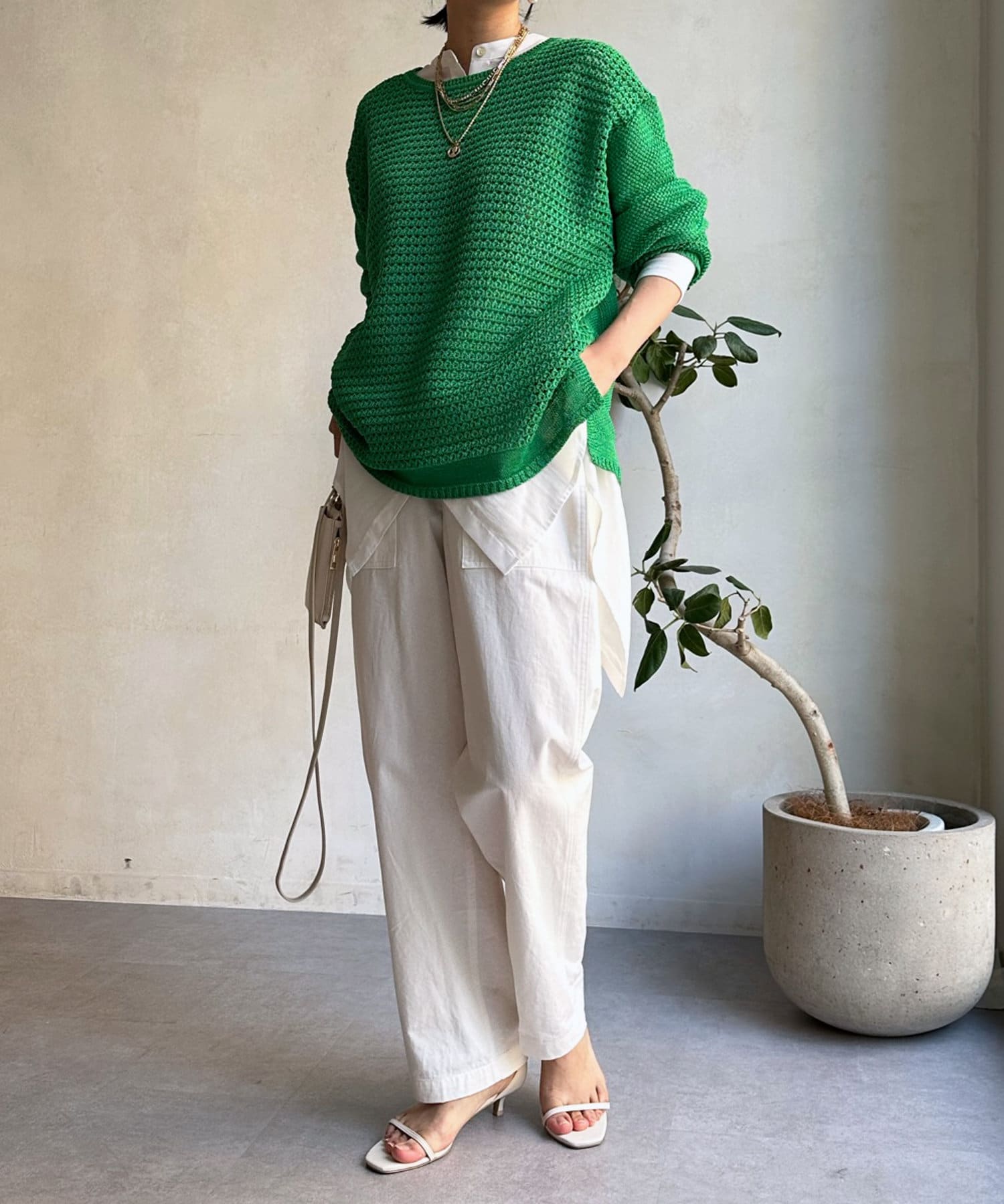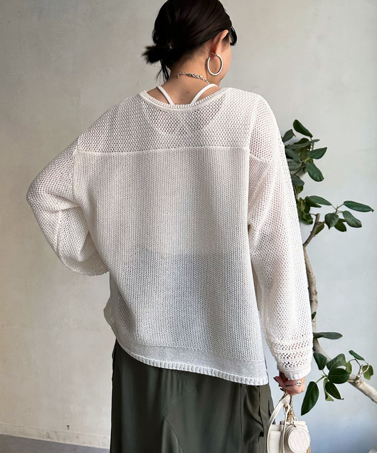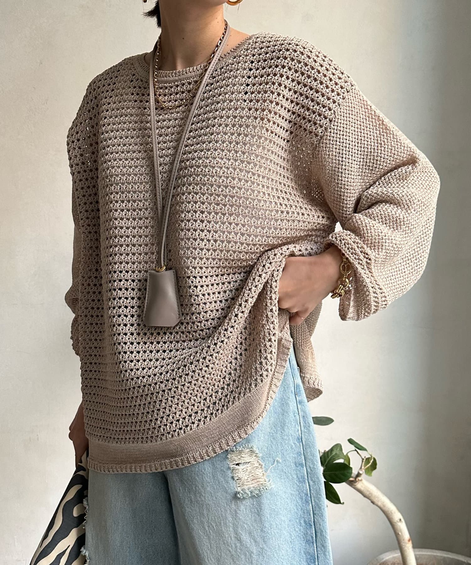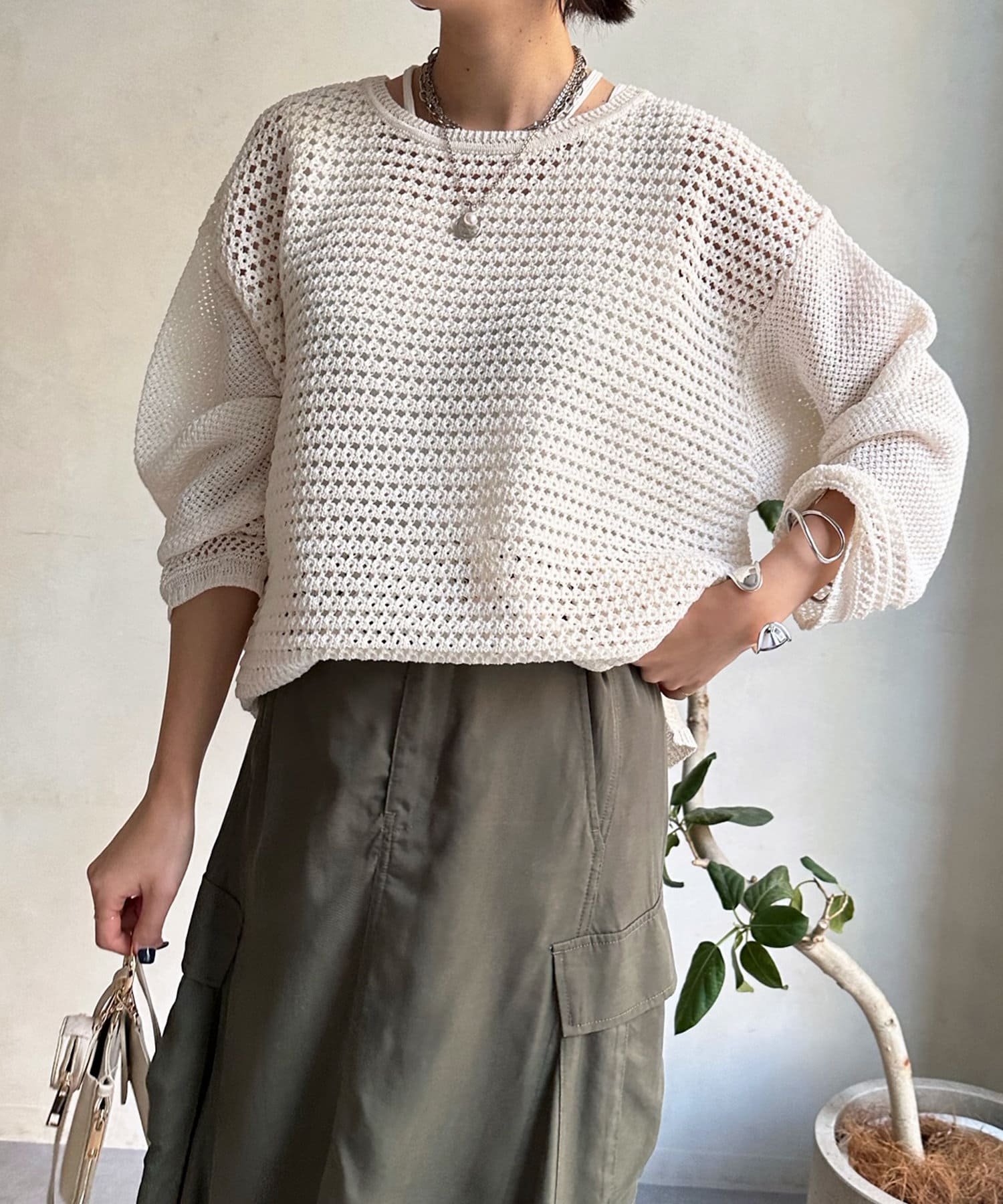 素材は擬痲加工した綿糸を使用し、麻のような清涼感のあるさらりとした肌触りに仕上げました。涼し気でざっくりとした編み地がナチュラルで、夏らしい印象をプラスしてくれます。