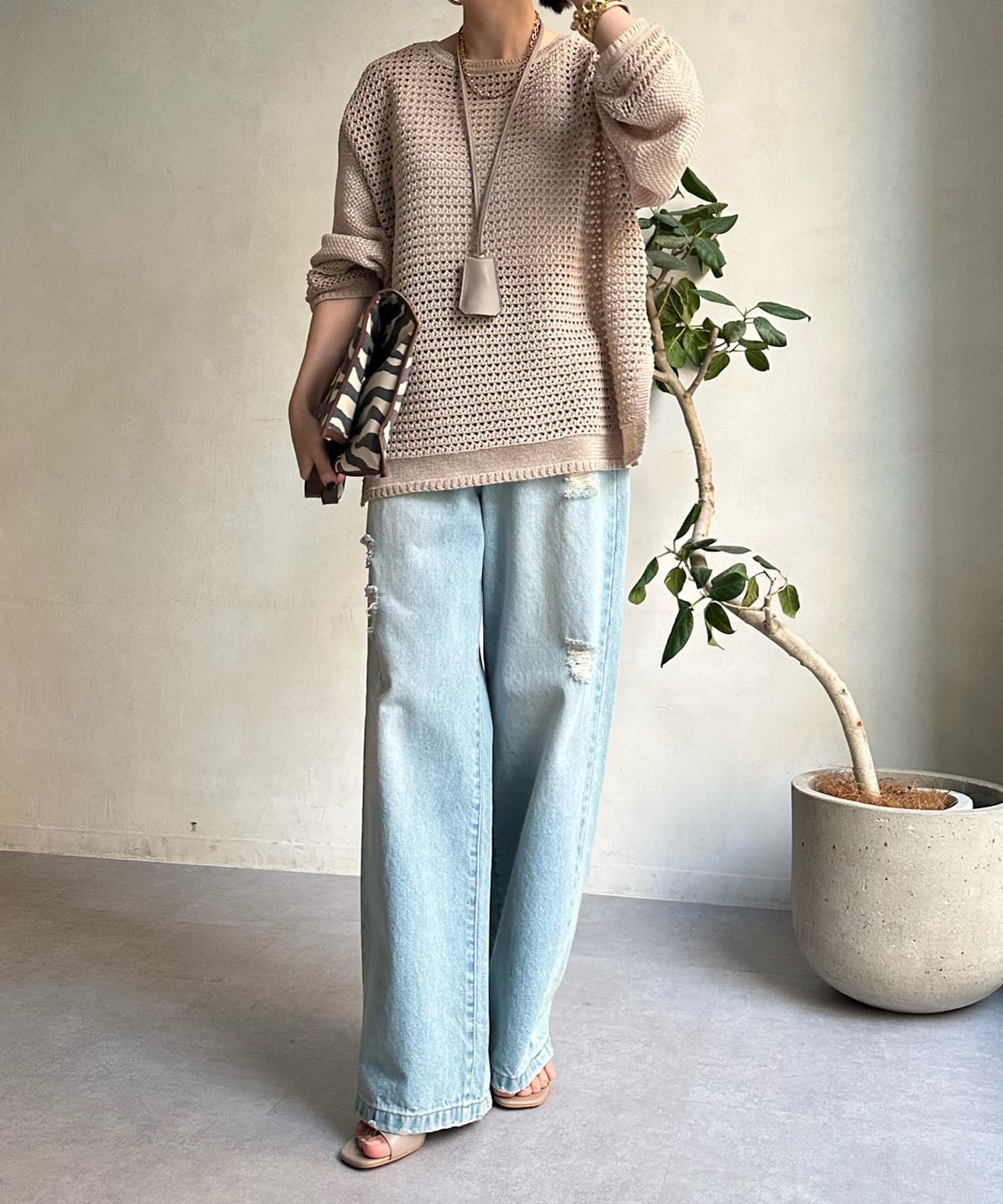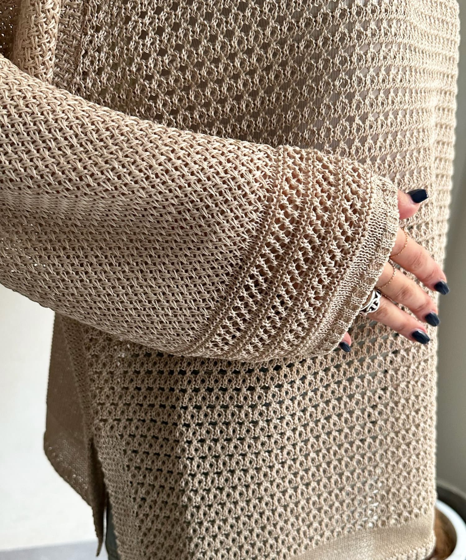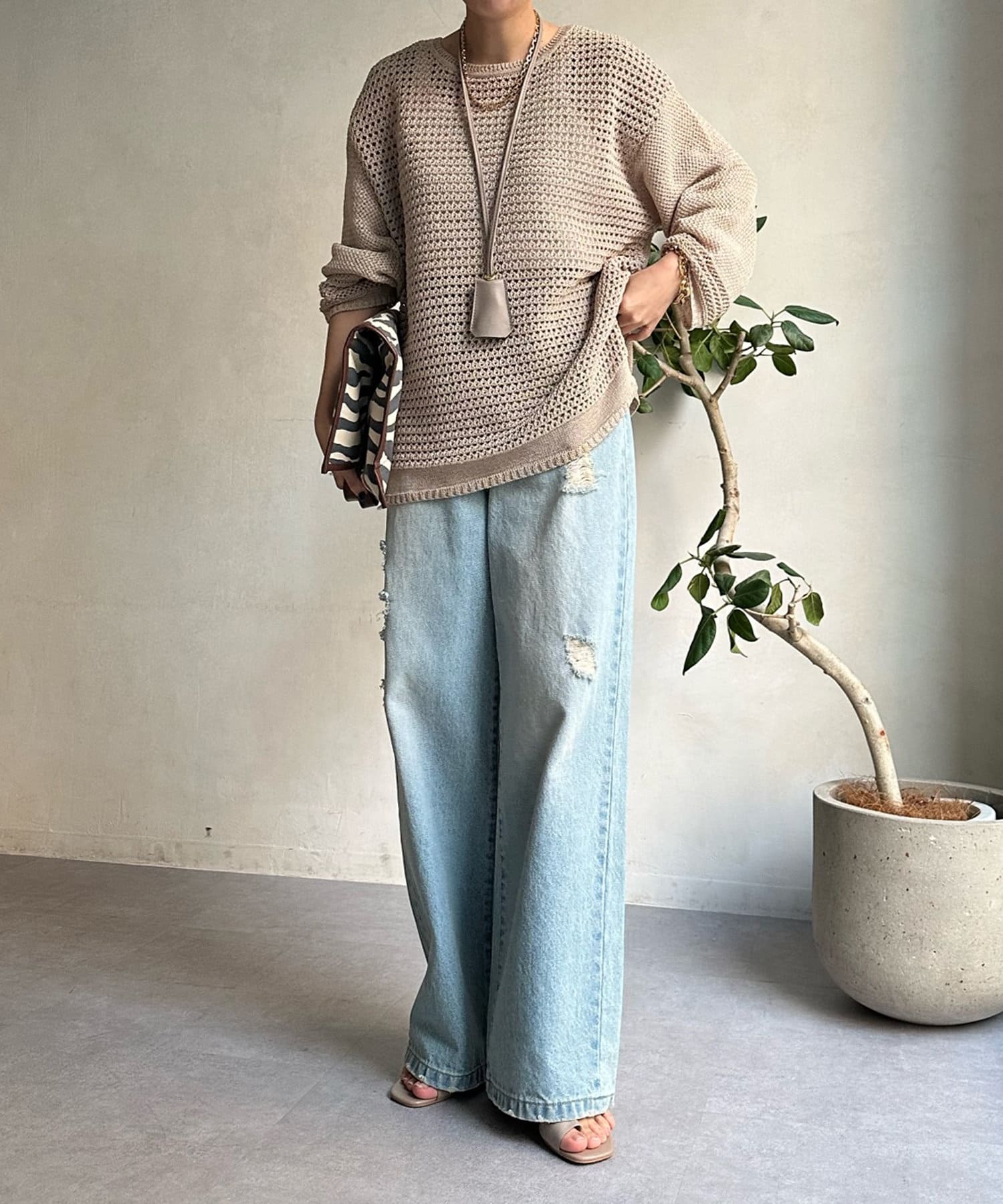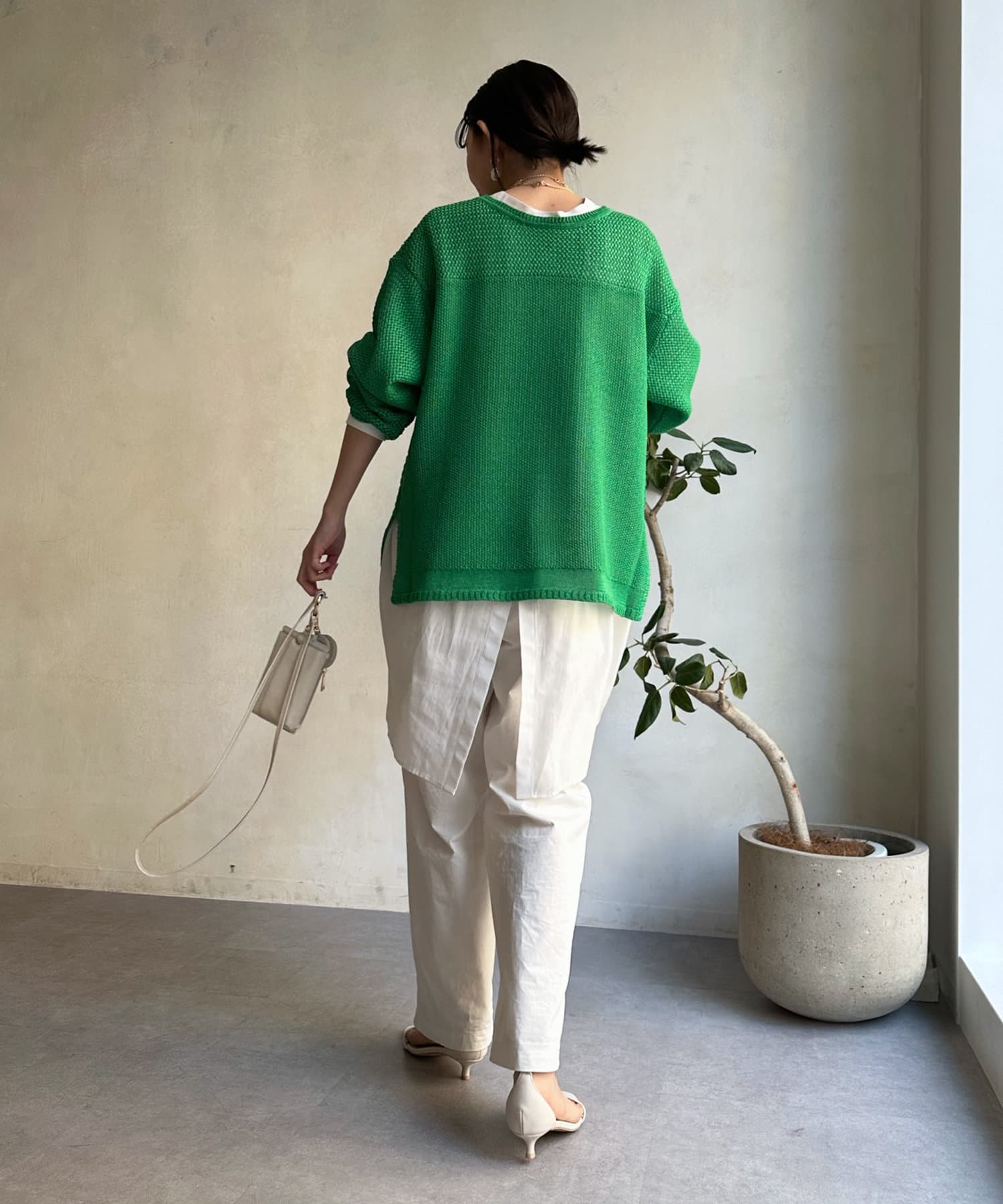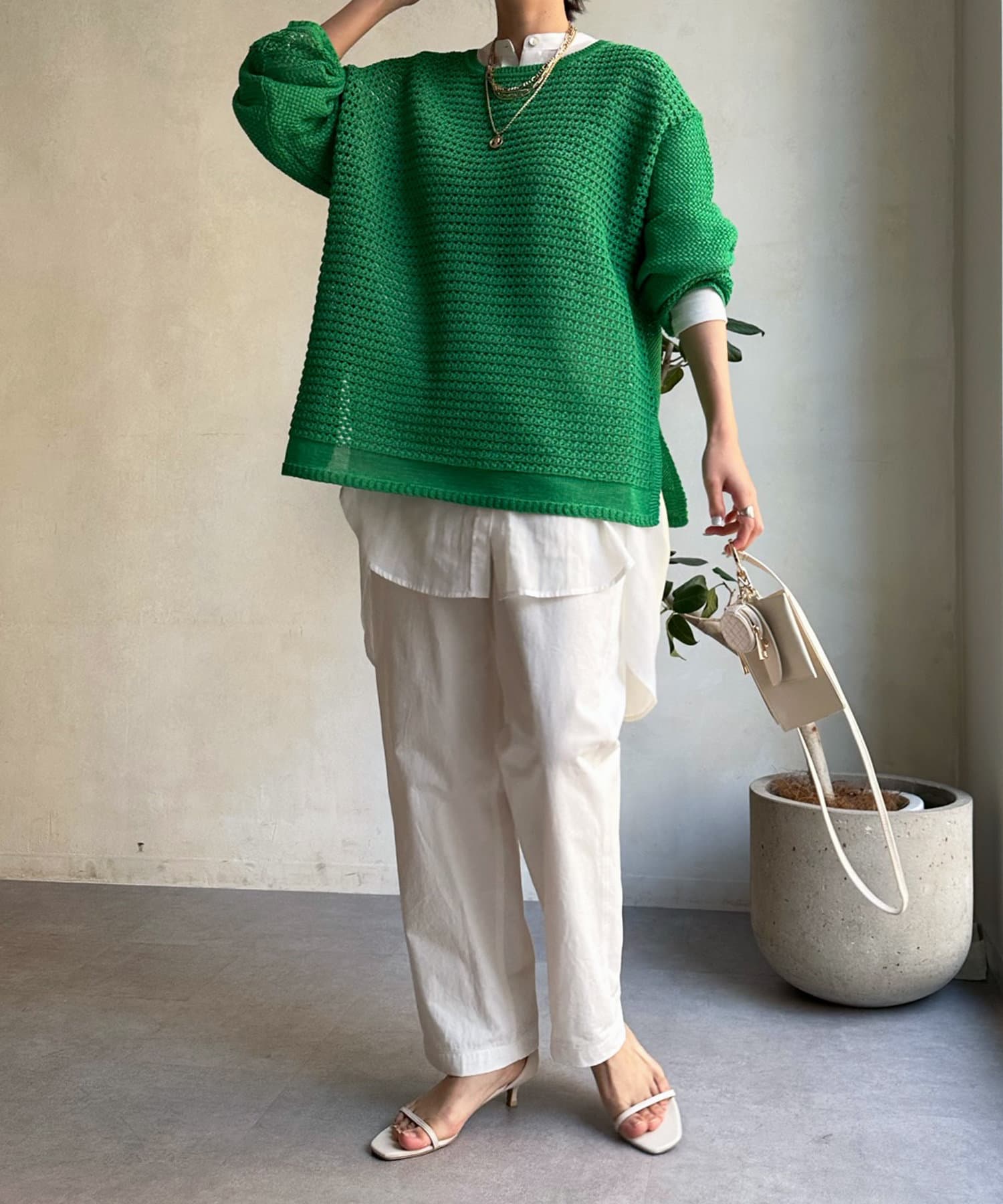 素材は擬痲加工した綿糸を使用し、麻のような清涼感のあるさらりとした肌触りに仕上げました。涼し気でざっくりとした編み地がナチュラルで、夏らしい印象をプラスしてくれます。