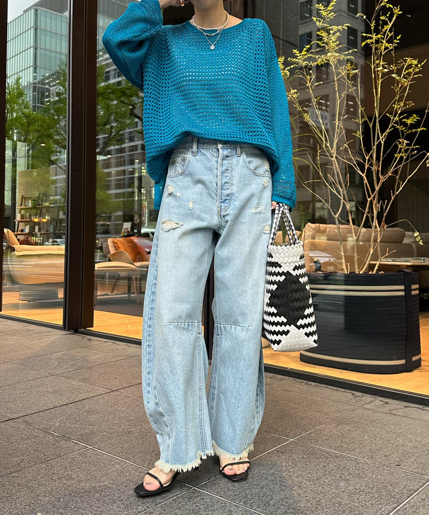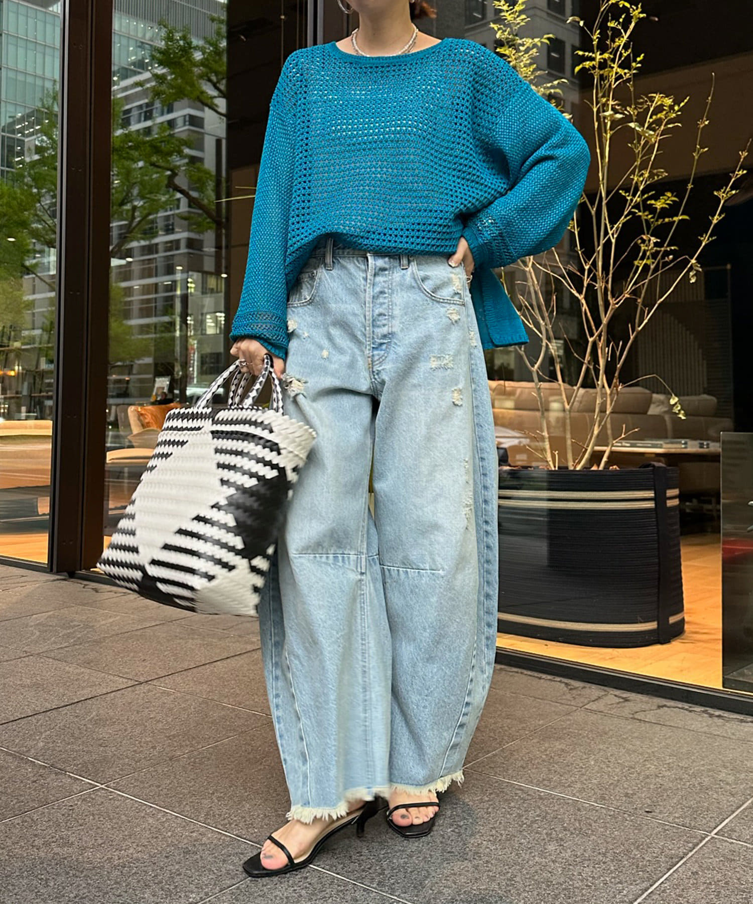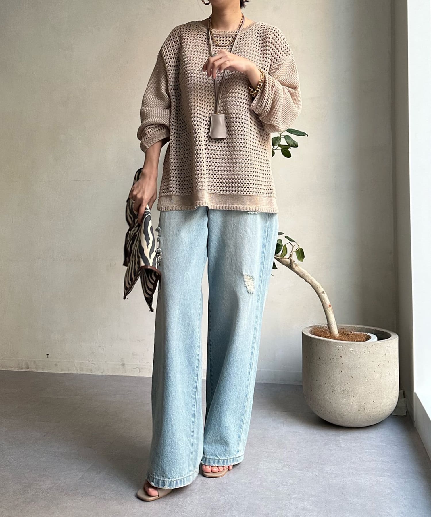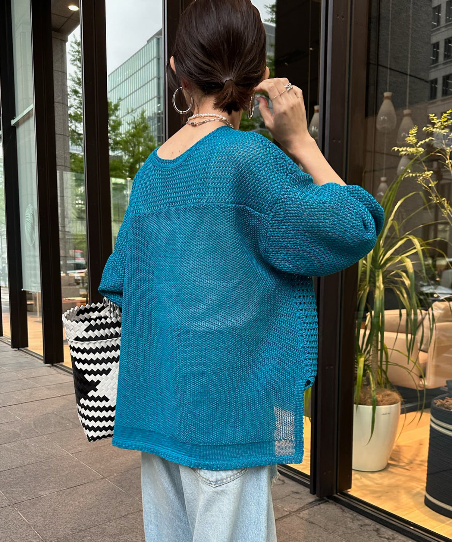 素材は擬痲加工した綿糸を使用し、麻のような清涼感のあるさらりとした肌触りに仕上げました。涼し気でざっくりとした編み地がナチュラルで、夏らしい印象をプラスしてくれます。