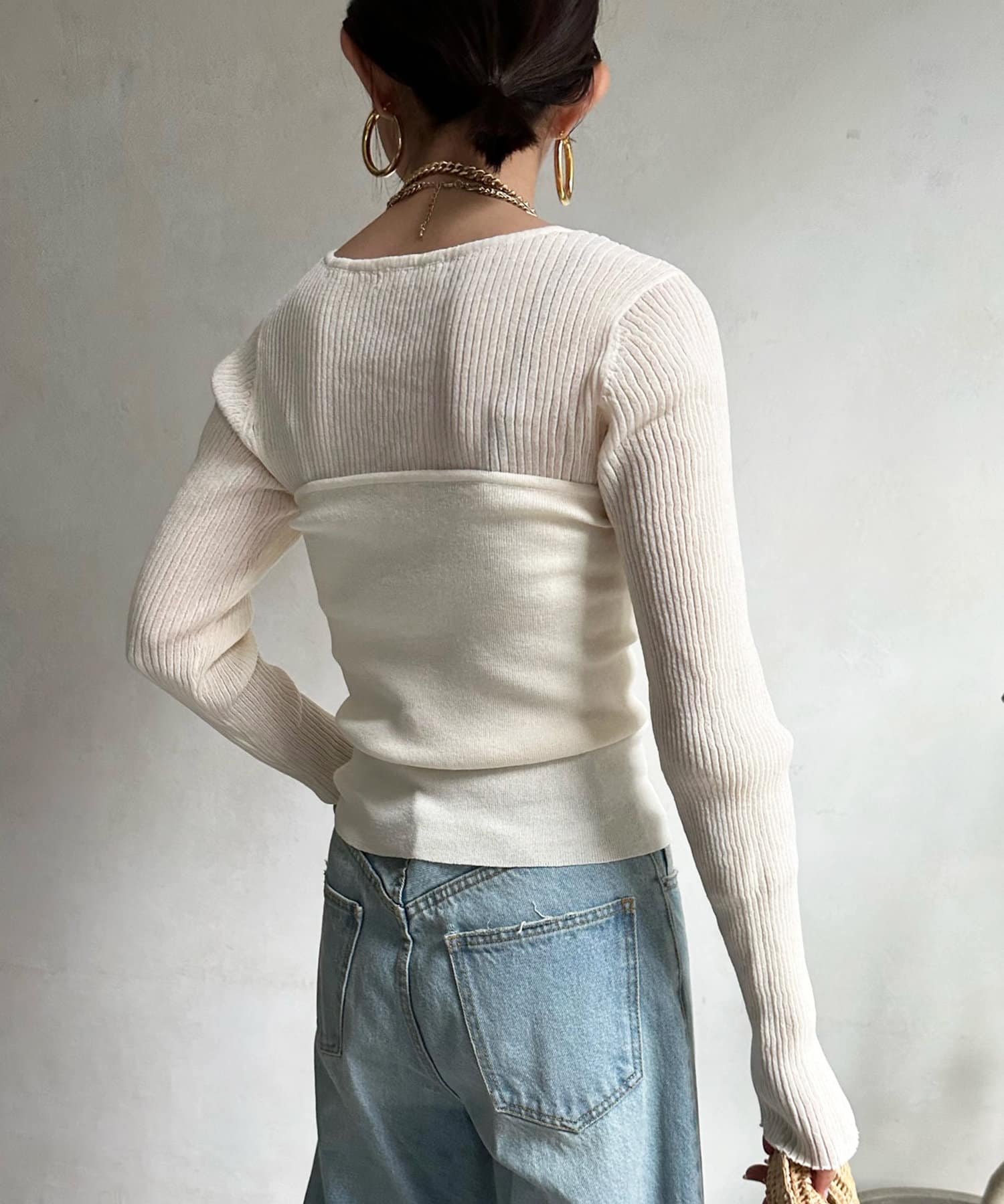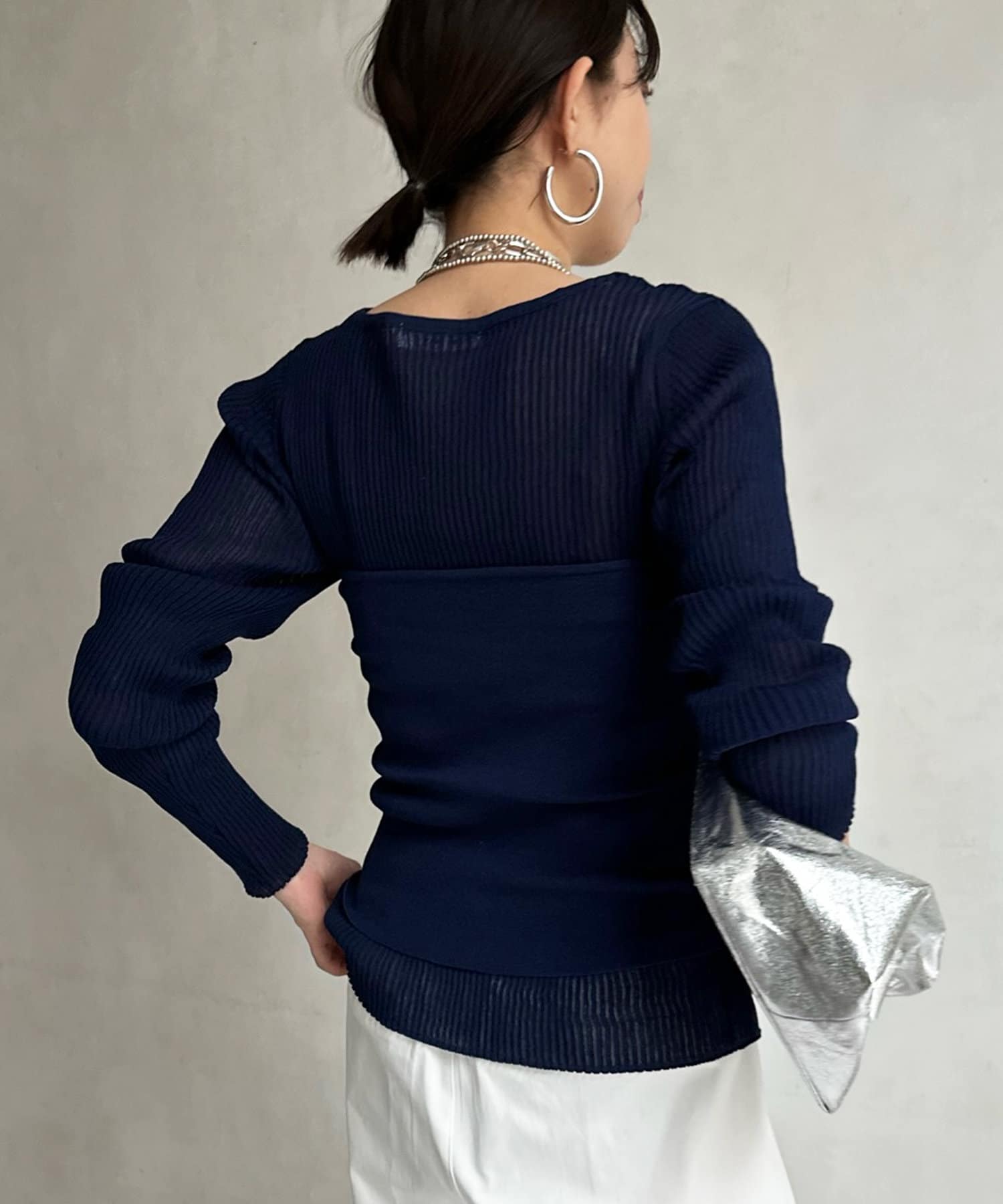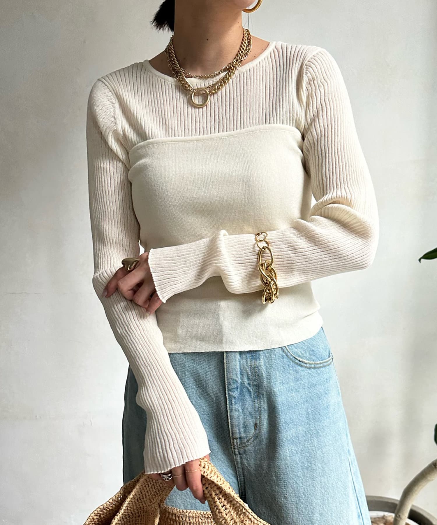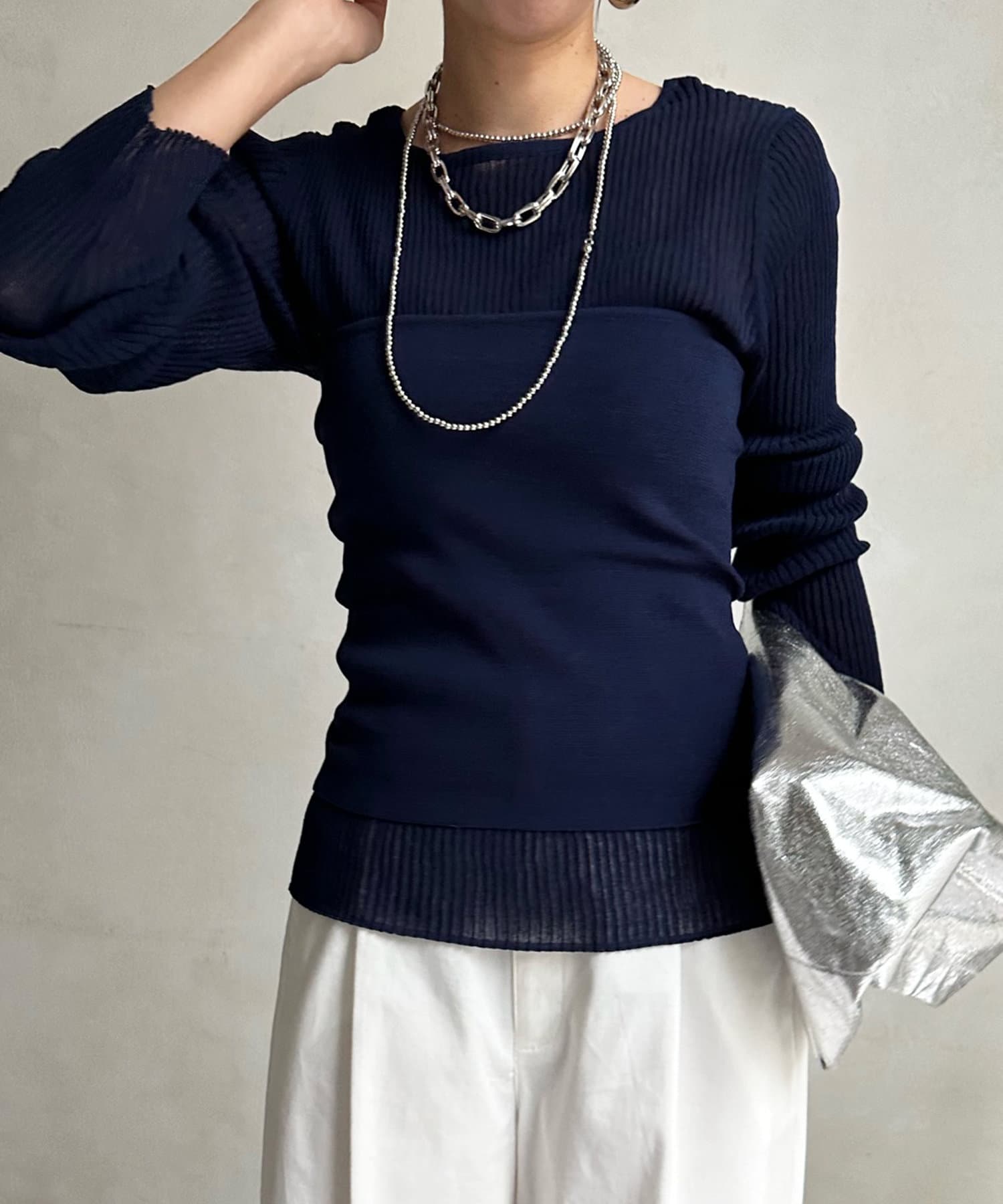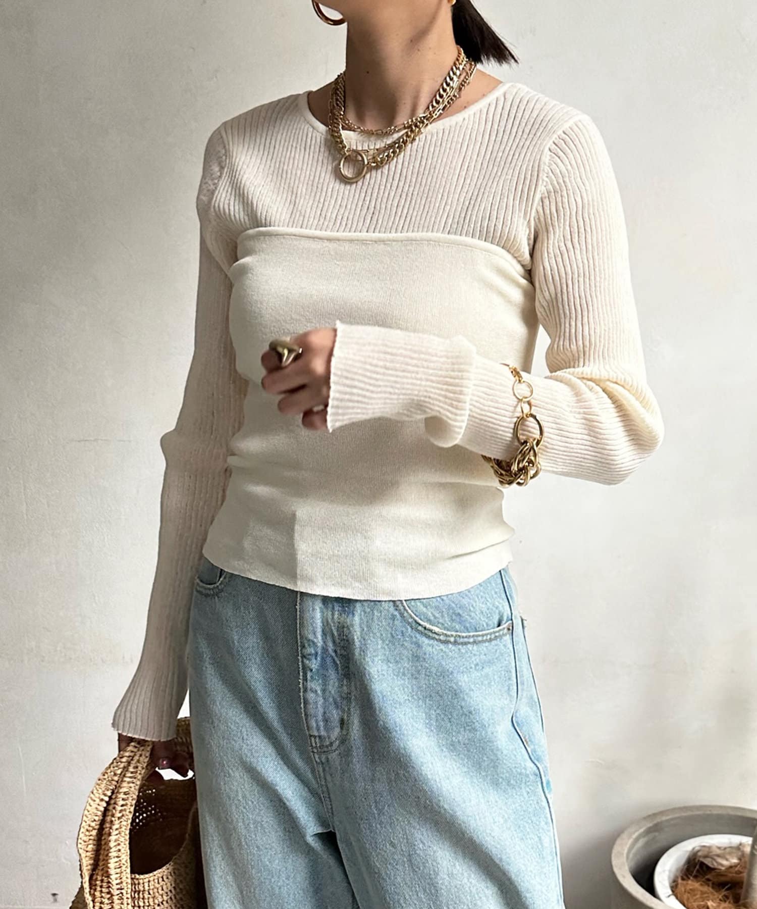 シアー感のあるリブニットプルオーバーとニットビスチェがセットになった1着。