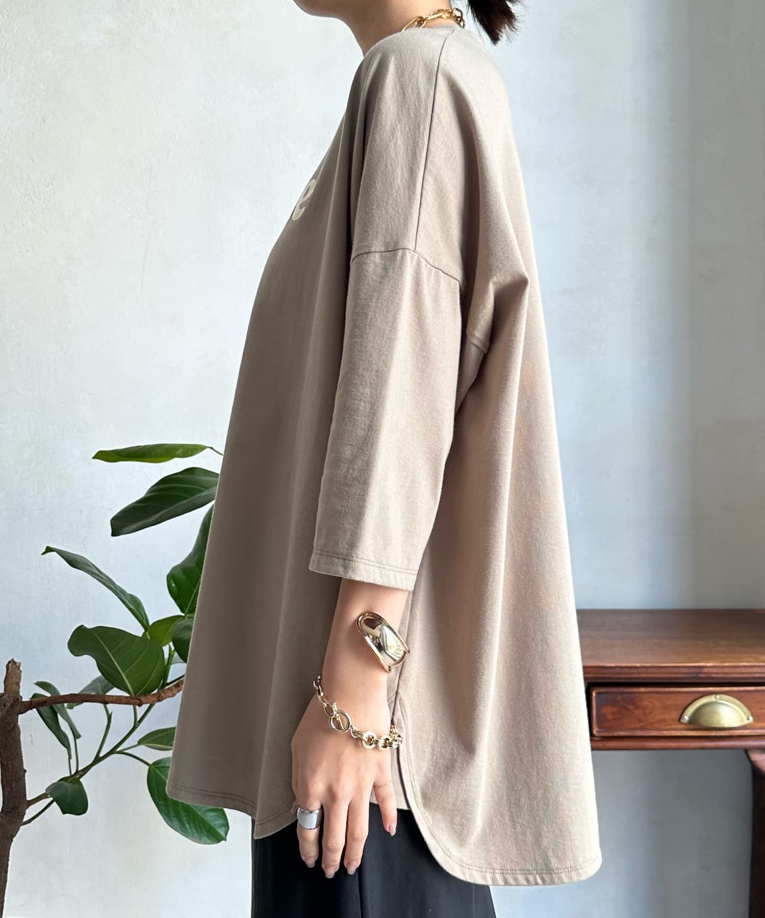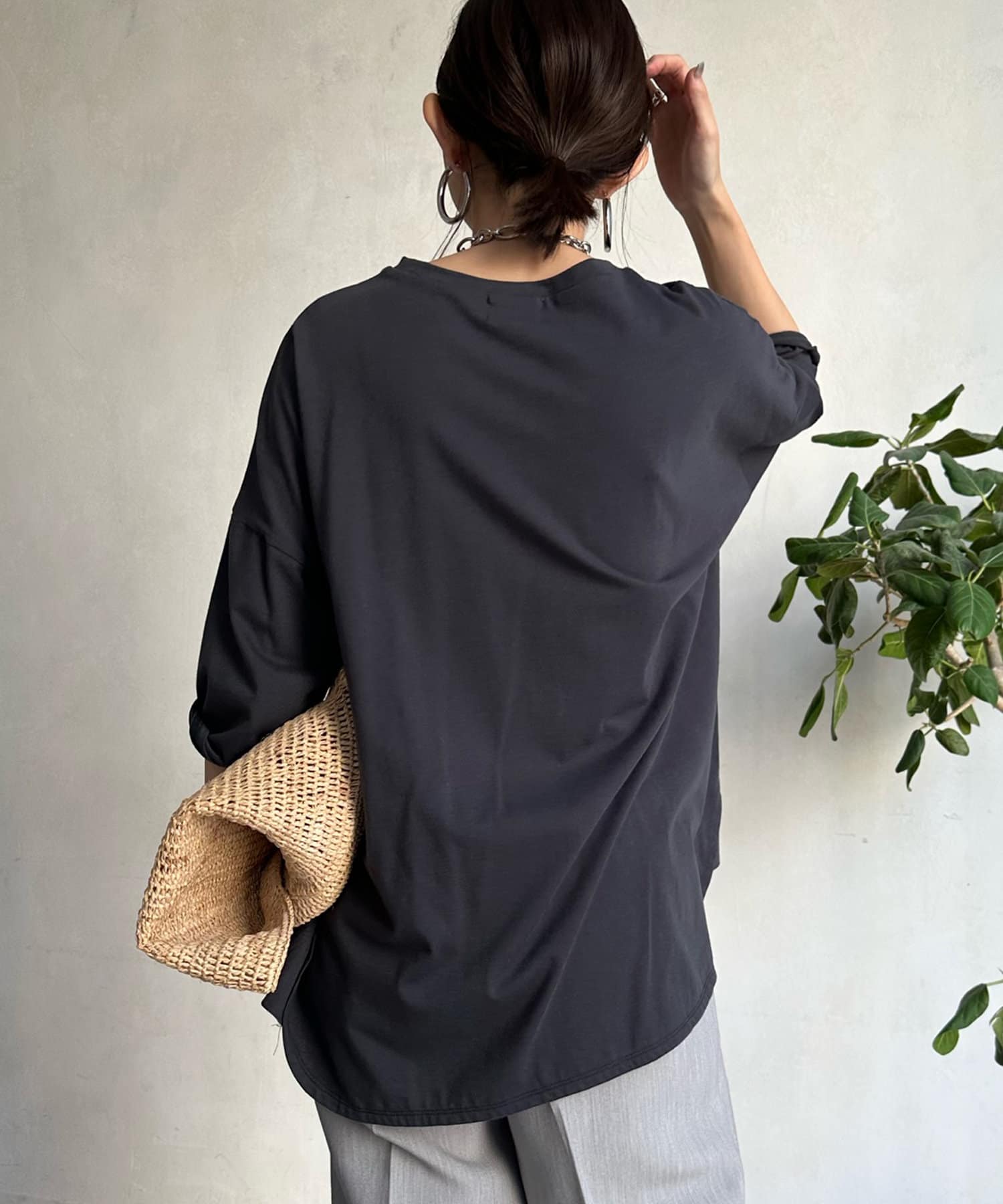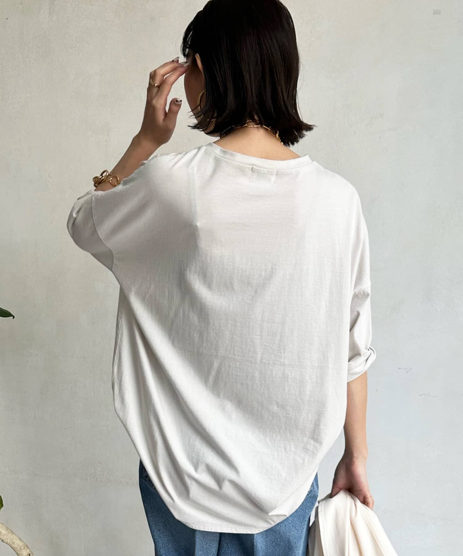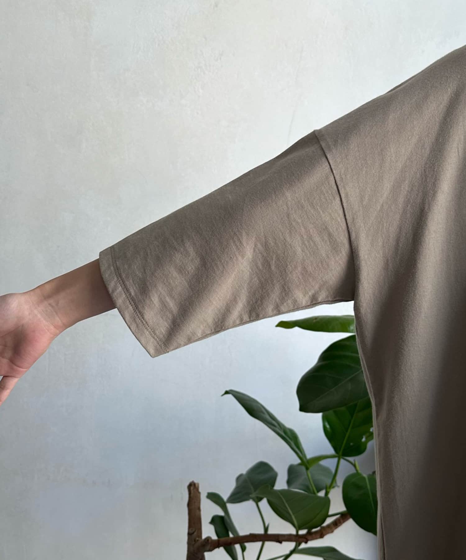 ゆるっと5分袖よりも少し長い袖丈に、身幅もゆとり感があり、リラクシーな着心地に。