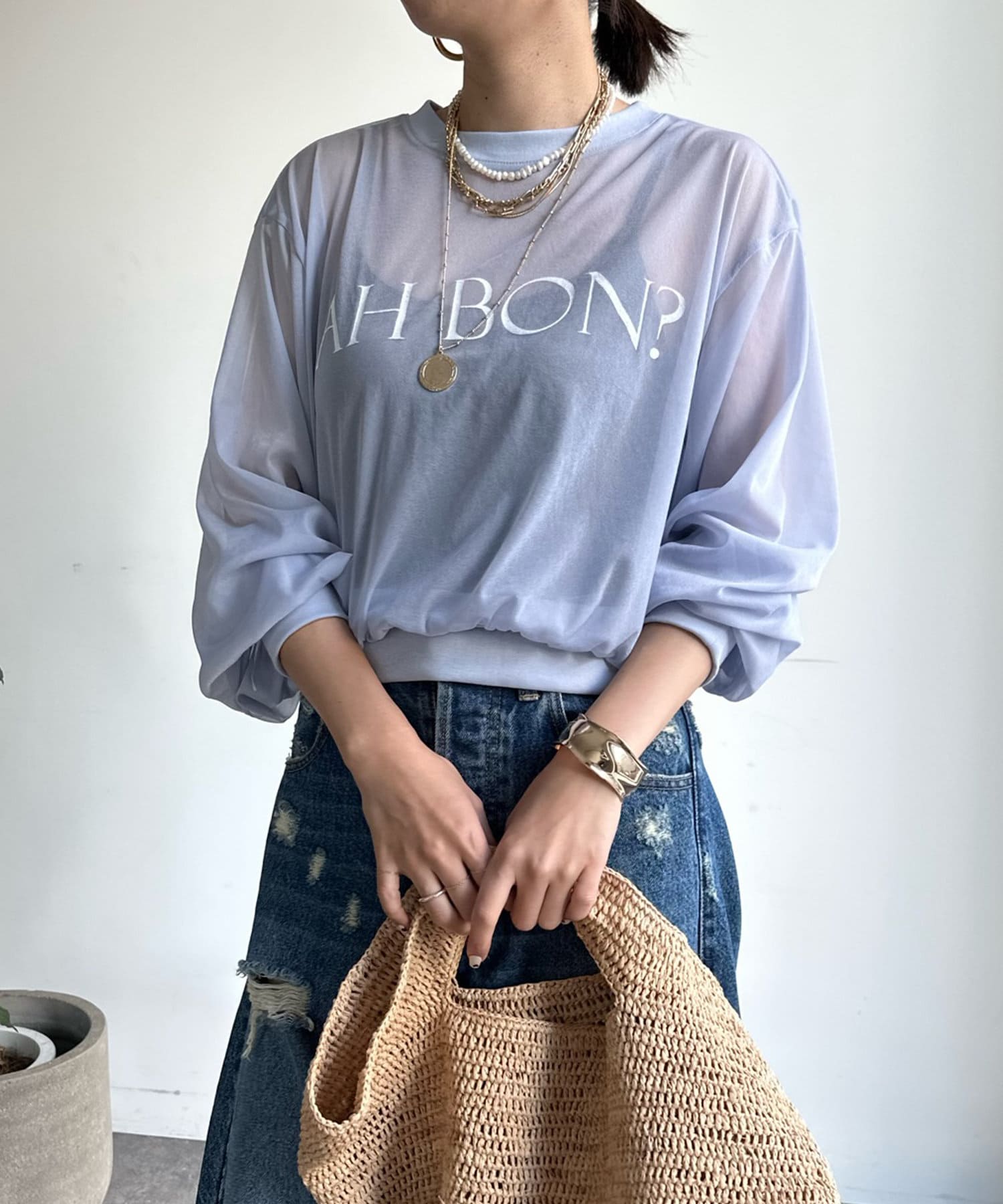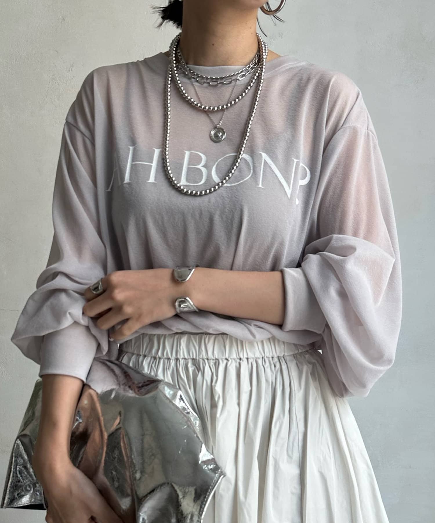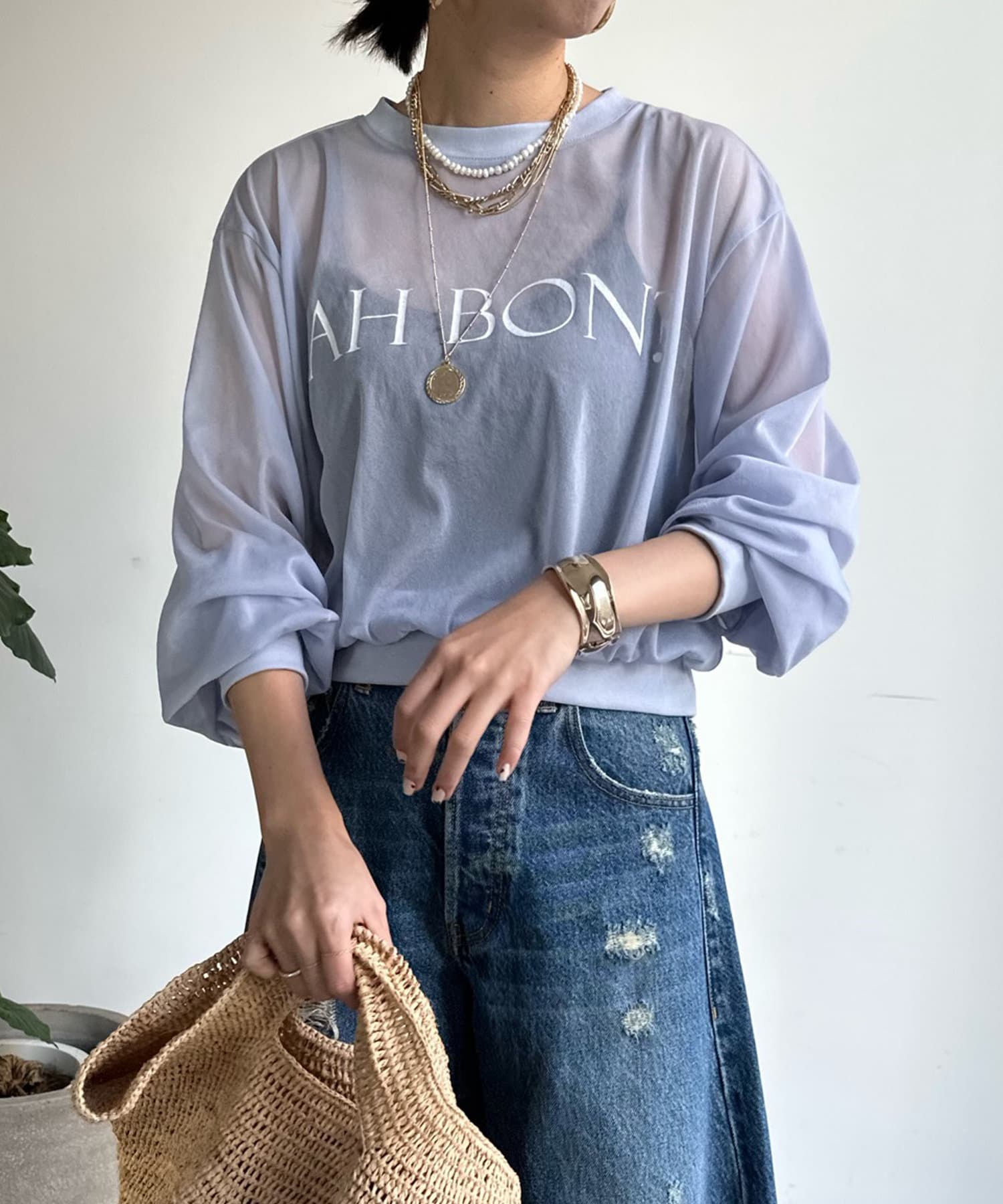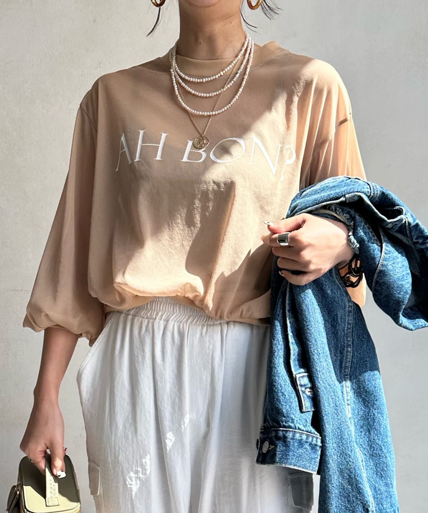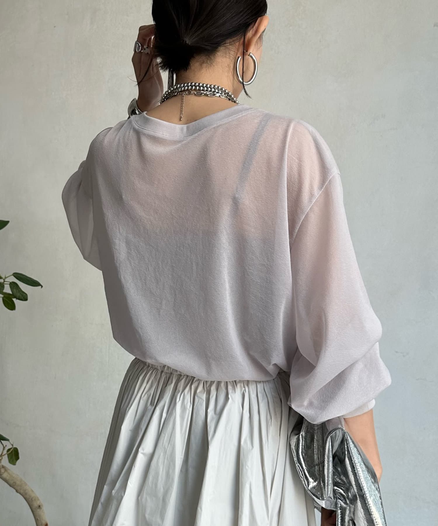 ほんのりとシアー感のある素材と、さり気ないロゴがポイントの1枚。