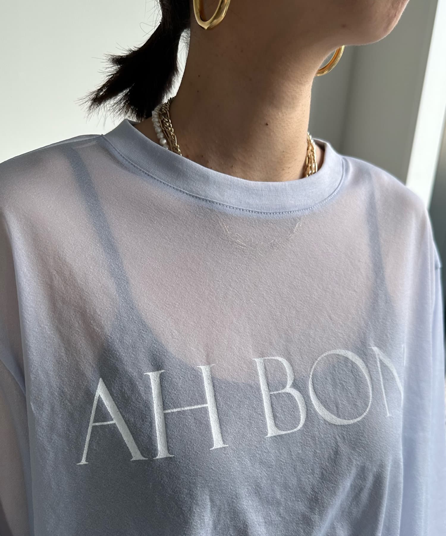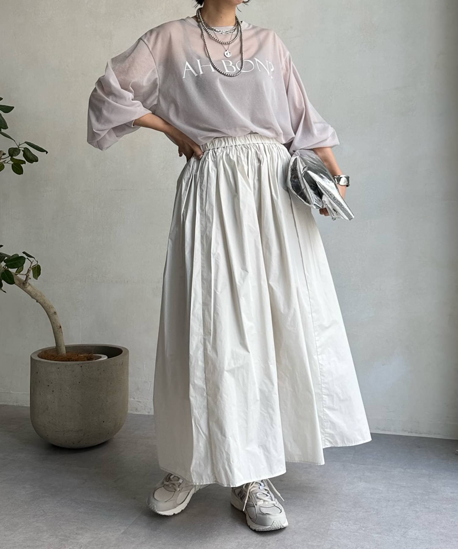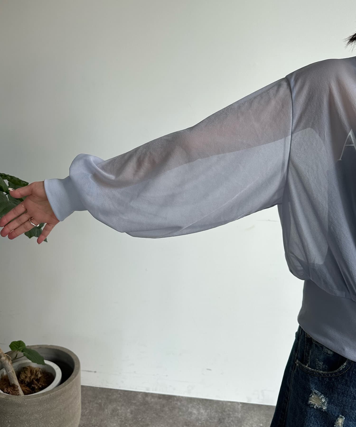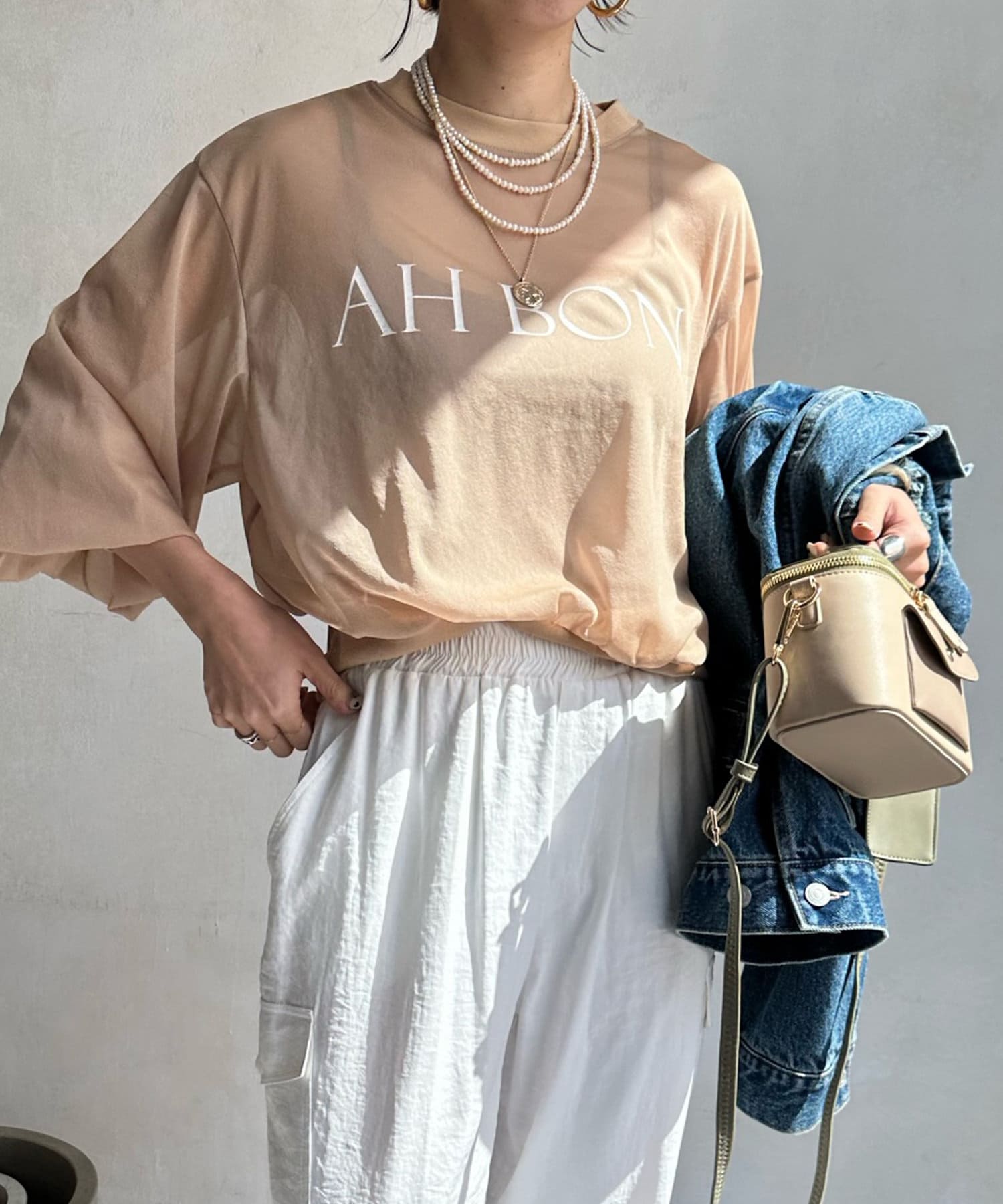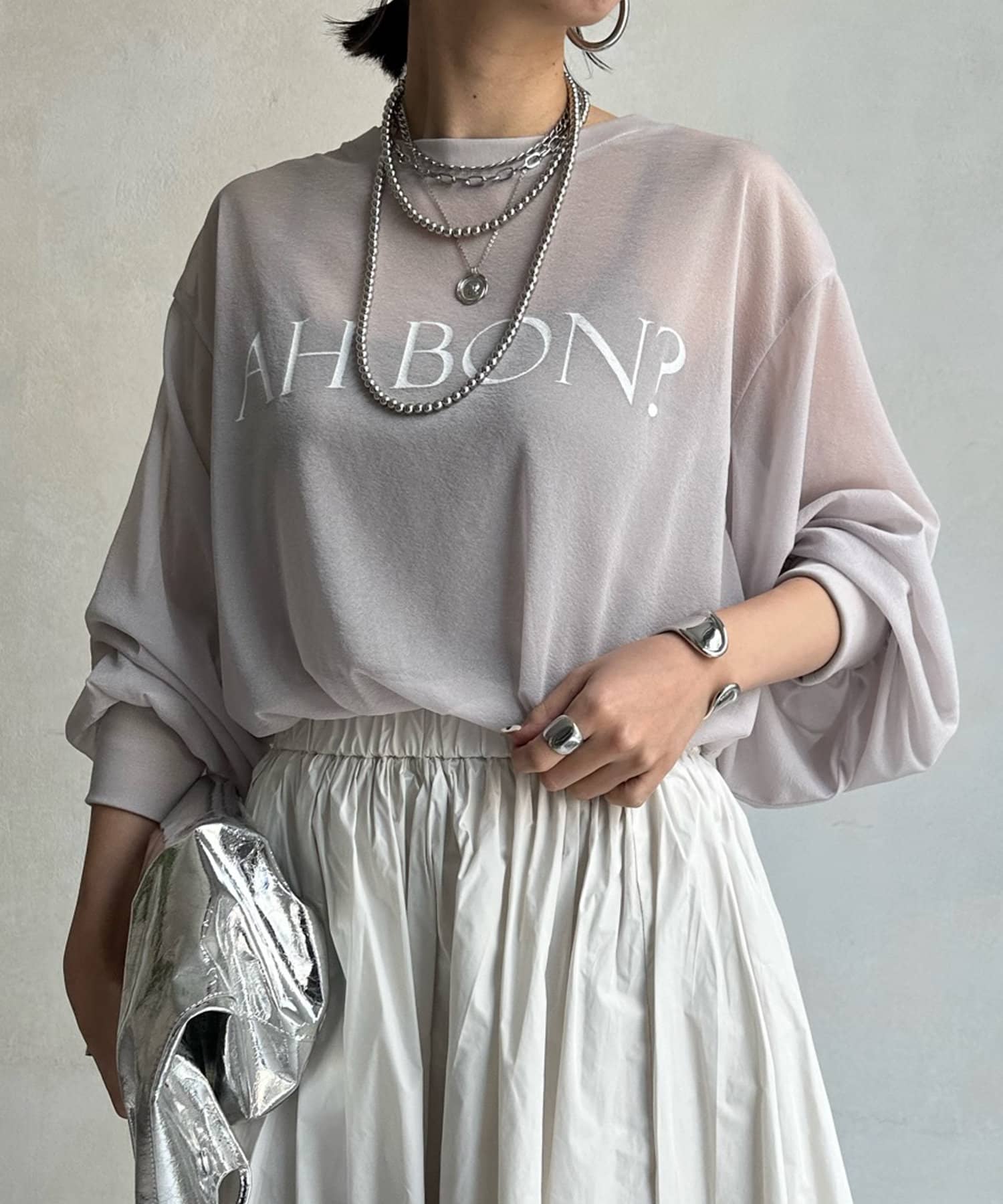 ほんのりとシアー感のある素材と、さり気ないロゴがポイントの1枚。