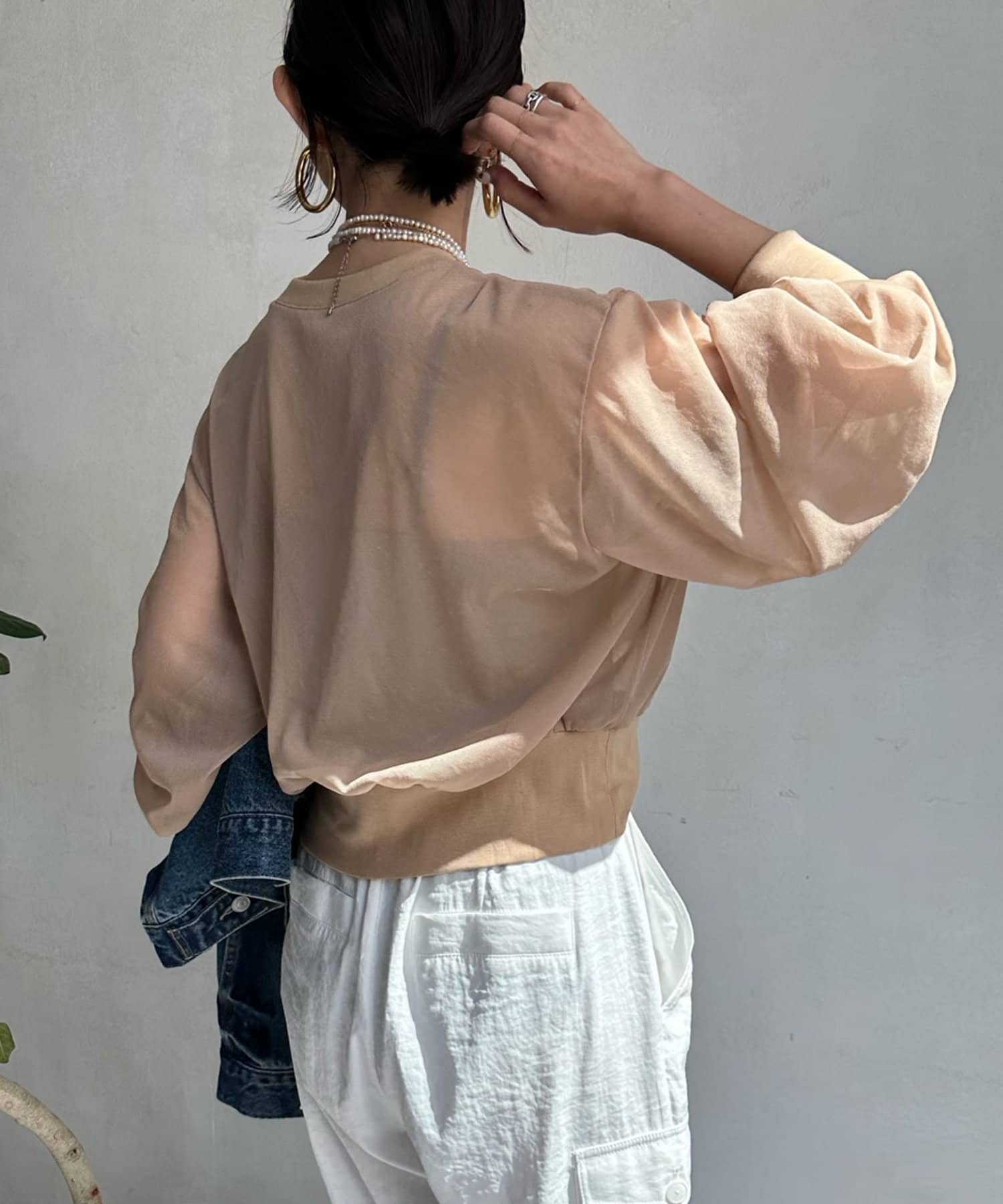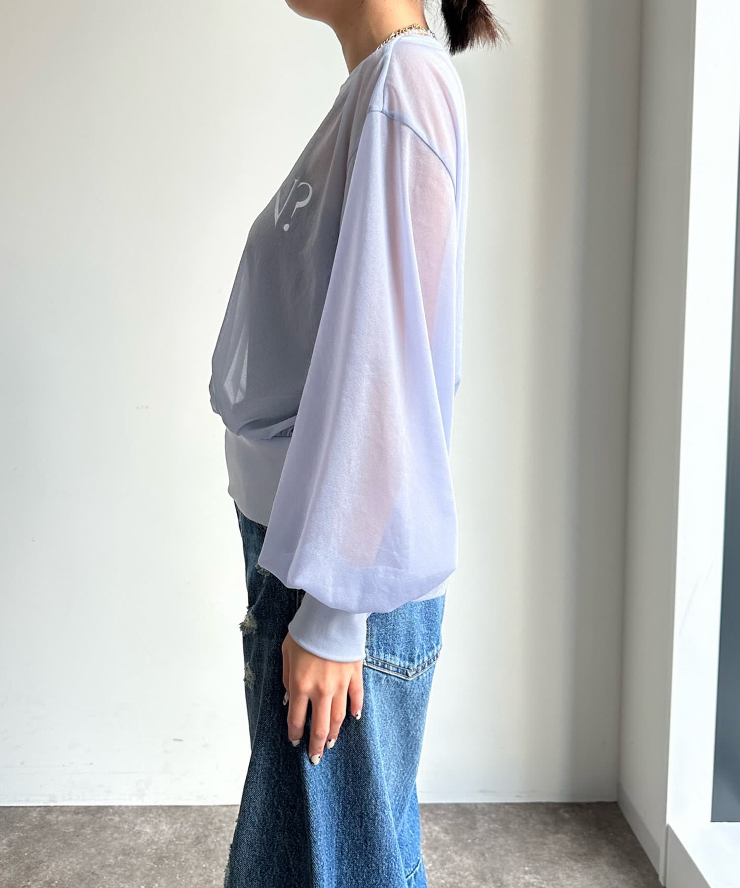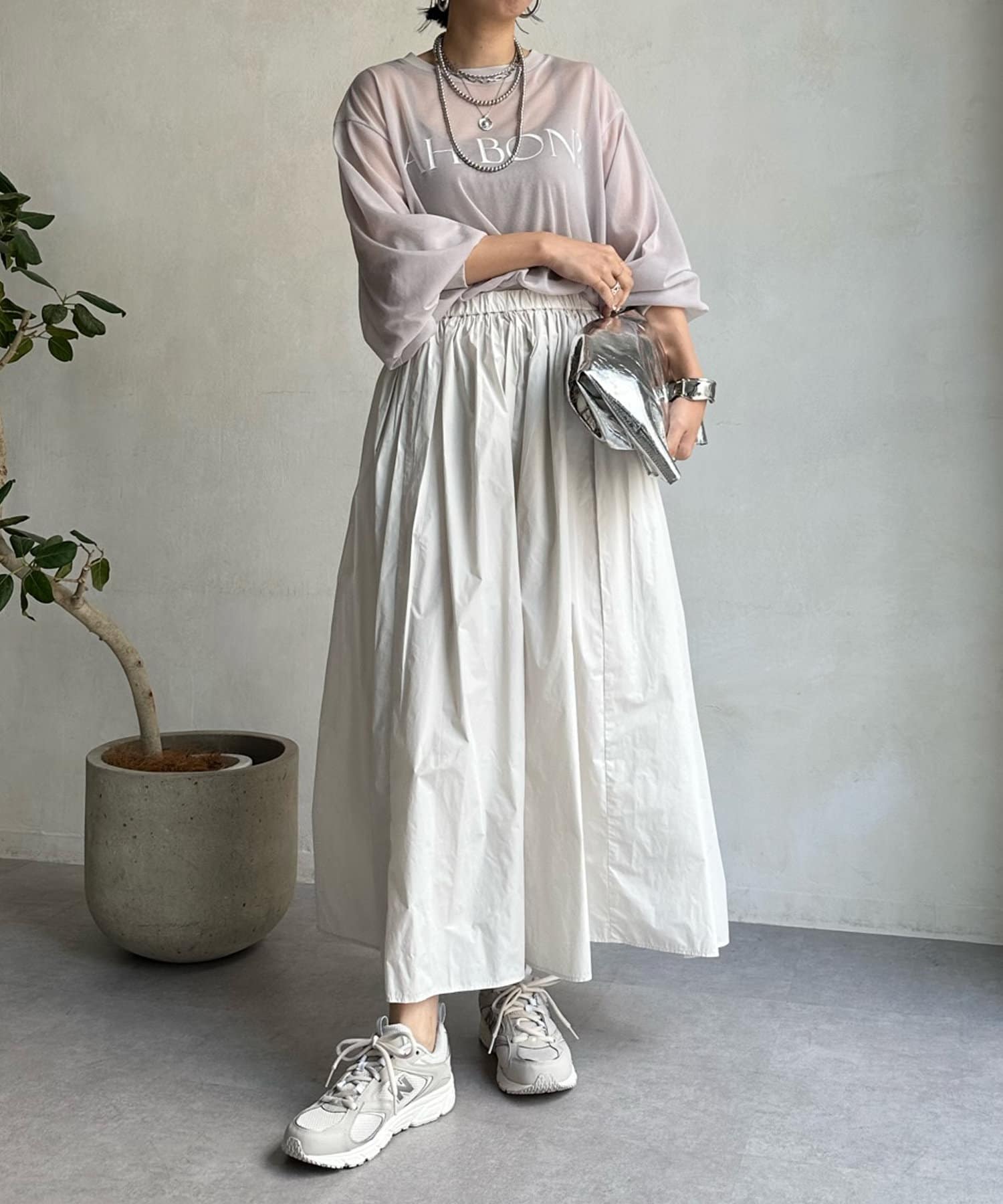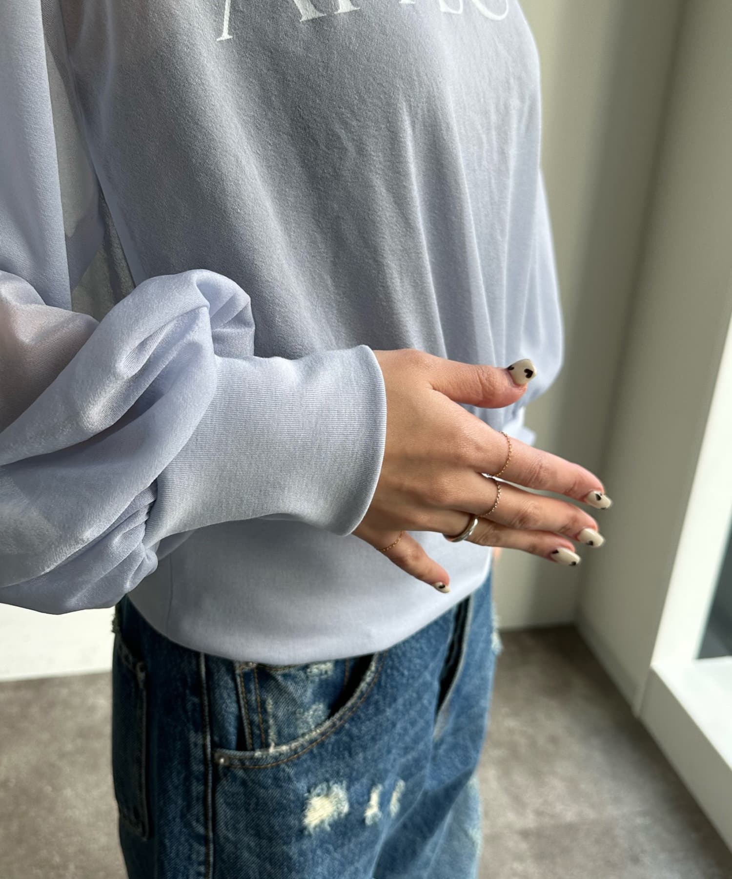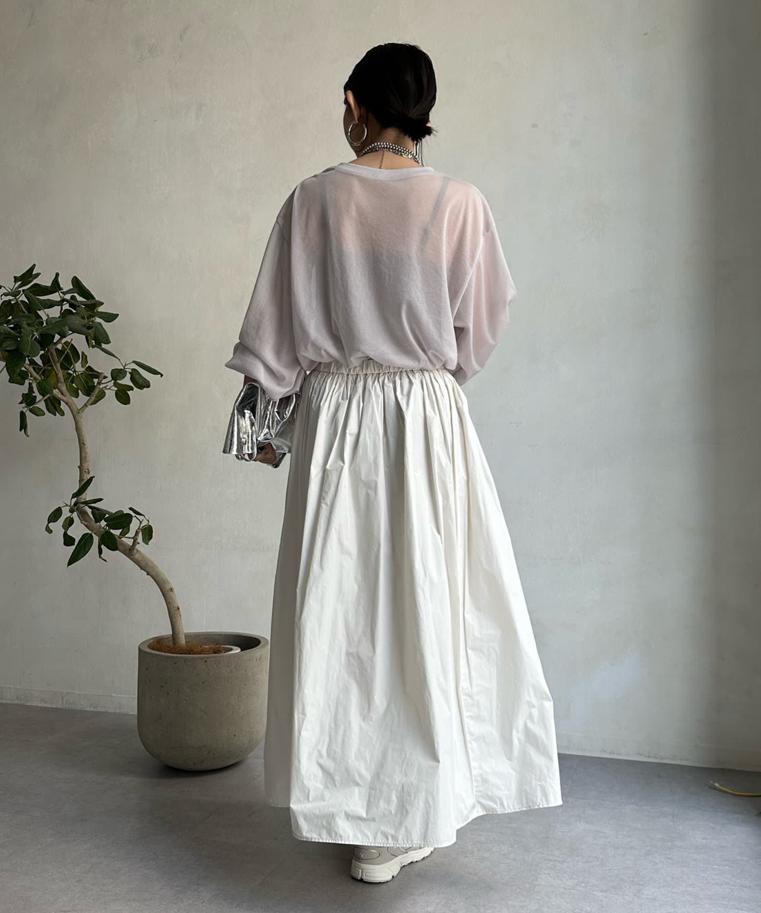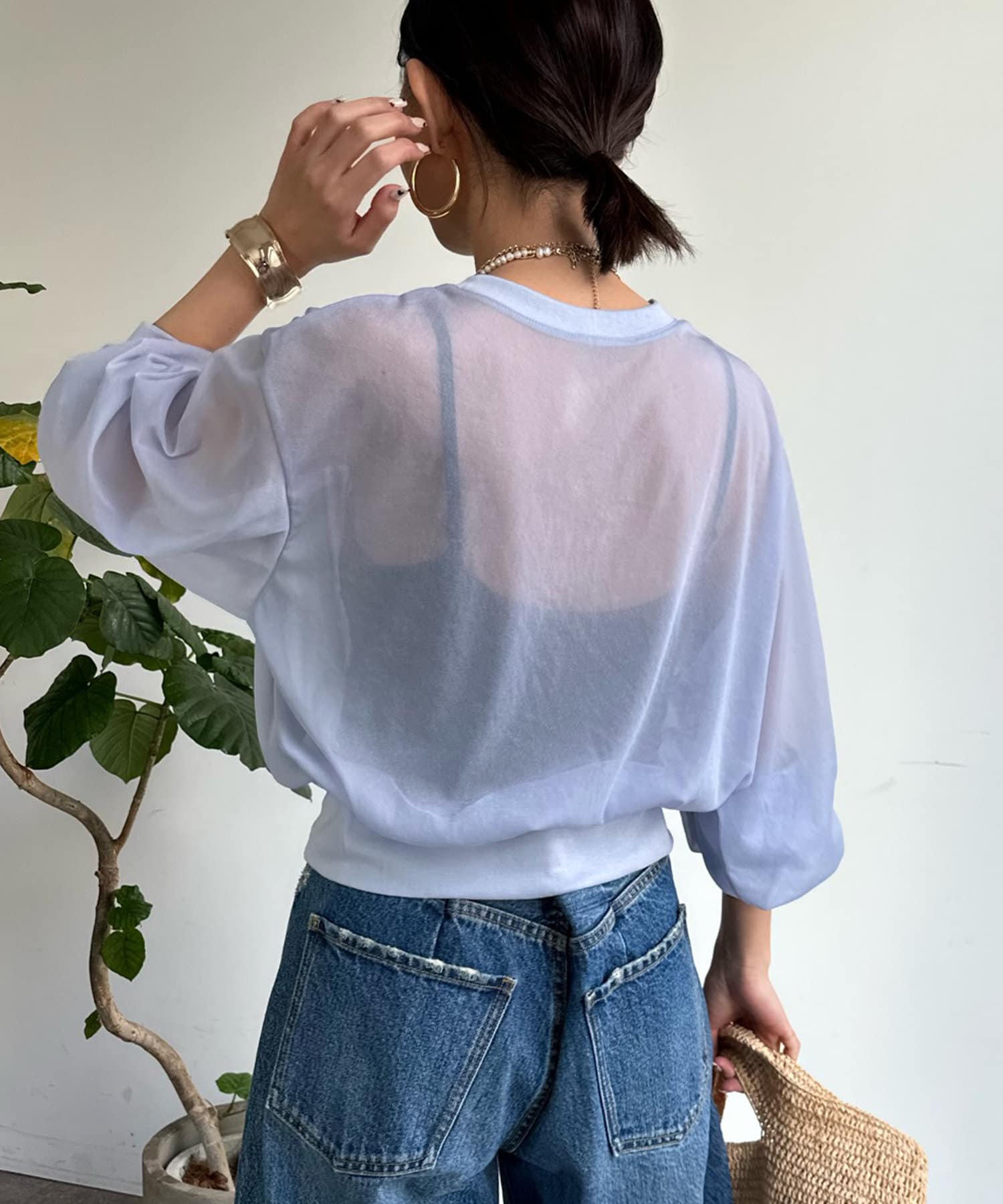 ほんのりとシアー感のある素材と、さり気ないロゴがポイントの1枚。