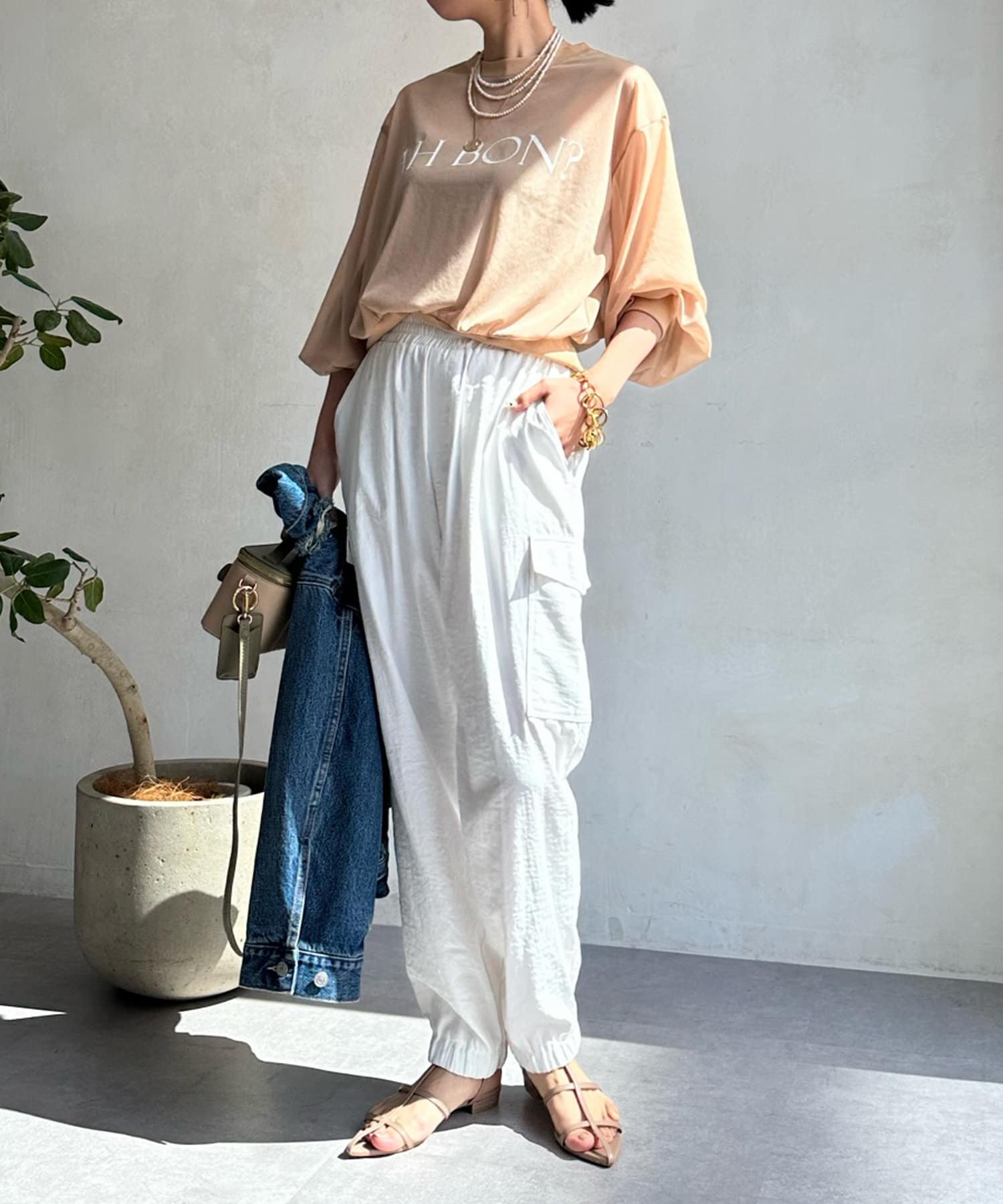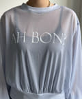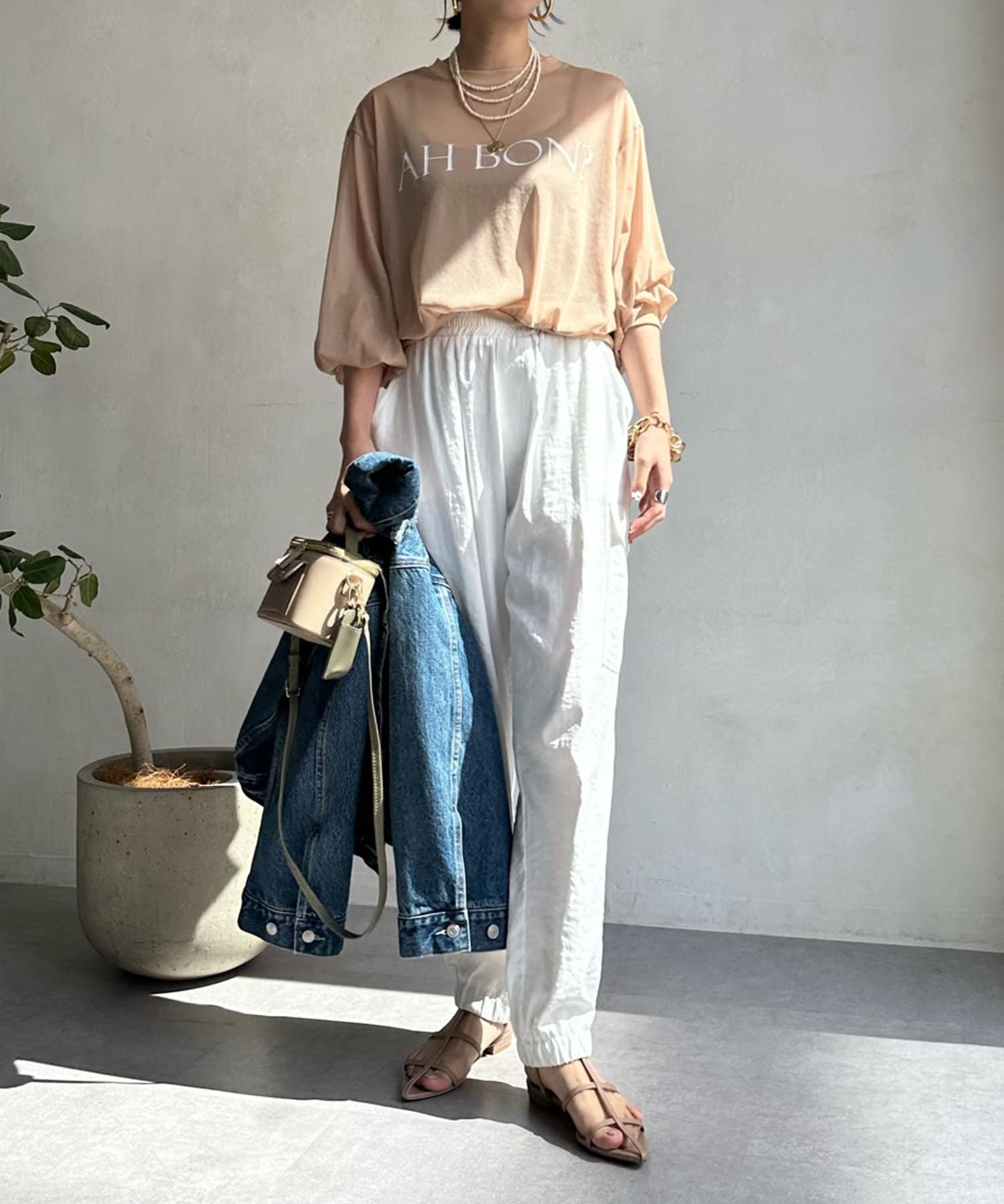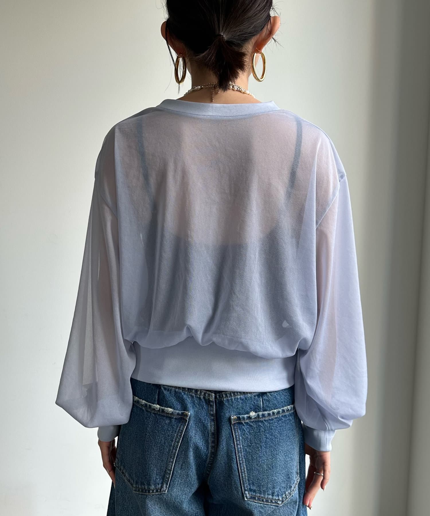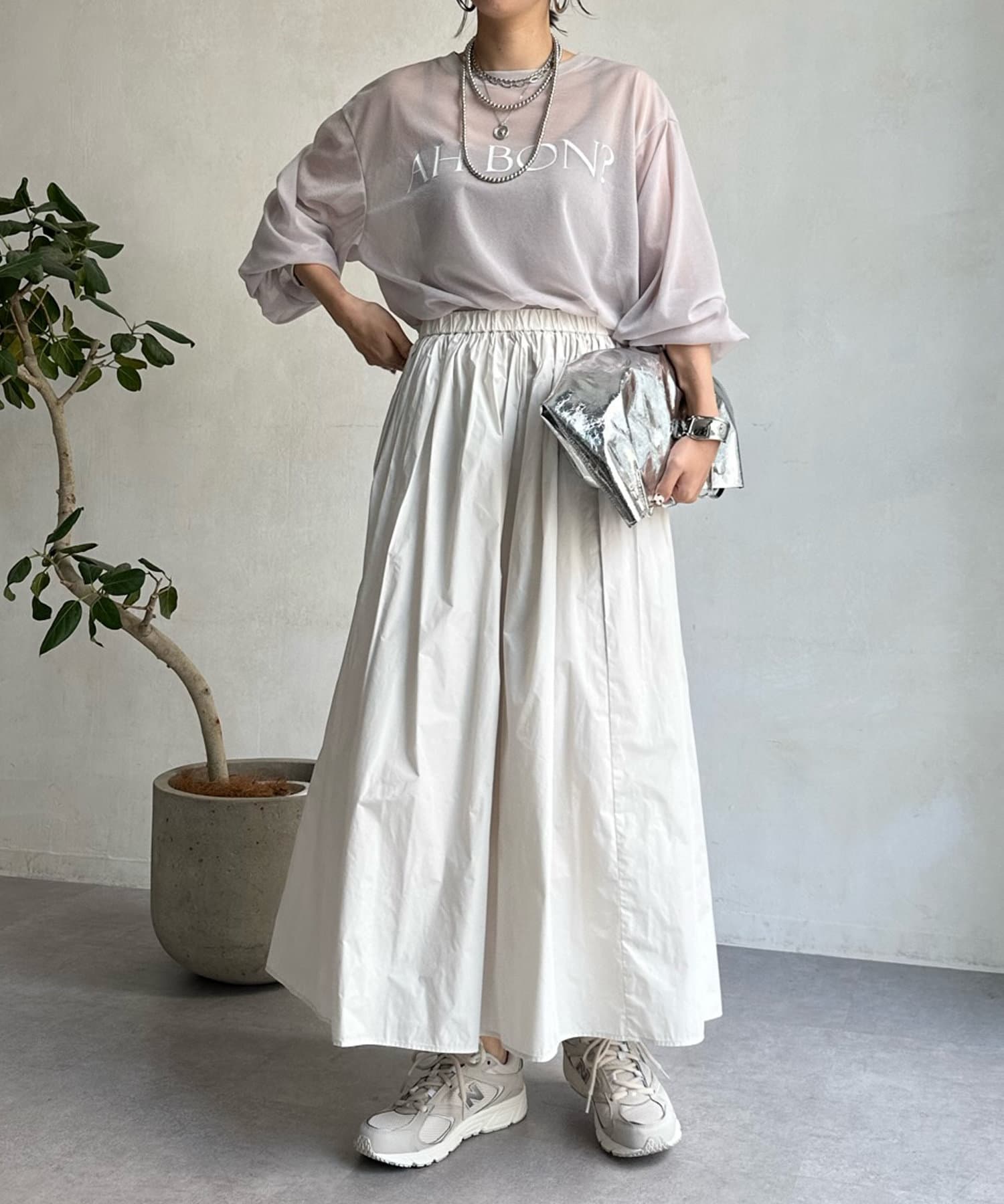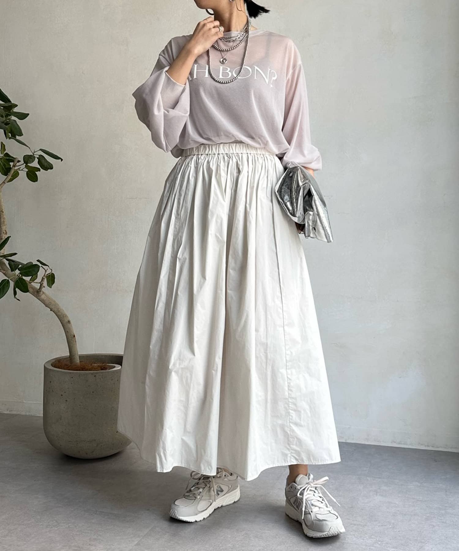 ほんのりとシアー感のある素材と、さり気ないロゴがポイントの1枚。