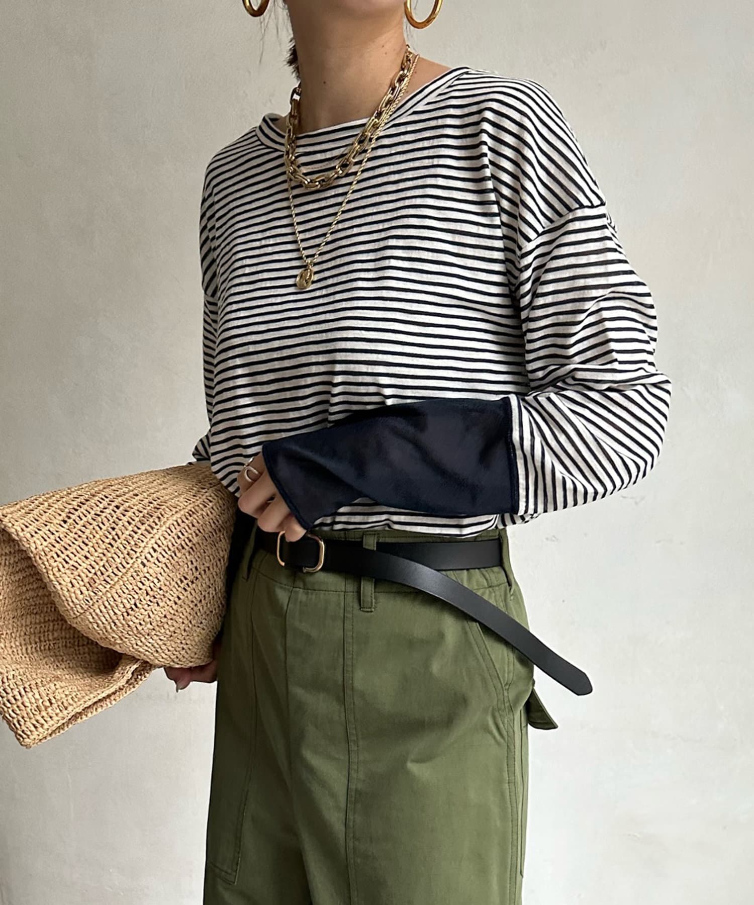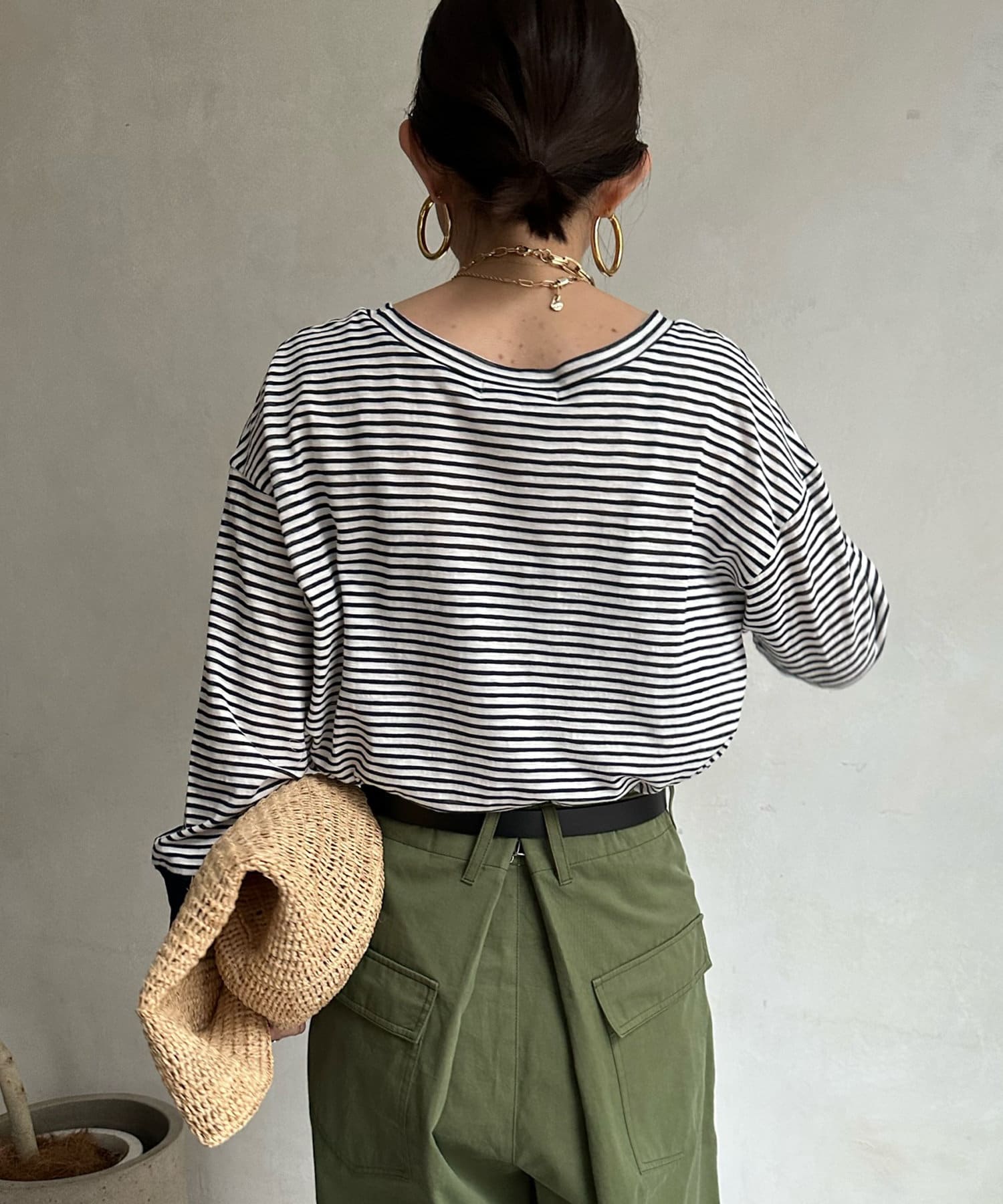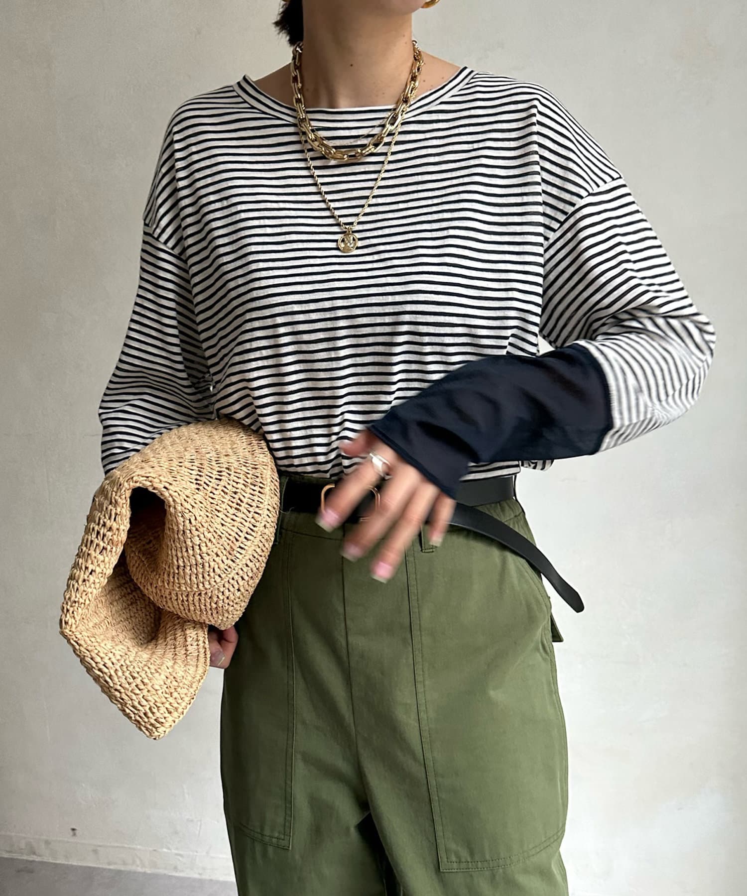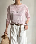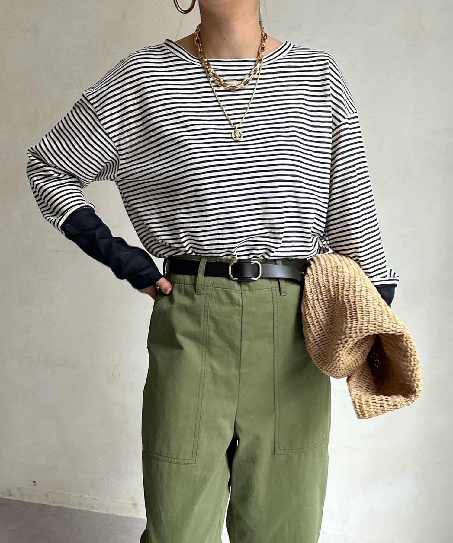 細めのボーダーが主張しすぎず馴染みやすい、1枚でもレイヤードでも着回しが楽しめるこだわりの詰まったカットソー。