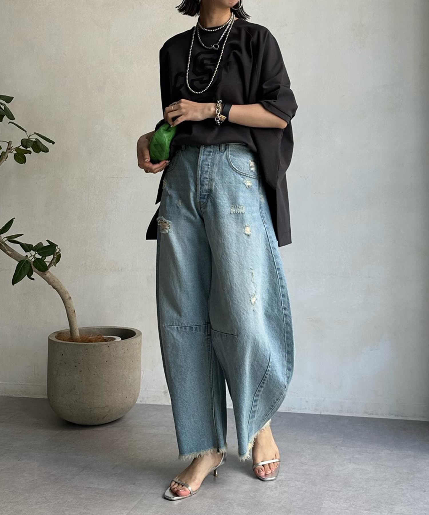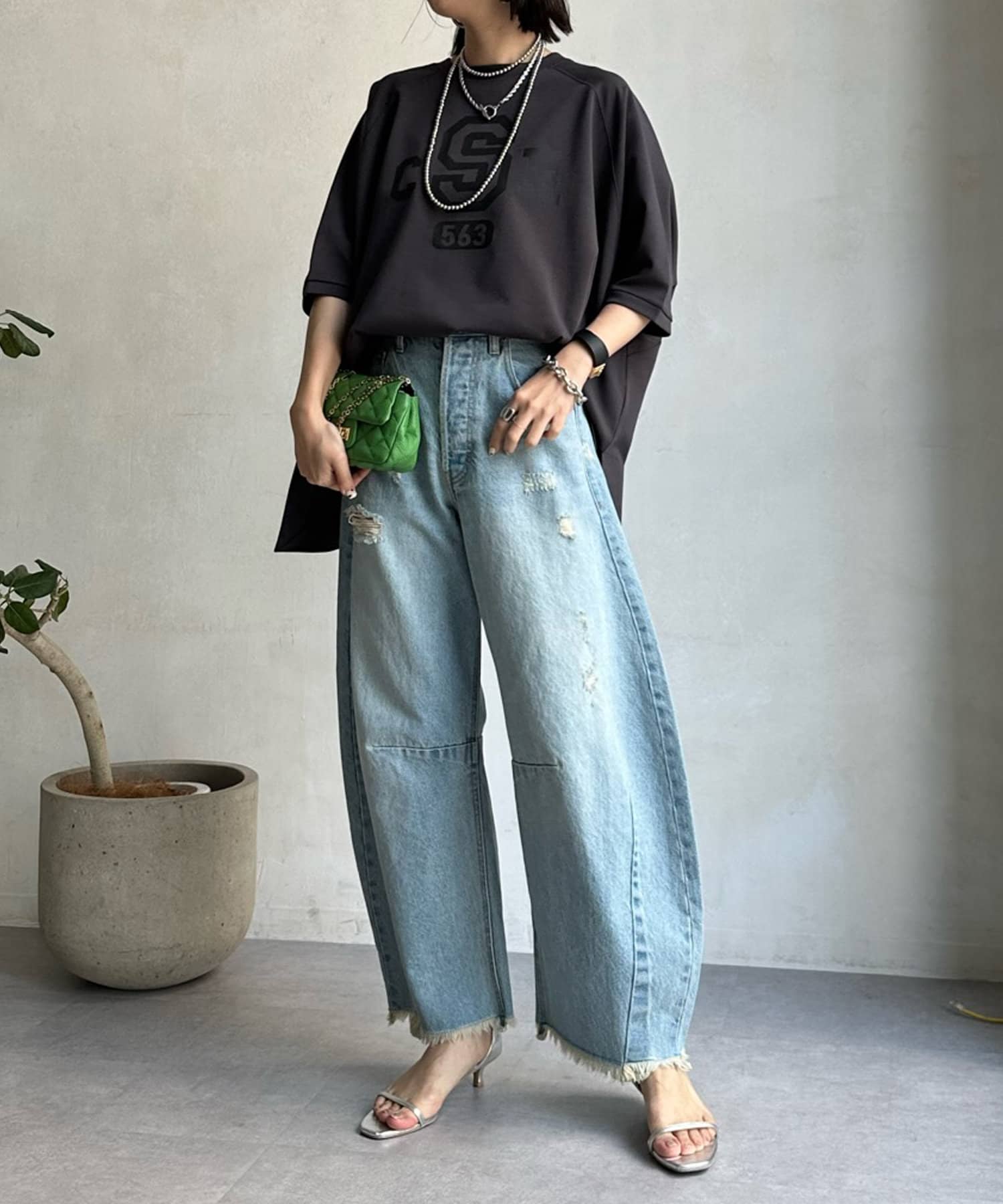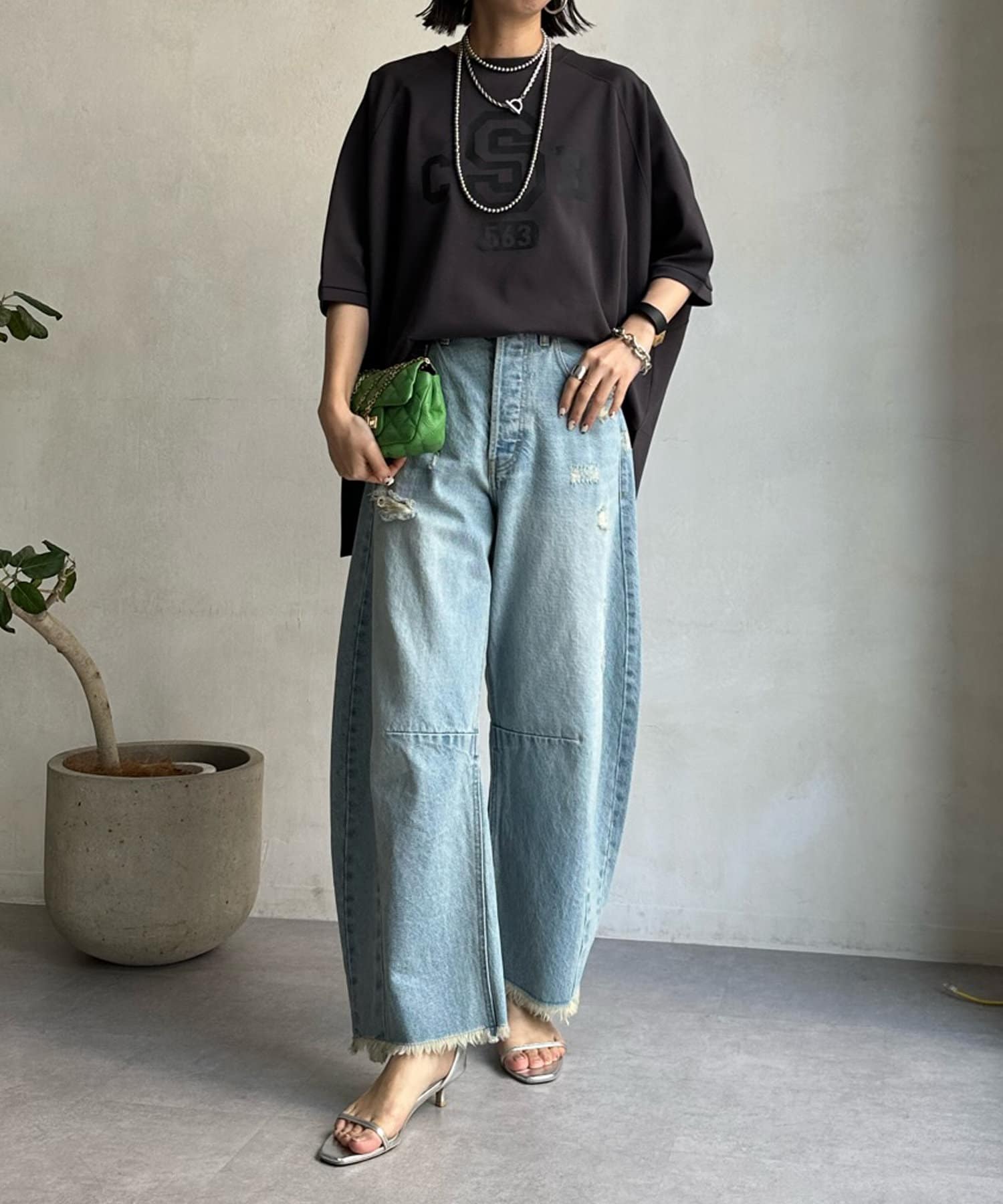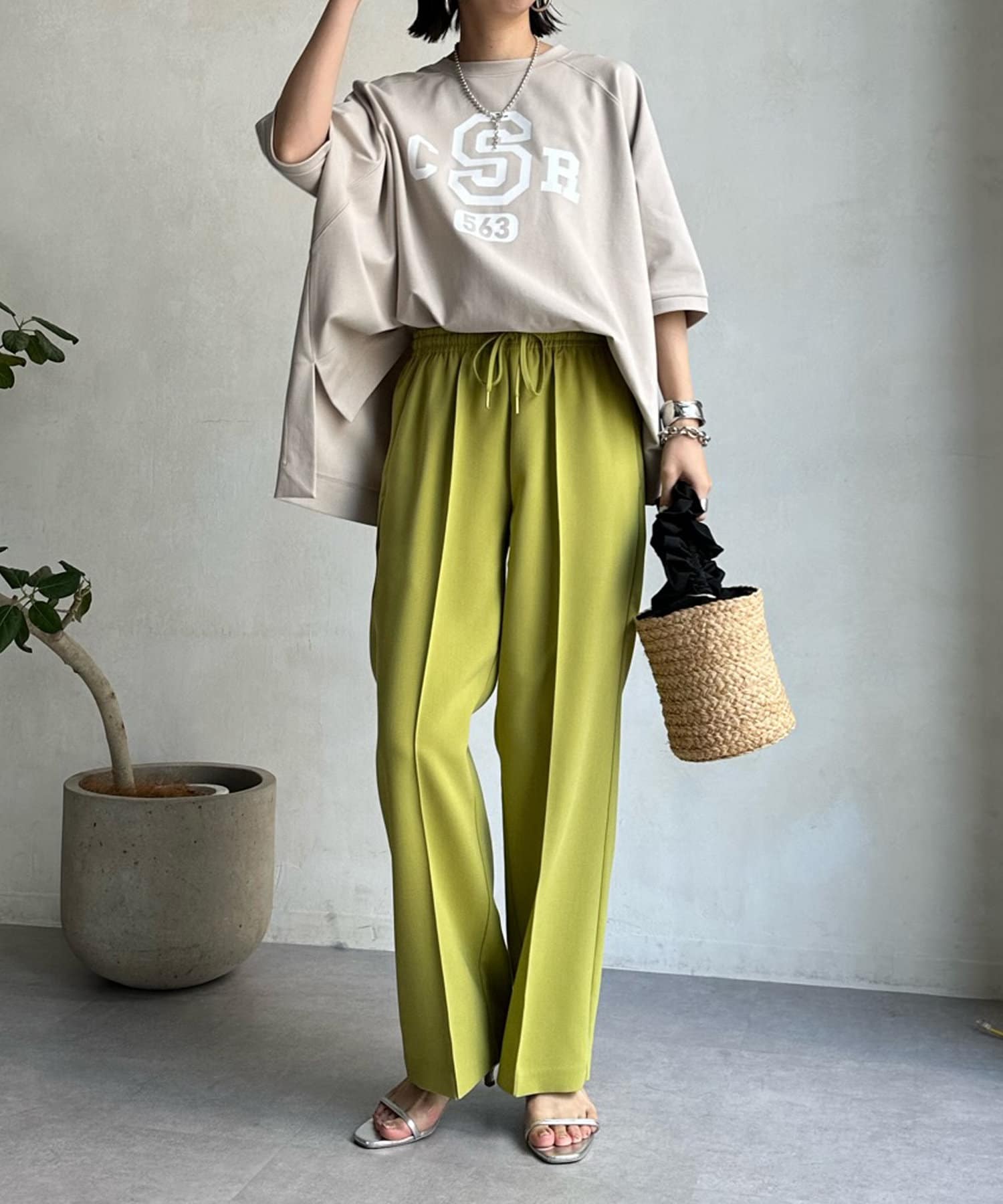 スカートからパンツまで幅広いアイテムとマッチ。フロントのみボトムインしたスタイルもおすすめですよ◎