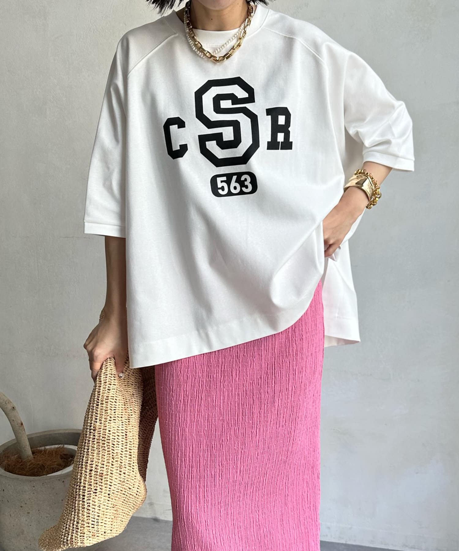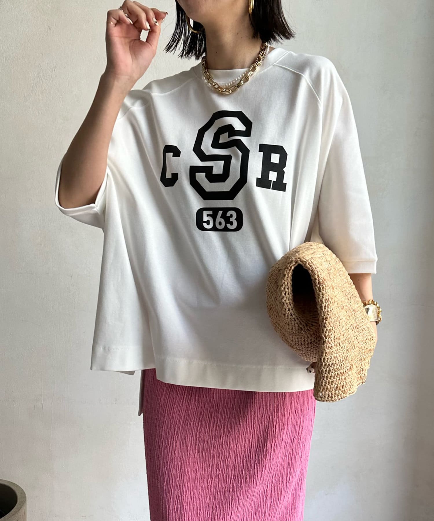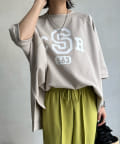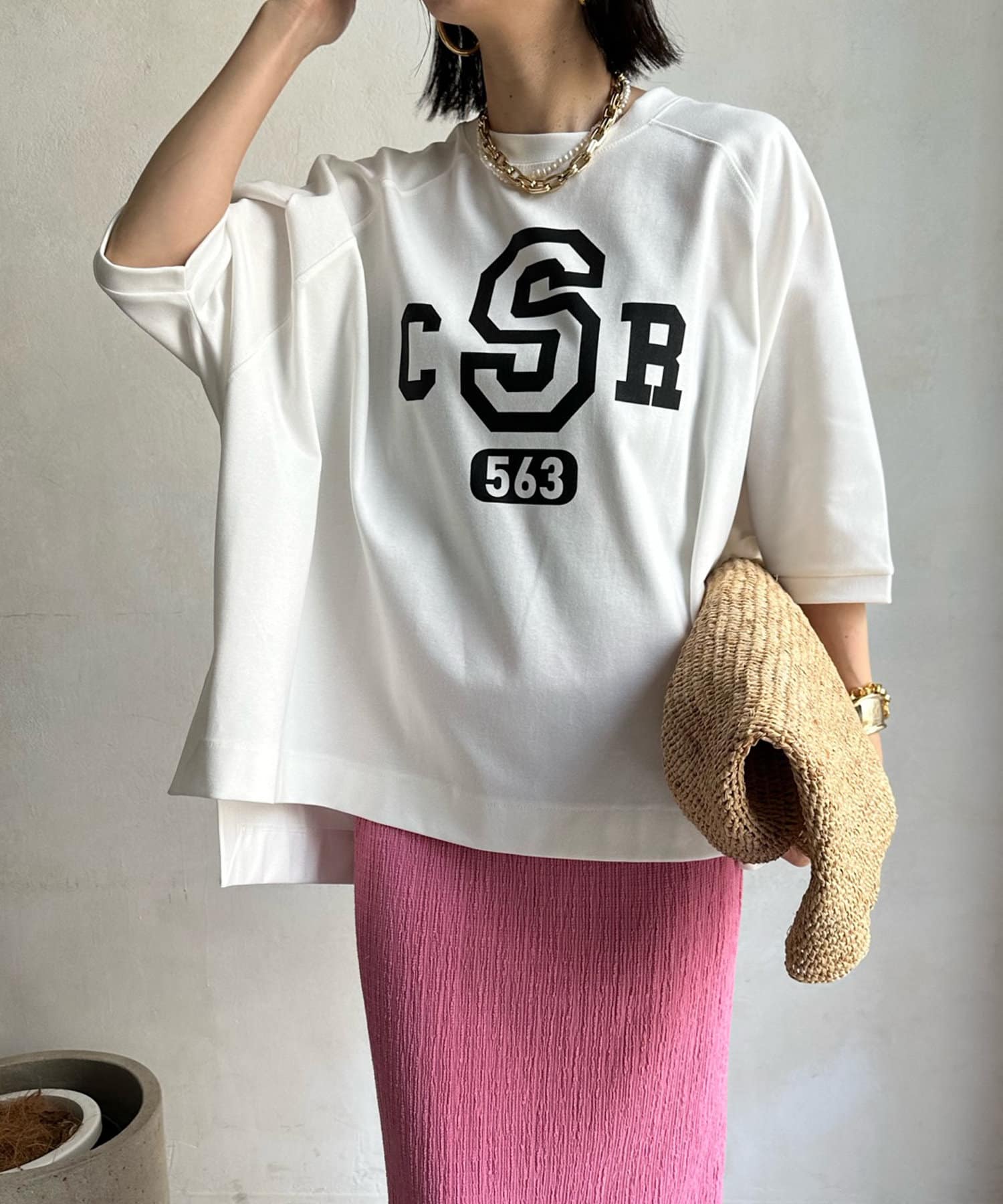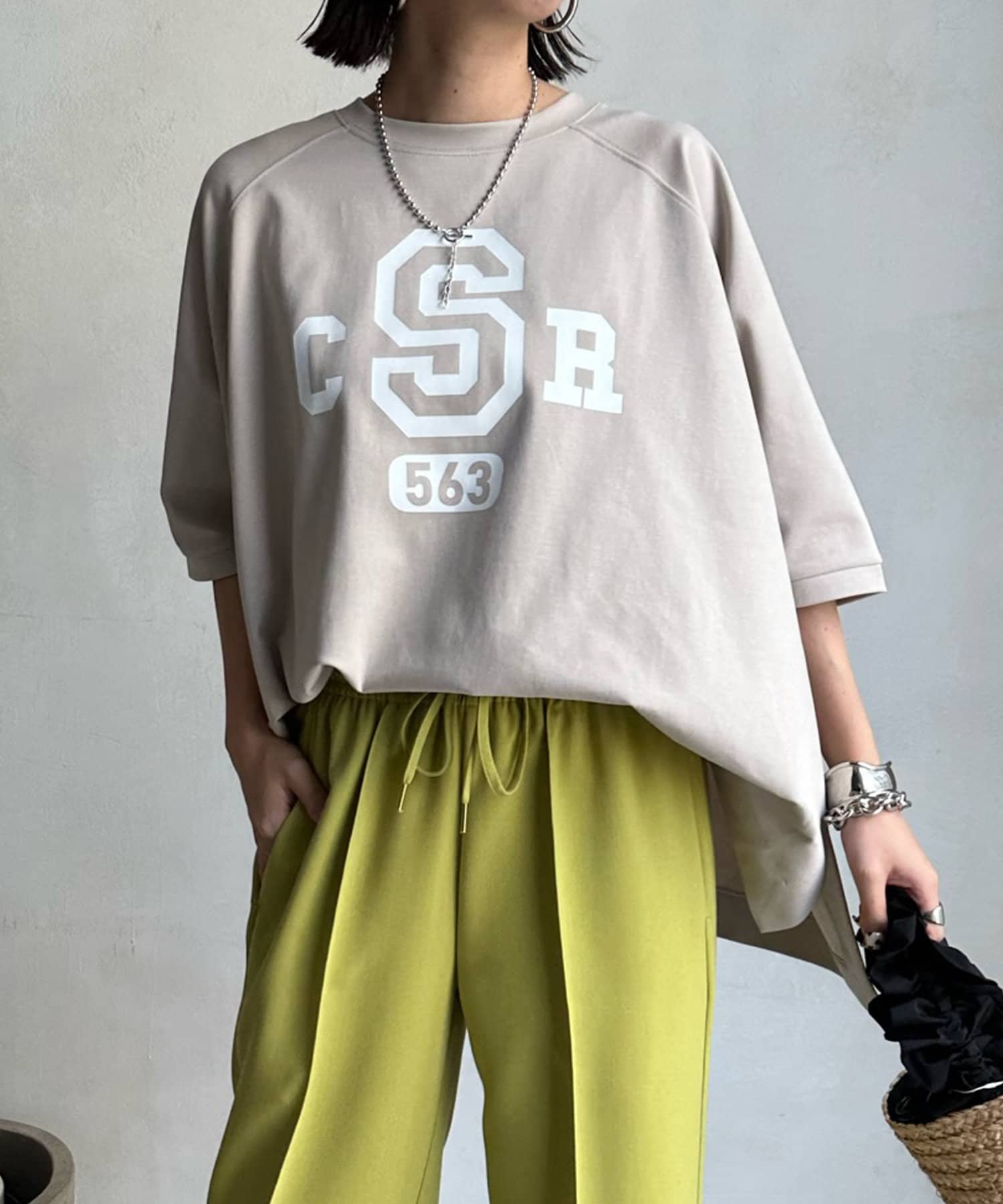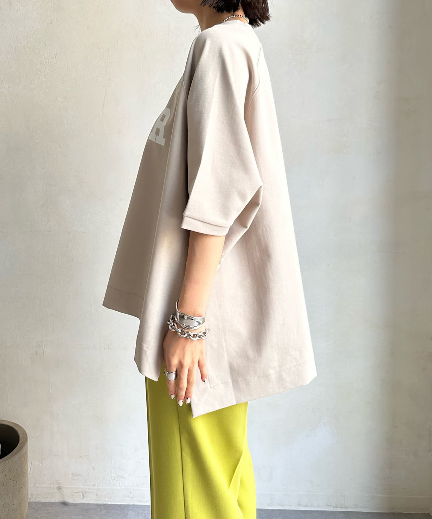 インパクトのある大きめのロゴがカジュアルな印象を与え、ドルマンスリーブで風通しもよく、体型カバーもかなえてくれます。