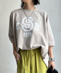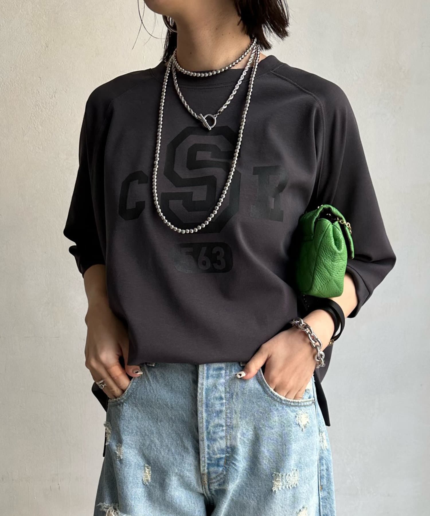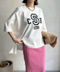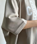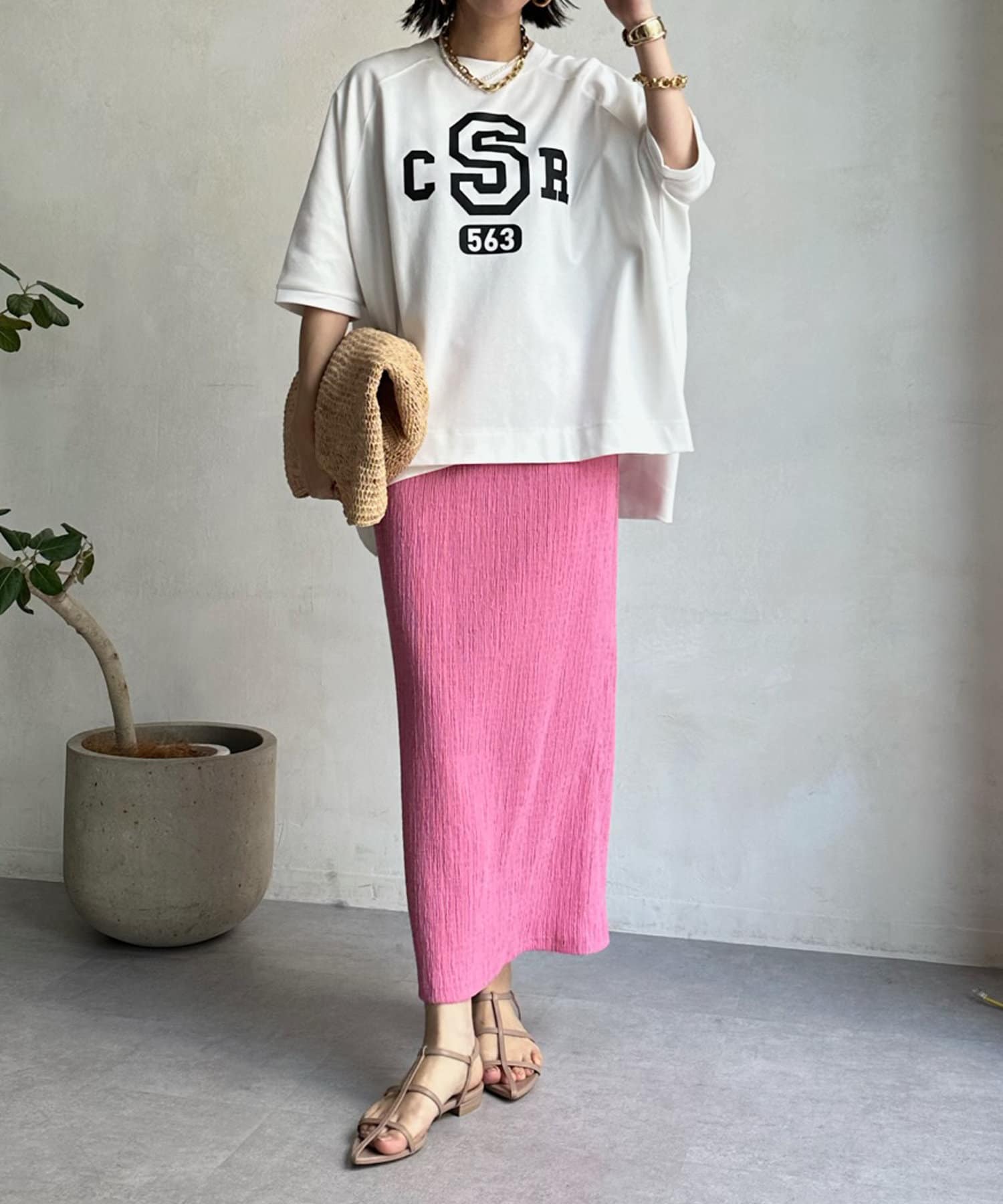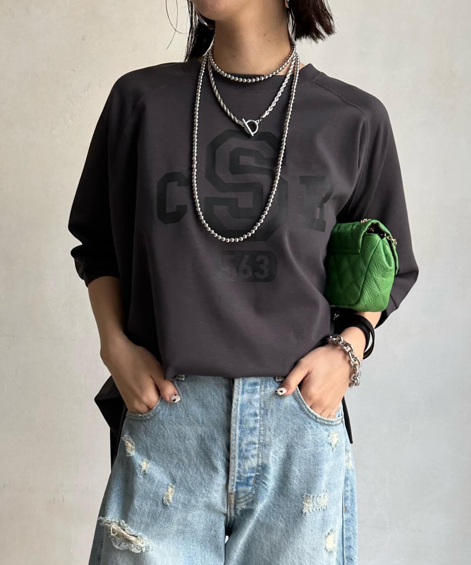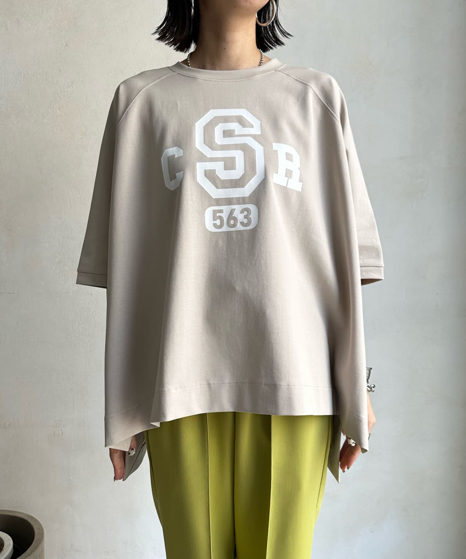 インパクトのある大きめのロゴがカジュアルな印象を与え、ドルマンスリーブで風通しもよく、体型カバーもかなえてくれます。