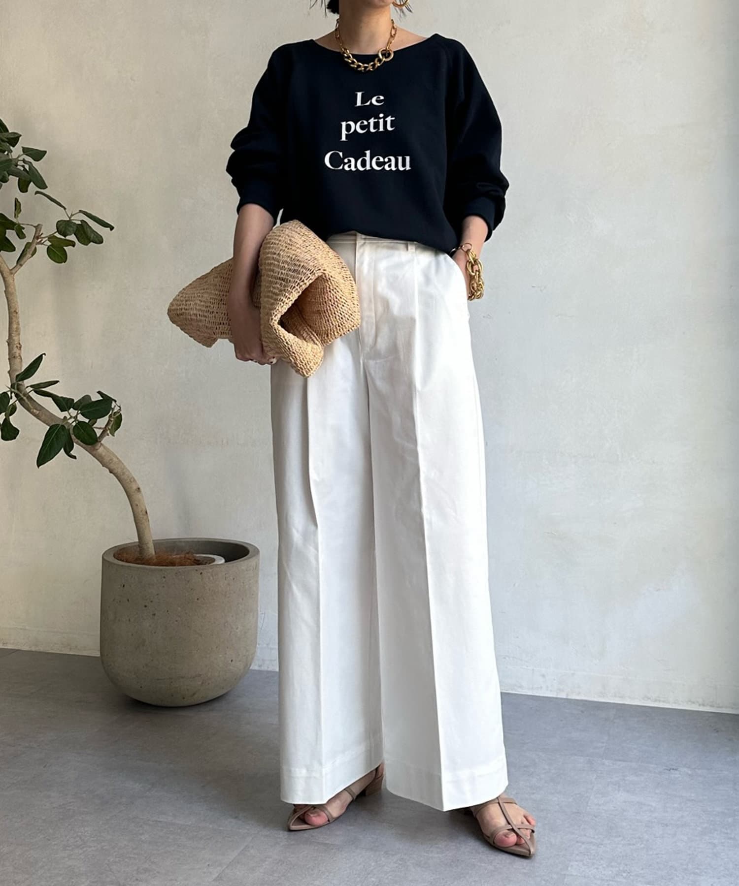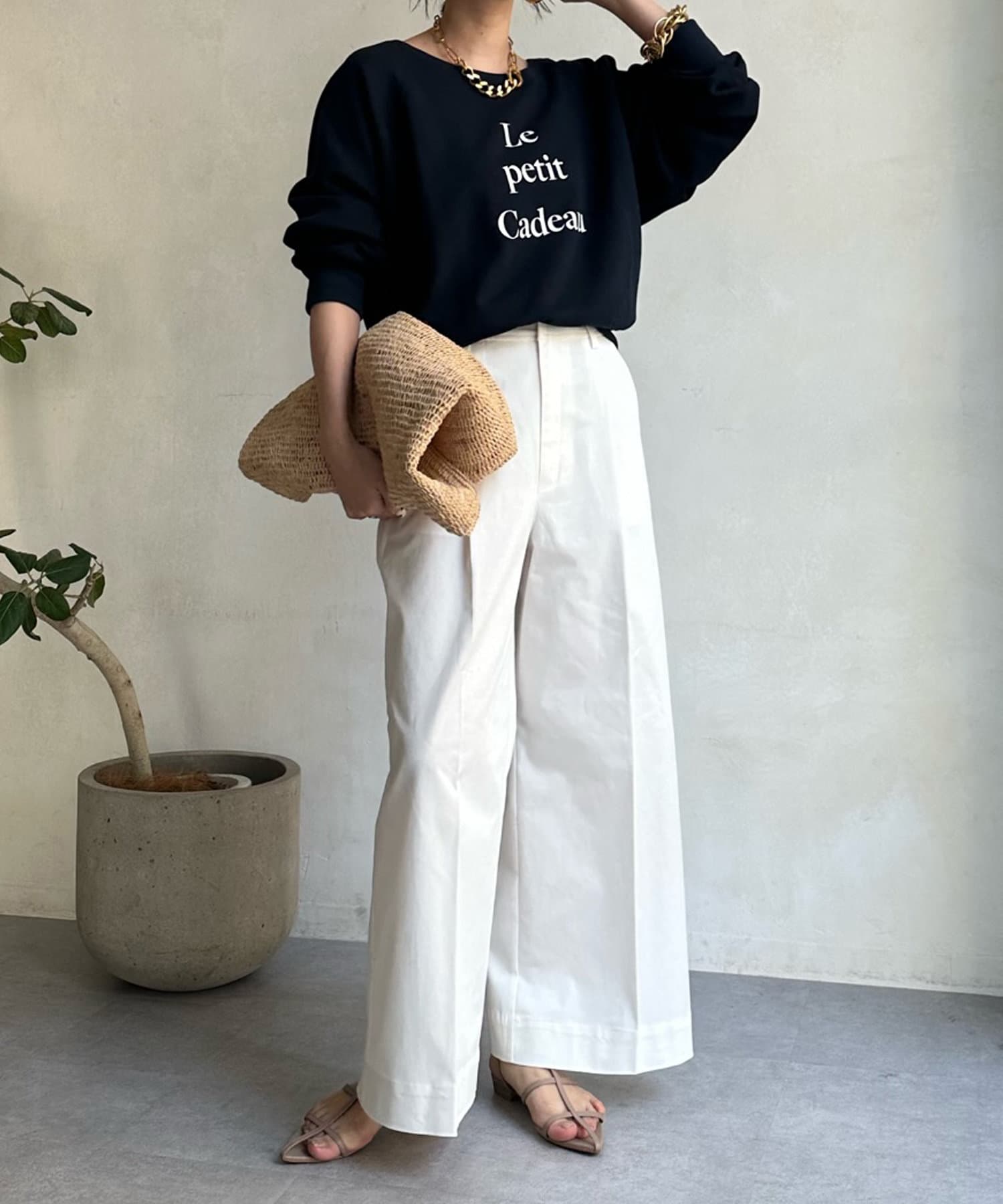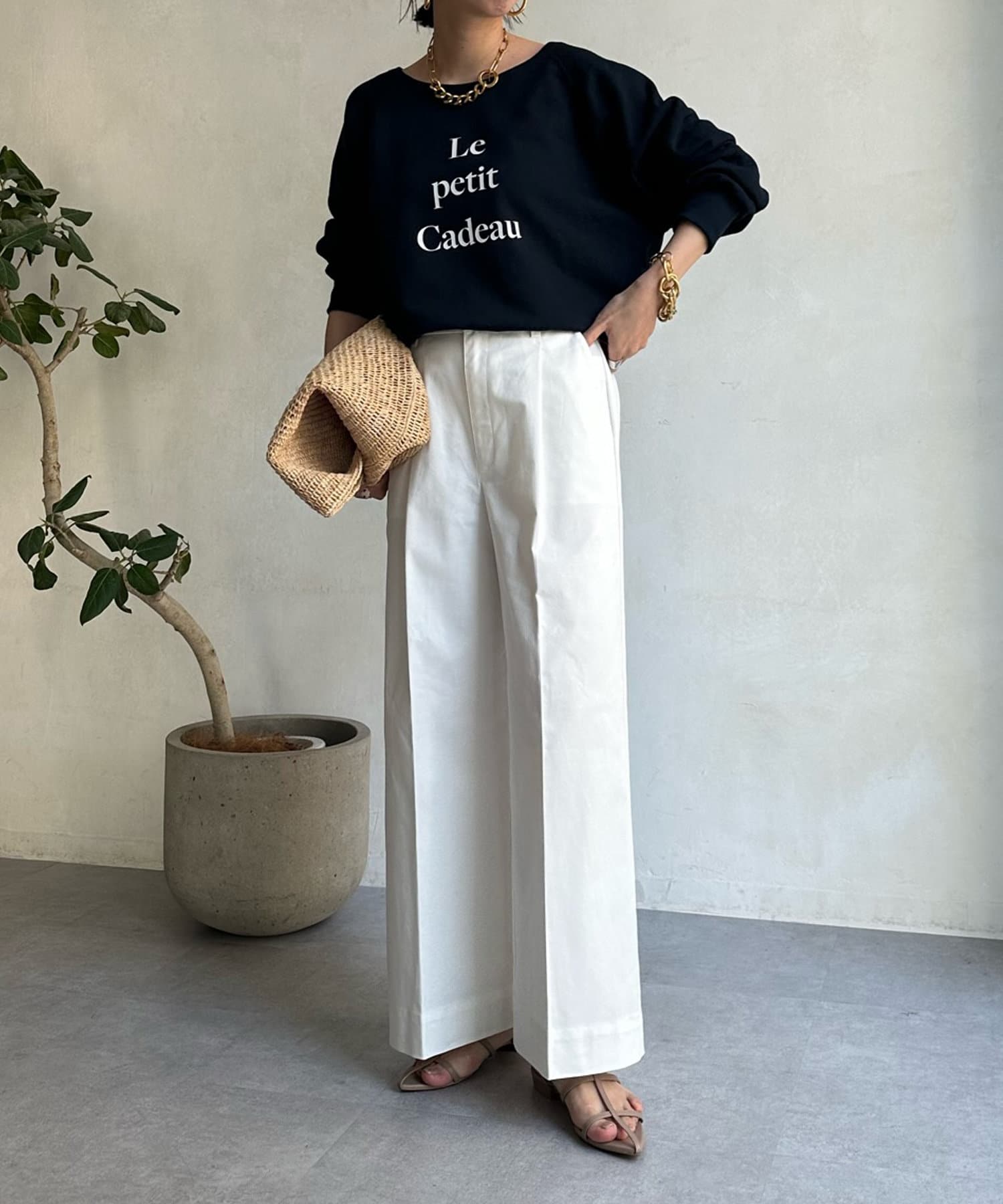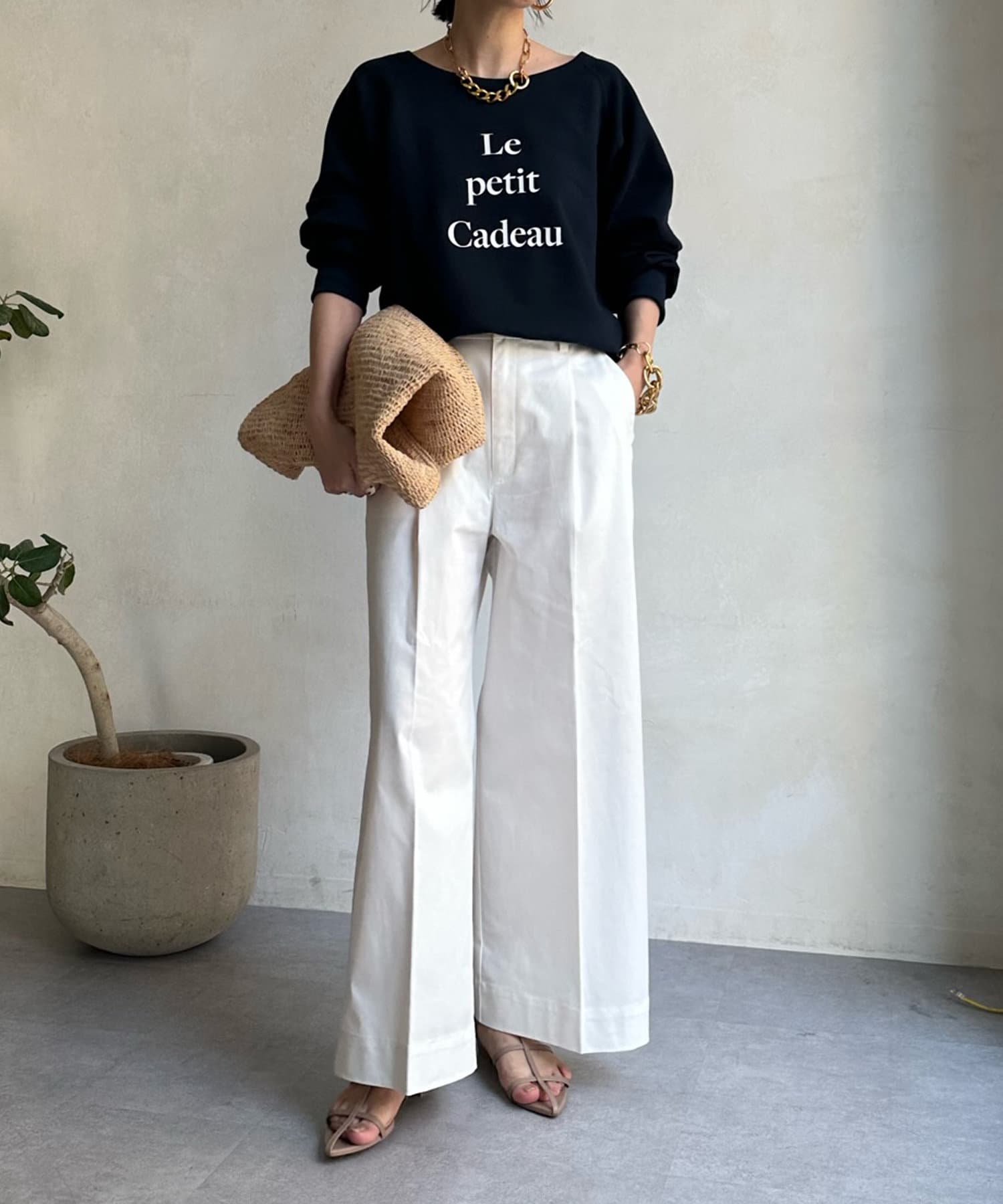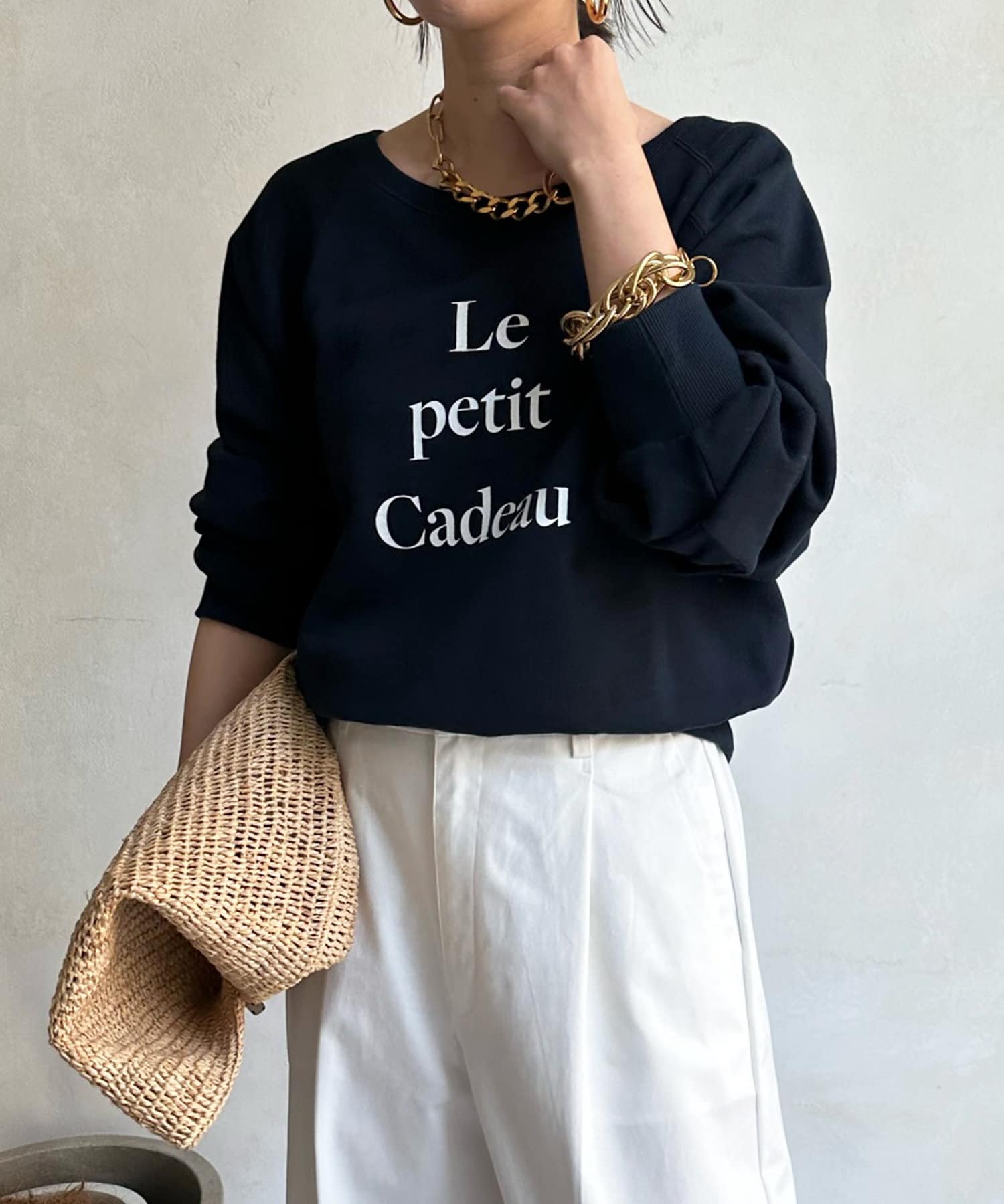 ショート丈だけど短すぎない絶妙な丈感と、カジュアルになりすぎないロゴのデザインが大人らしく着られるポイント。