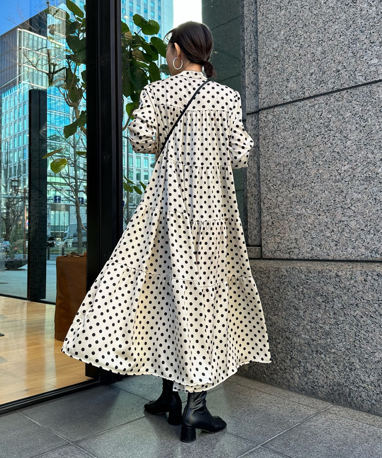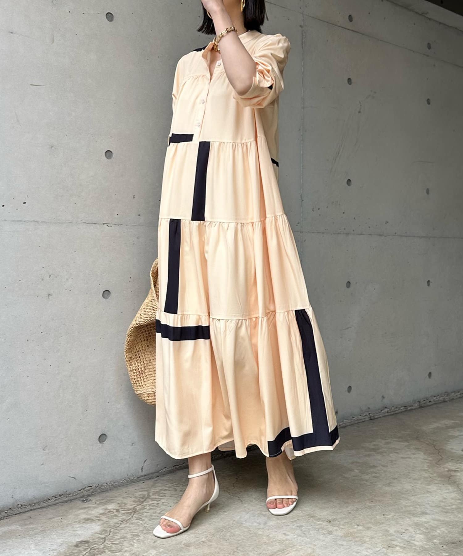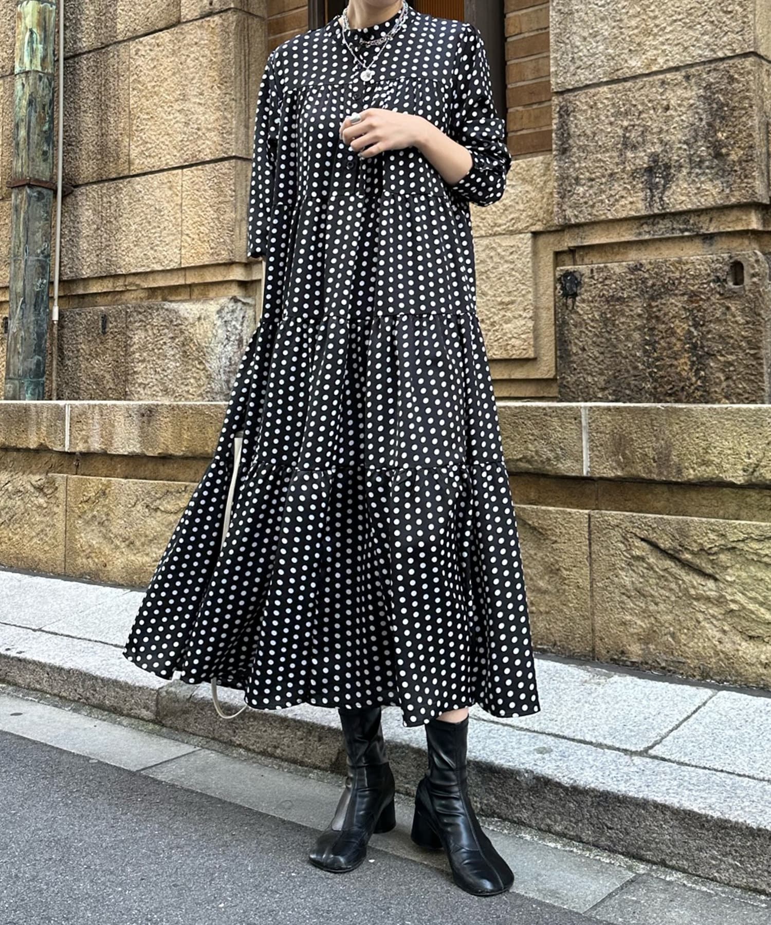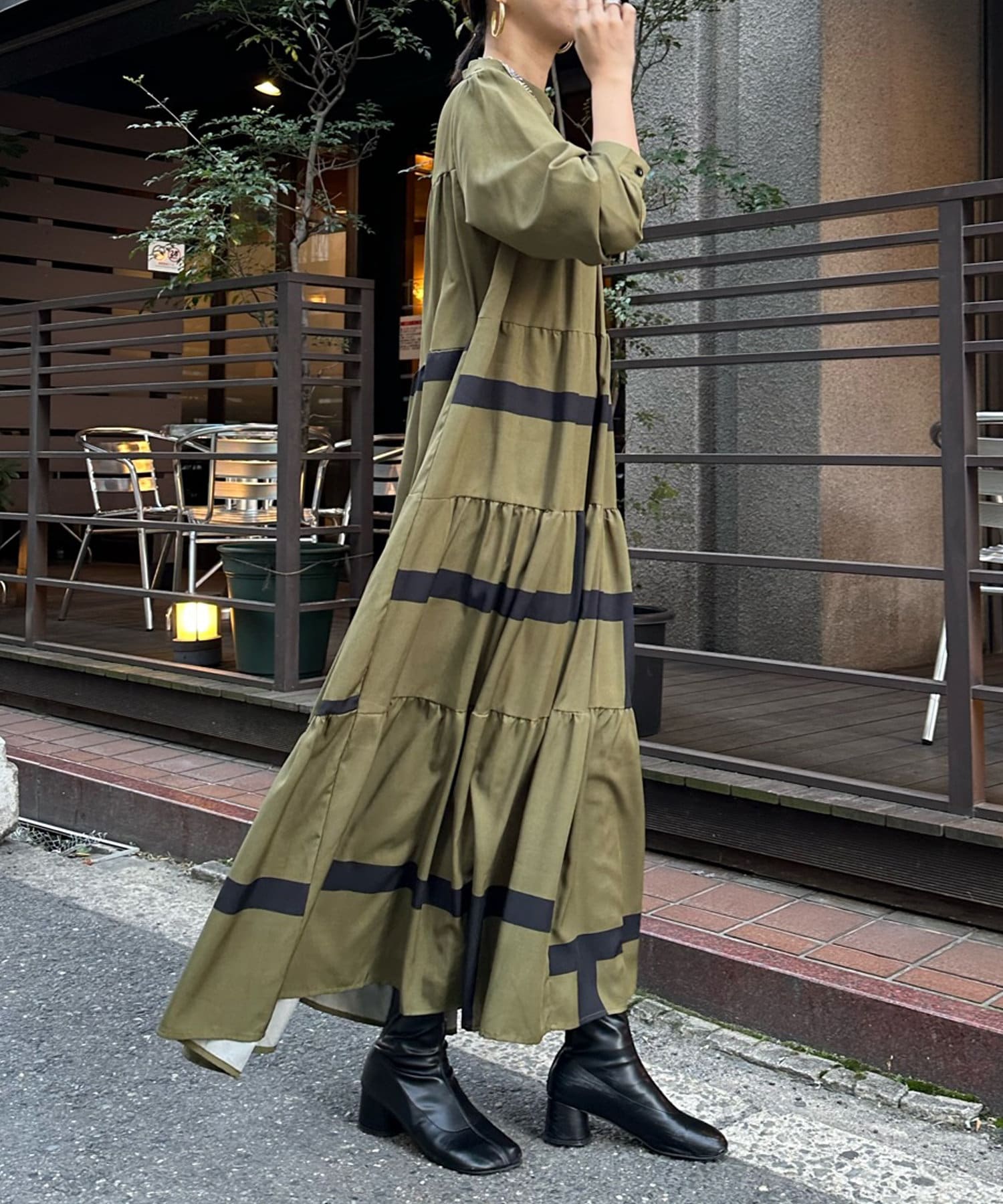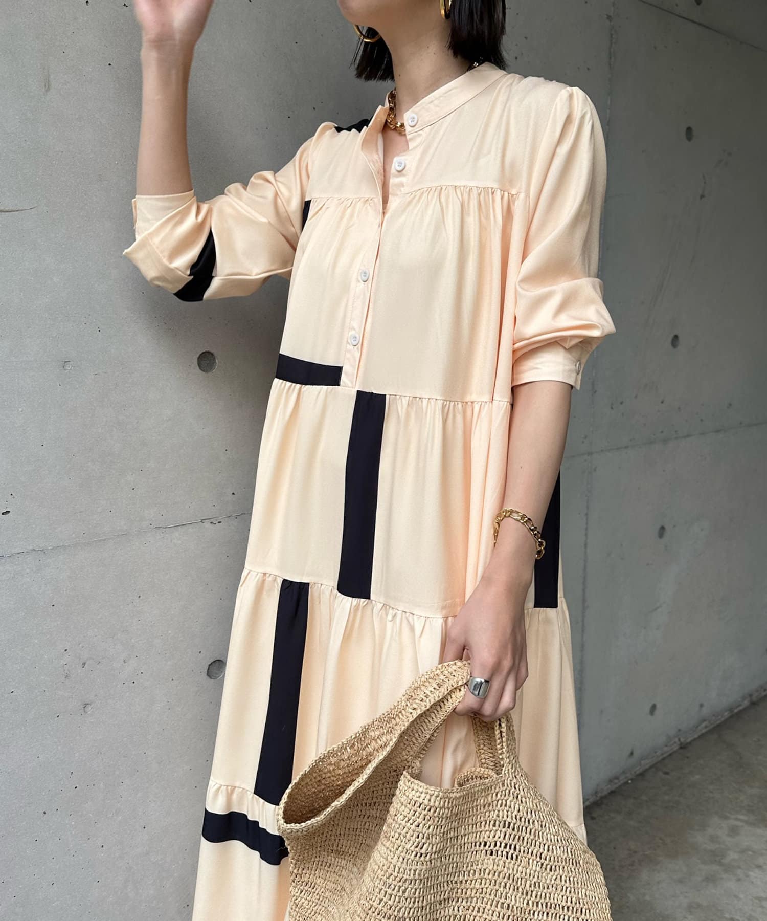 裾に向かって広がりの出るシルエットで、切り替えのティアードシルエットが大人ガーリーな雰囲気を醸し出します。
