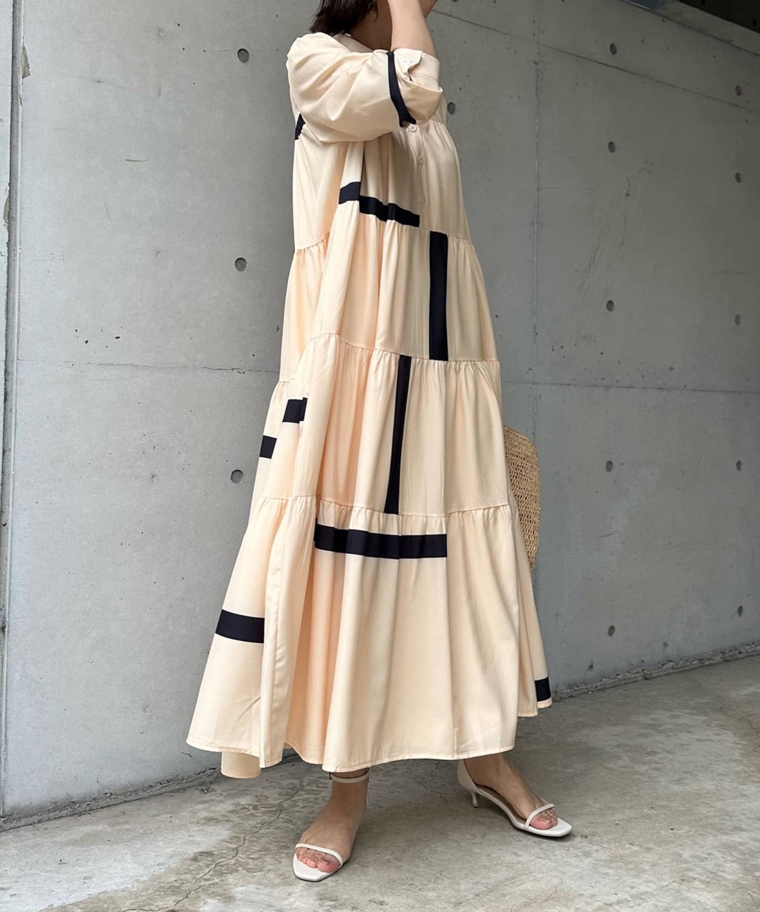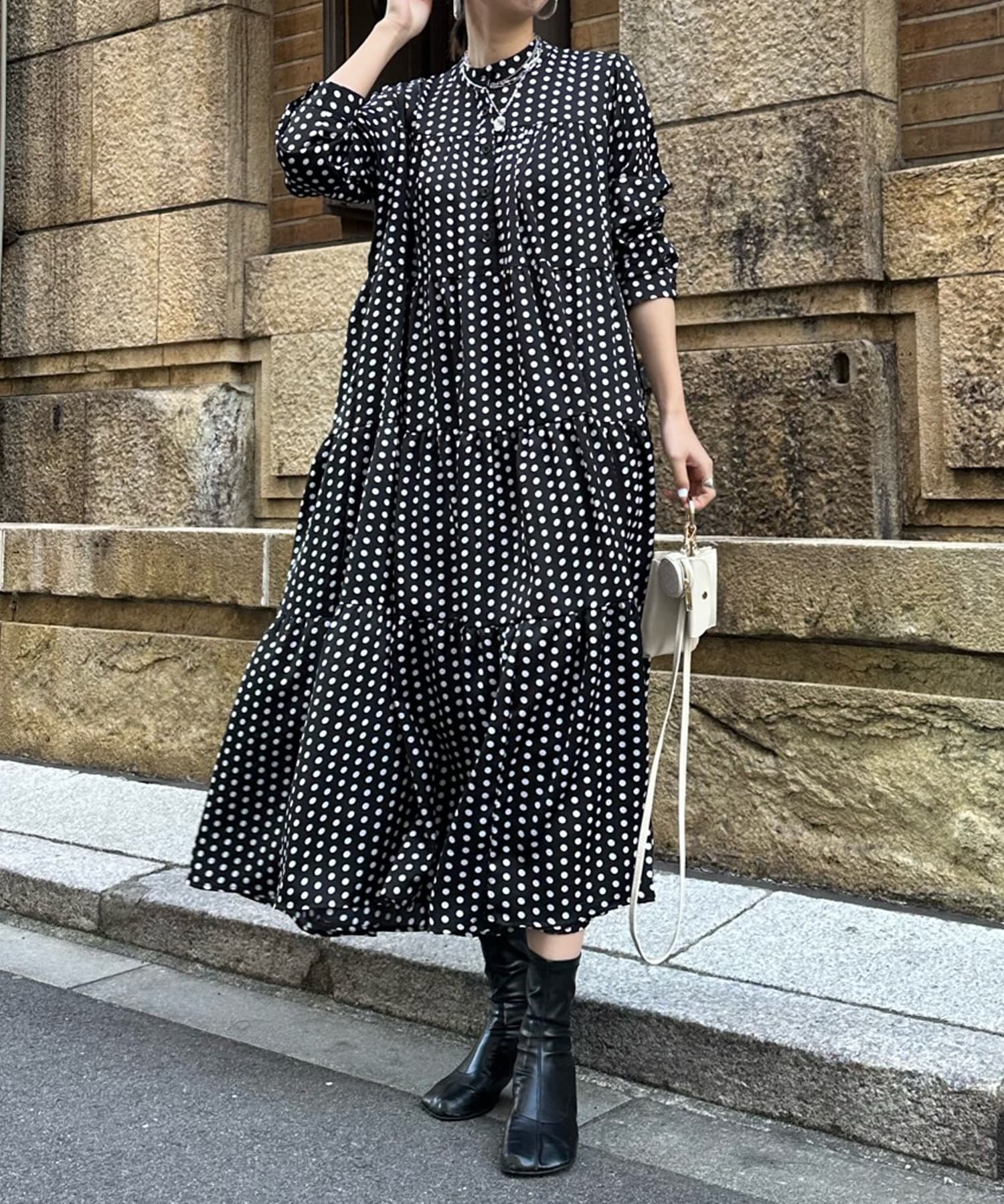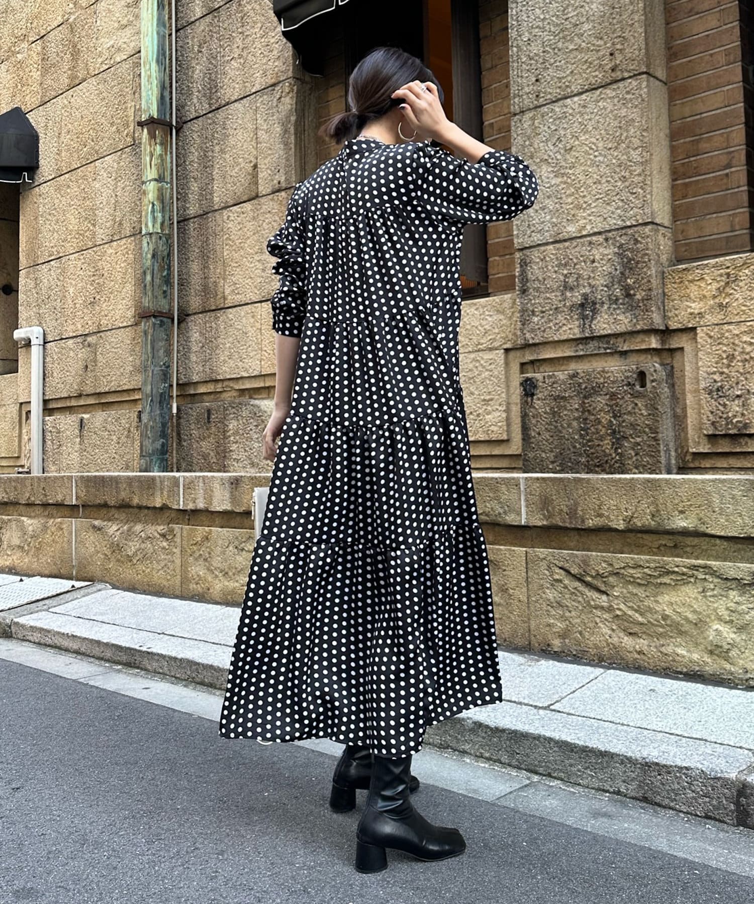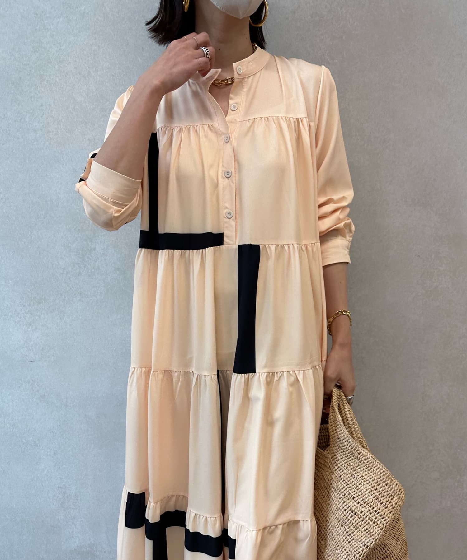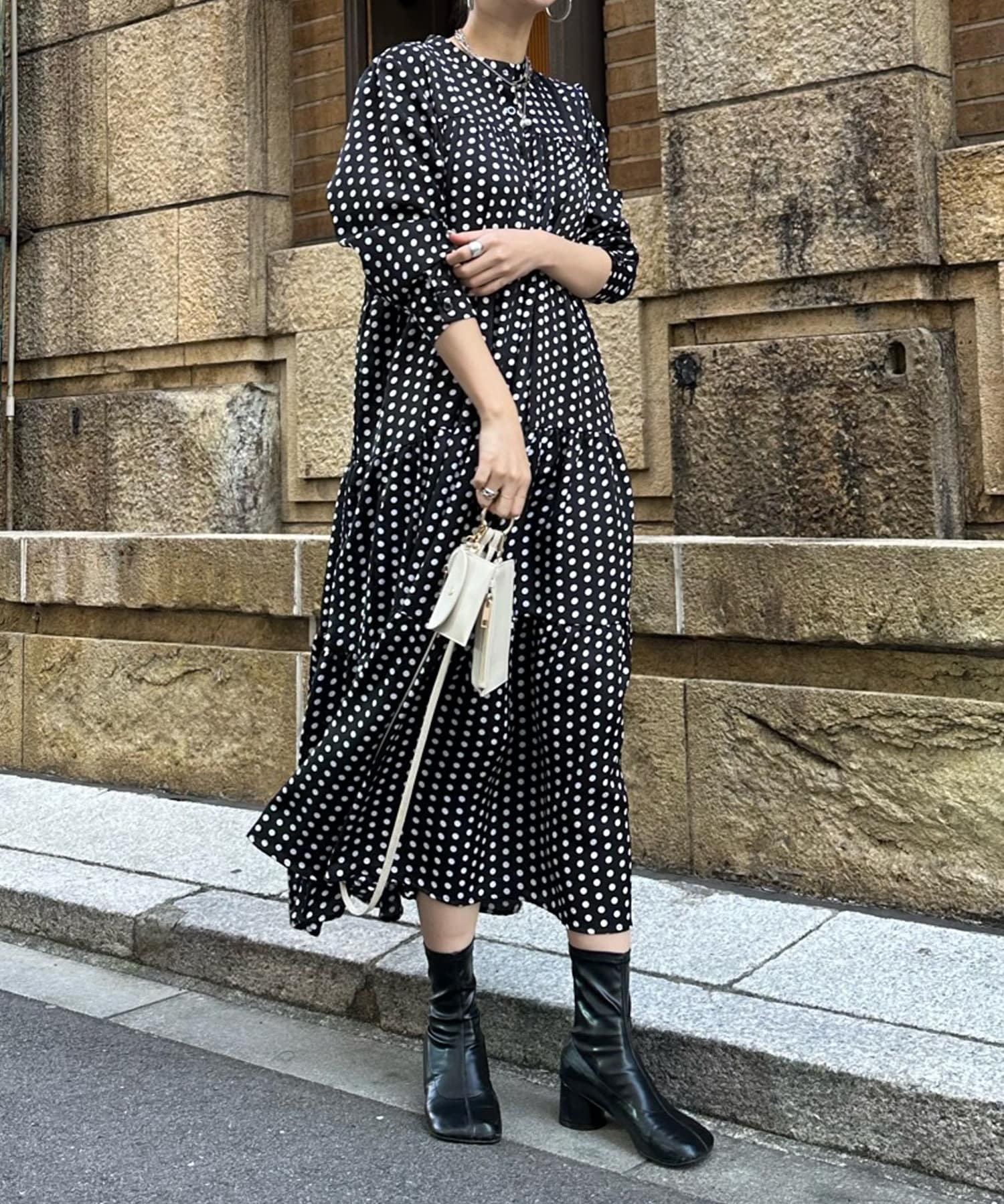 裾に向かって広がりの出るシルエットで、切り替えのティアードシルエットが大人ガーリーな雰囲気を醸し出します。