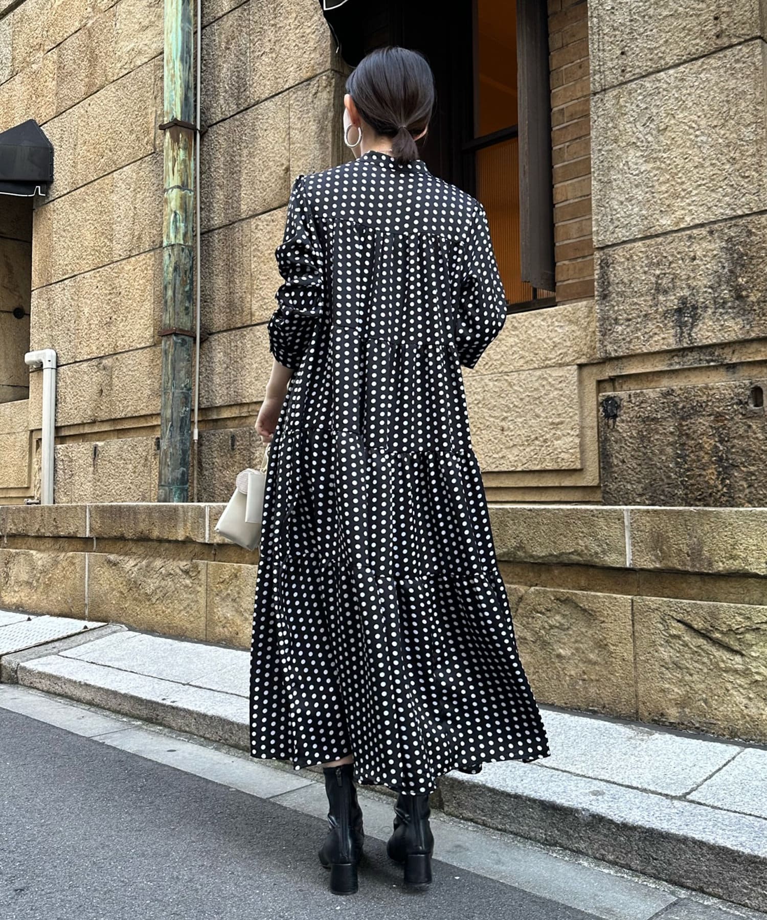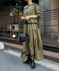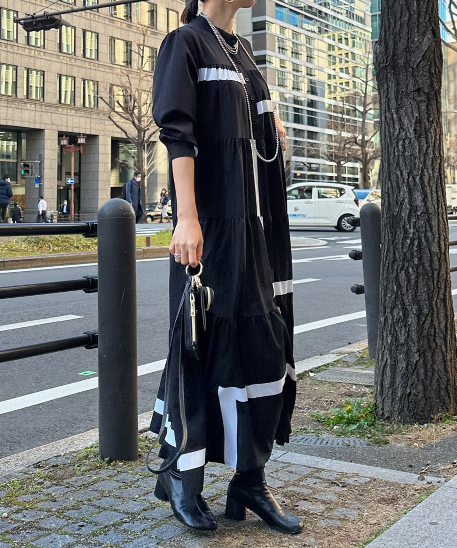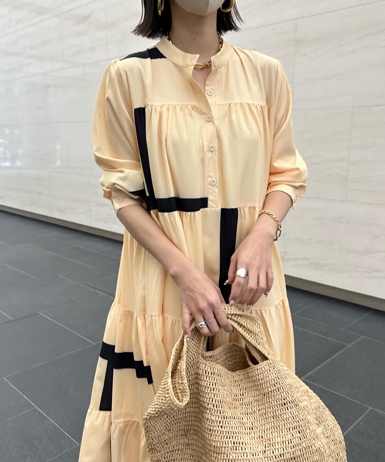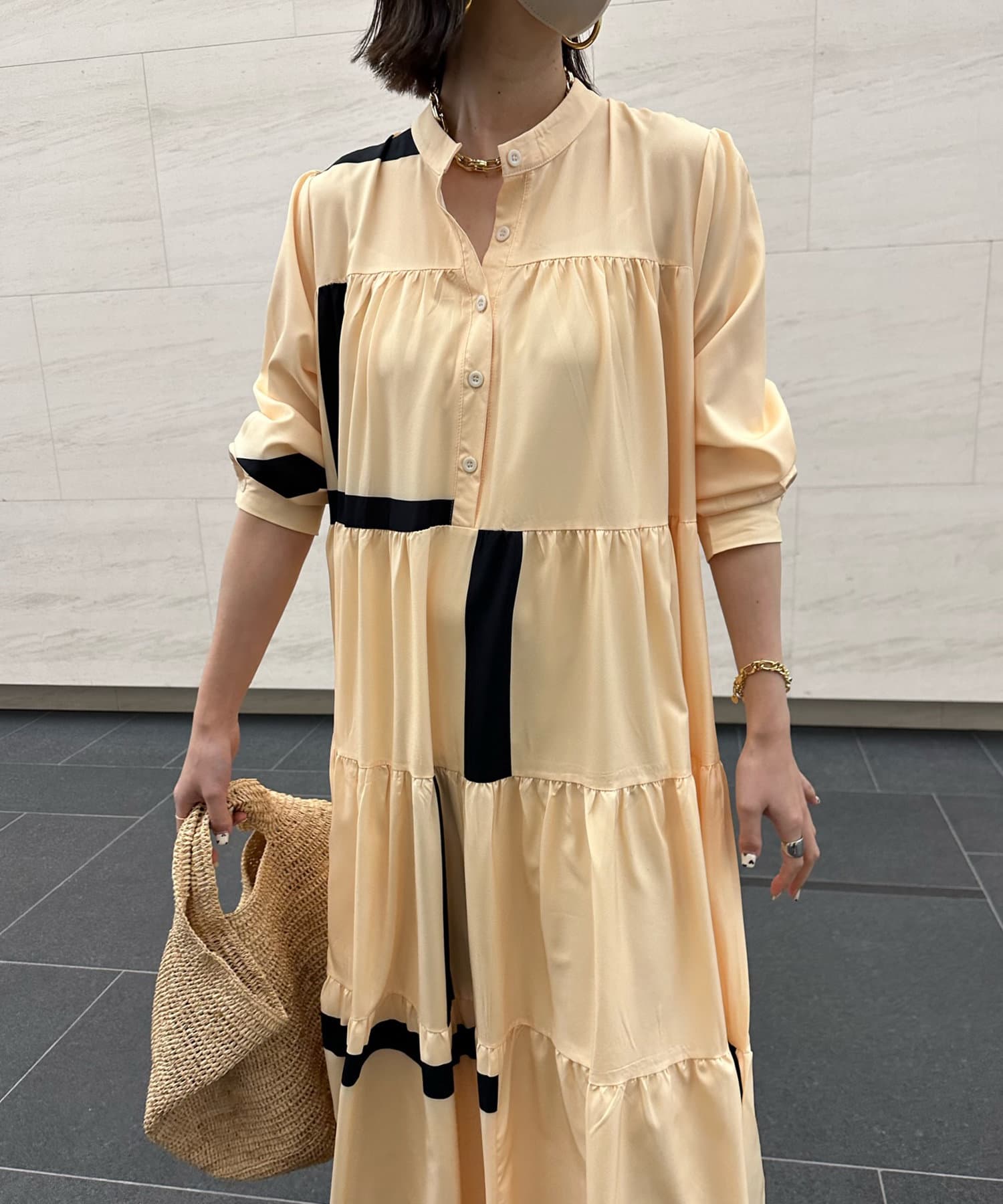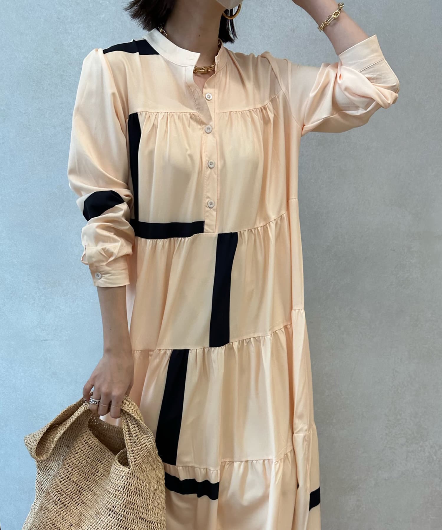 裾に向かって広がりの出るシルエットで、切り替えのティアードシルエットが大人ガーリーな雰囲気を醸し出します。