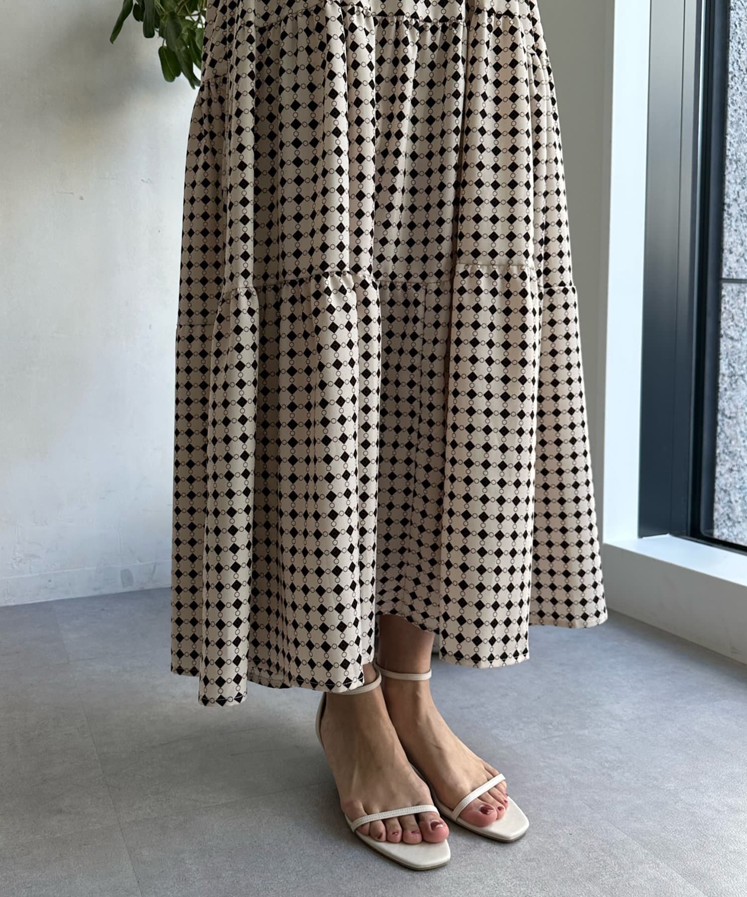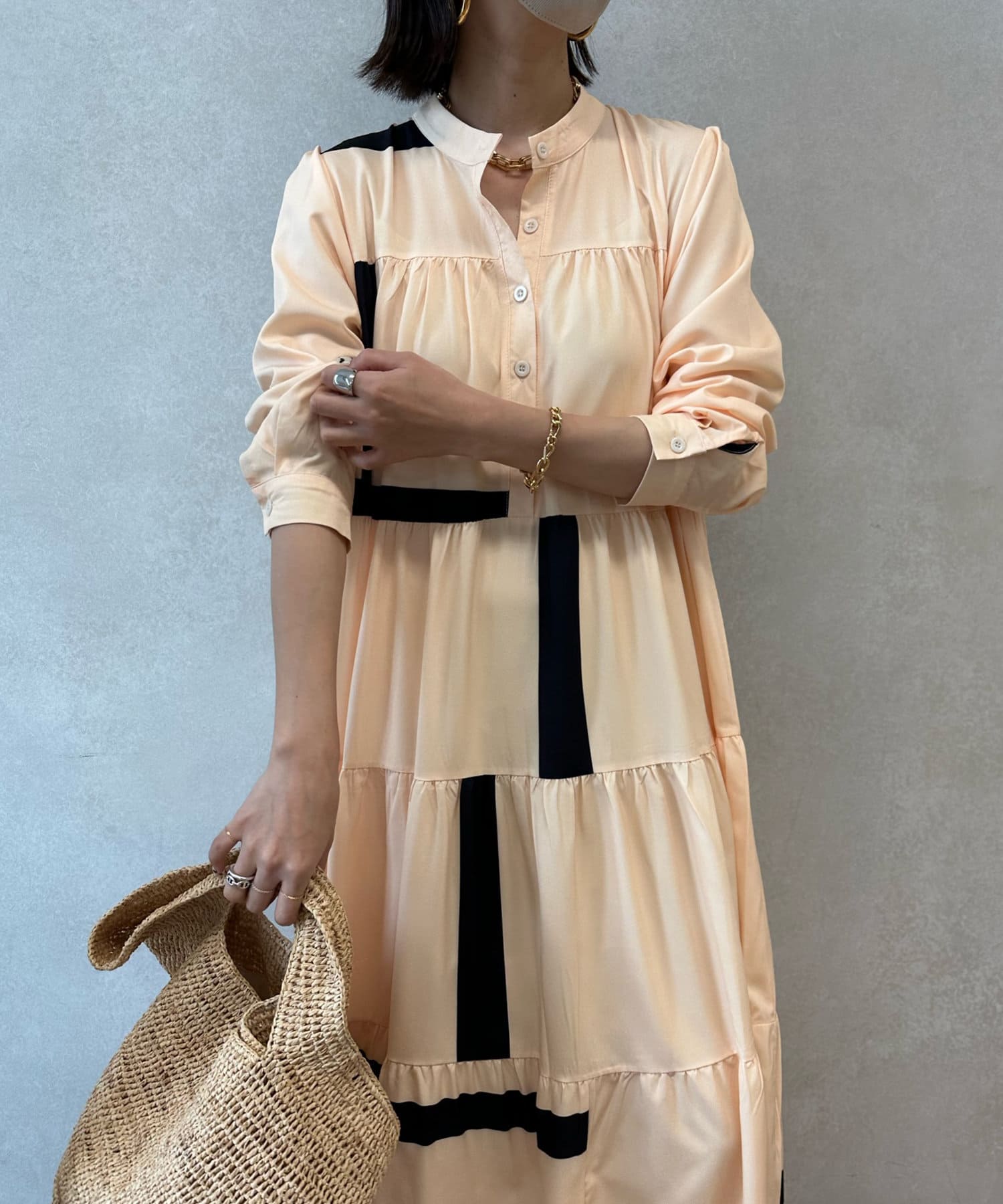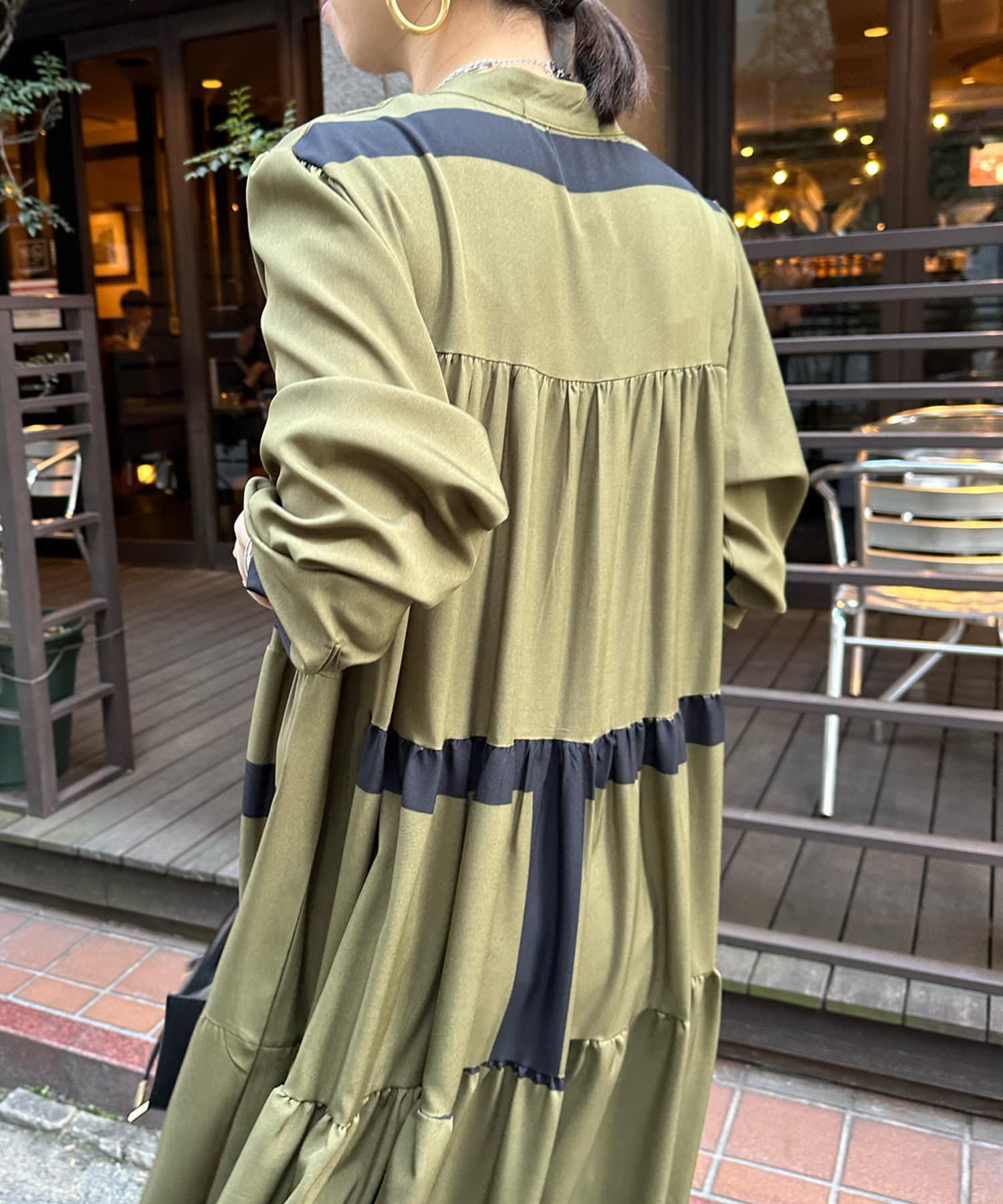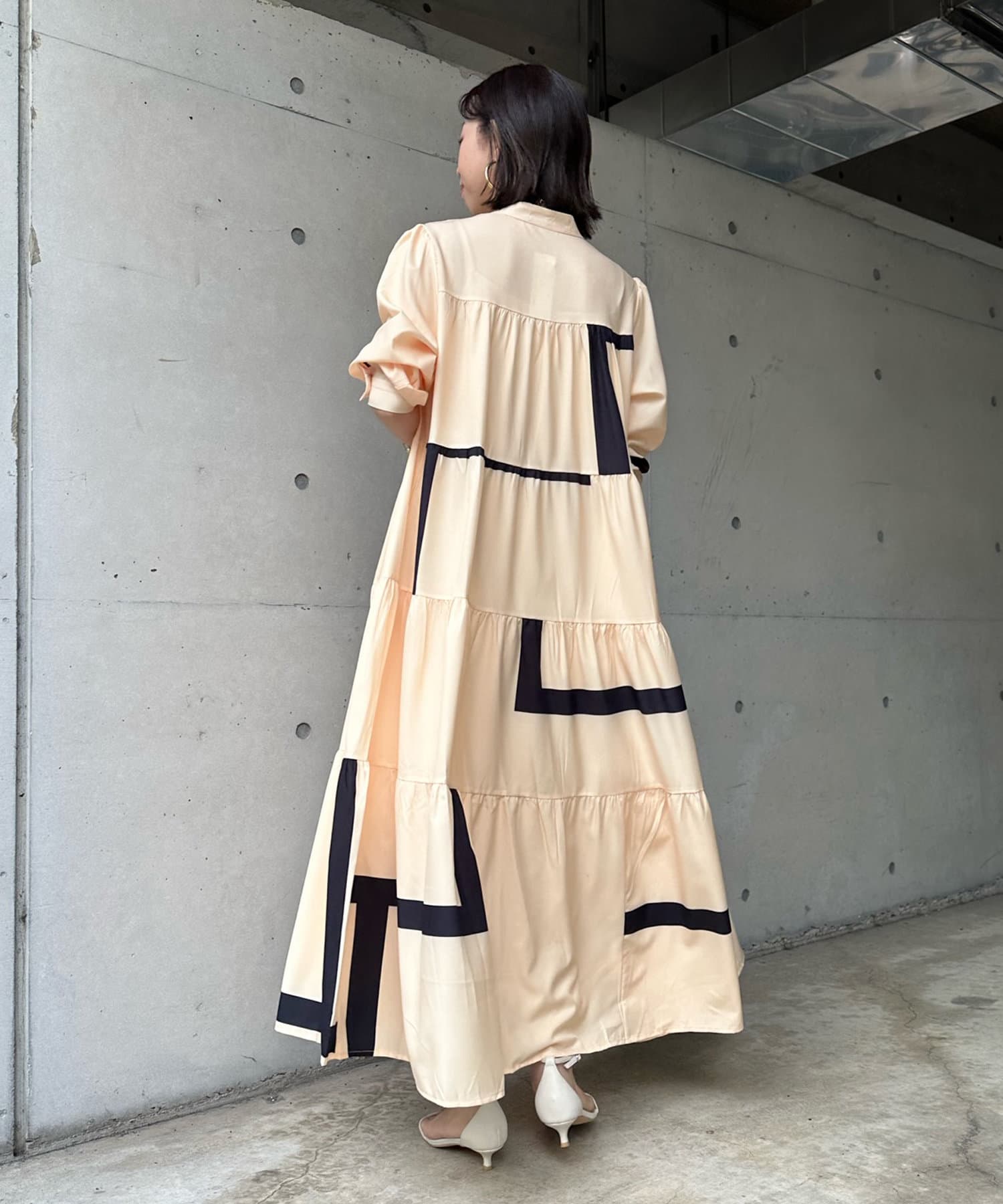 裾に向かって広がりの出るシルエットで、切り替えのティアードシルエットが大人ガーリーな雰囲気を醸し出します。