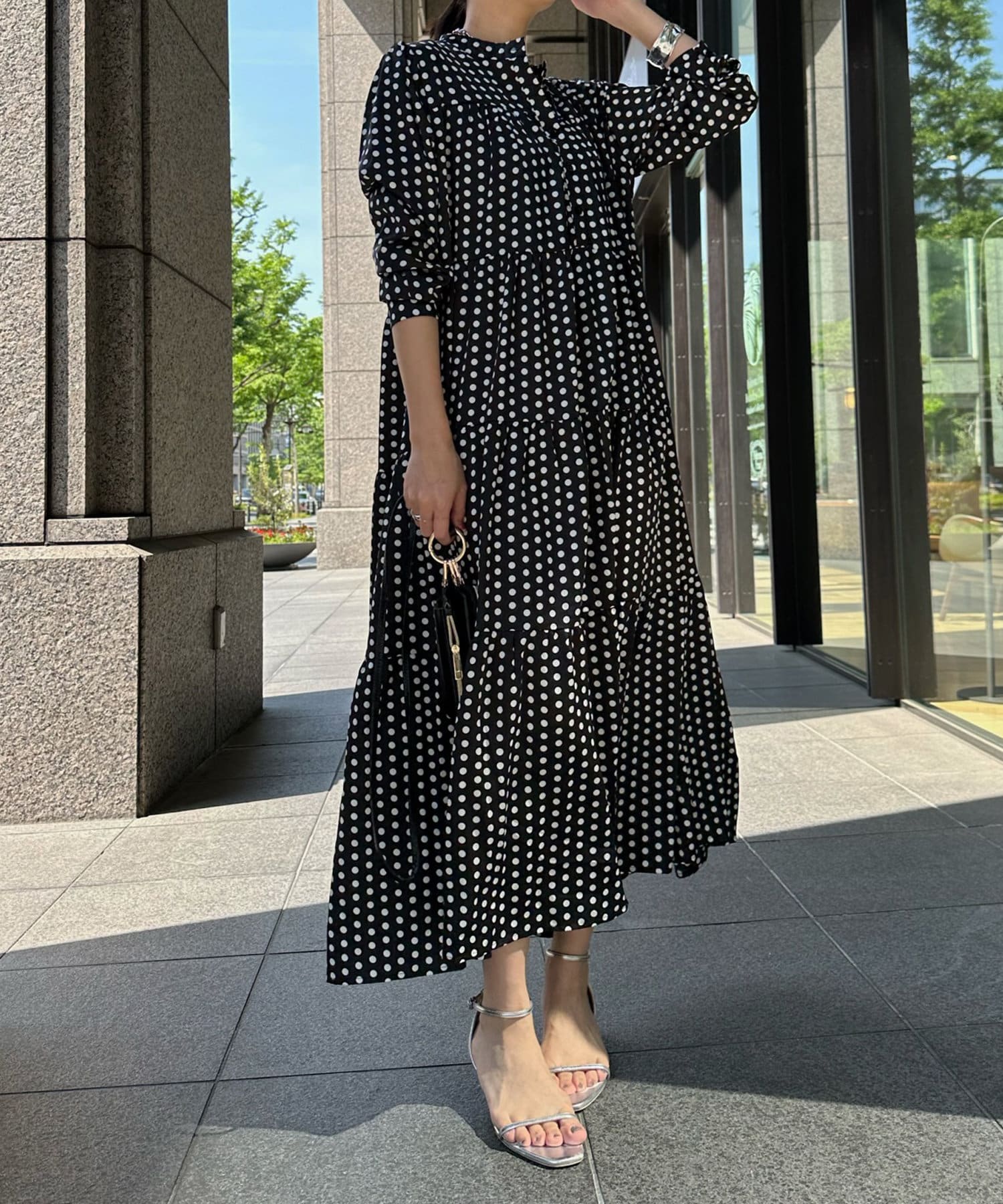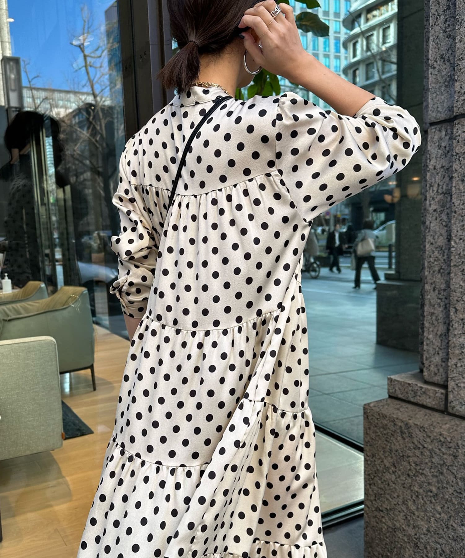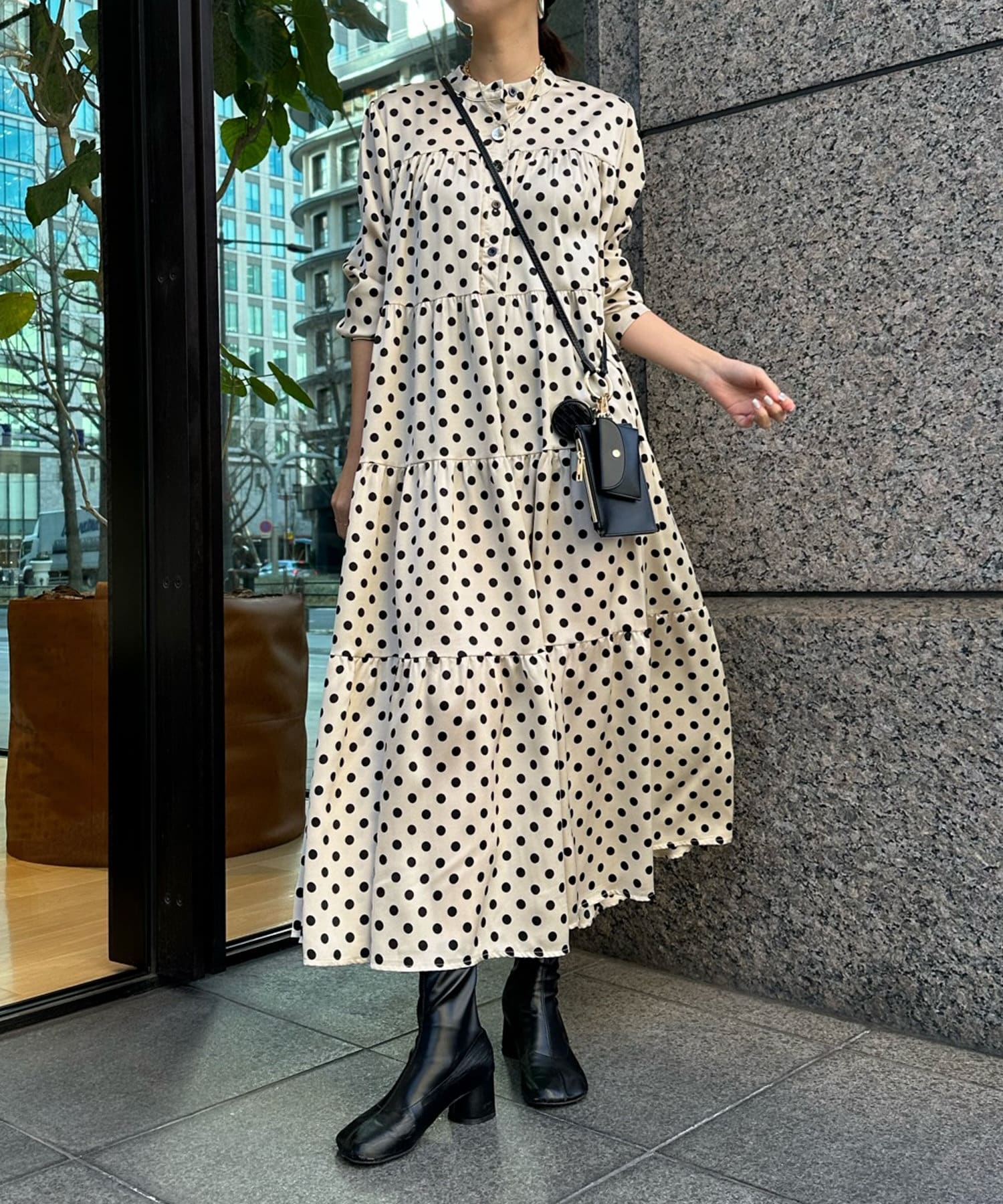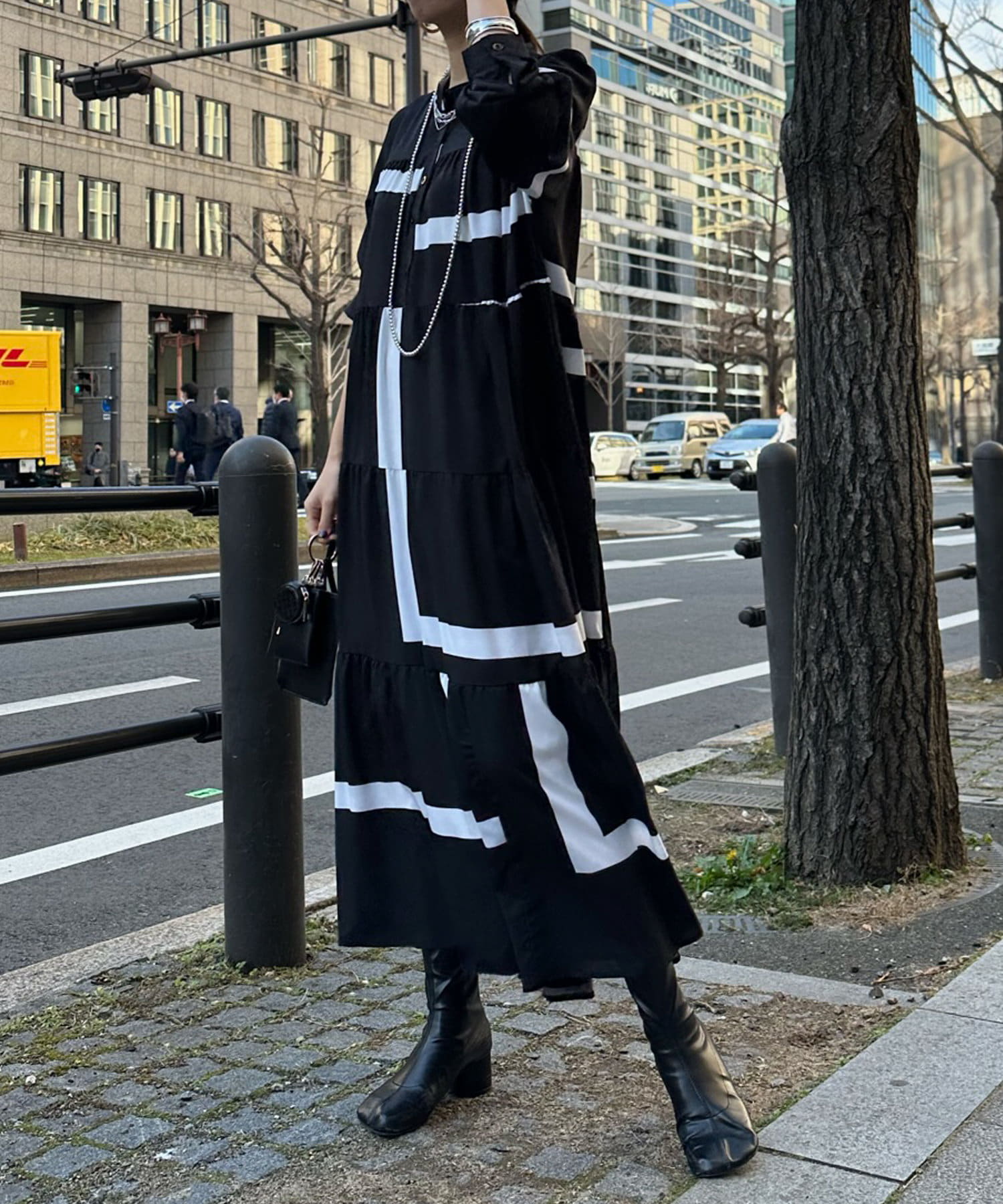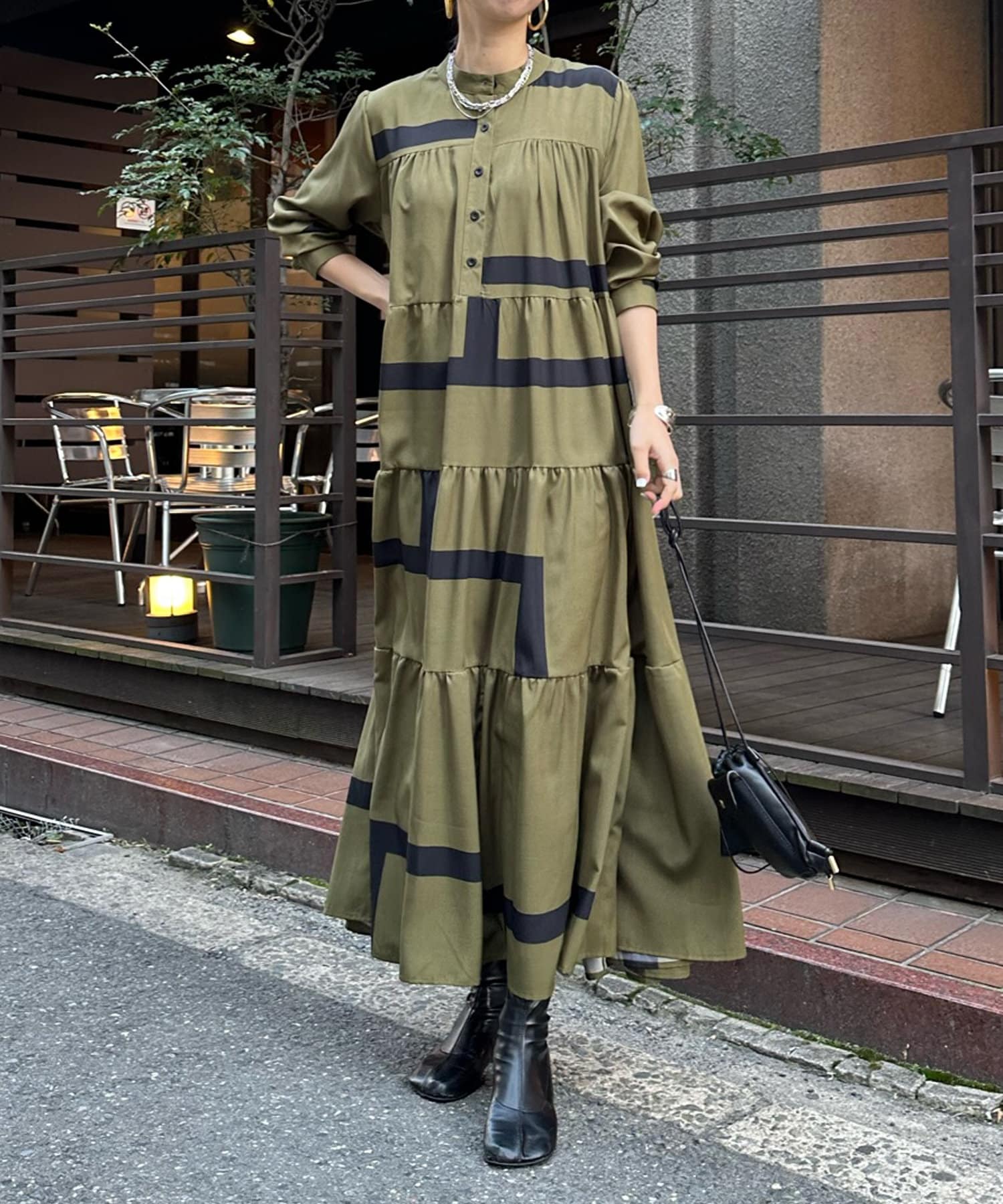 裾に向かって広がりの出るシルエットで、切り替えのティアードシルエットが大人ガーリーな雰囲気を醸し出します。