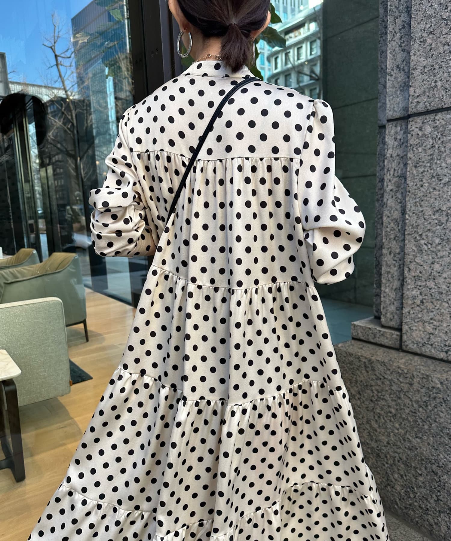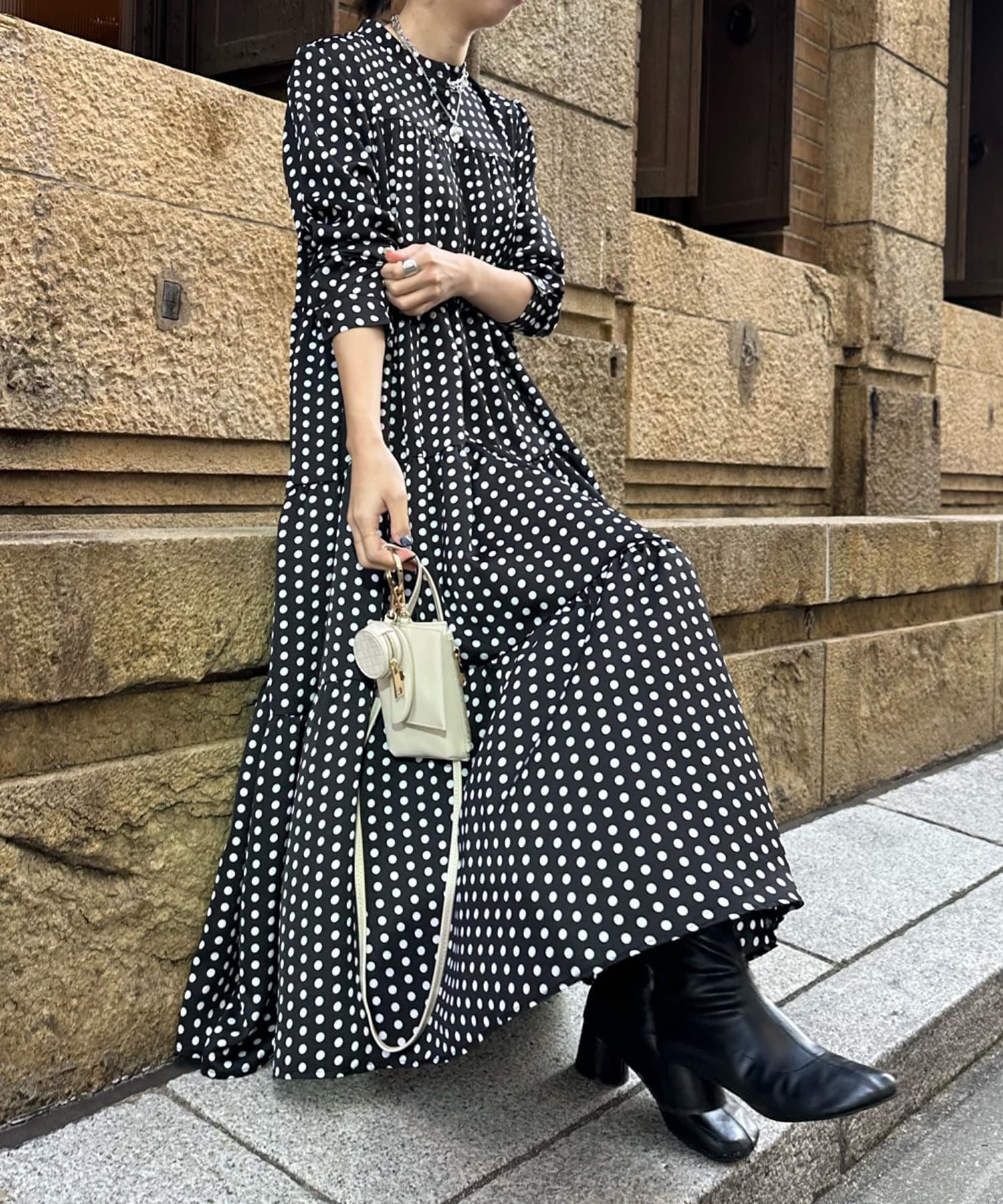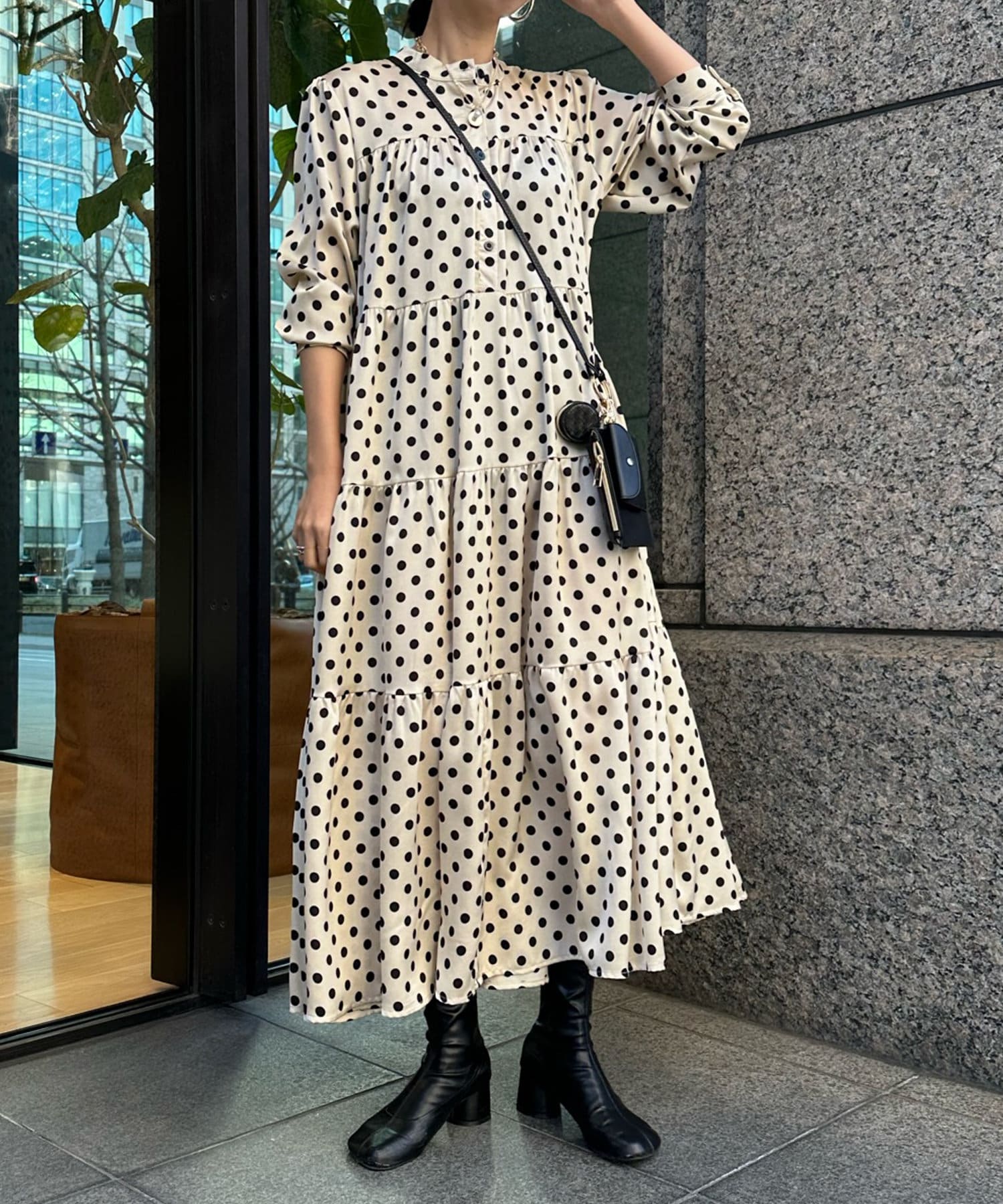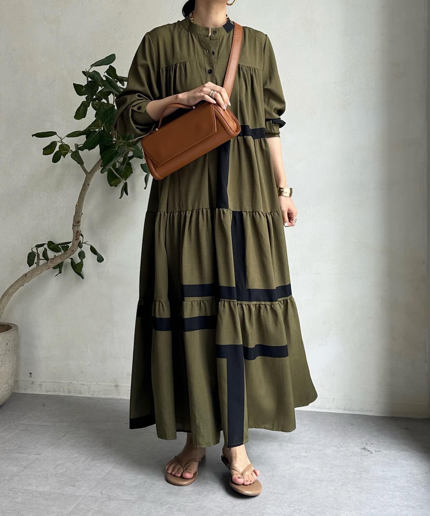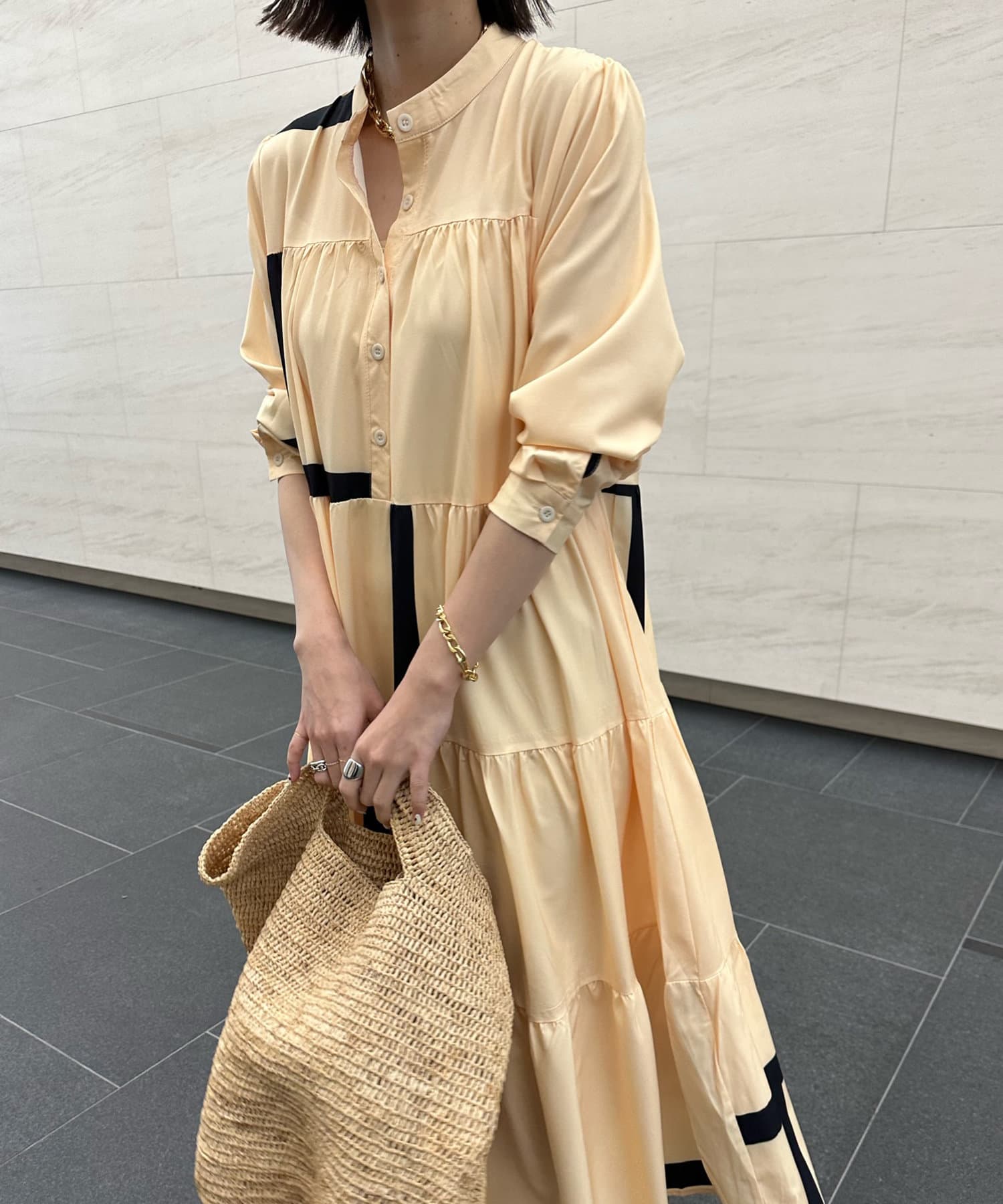裾に向かって広がりの出るシルエットで、切り替えのティアードシルエットが大人ガーリーな雰囲気を醸し出します。