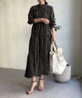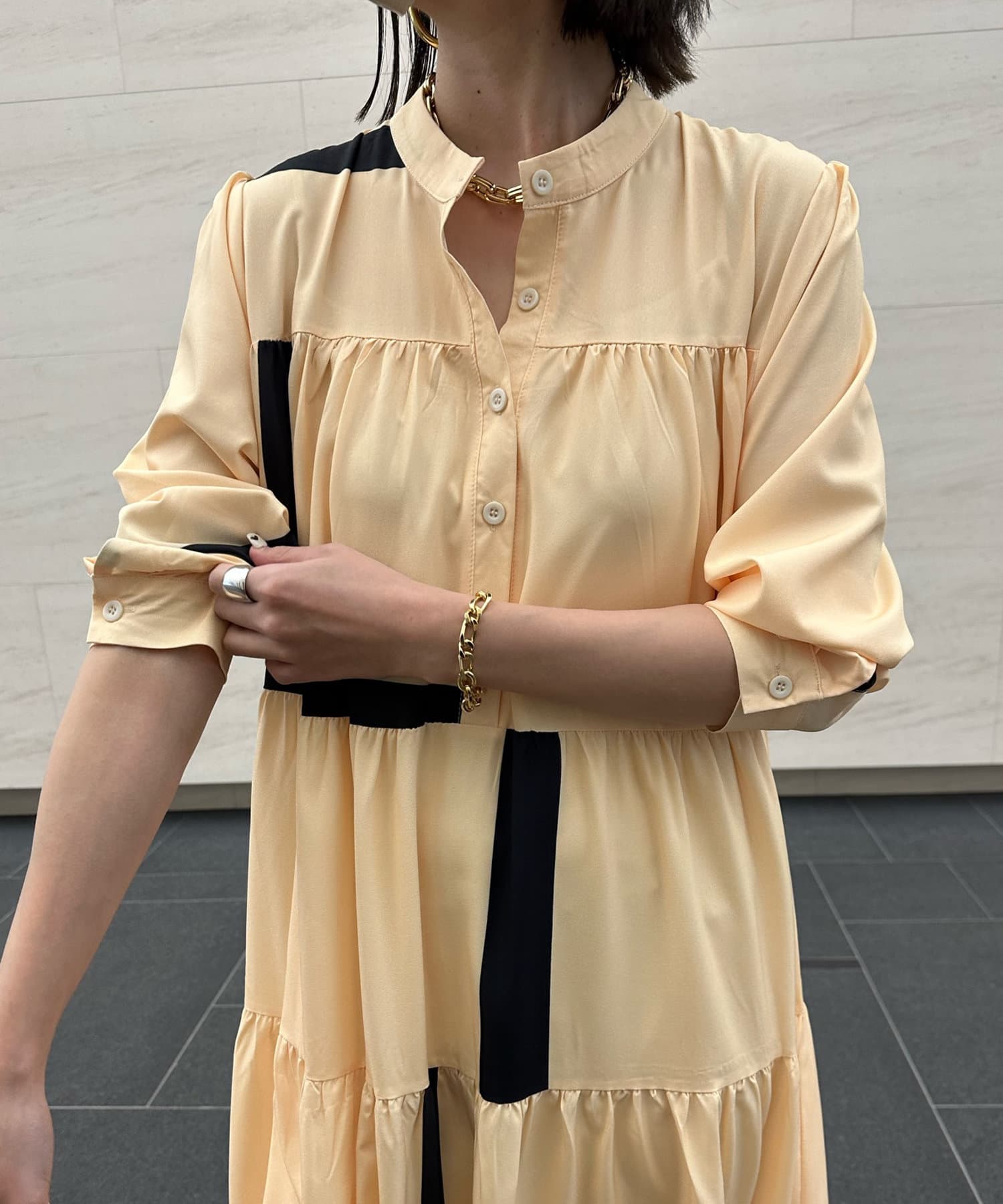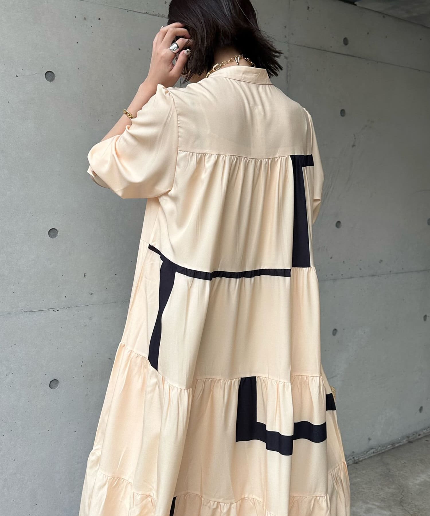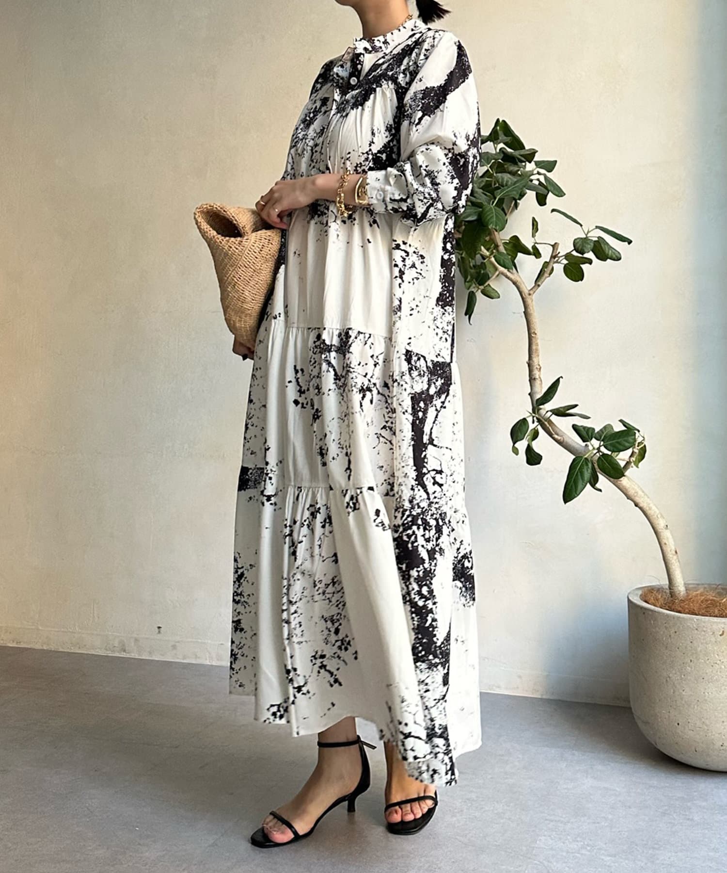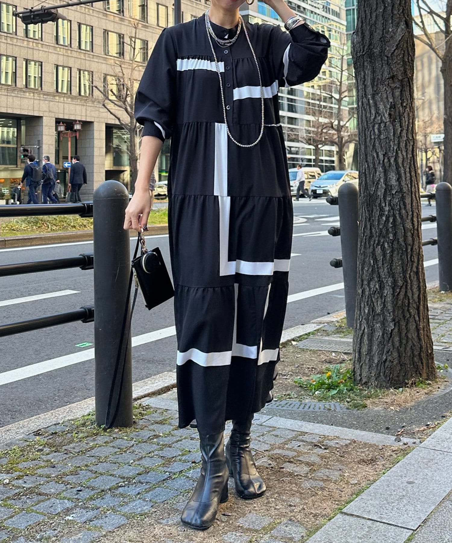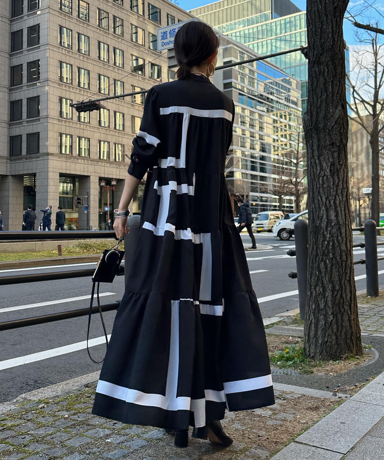 裾に向かって広がりの出るシルエットで、切り替えのティアードシルエットが大人ガーリーな雰囲気を醸し出します。