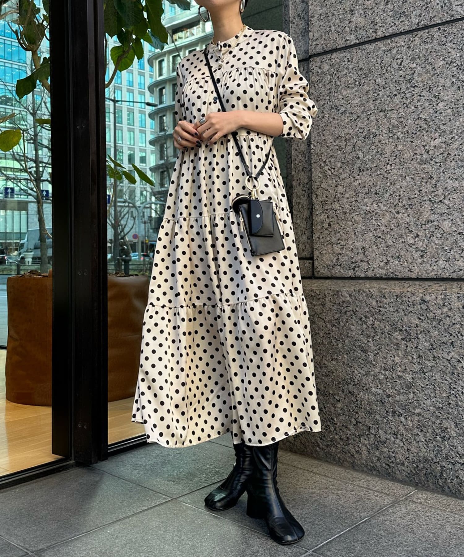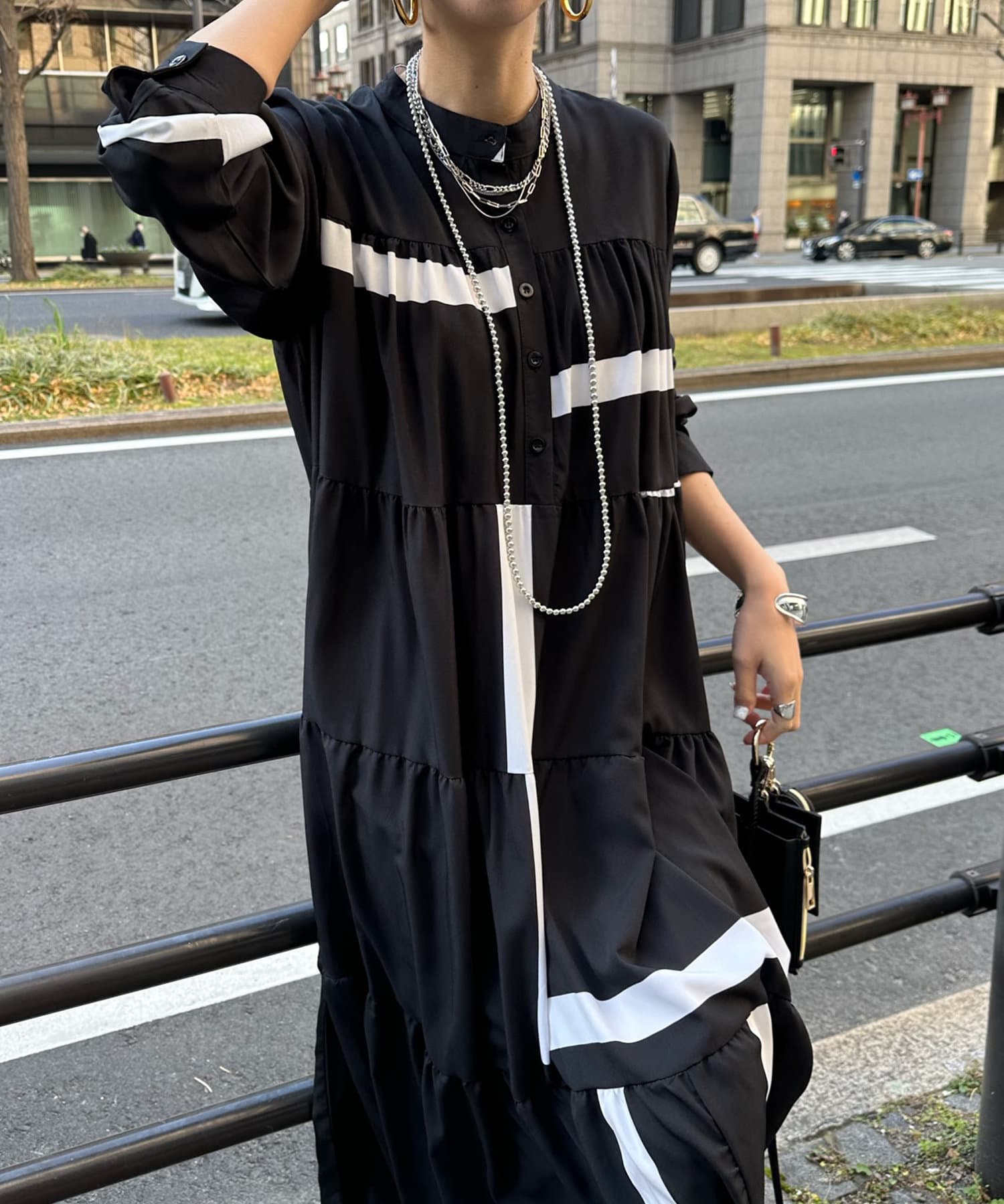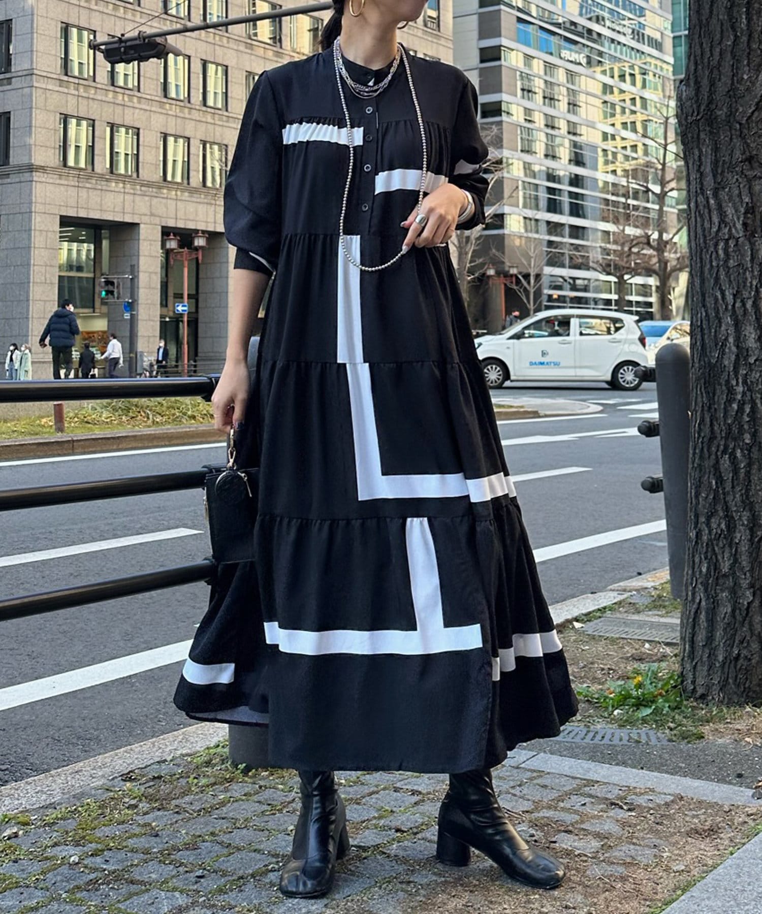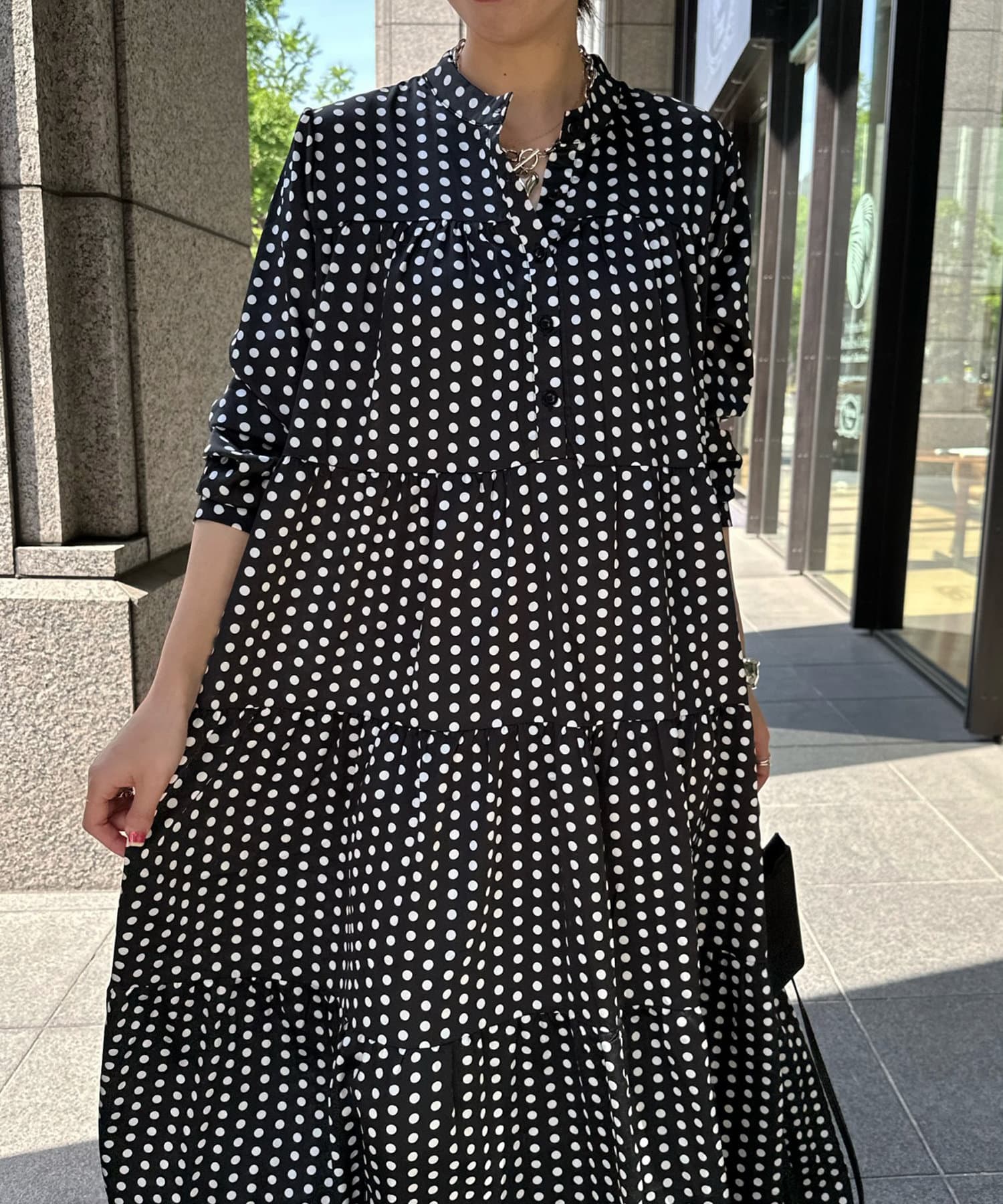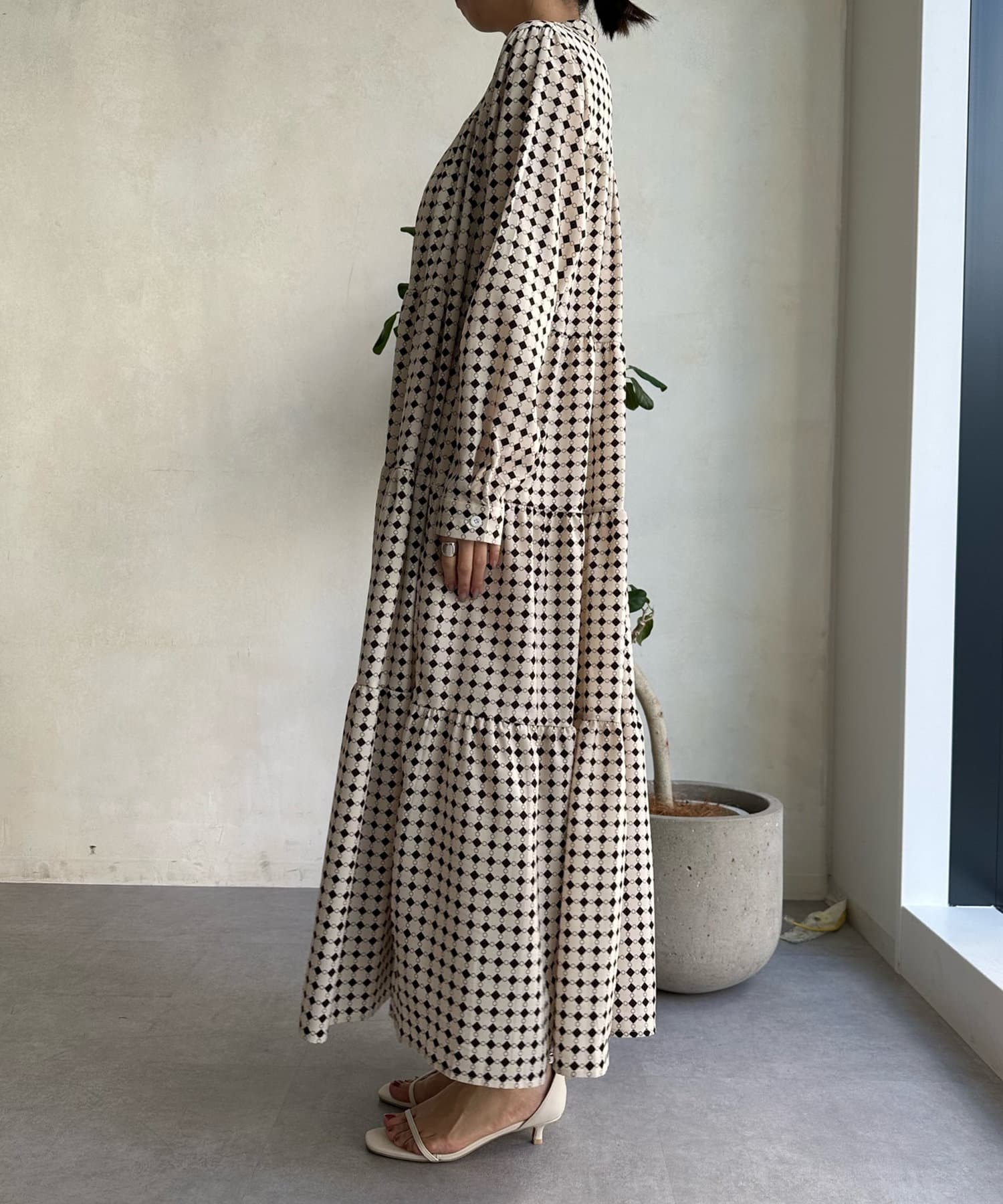 裾に向かって広がりの出るシルエットで、切り替えのティアードシルエットが大人ガーリーな雰囲気を醸し出します。