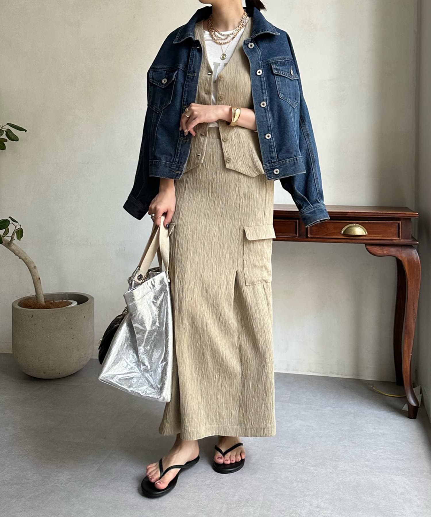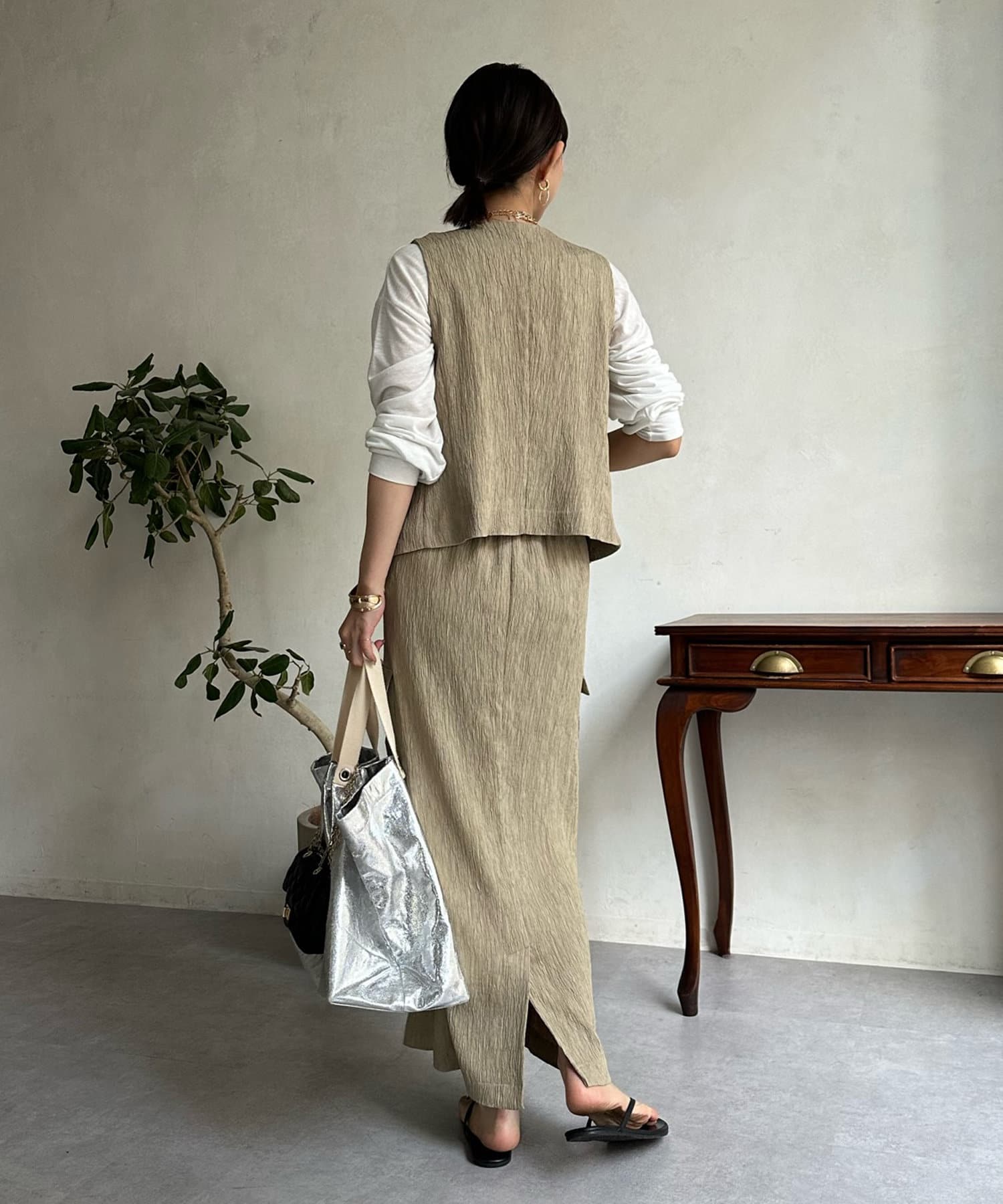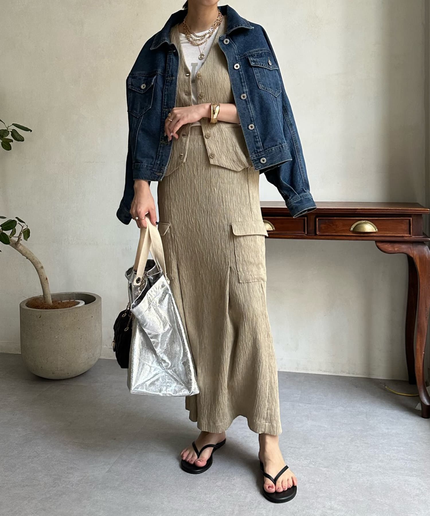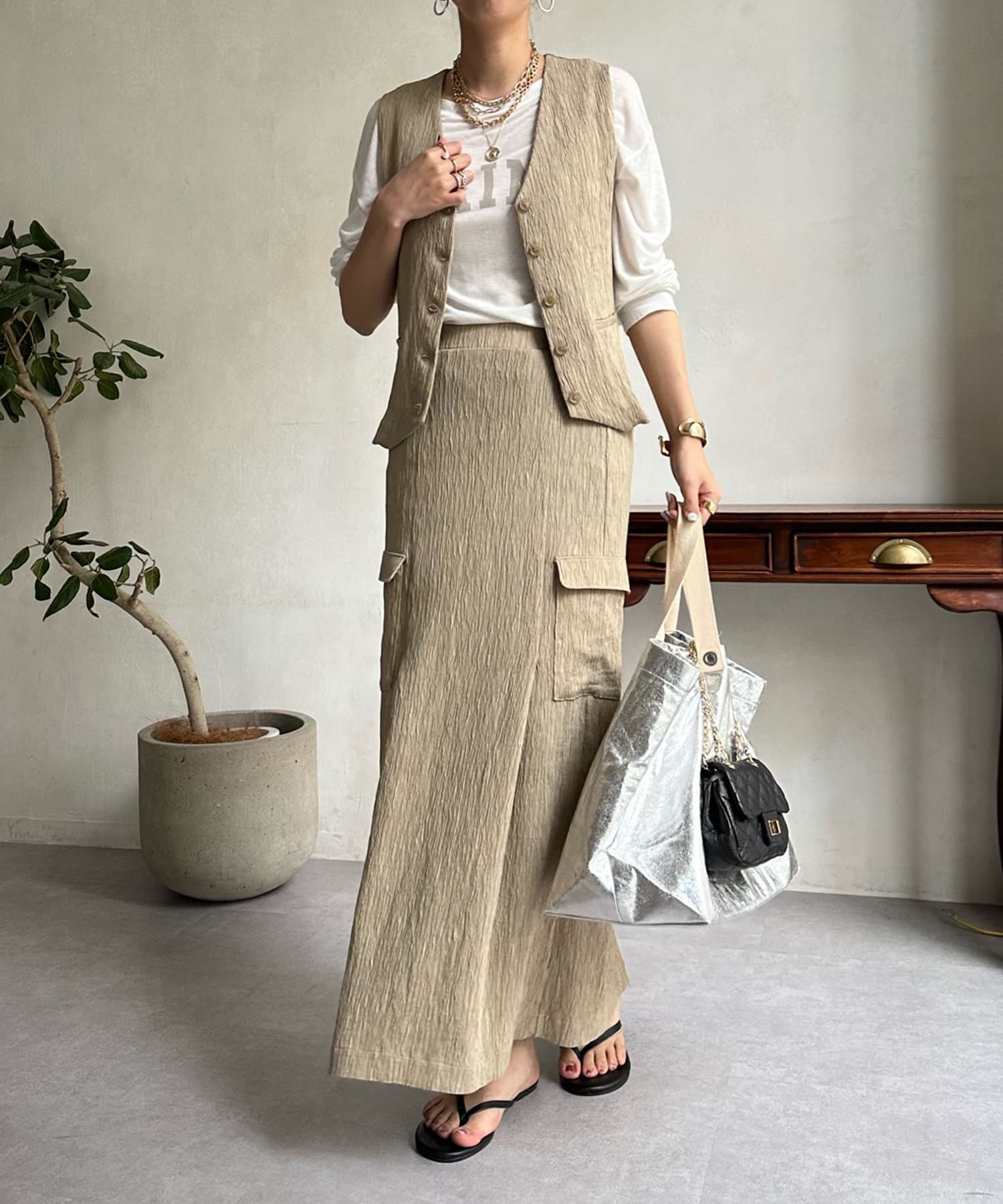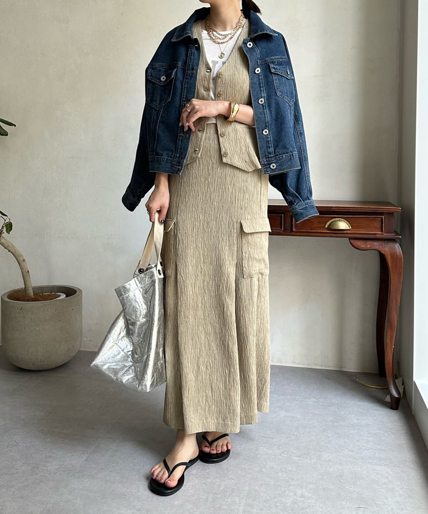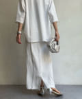 ショート丈のトップスを合わせてすっきりとした着こなしや、同じ素材のベストとセットアップでオシャレに合わせるのもおすすめですよ。
