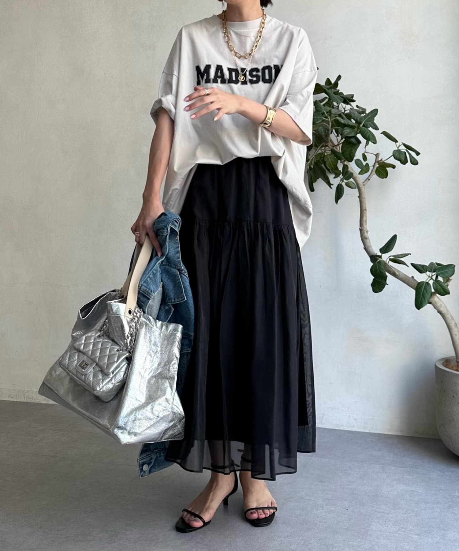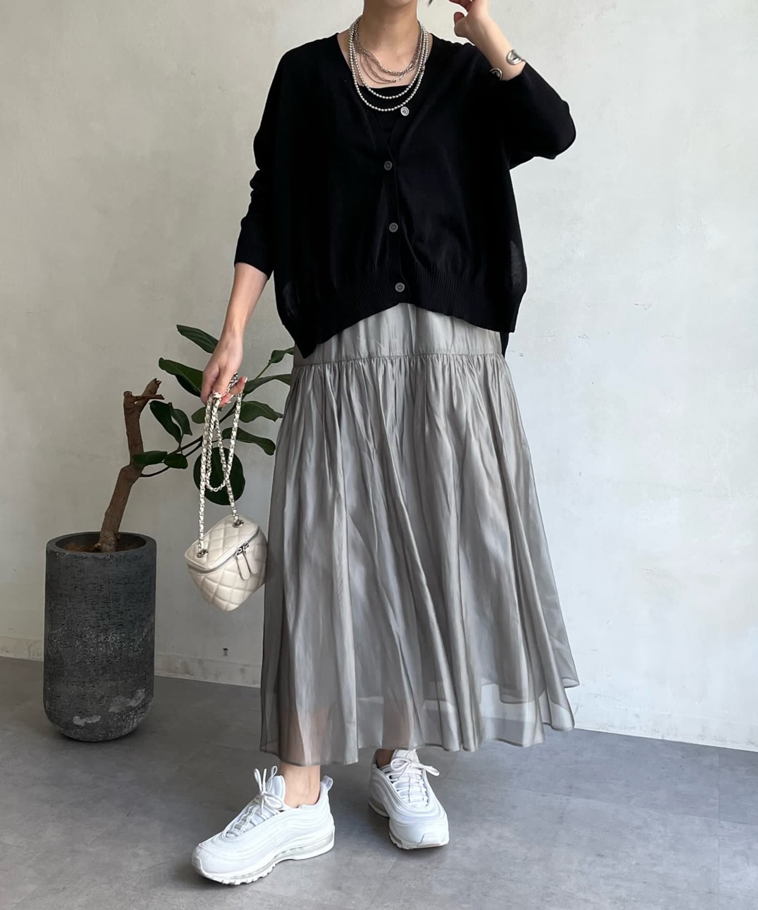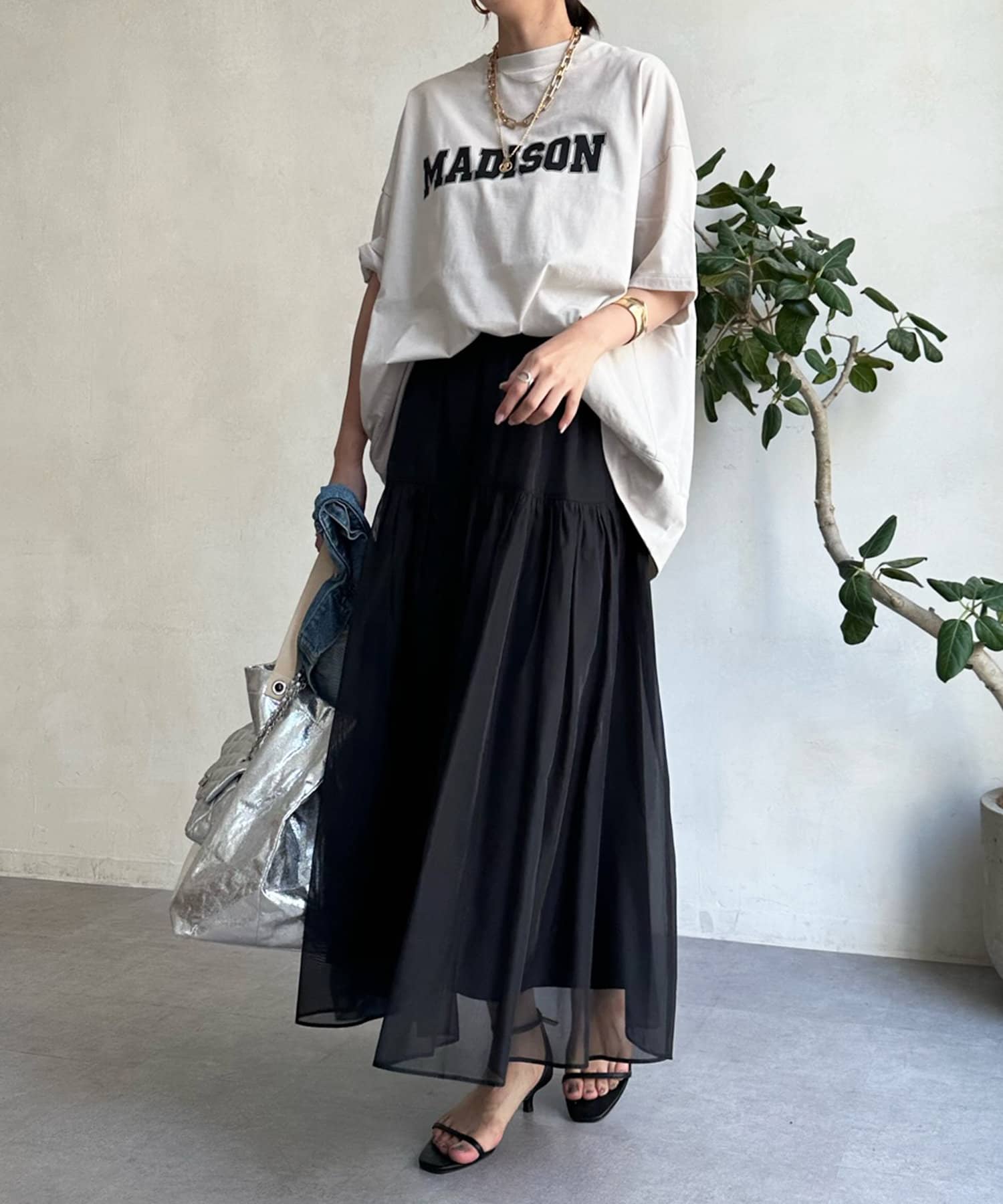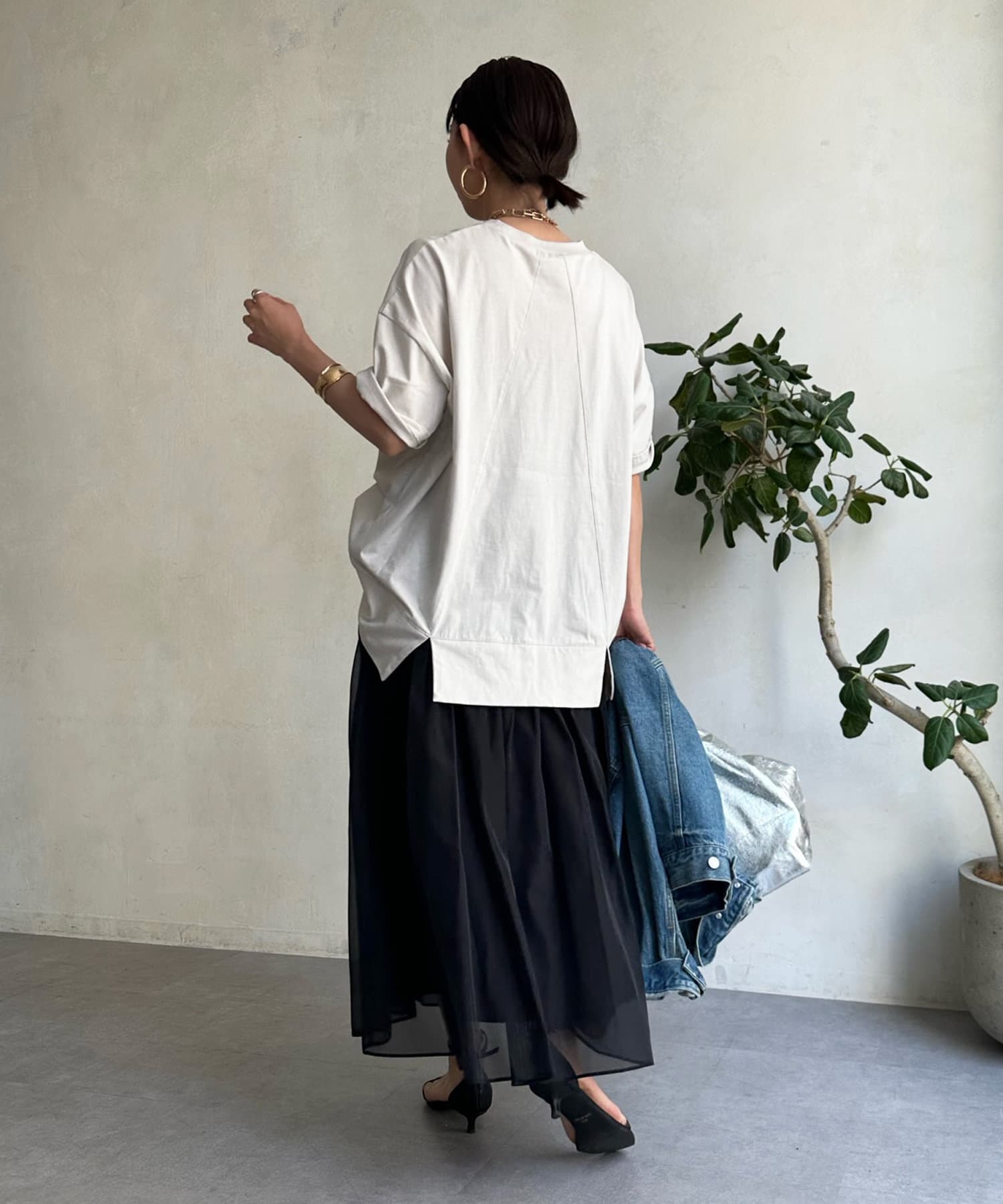 広がりすぎないシルエットと、シアー感のある素材で、カジュアルなアイテムと合わせても大人らしく決まります。