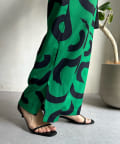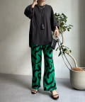落ち感のある生地を使用しているため、滑らかな肌触りになっており、ウエストはゴム仕様・脚のラインもワイドでゆったりしているため、ノンストレスで履いていただけます。