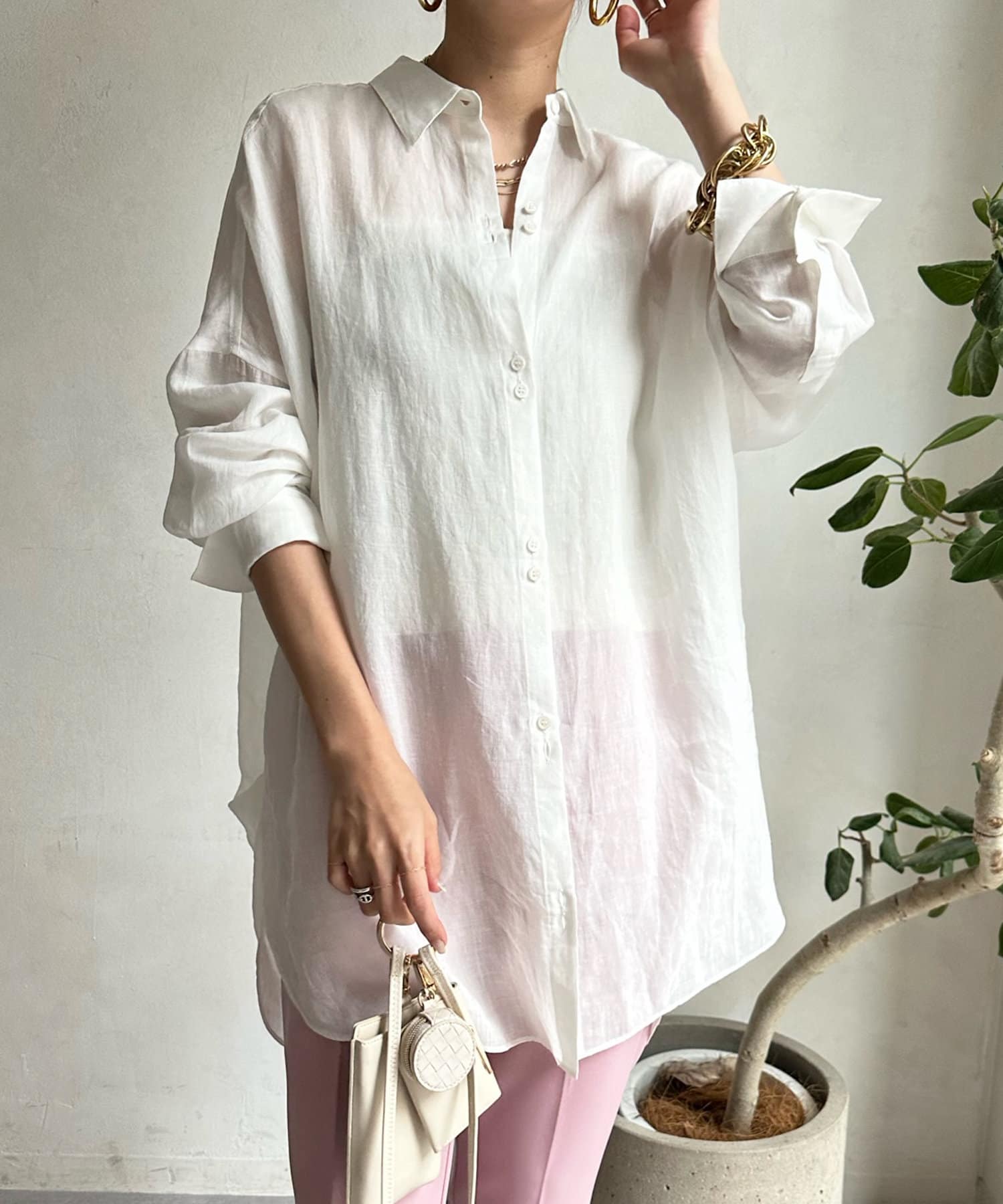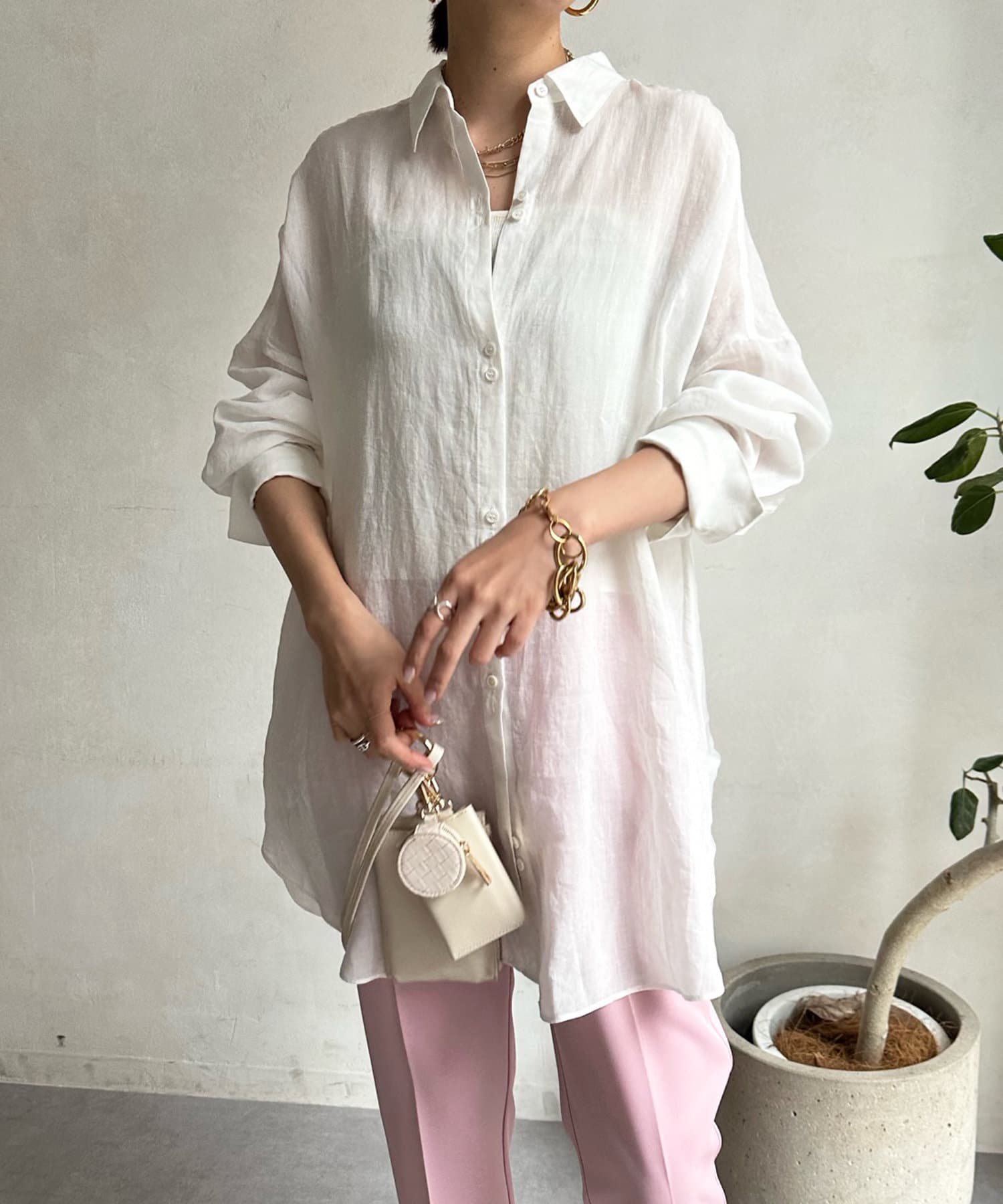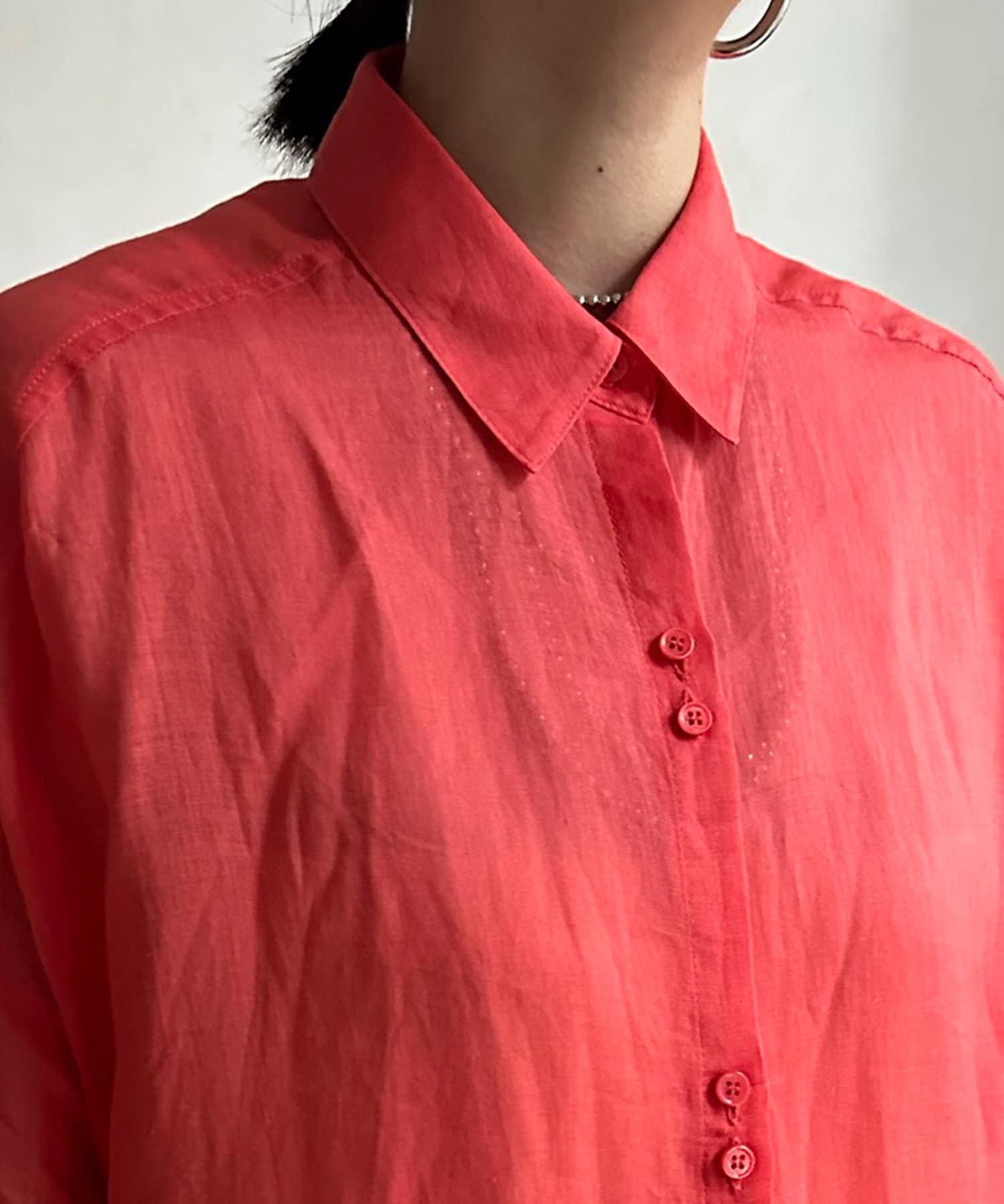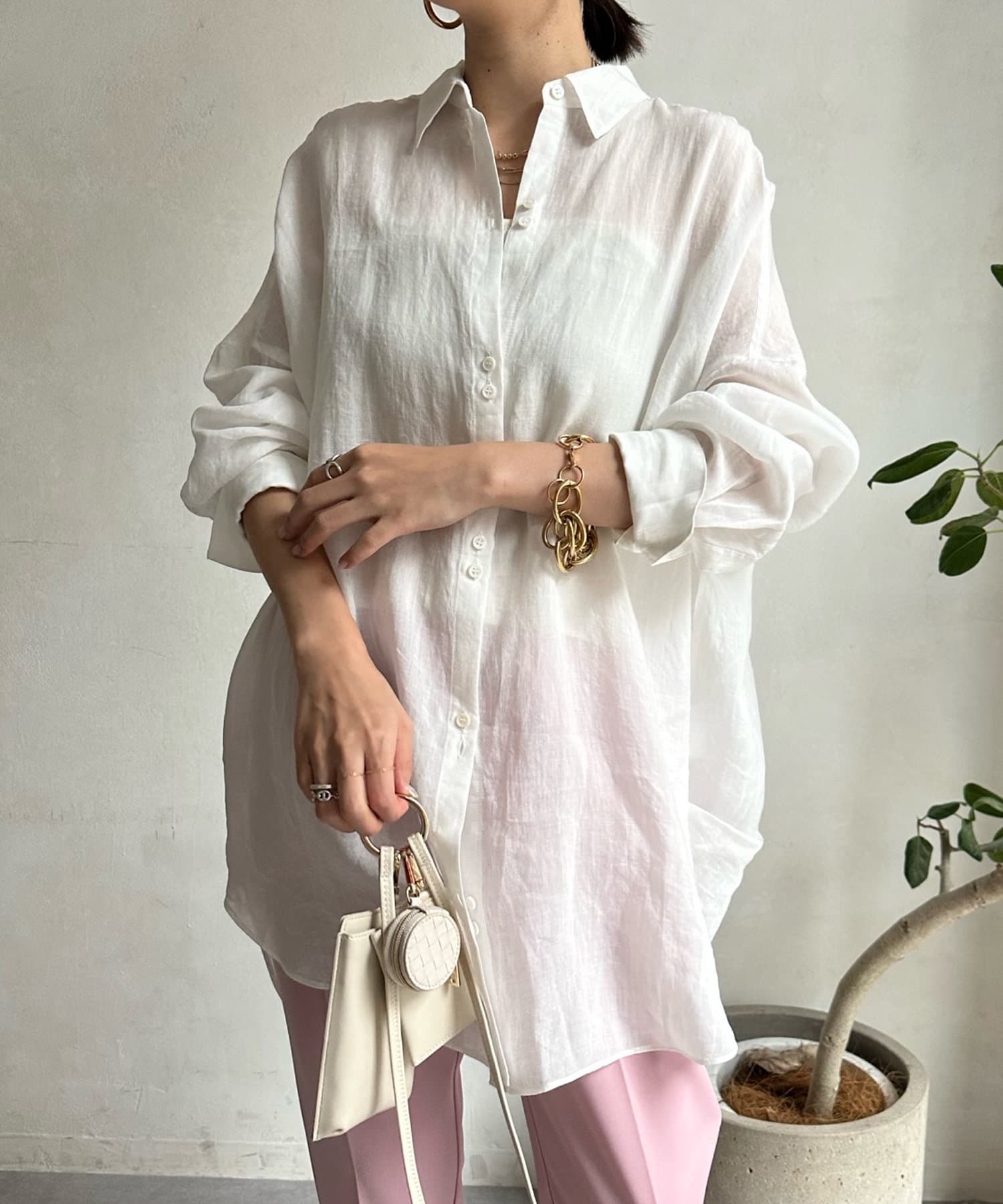 ボタンを2つ並べてアクセントをつけた、今年気分な襟付きオーバーシャツ。