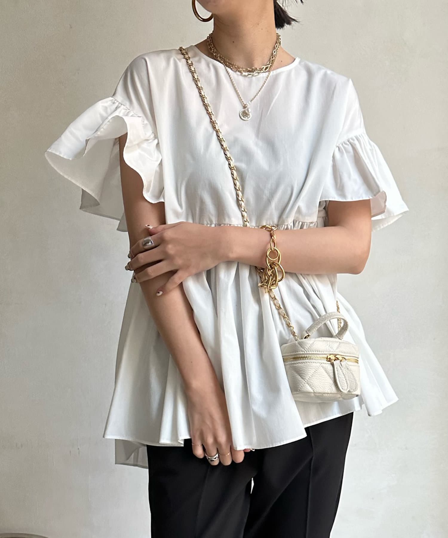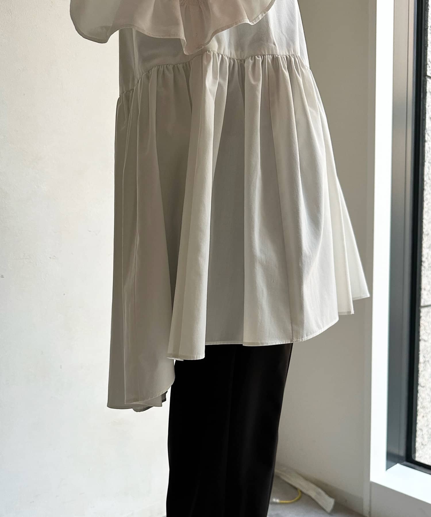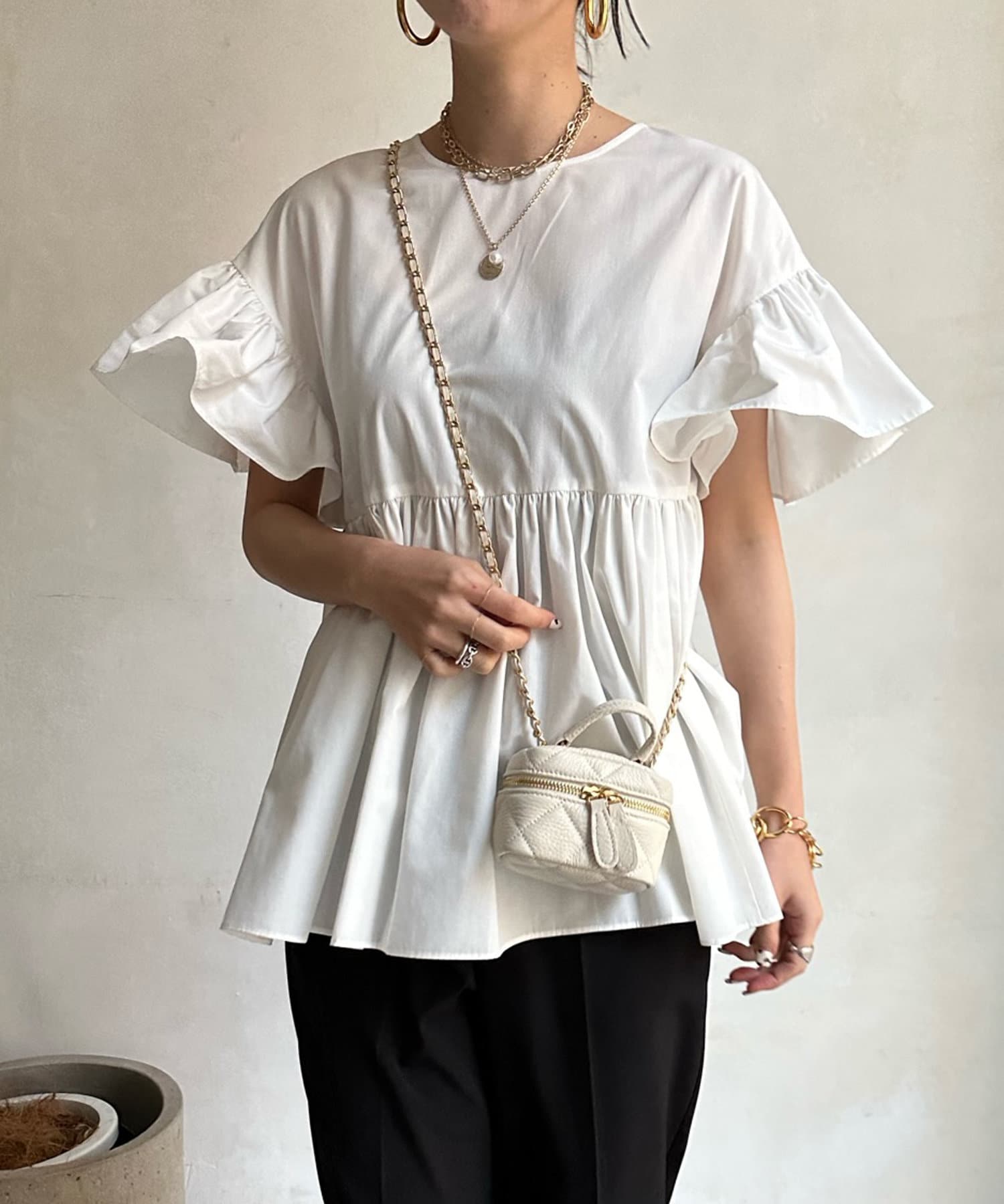 ボリューミー異素材フリルが目を惹くデザインブラウスが登場。