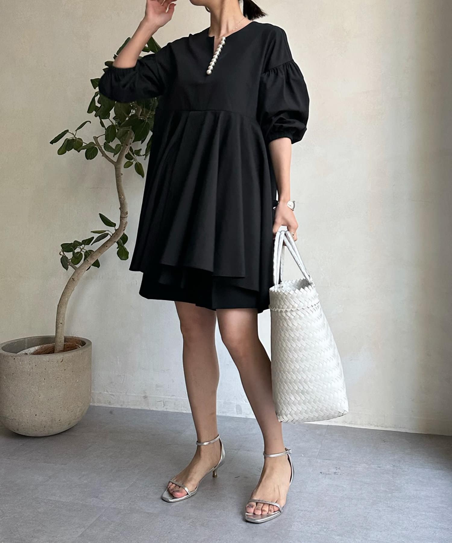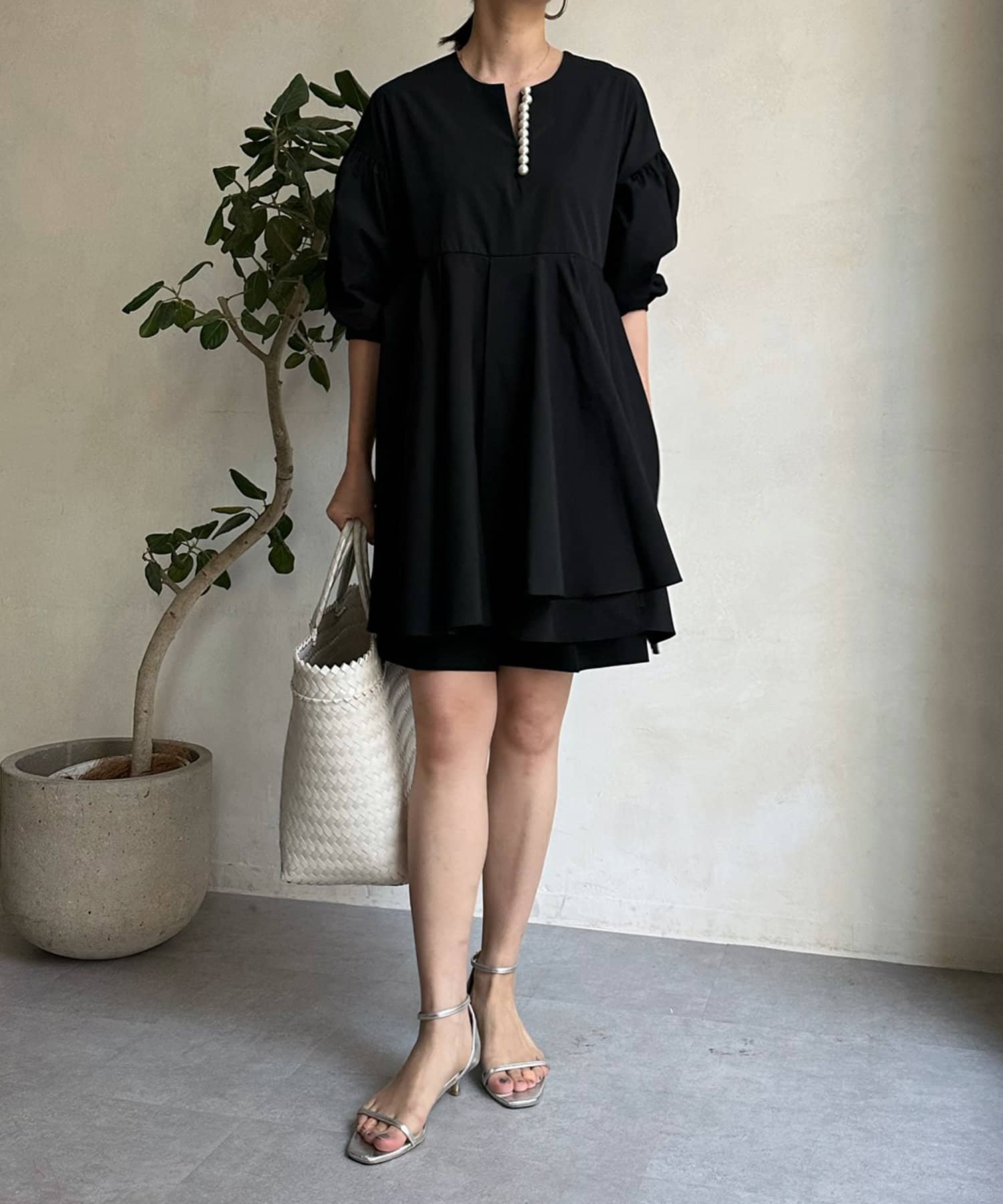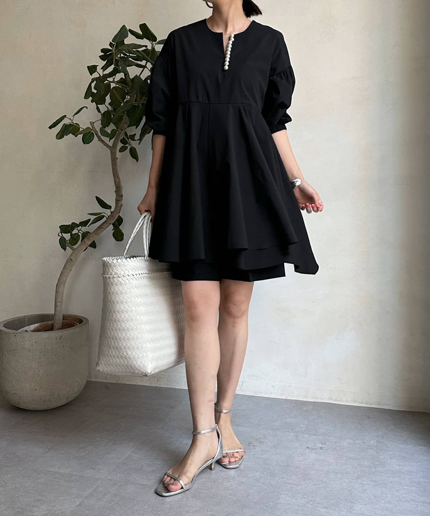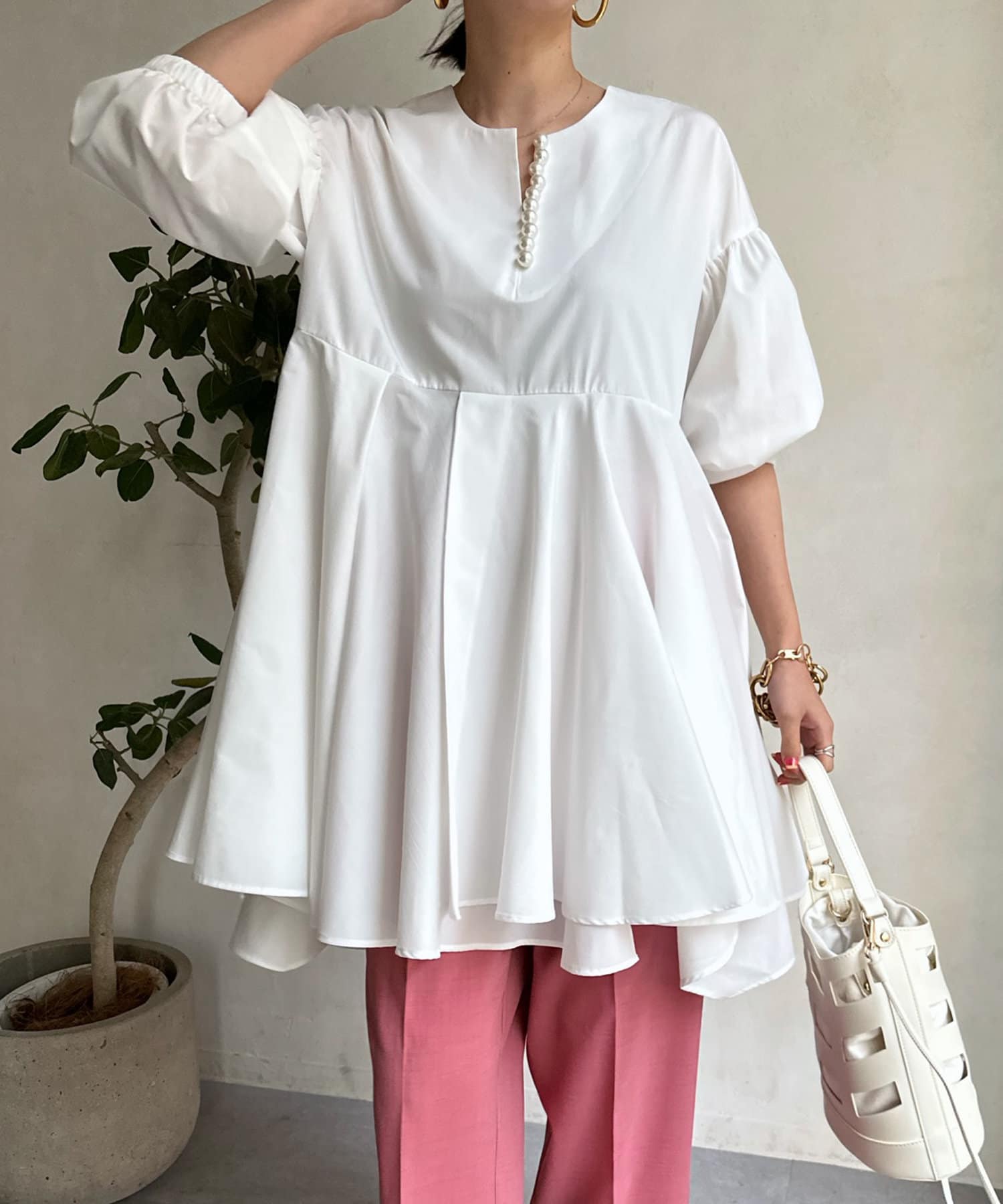 首元にはパールのパーツをあしらい、キーネックデザインですっきり見せをプラス。