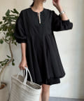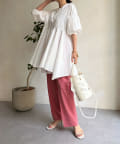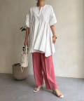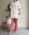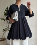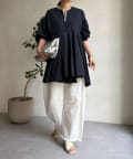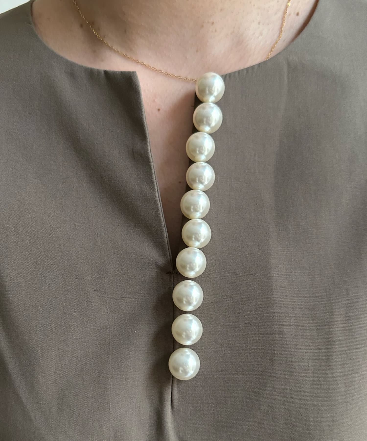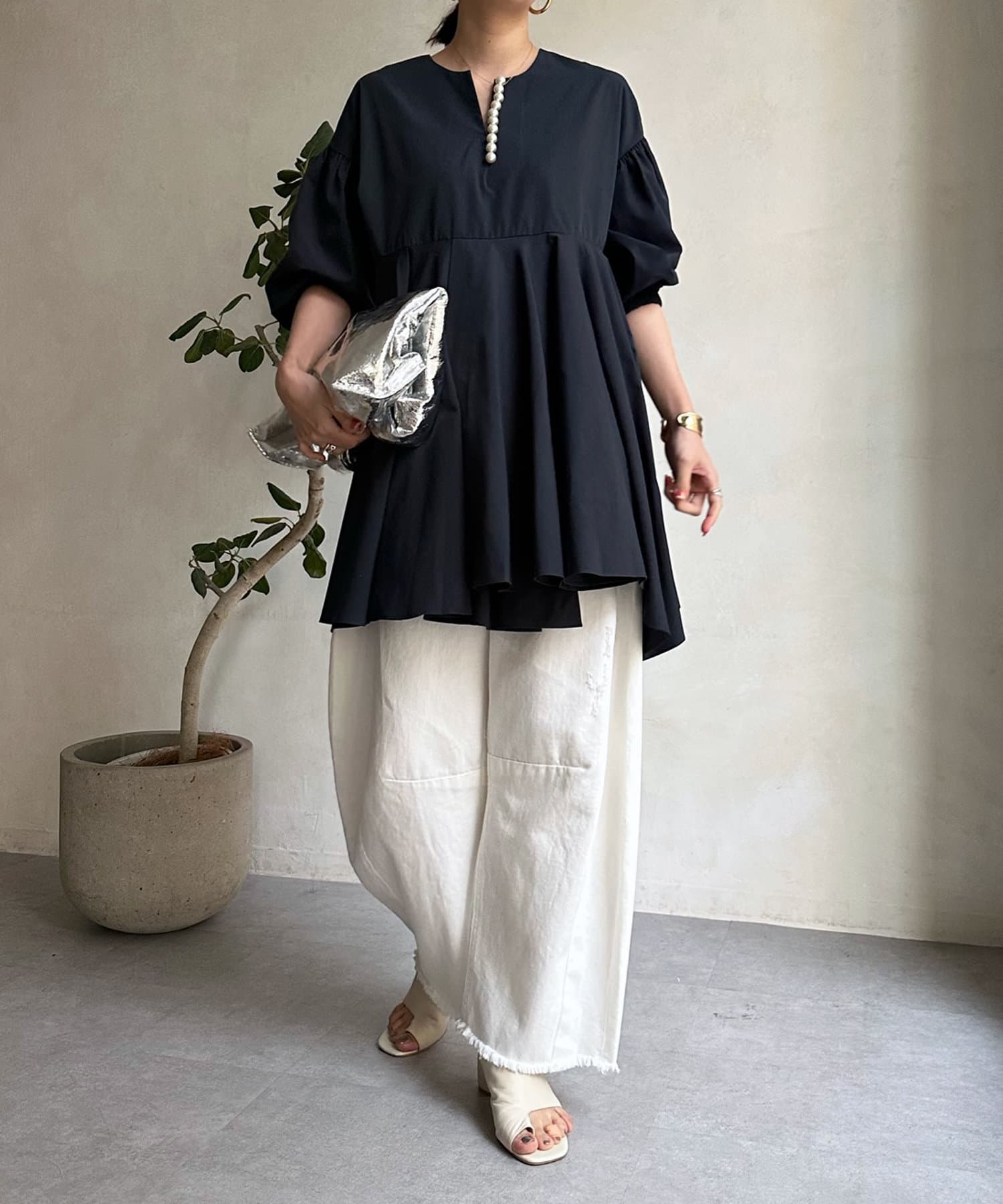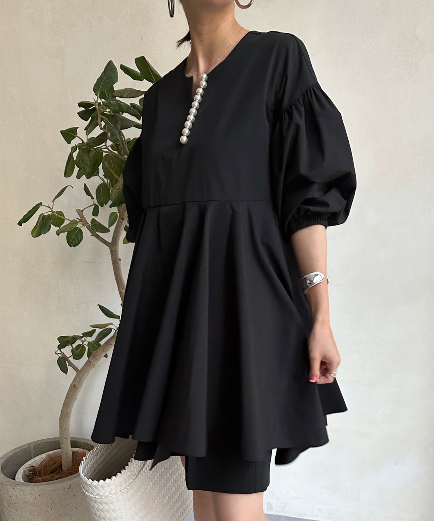 首元にはパールのパーツをあしらい、キーネックデザインですっきり見せをプラス。