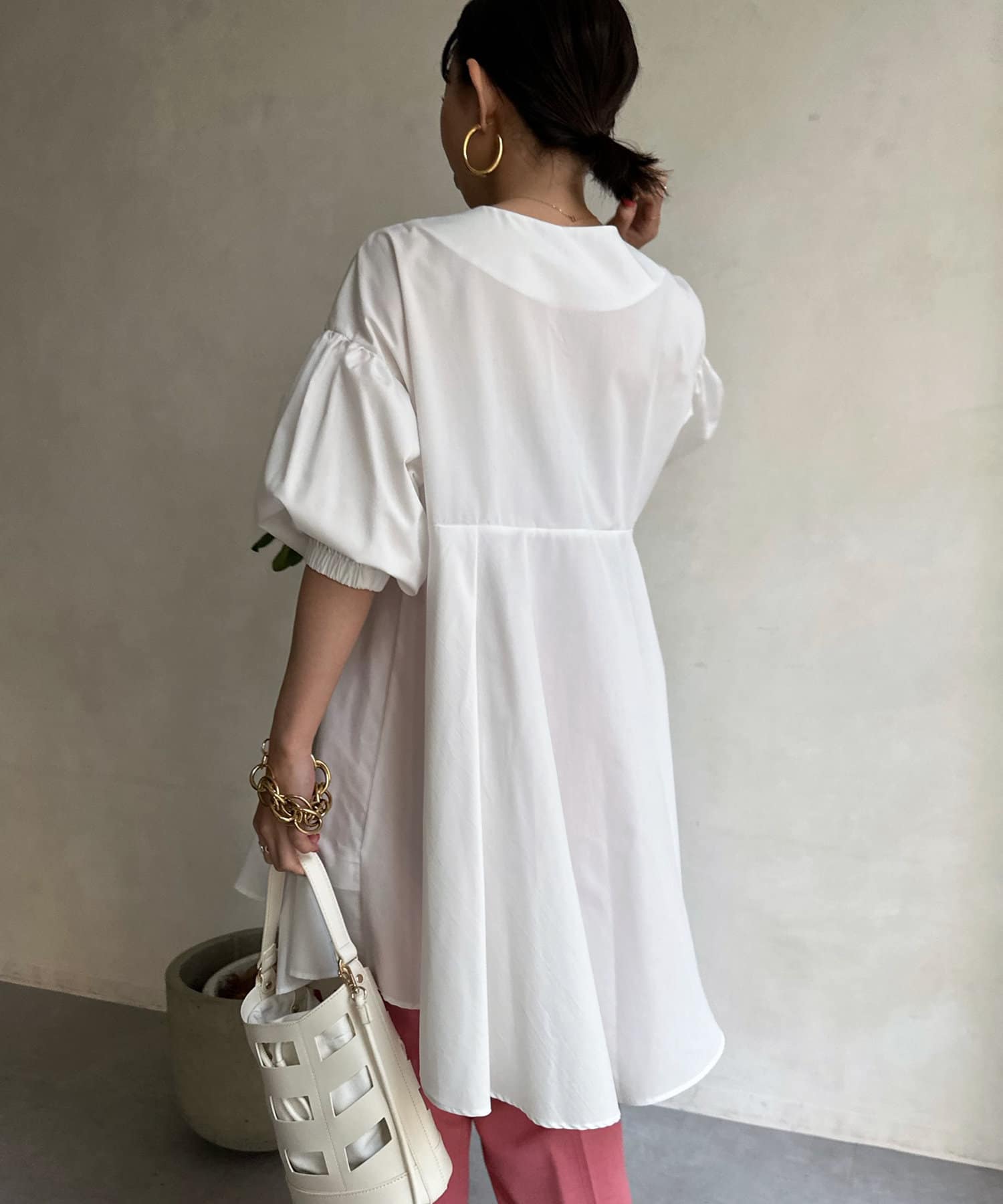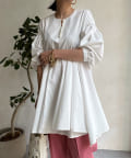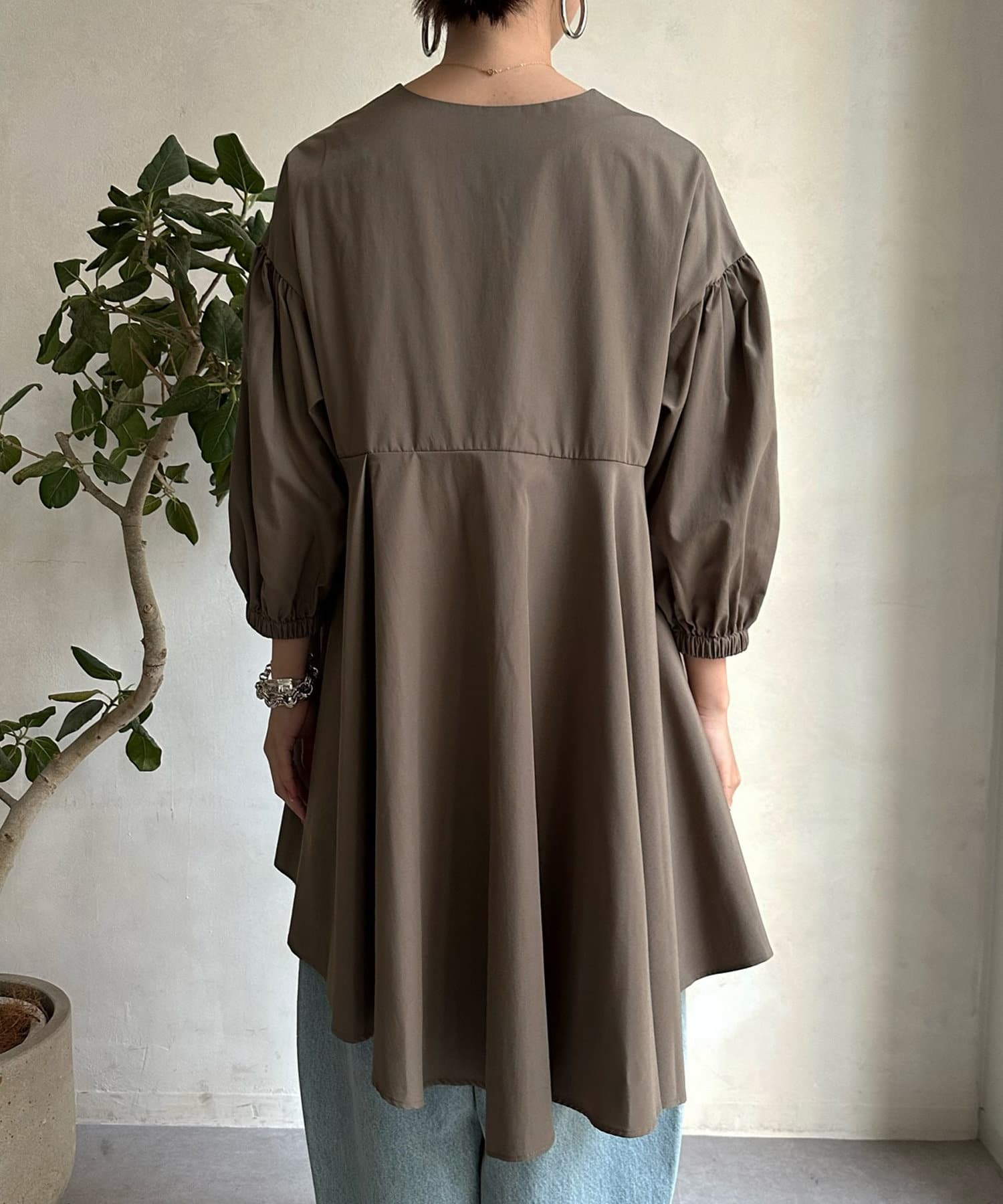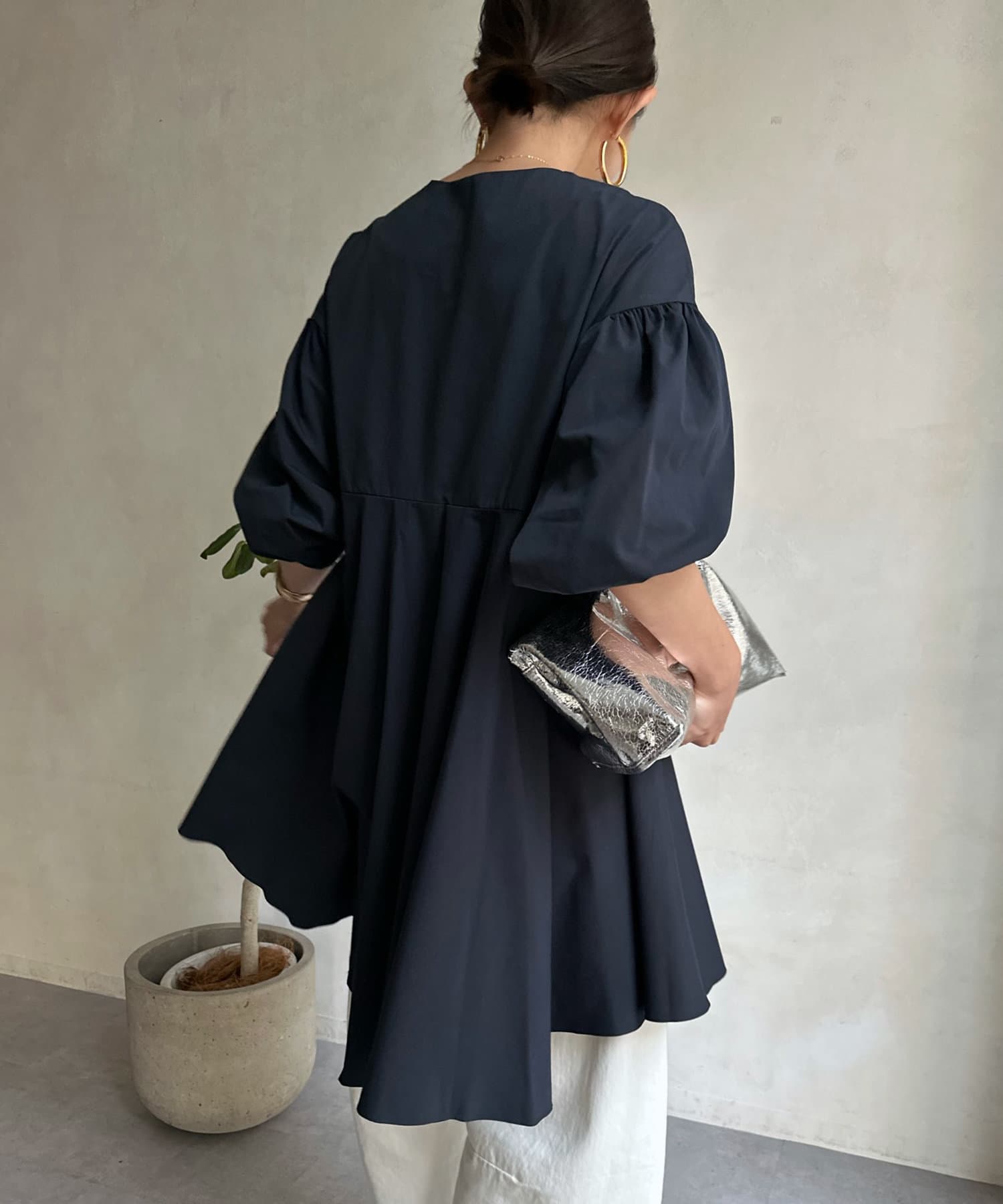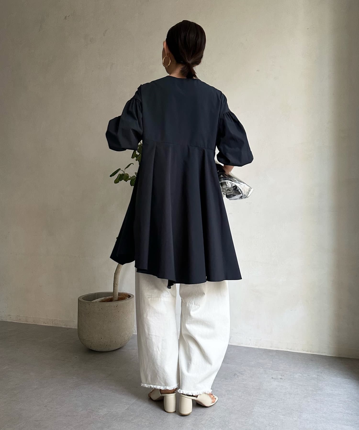 ボリューム感のあるお袖と、ギャザーたっぷりのチュニック丈が女性らしさ抜群の1着。