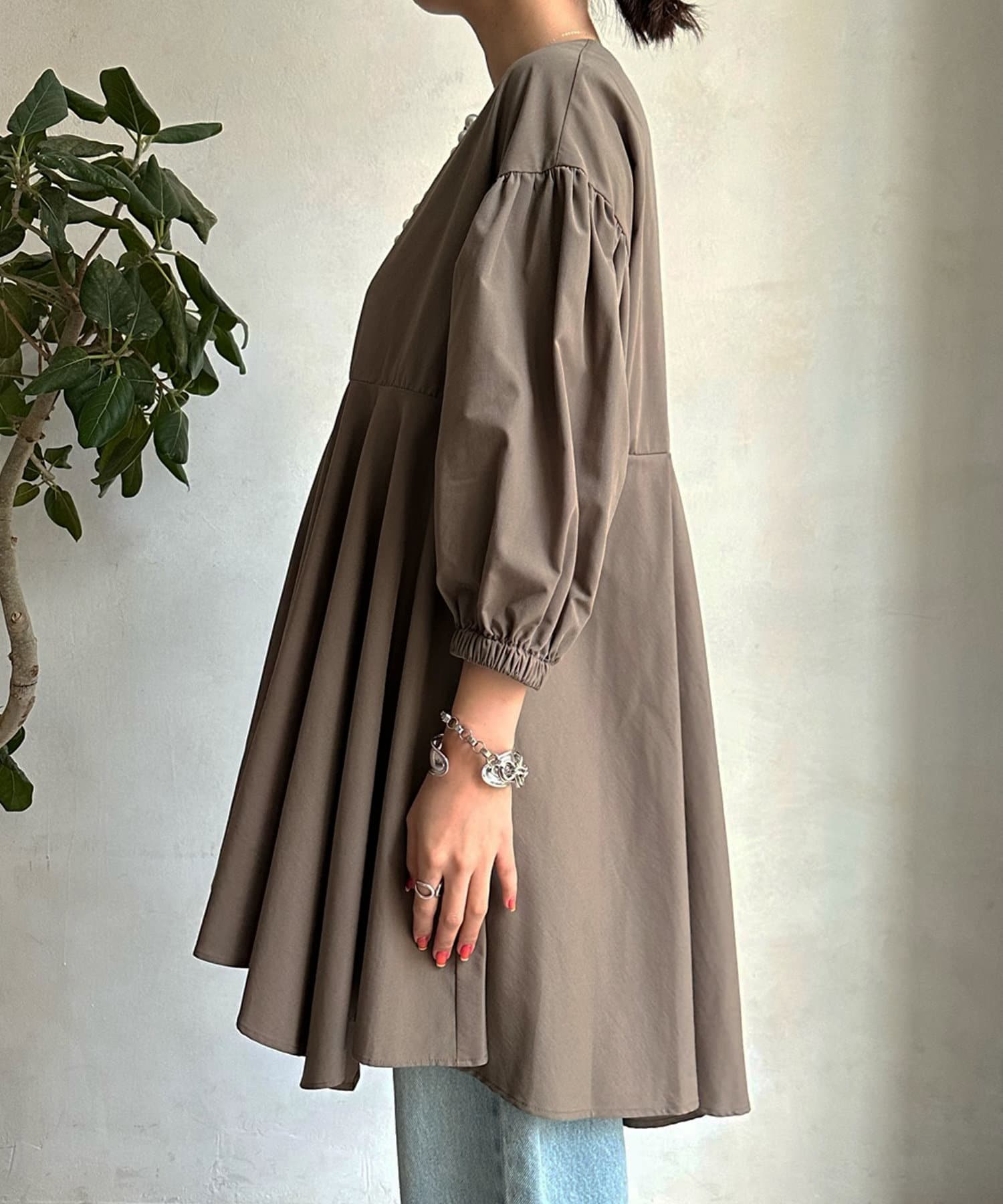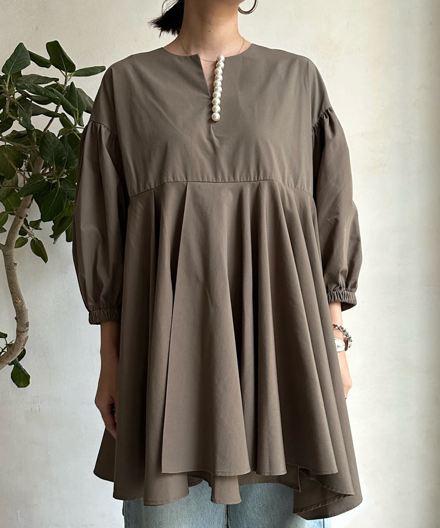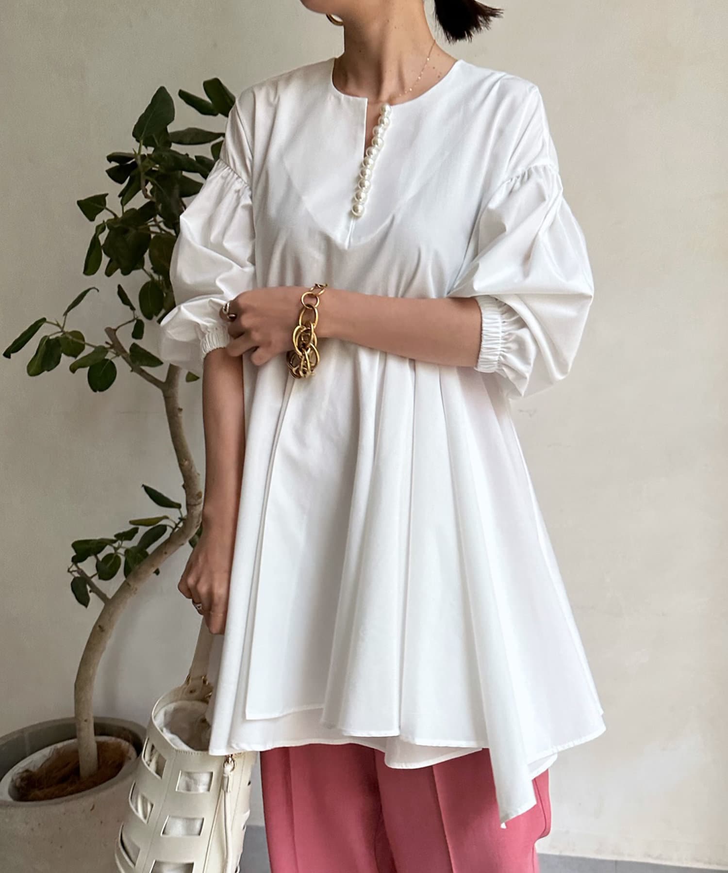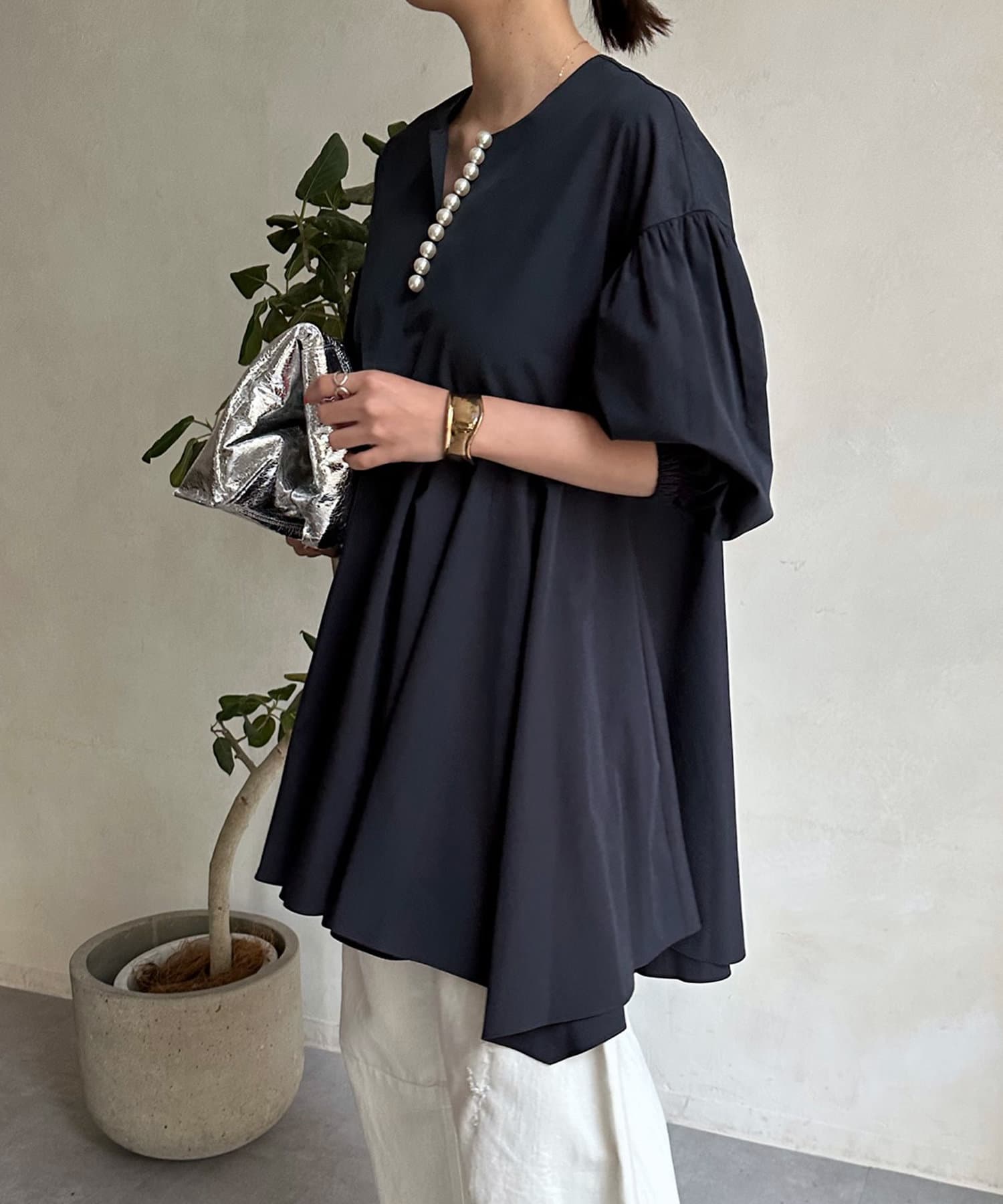 ボリューム感のあるお袖と、ギャザーたっぷりのチュニック丈が女性らしさ抜群の1着。