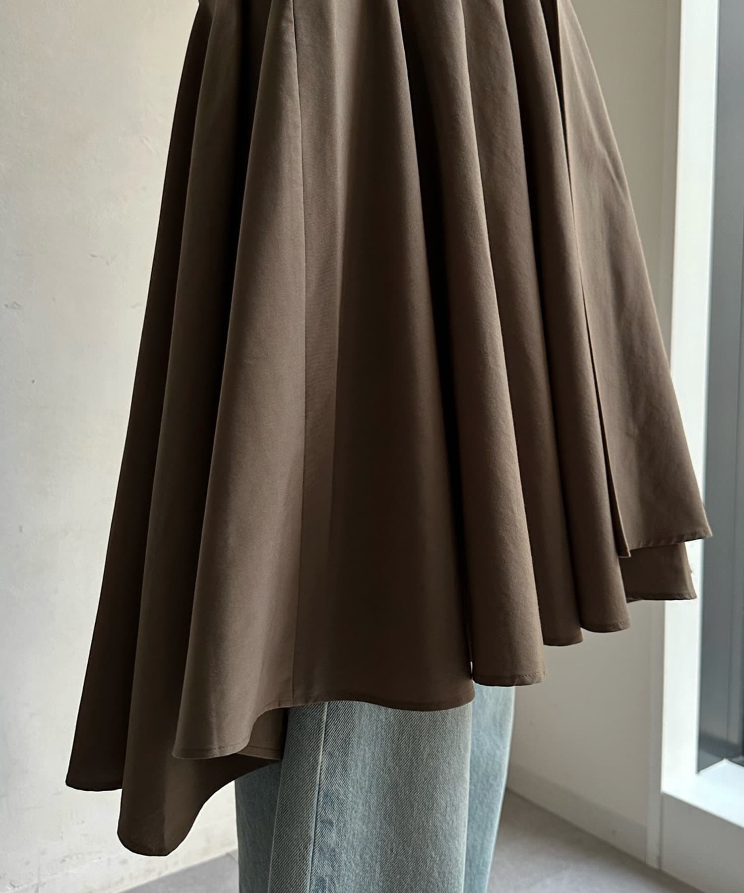 裾はアシンメトリーなデザインで、高めの位置で切り替えを施しているため、着るだけで自然とメリハリの効いたスタイルが完成。脚長効果もあり、スタイルアップ効果抜群です。