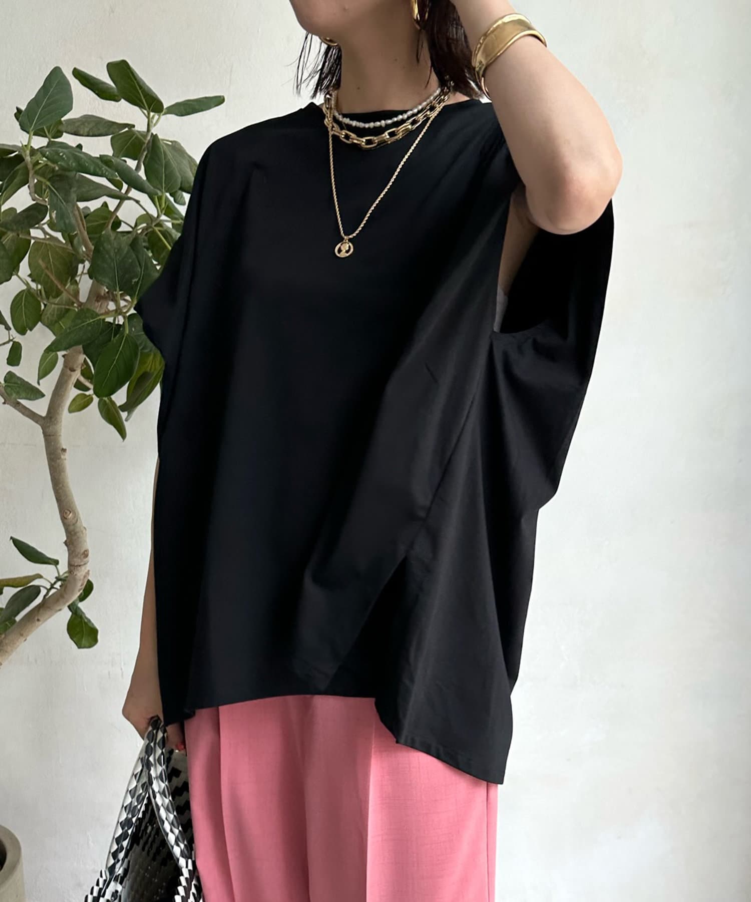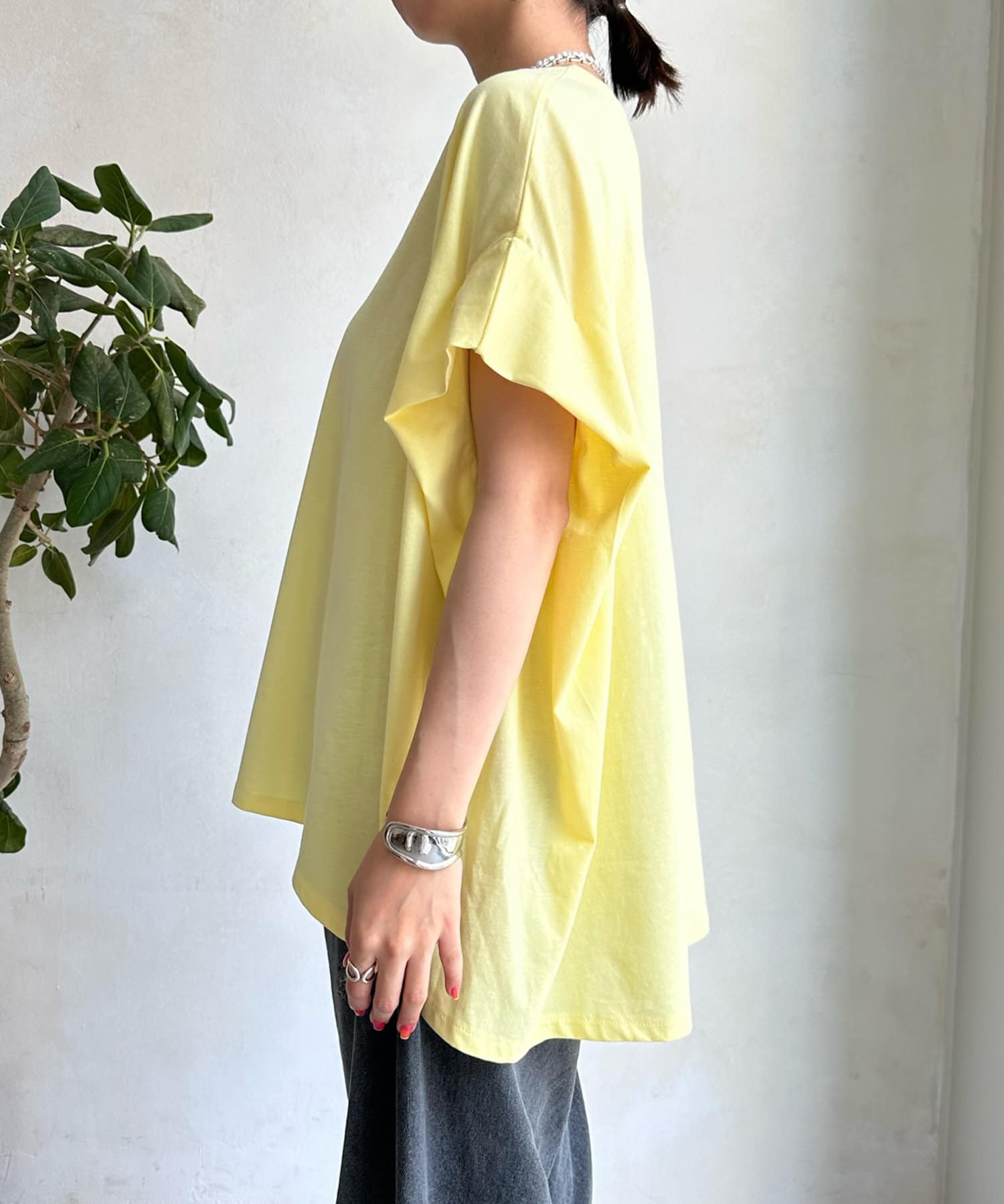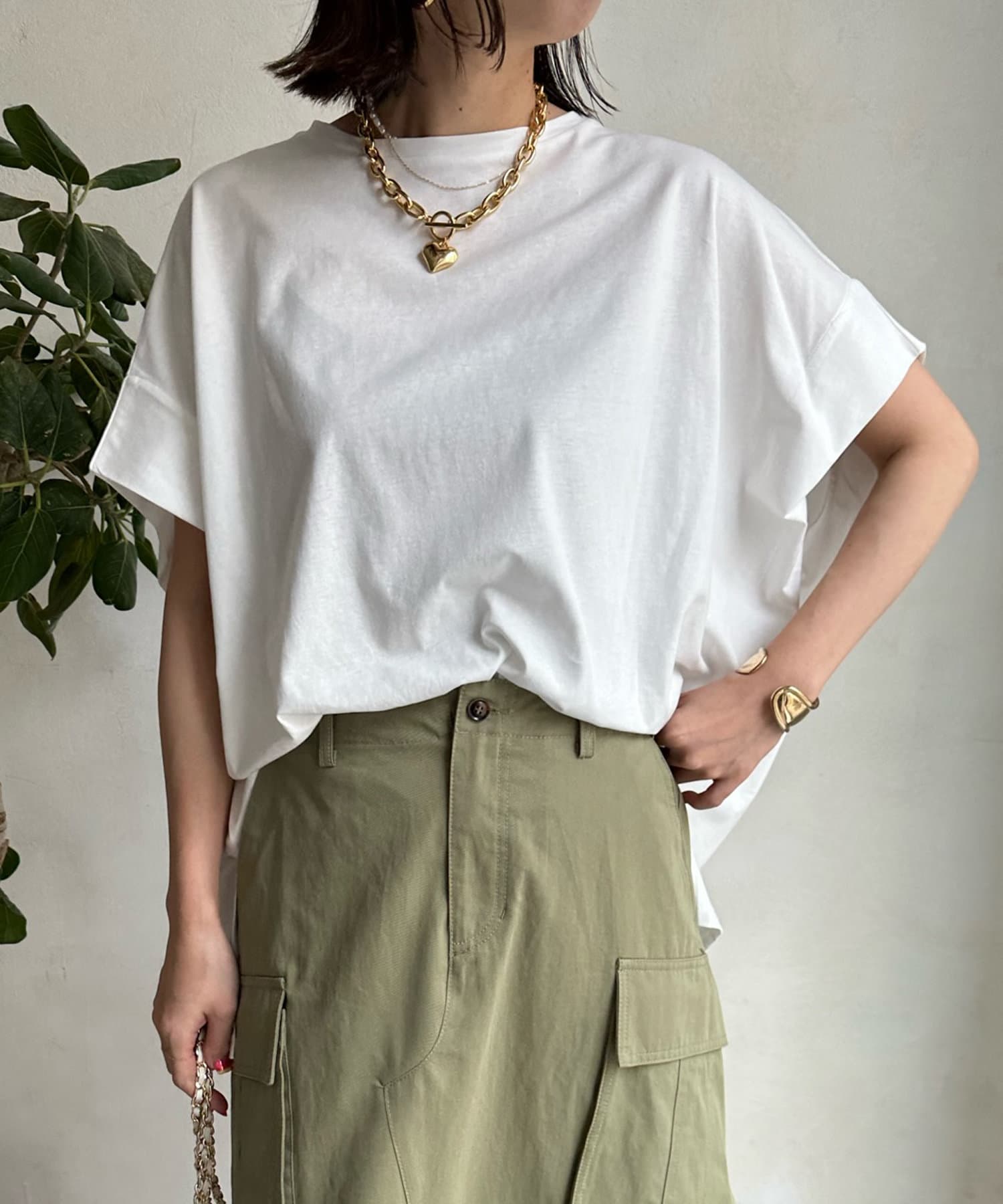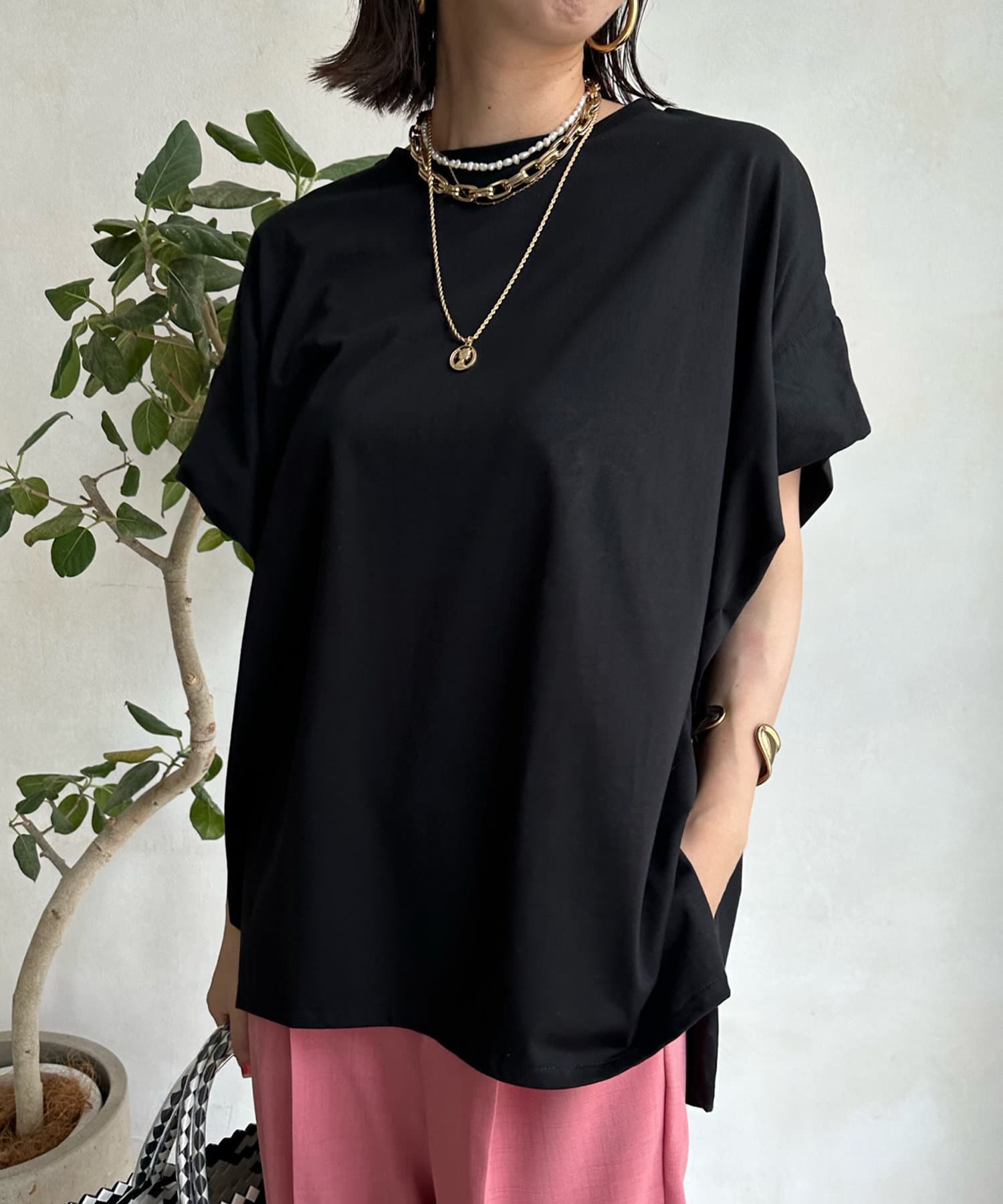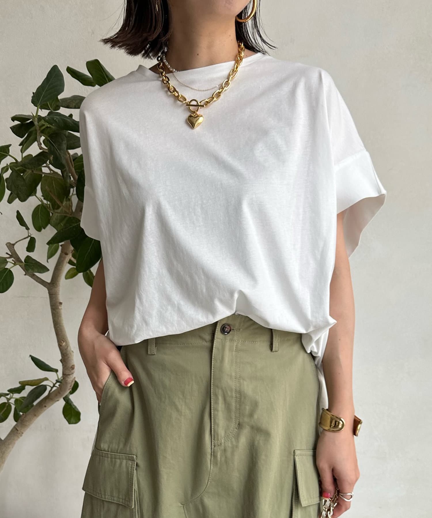 ボディラインを拾わないオーバーサイズで、綿100%とリラクシーな着心地なのもおすすめポイント〇