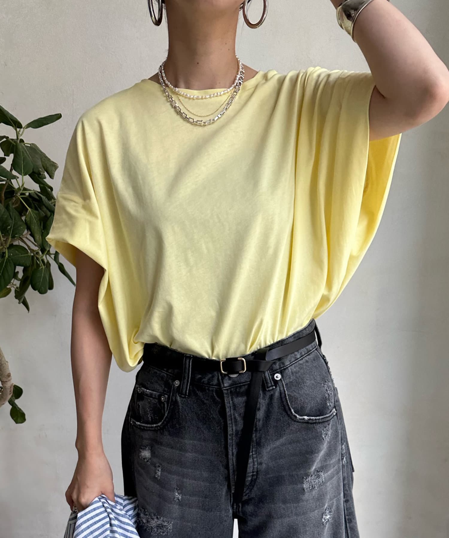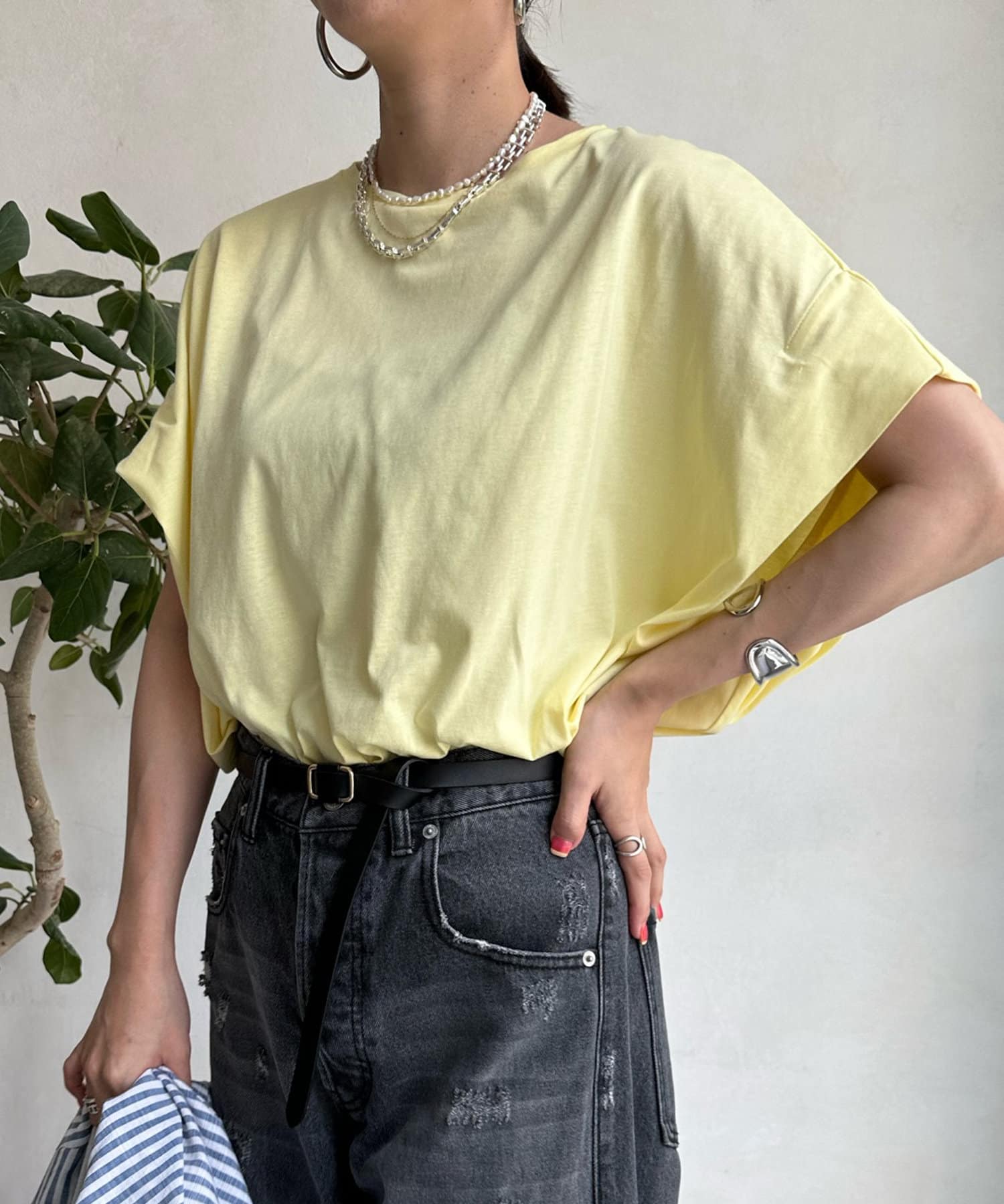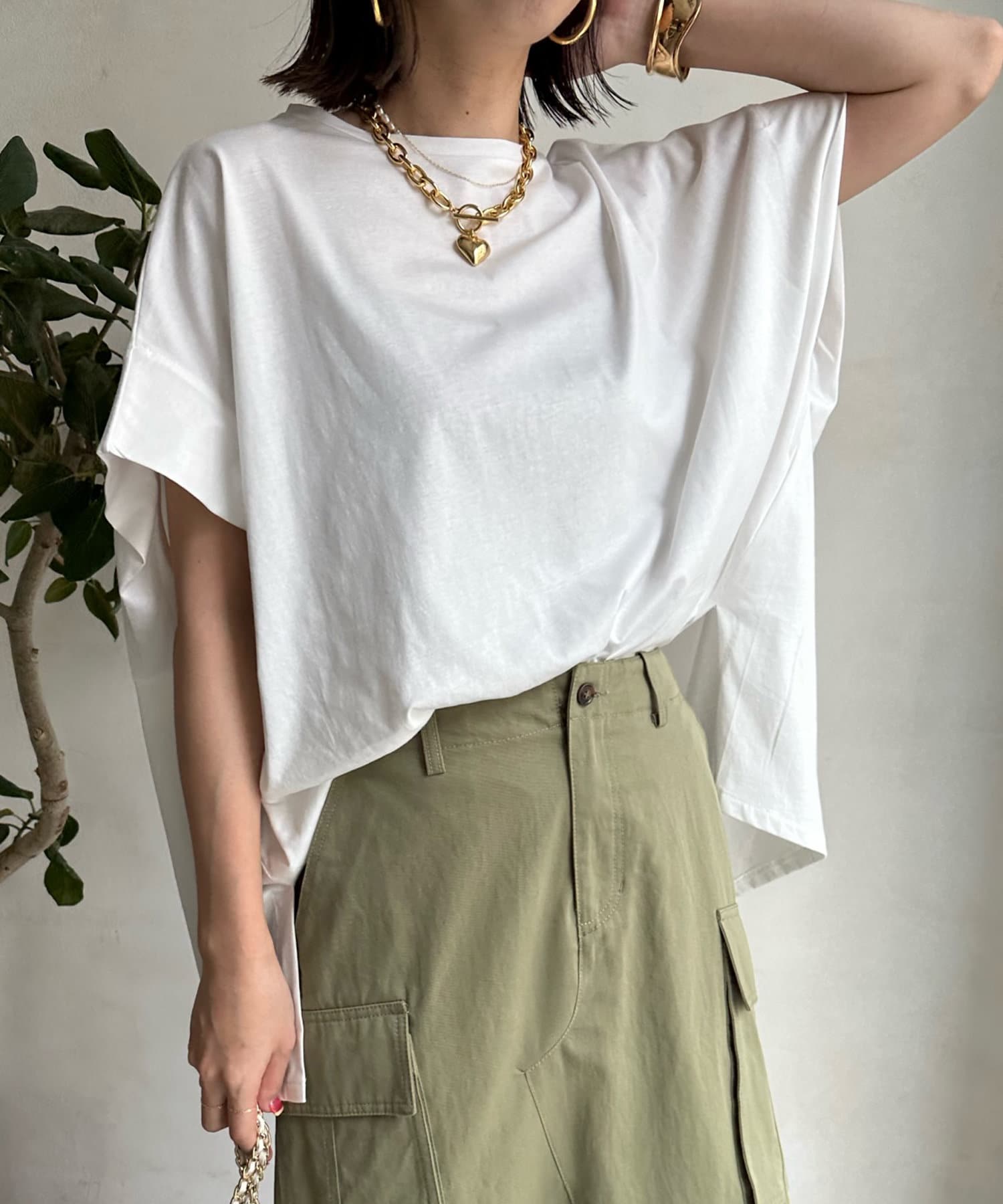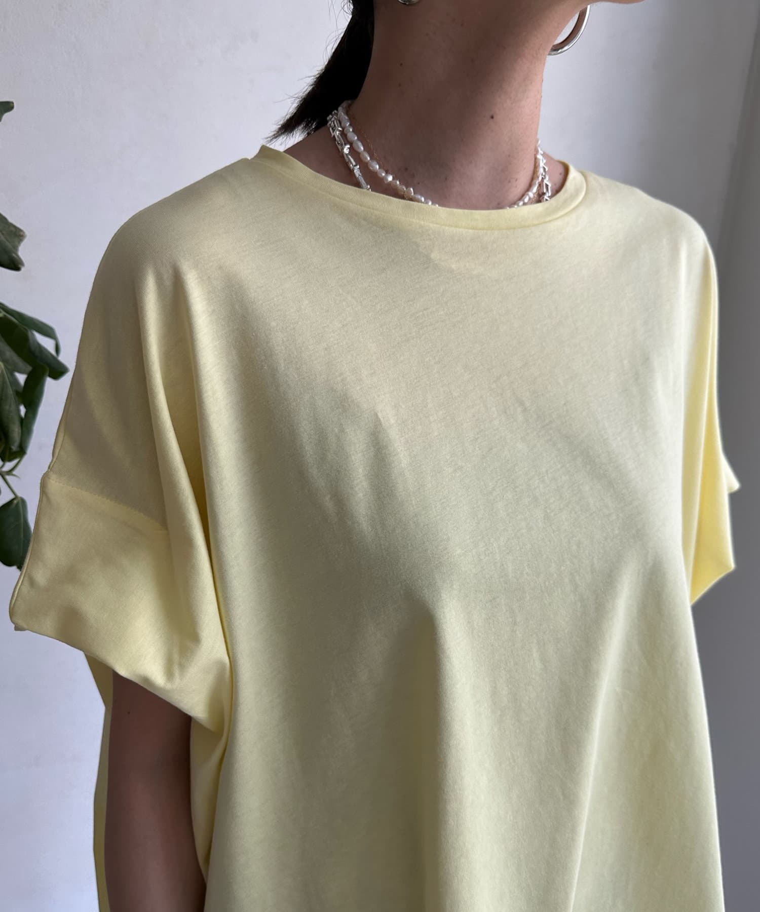 ボディラインを拾わないオーバーサイズで、綿100%とリラクシーな着心地なのもおすすめポイント〇