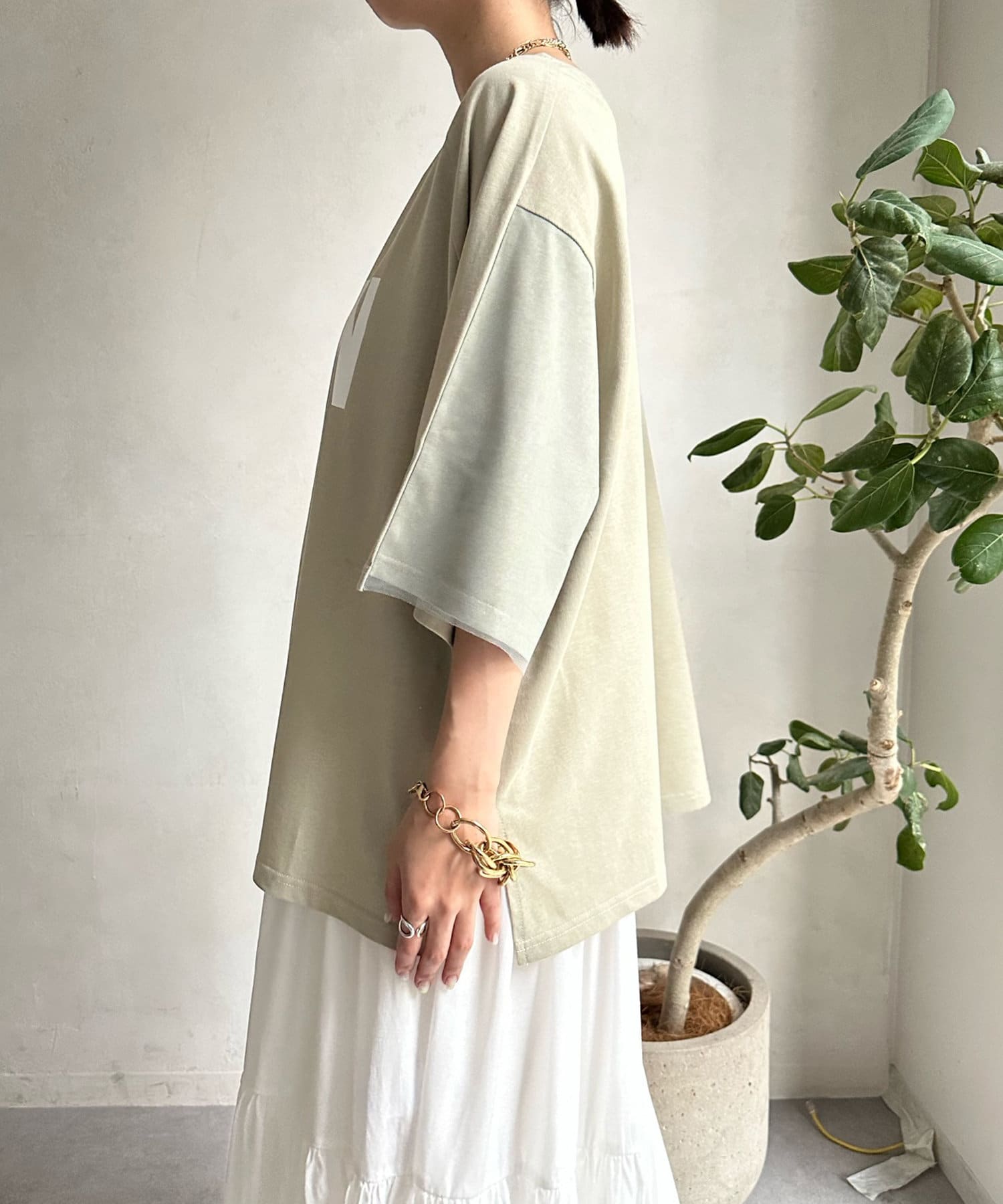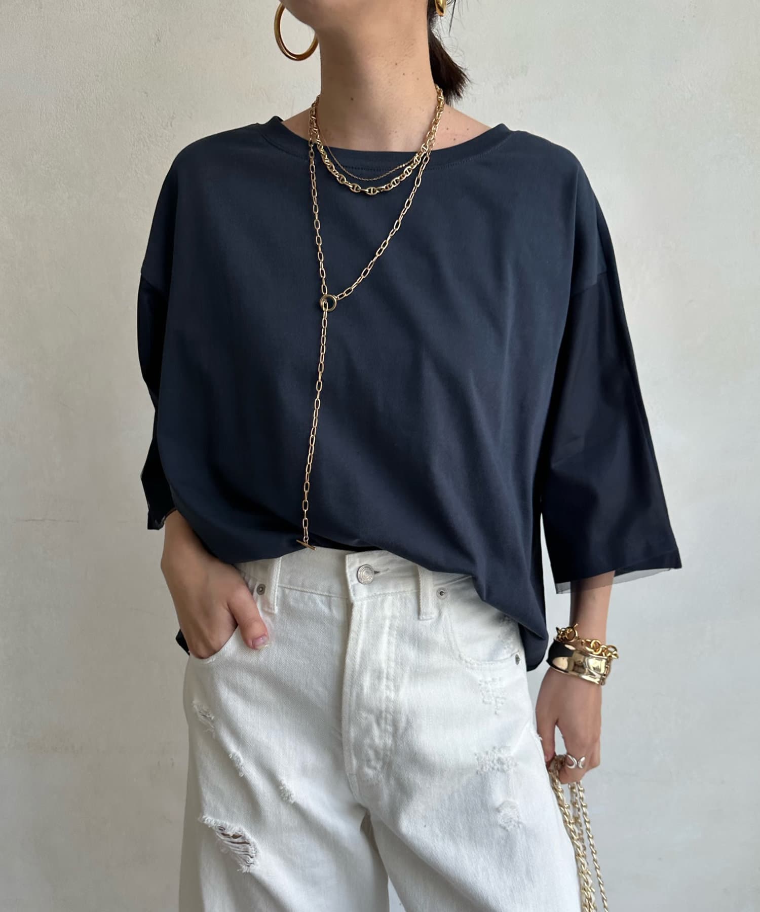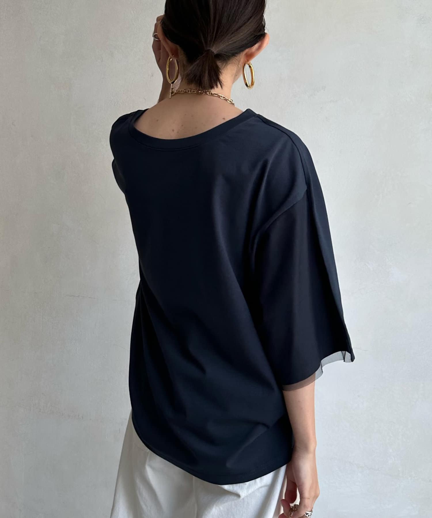 片側袖にチュールを重ねることで、前後で雰囲気の違う抜け感たっぷりのこなれた印象に!