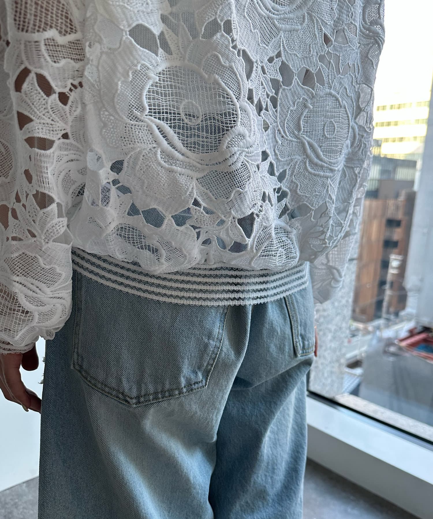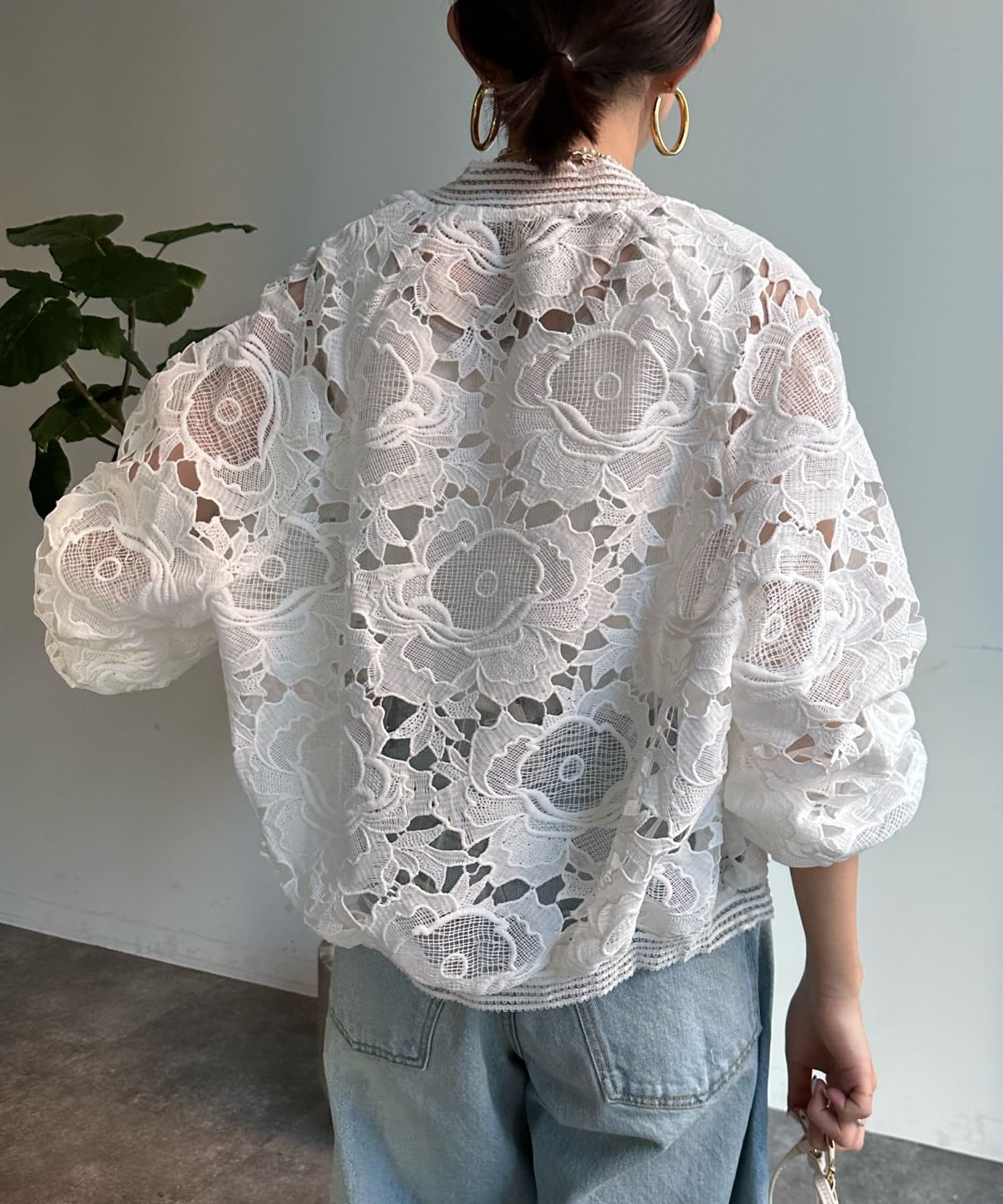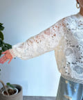 ふんわりとしたお袖に、大柄のレースデザインが甘すぎず大人の女性にぴったり!