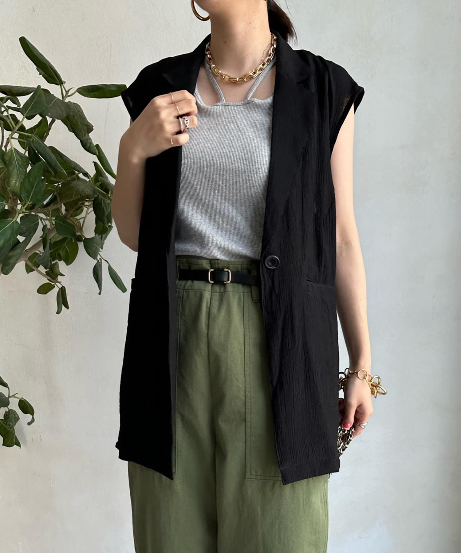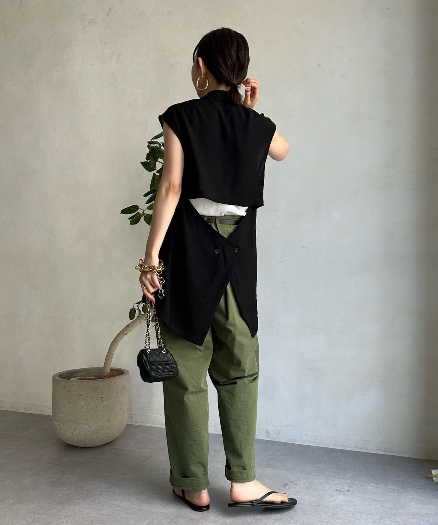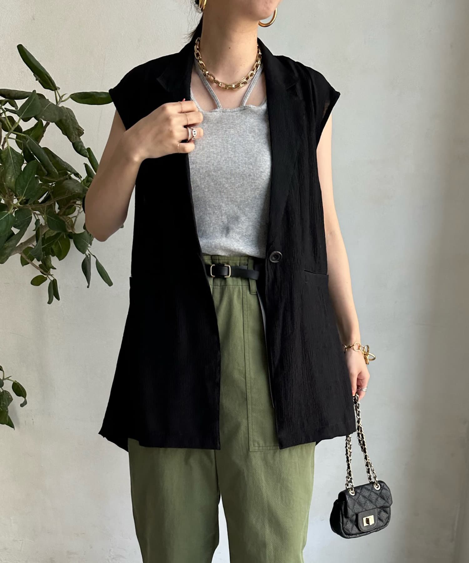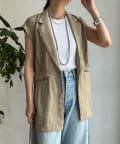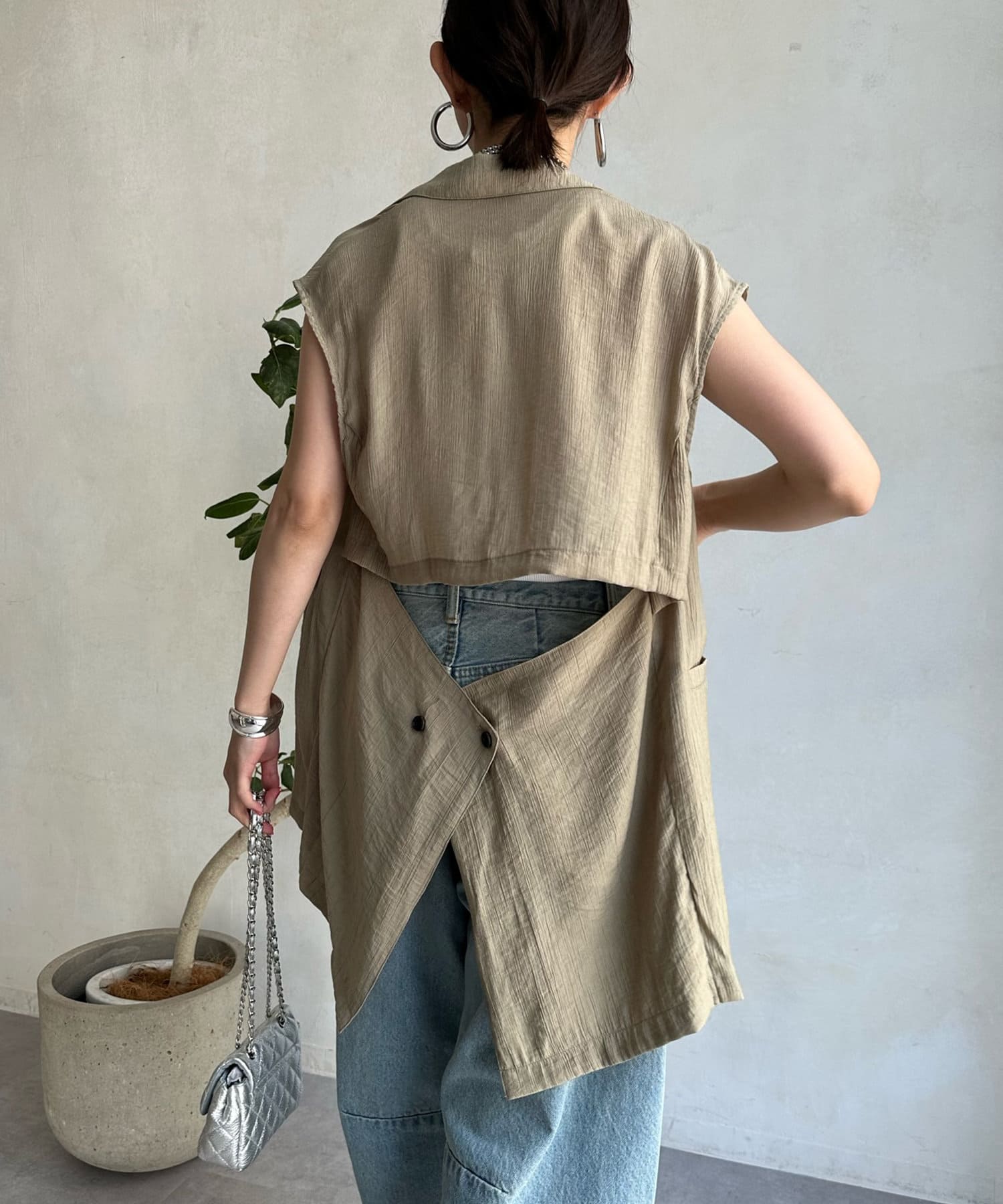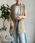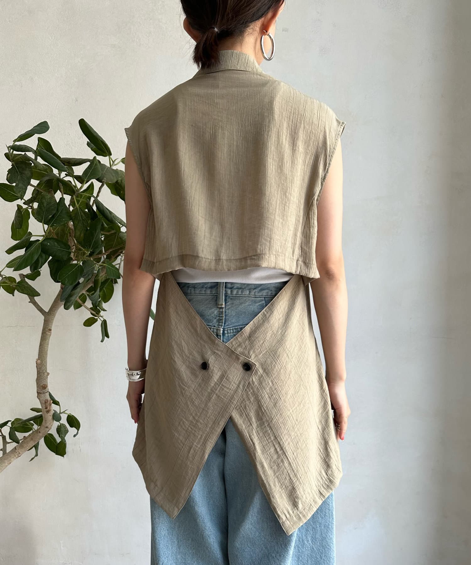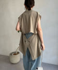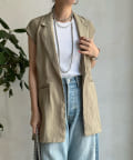 一見ベーシックなテーラードベストに見えますが、バックにカットアウトのデザインが施されたこなれ感溢れるアイテム。