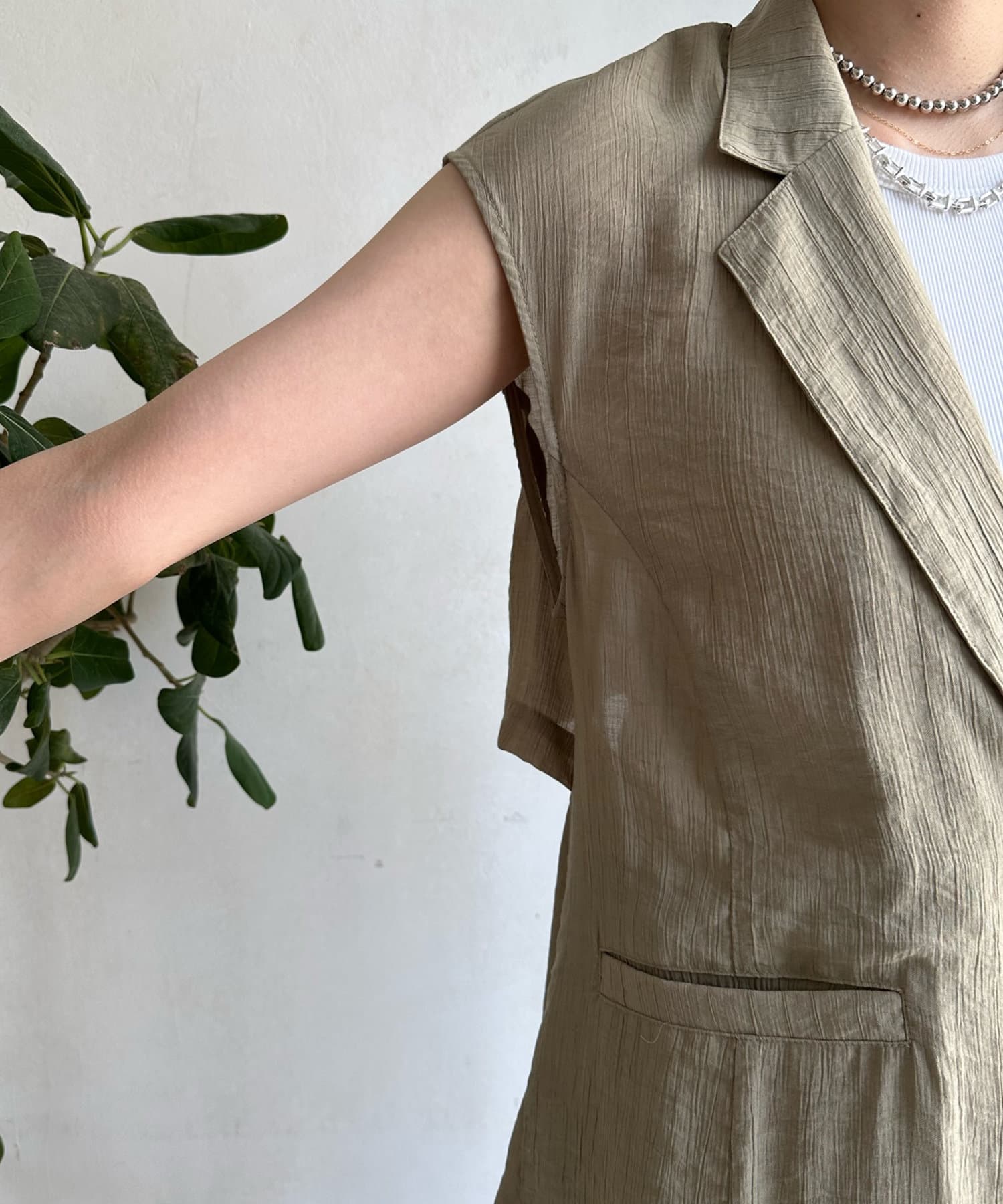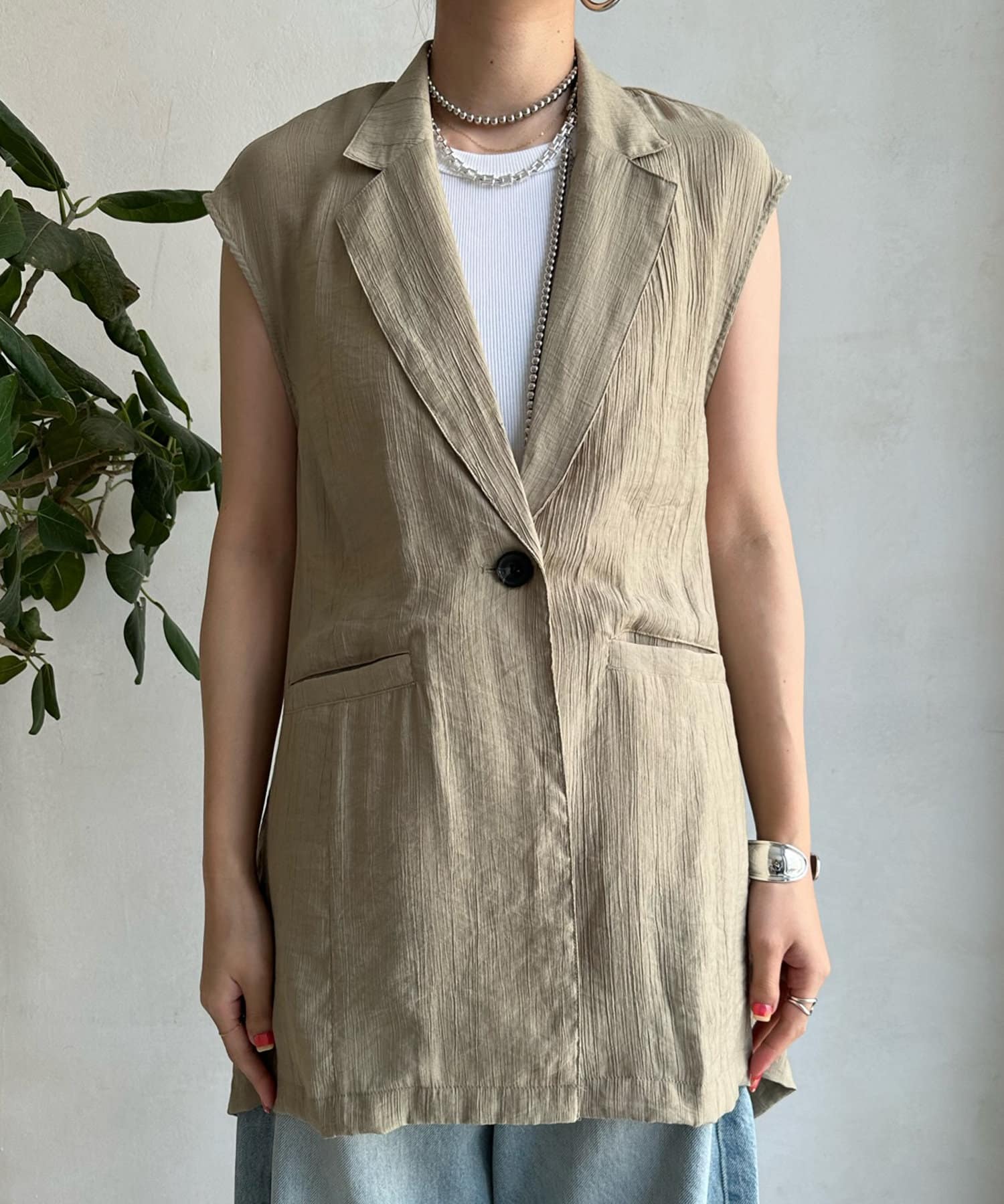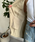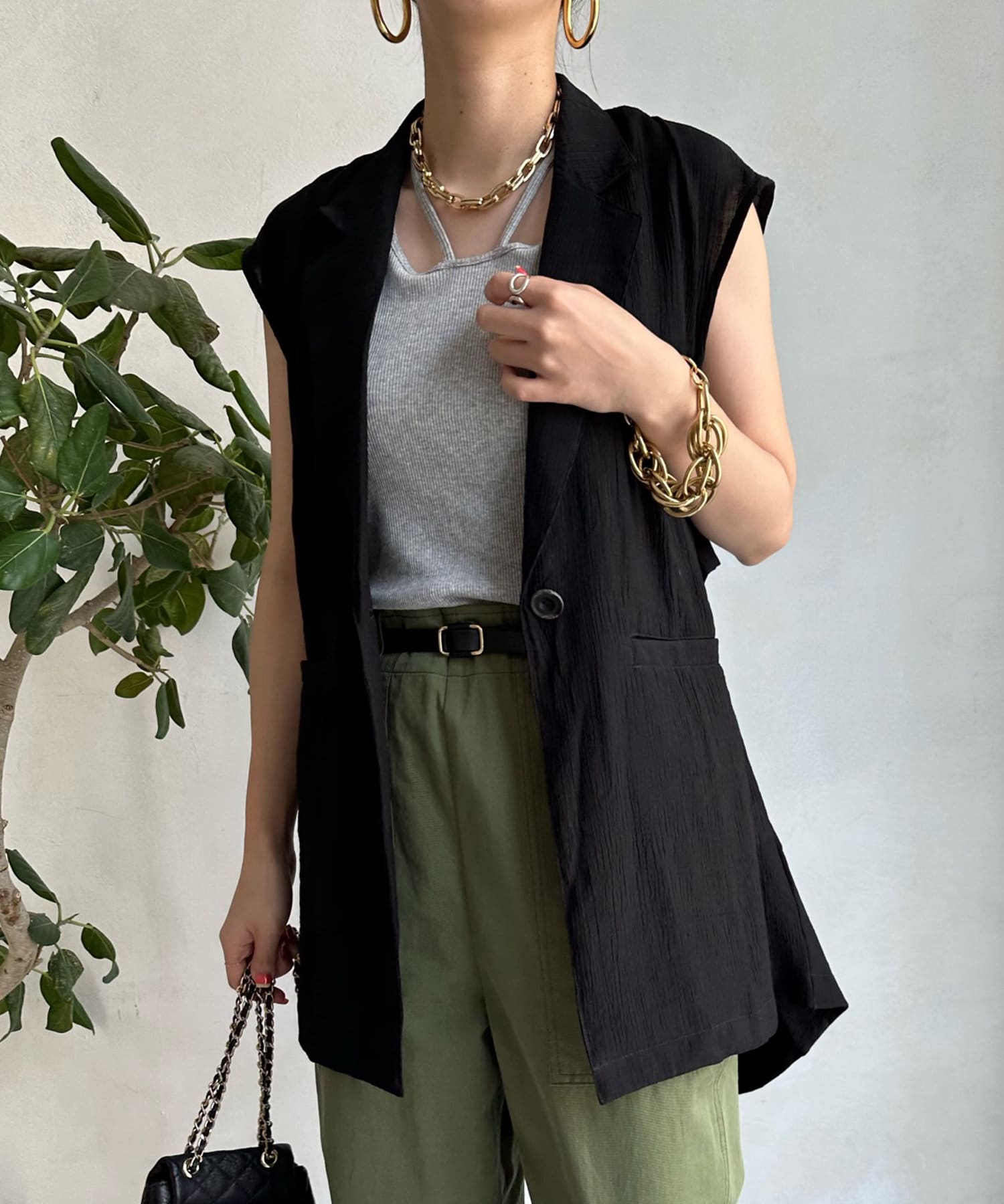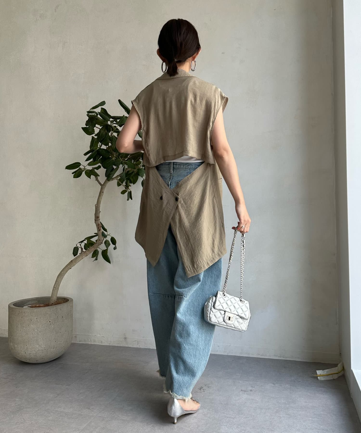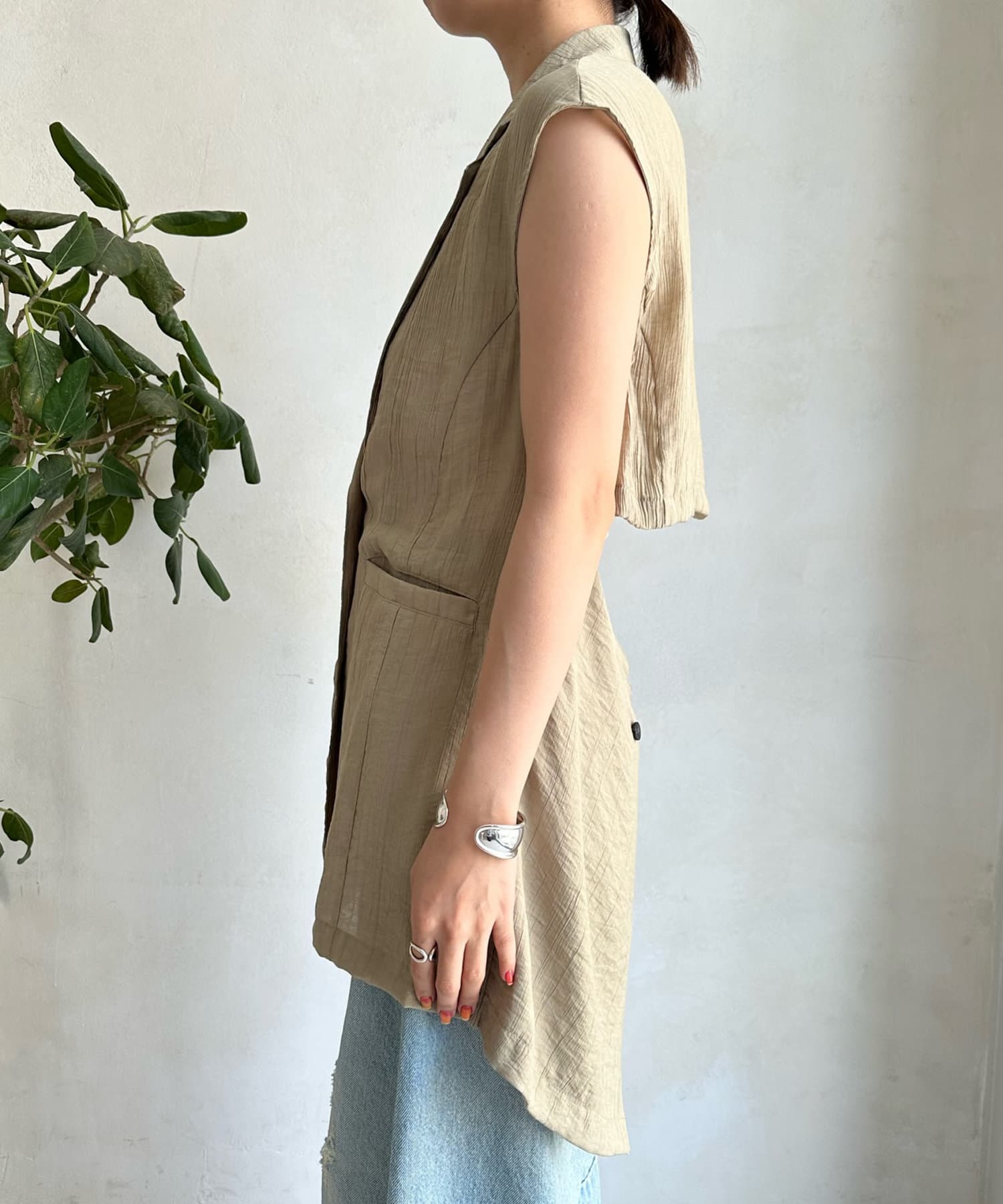一見ベーシックなテーラードベストに見えますが、バックにカットアウトのデザインが施されたこなれ感溢れるアイテム。
