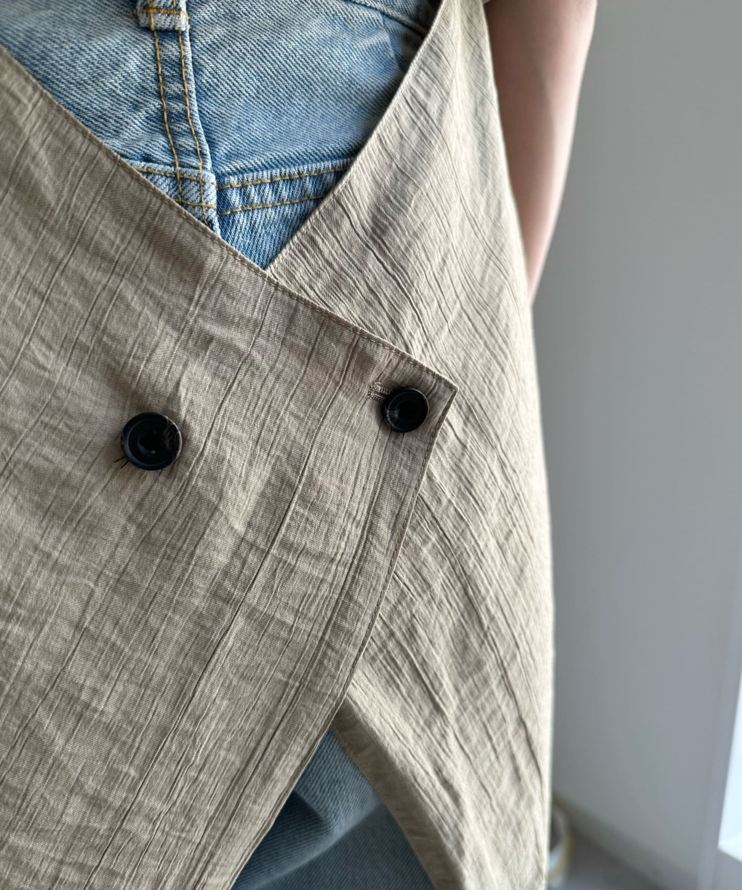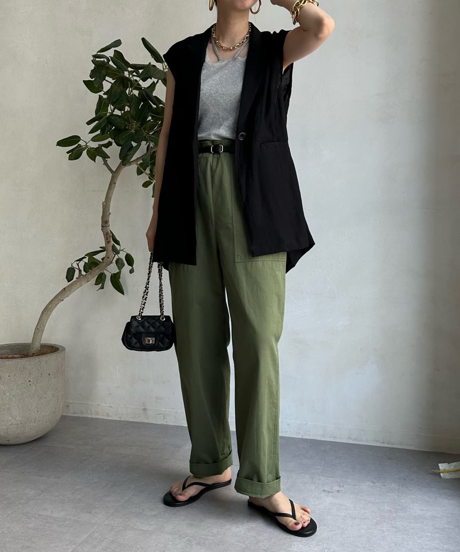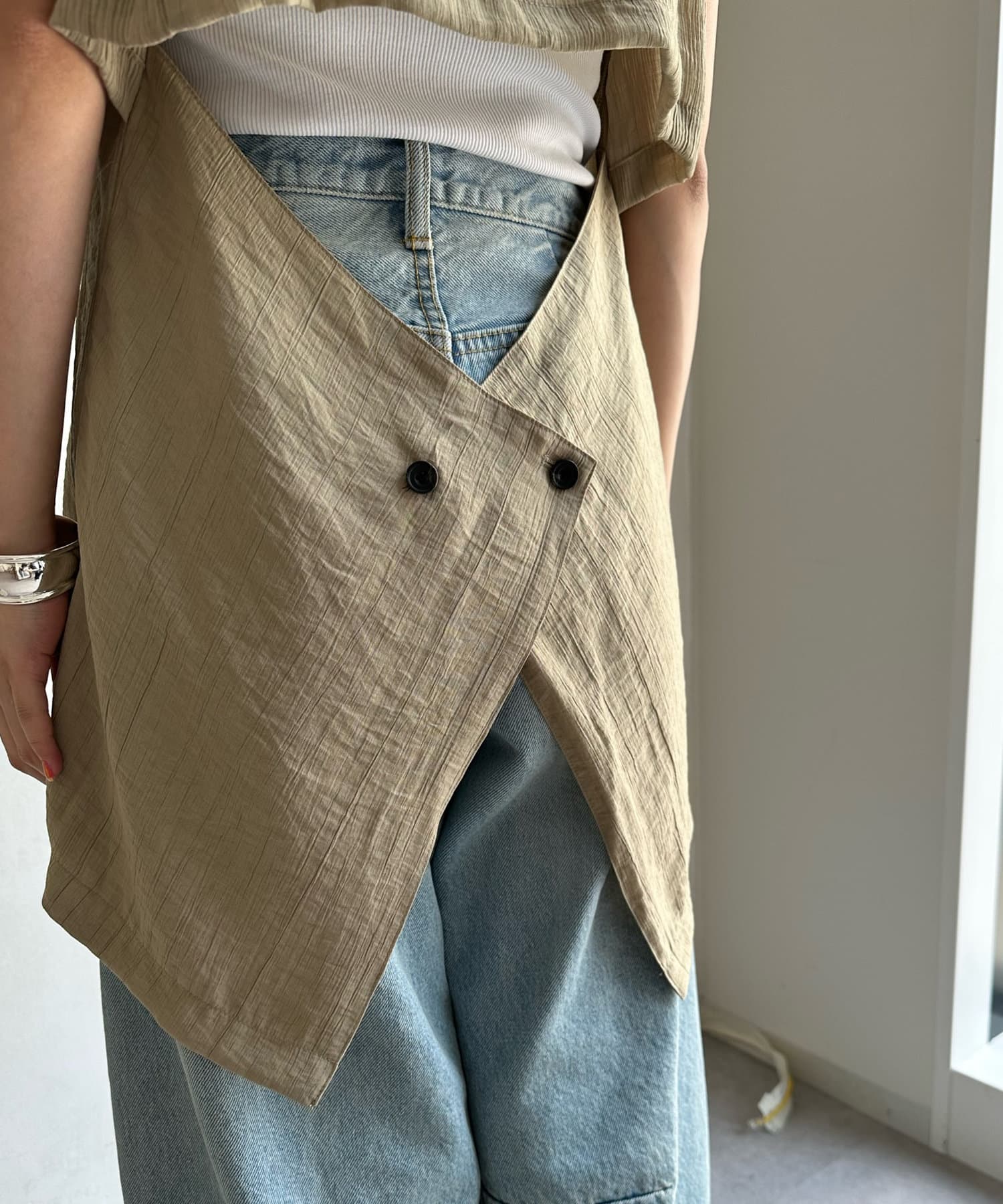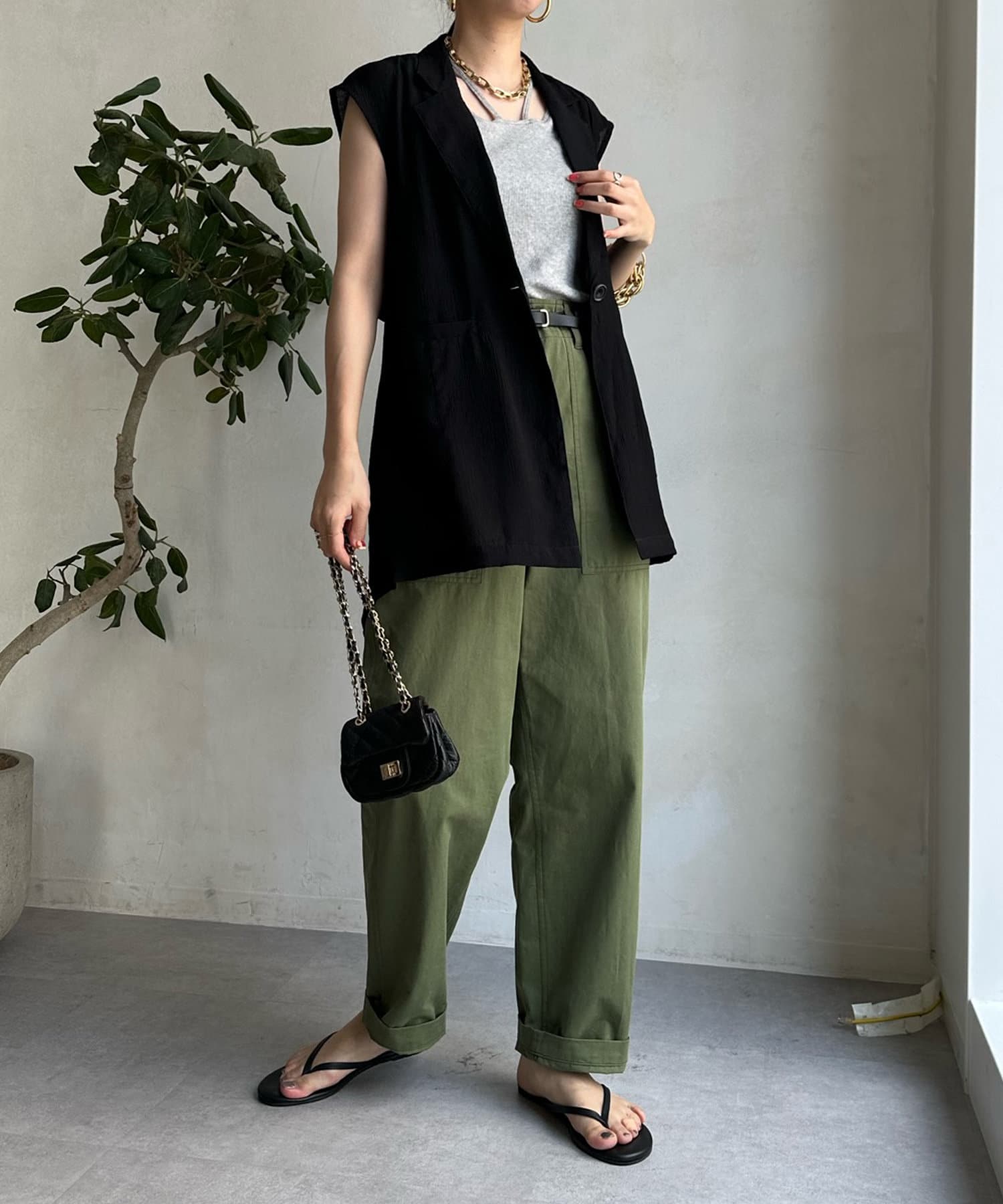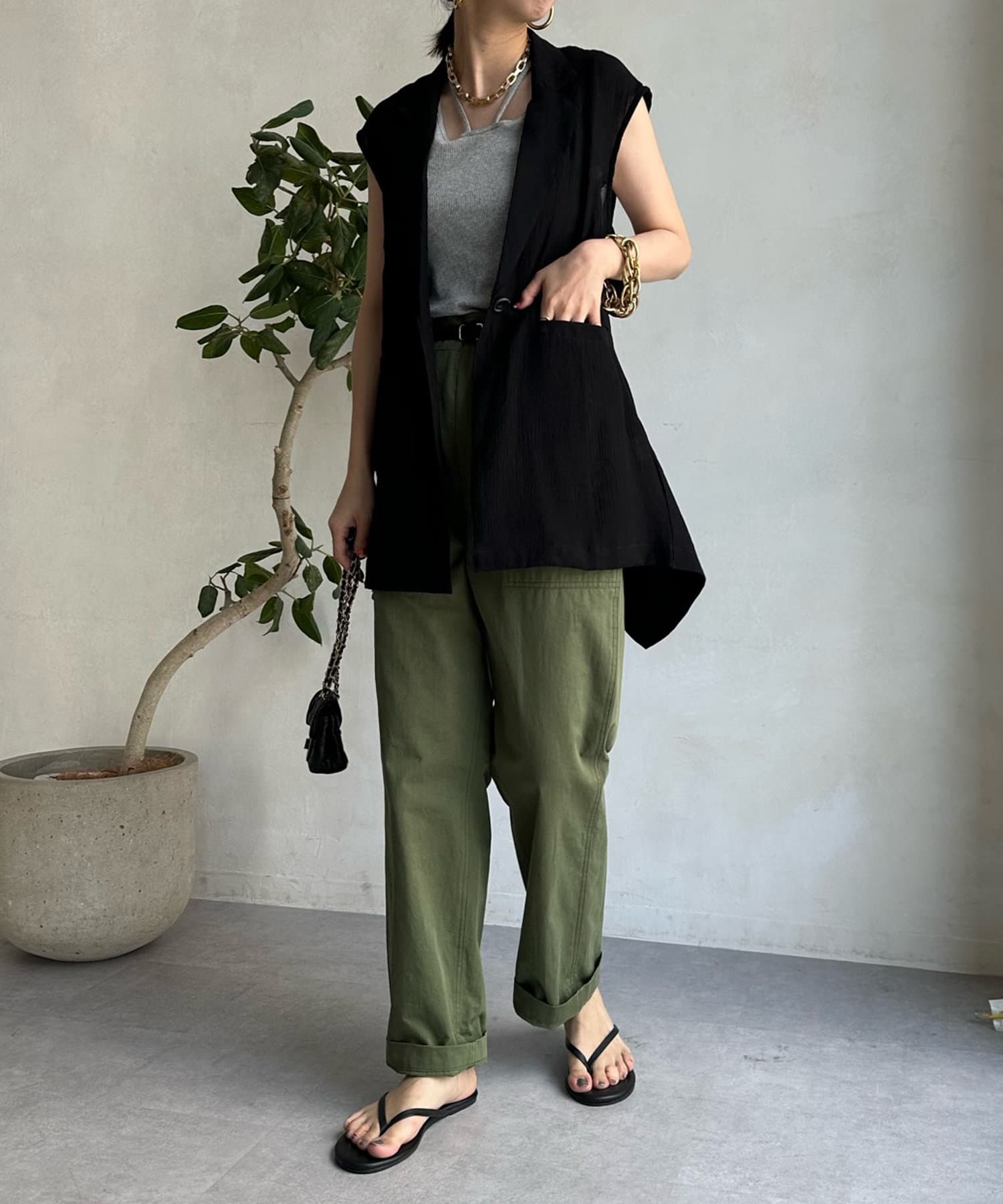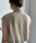 一見ベーシックなテーラードベストに見えますが、バックにカットアウトのデザインが施されたこなれ感溢れるアイテム。
