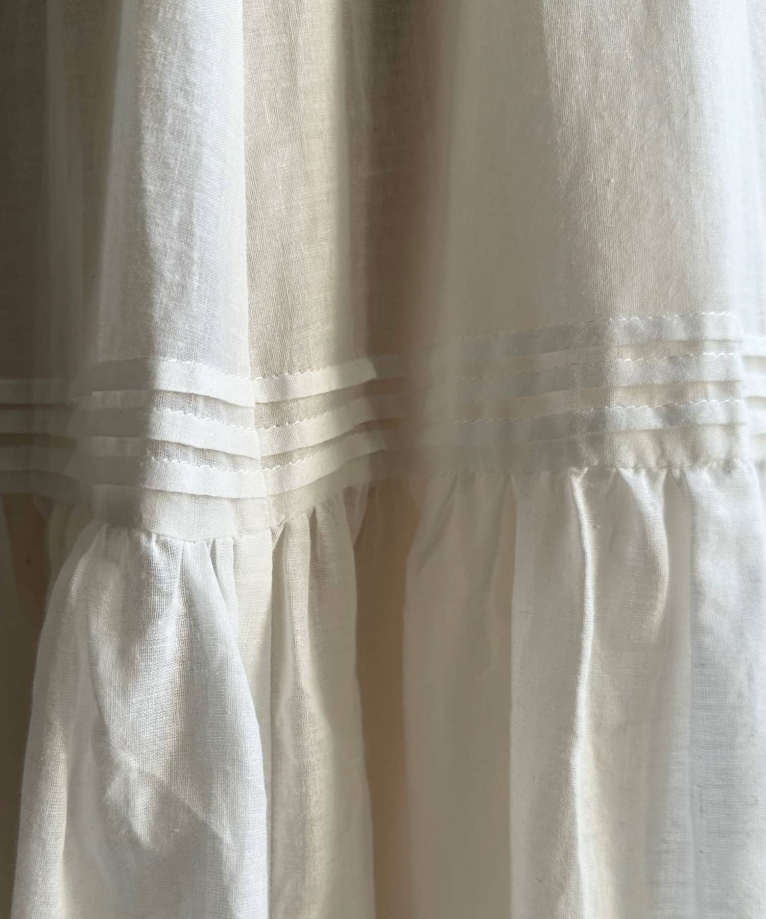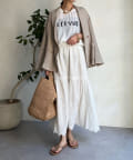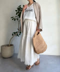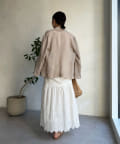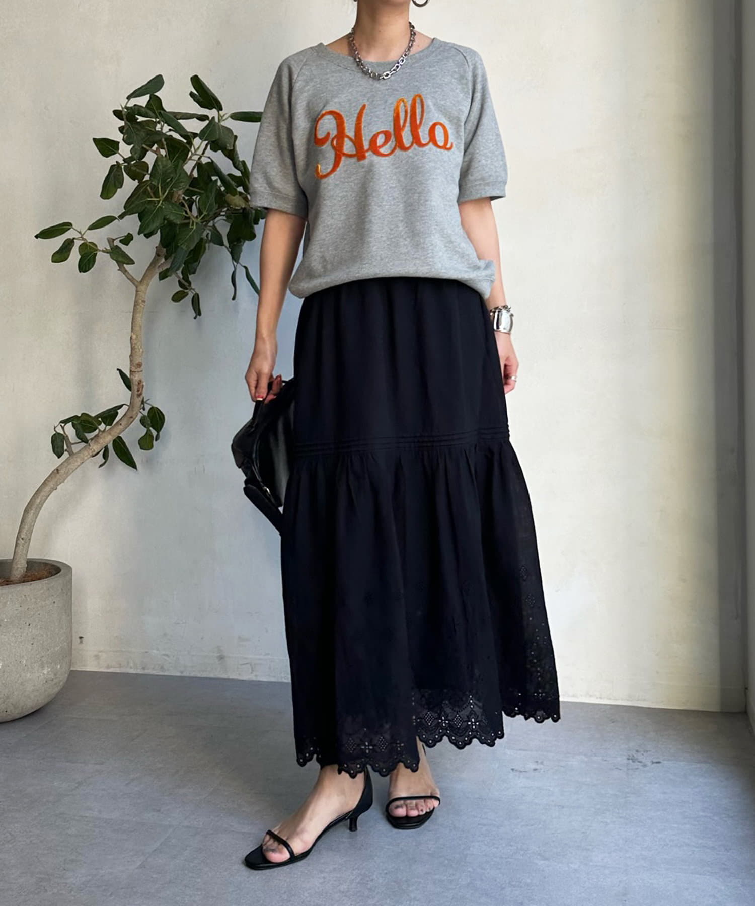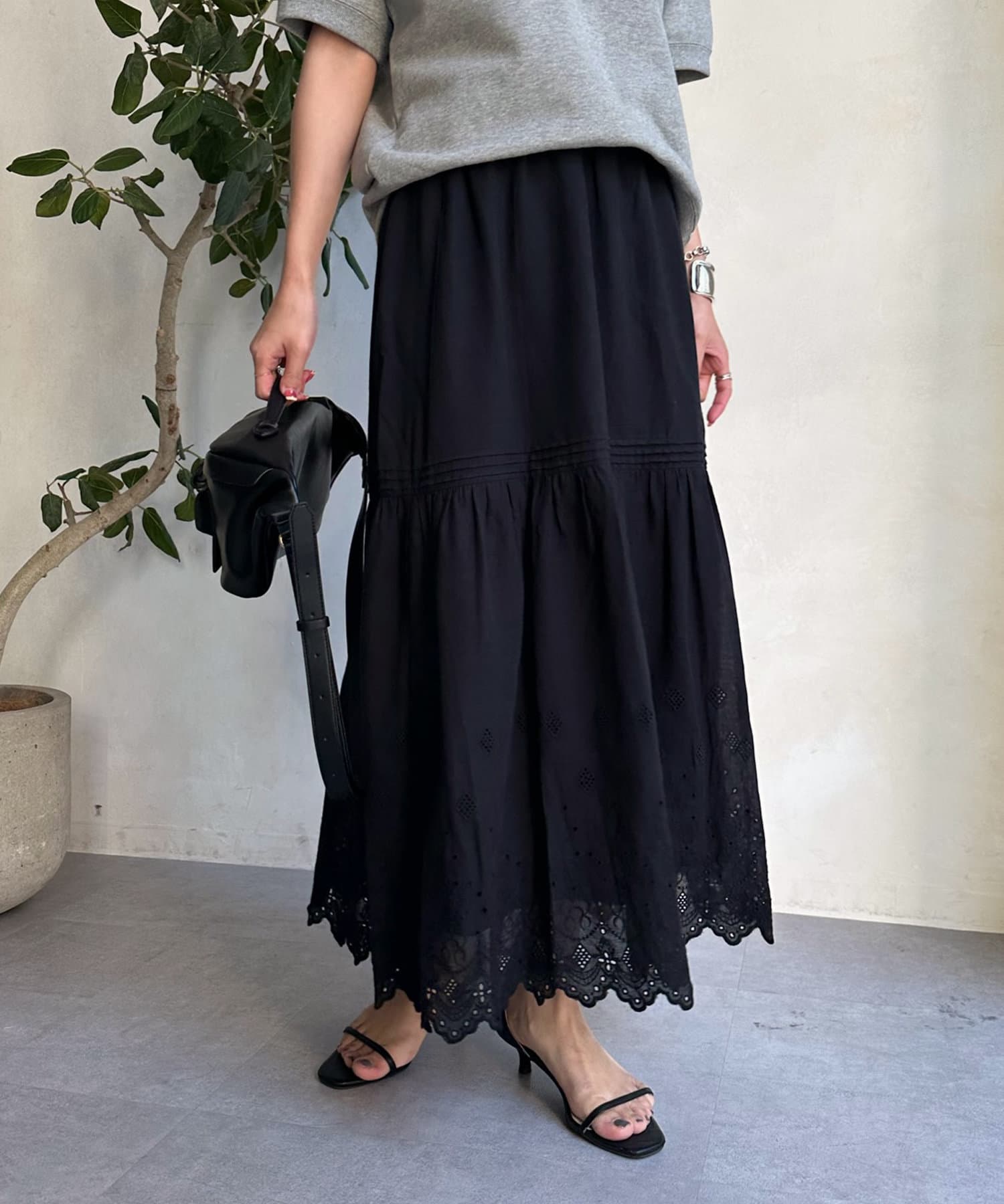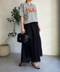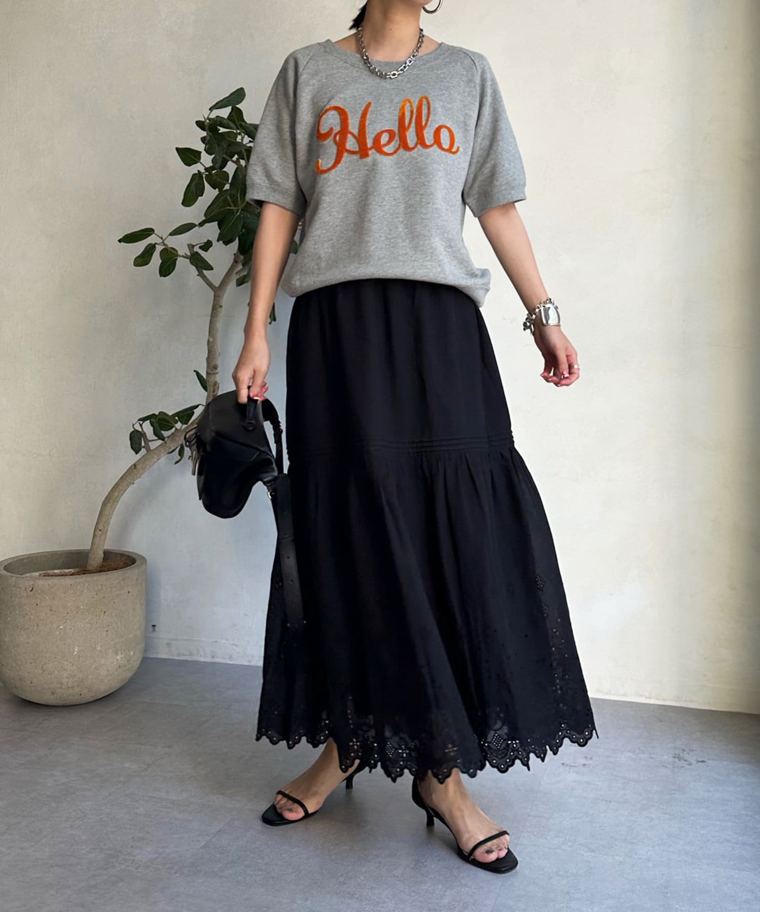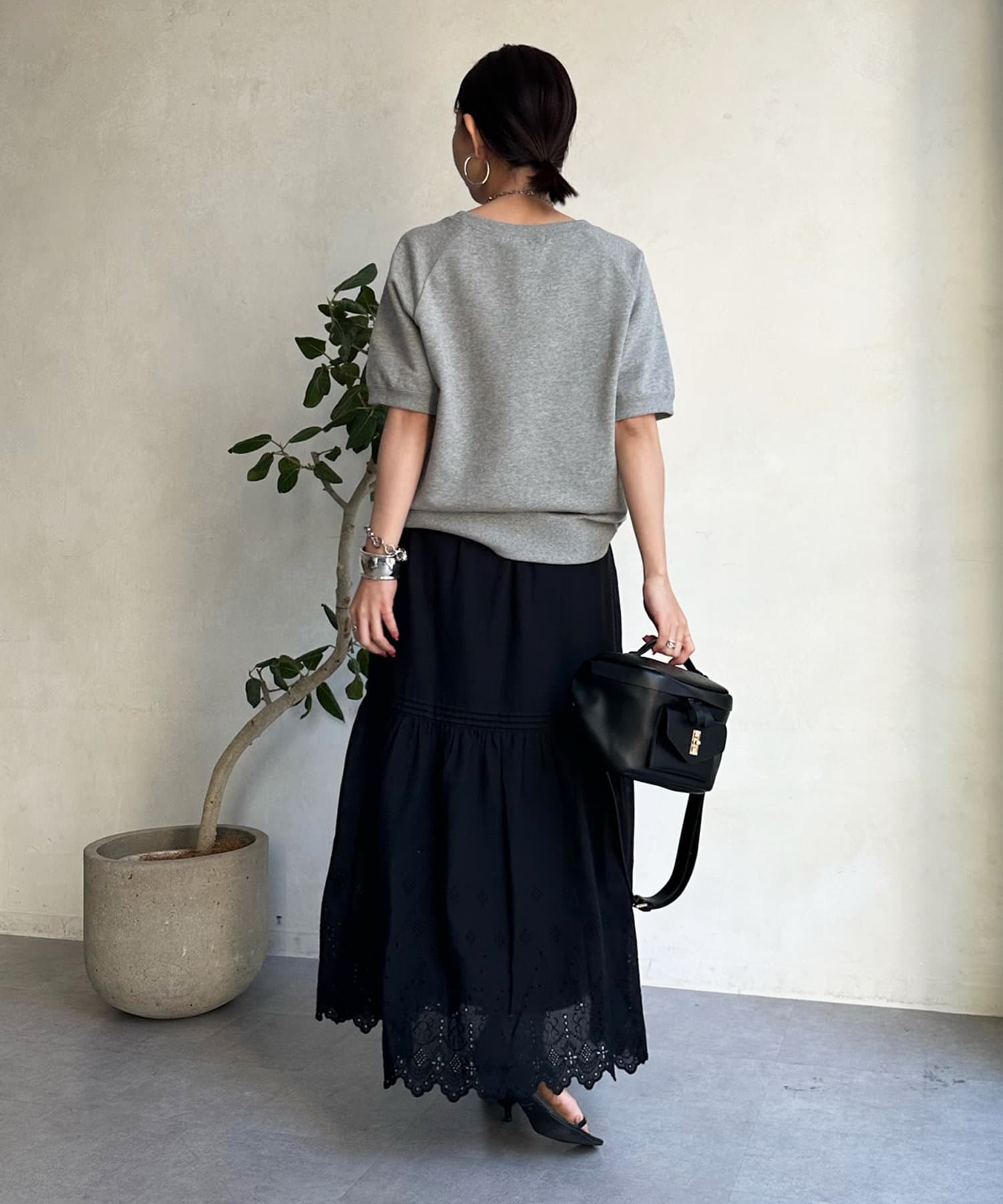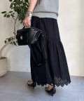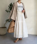 膝上あたりに切り替えを施し、裾にかけて広がる華やかなシルエットに。