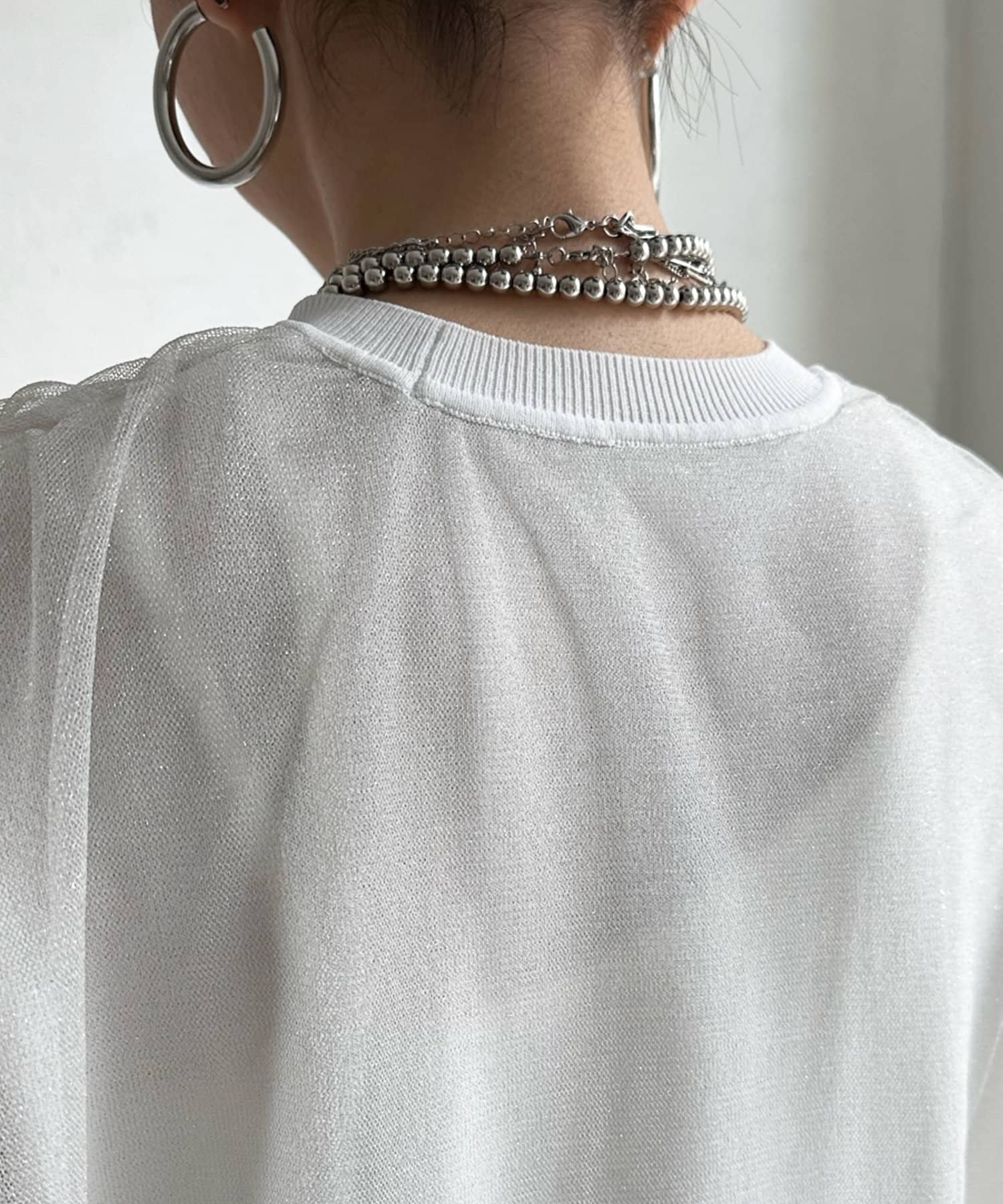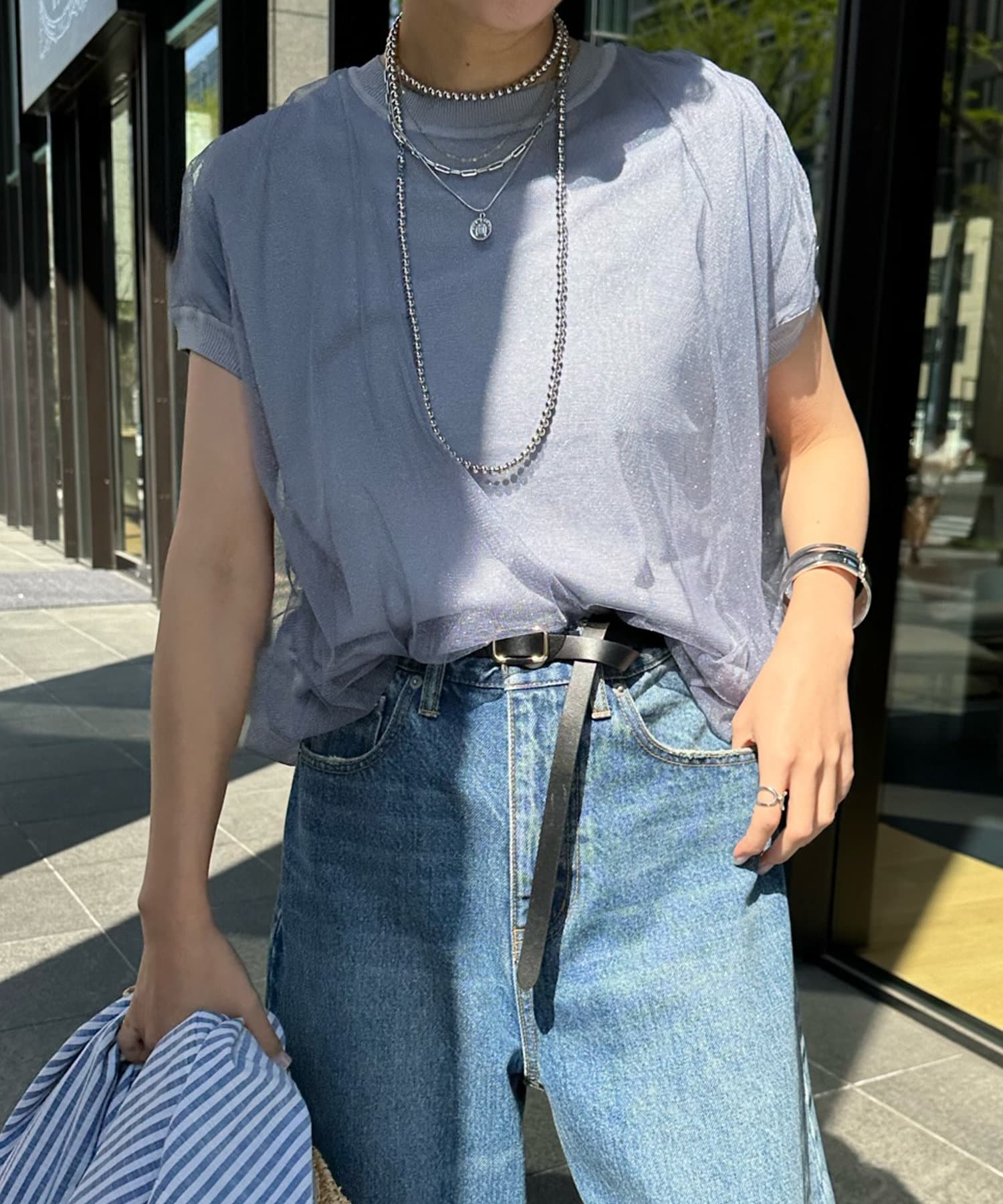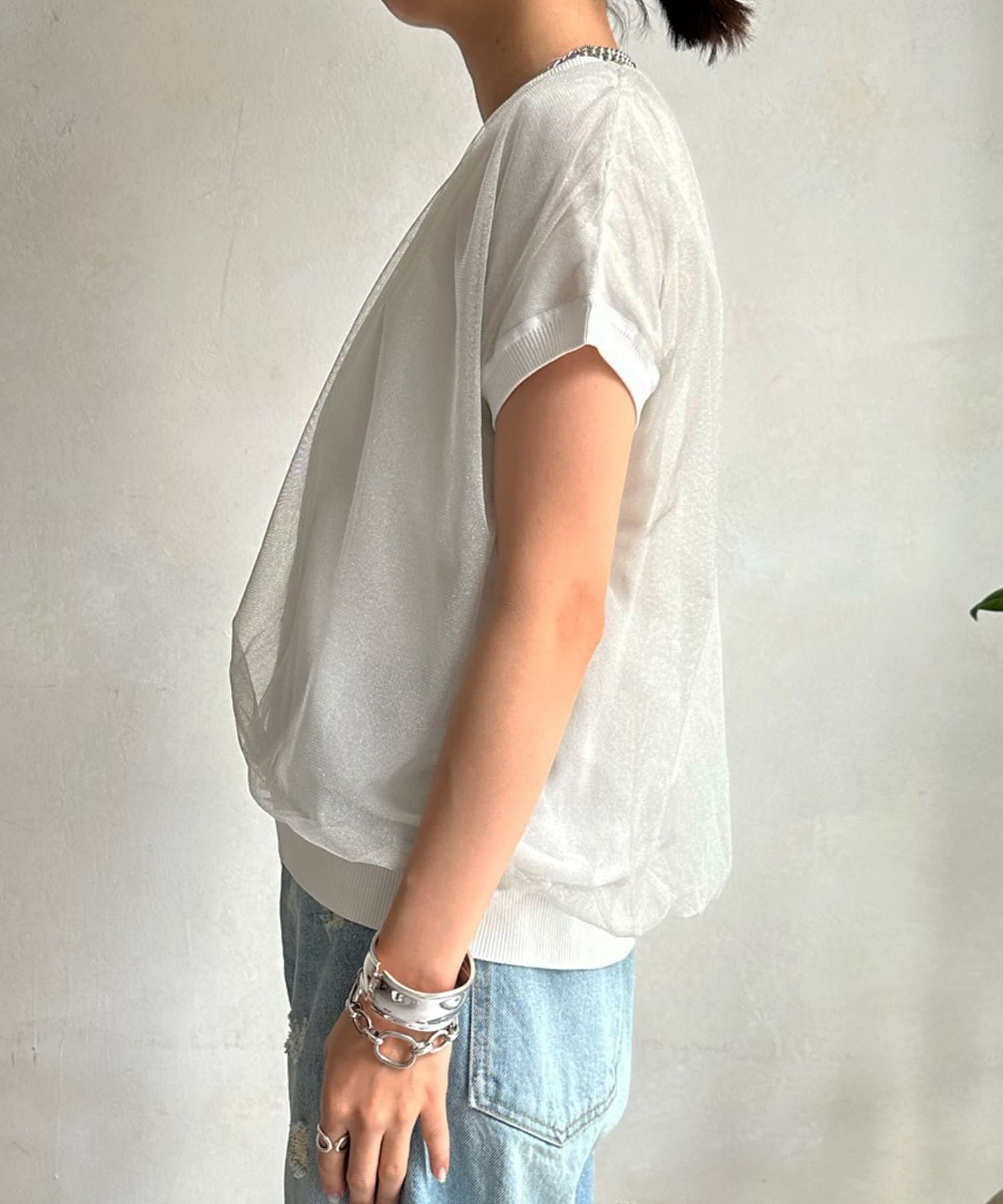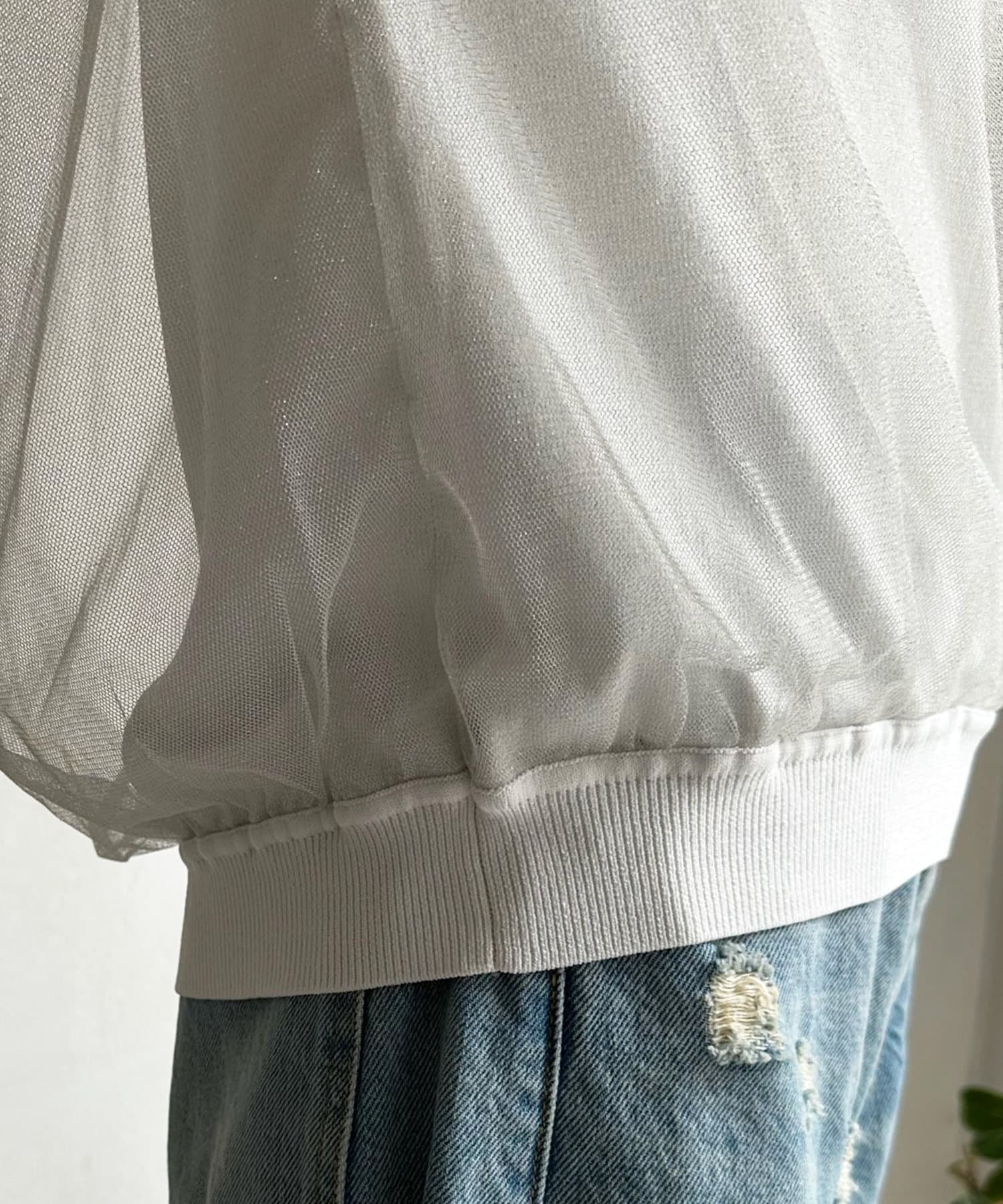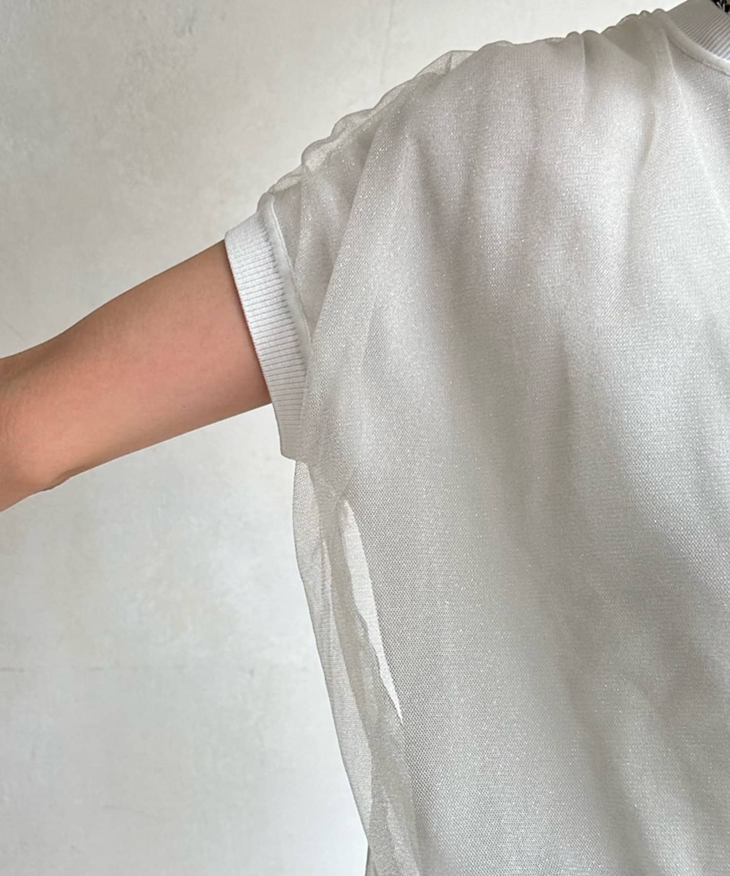 きらきらとしたラメのチュール素材を重ねたフレンチ袖のサマーニット。