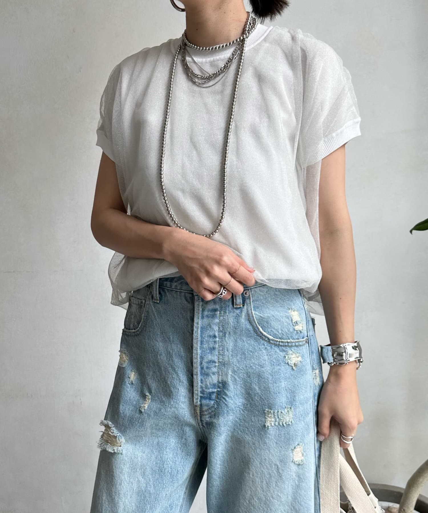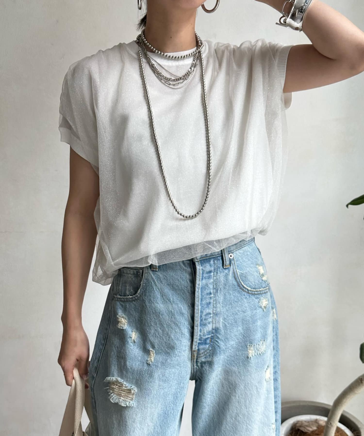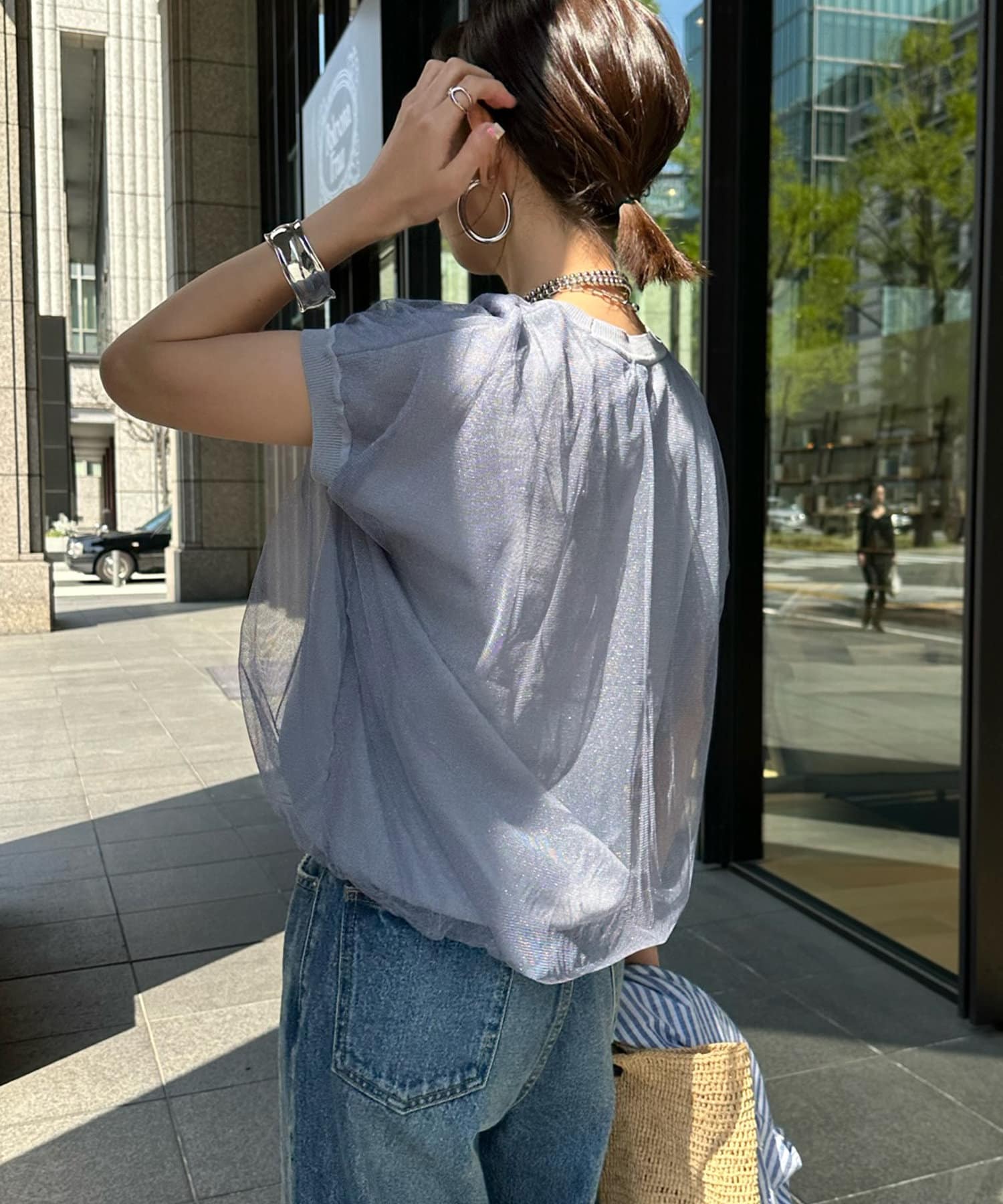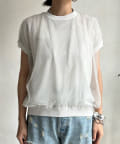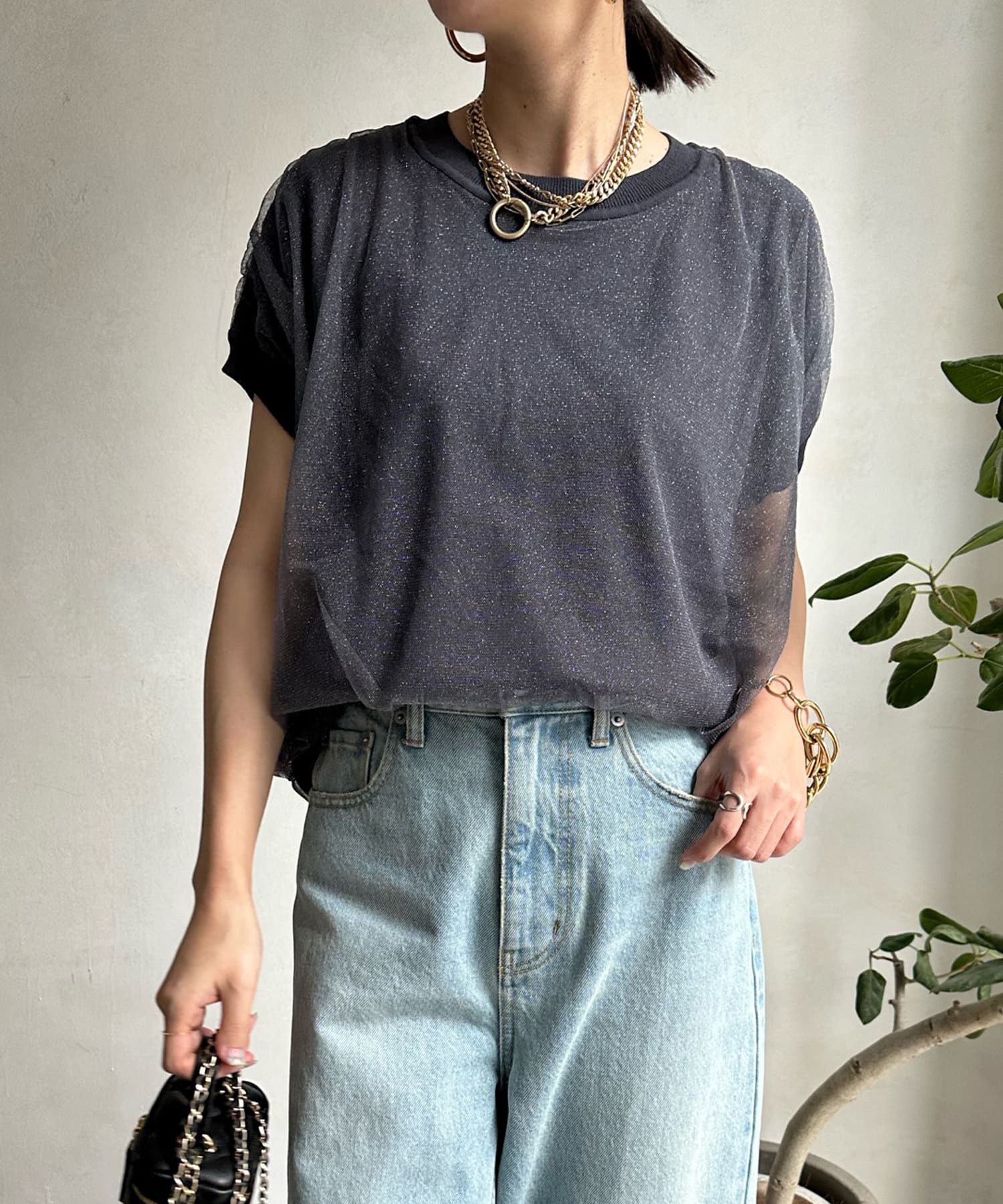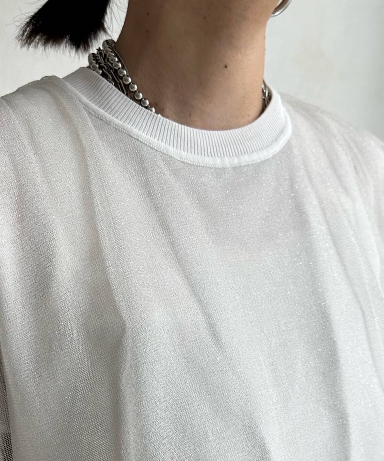 きらきらとしたラメのチュール素材を重ねたフレンチ袖のサマーニット。