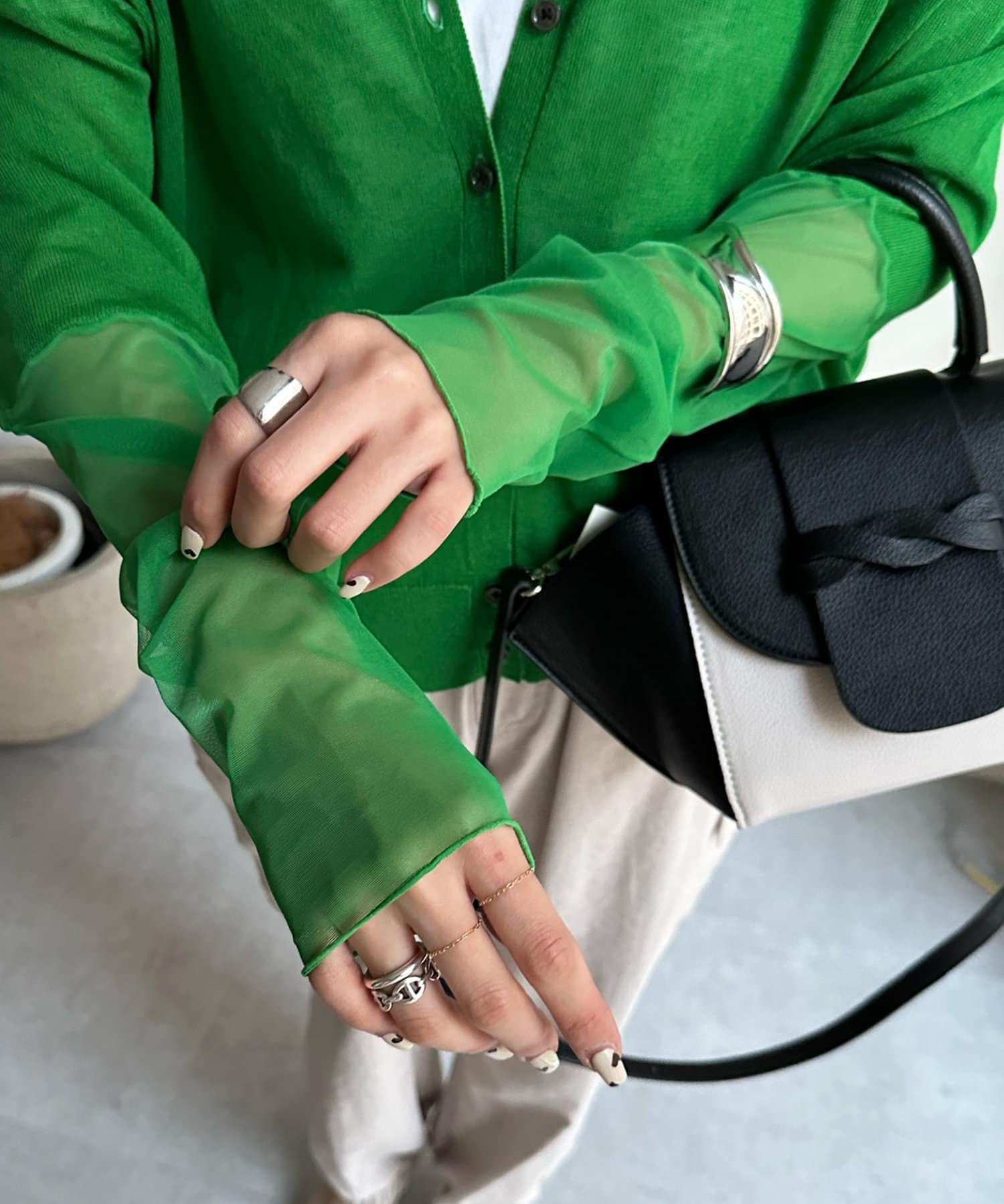 袖口部分は長めに切り替えられているため、女性らしくすっきりとした印象に仕上がります。