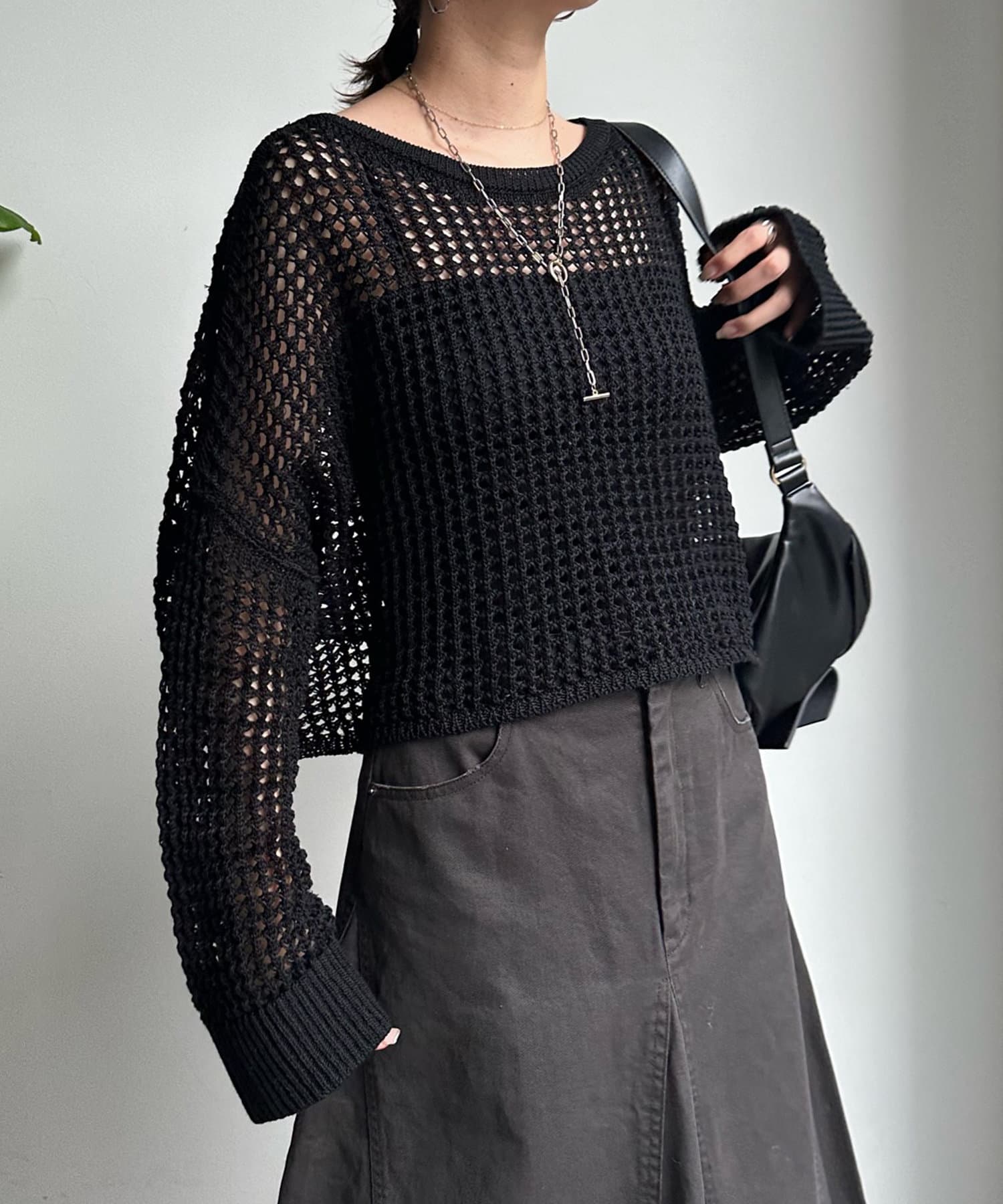 ざっくりと編まれたメッシュの編地がポイントで、シンプルなデザインながらも表情豊かな印象を与えます。