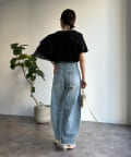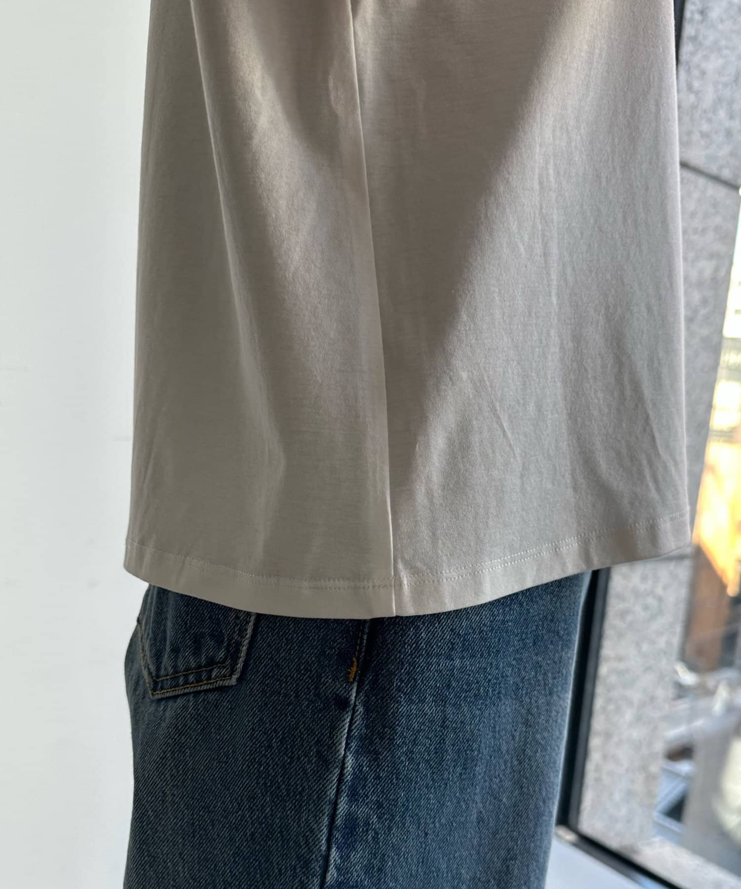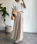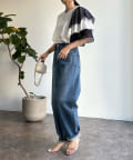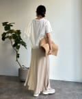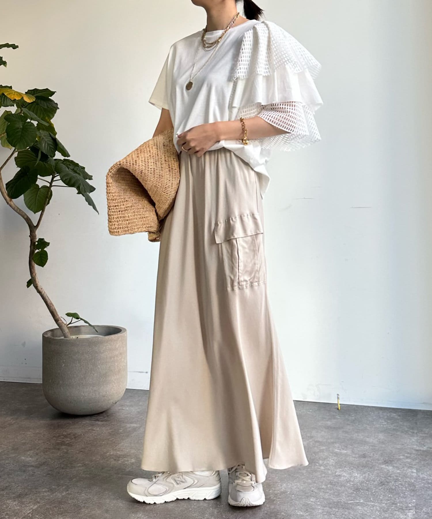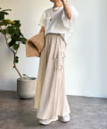 カットソー素材で程よくカジュアルな印象を与え、丈はコンパクトにすることで、スタイリングがバランス良く決まるのもポイントです。