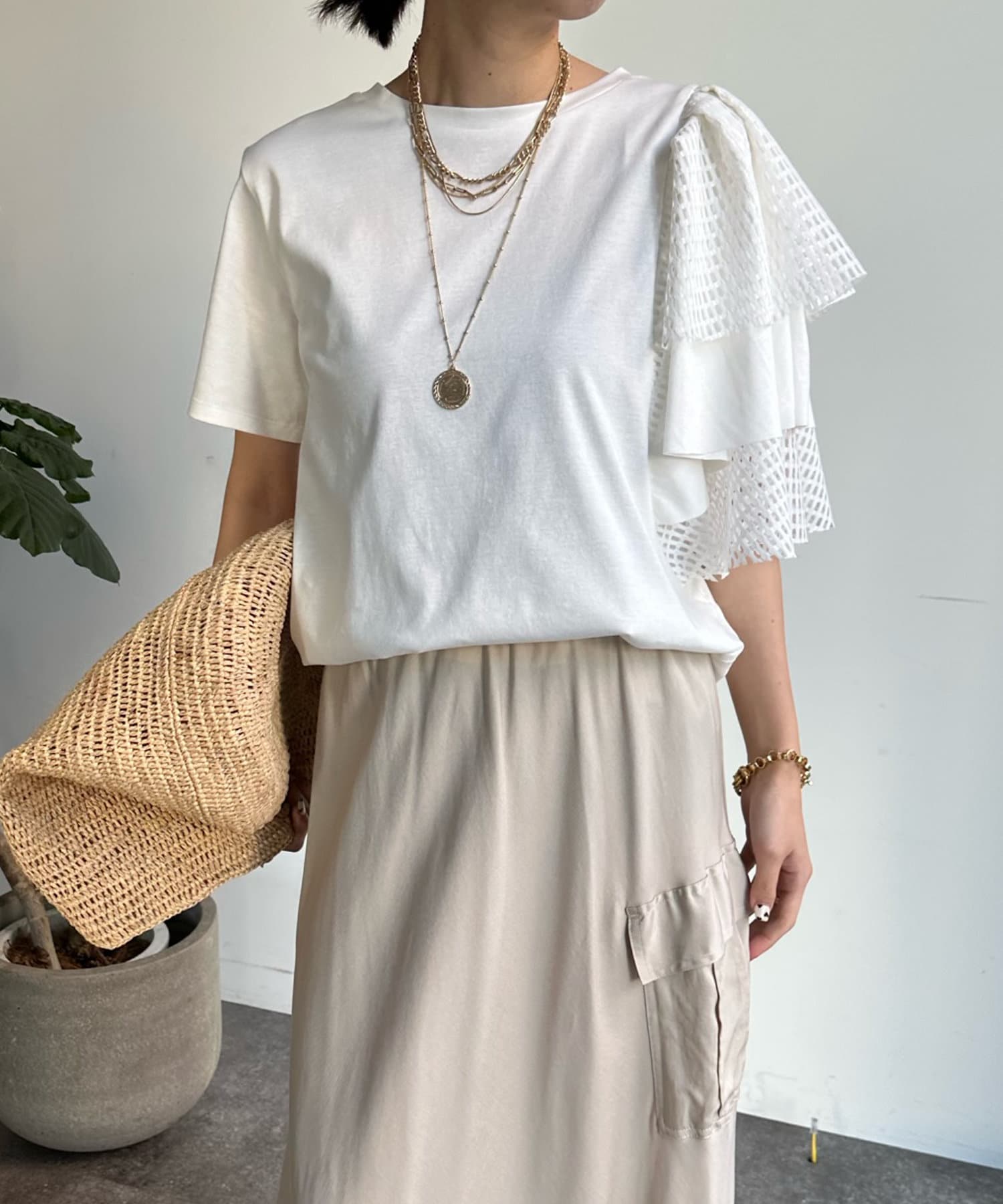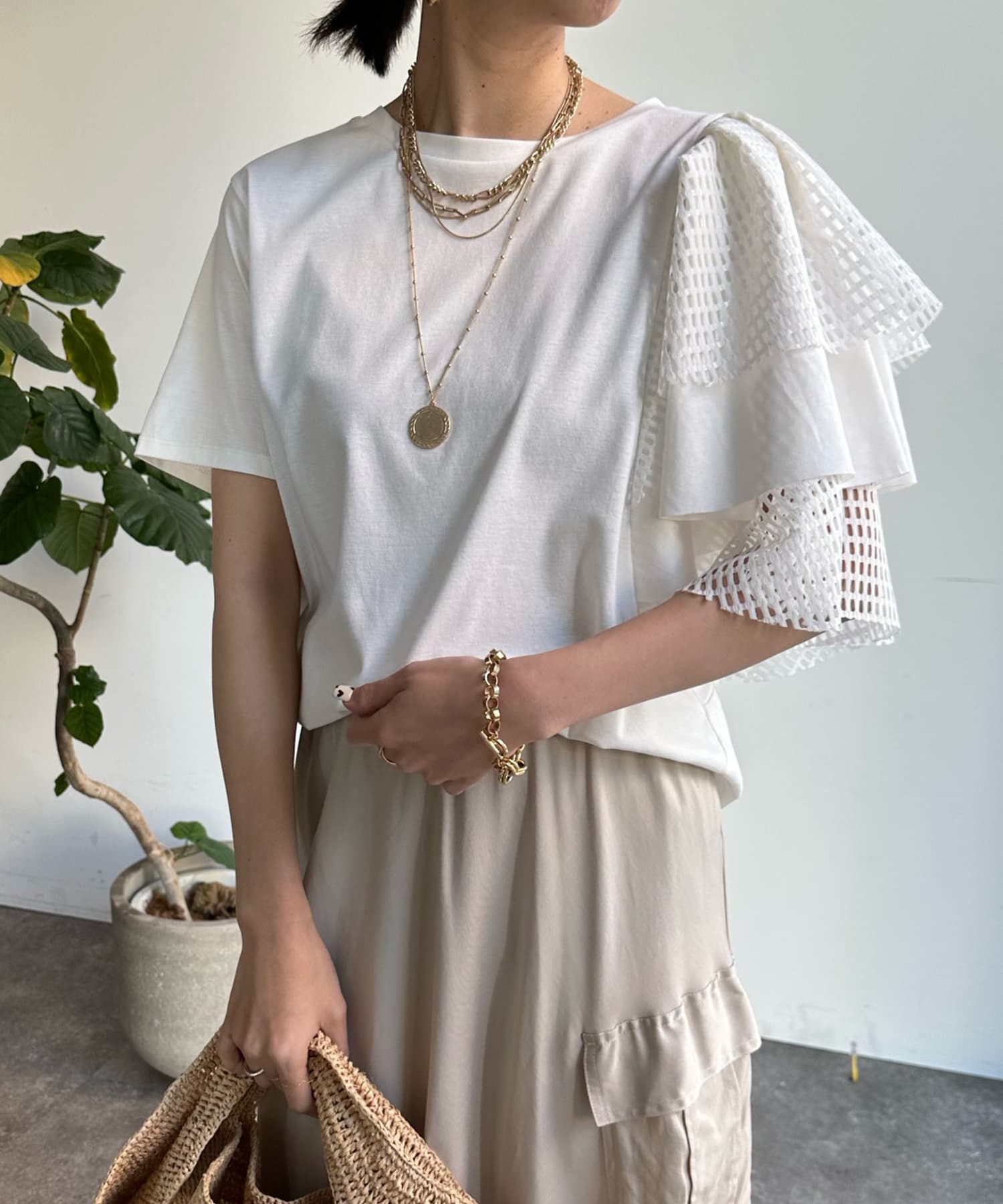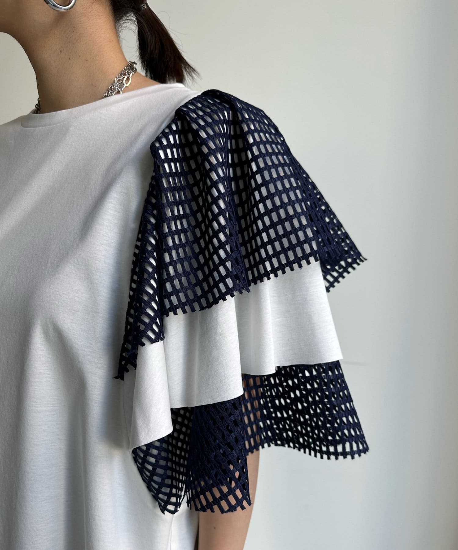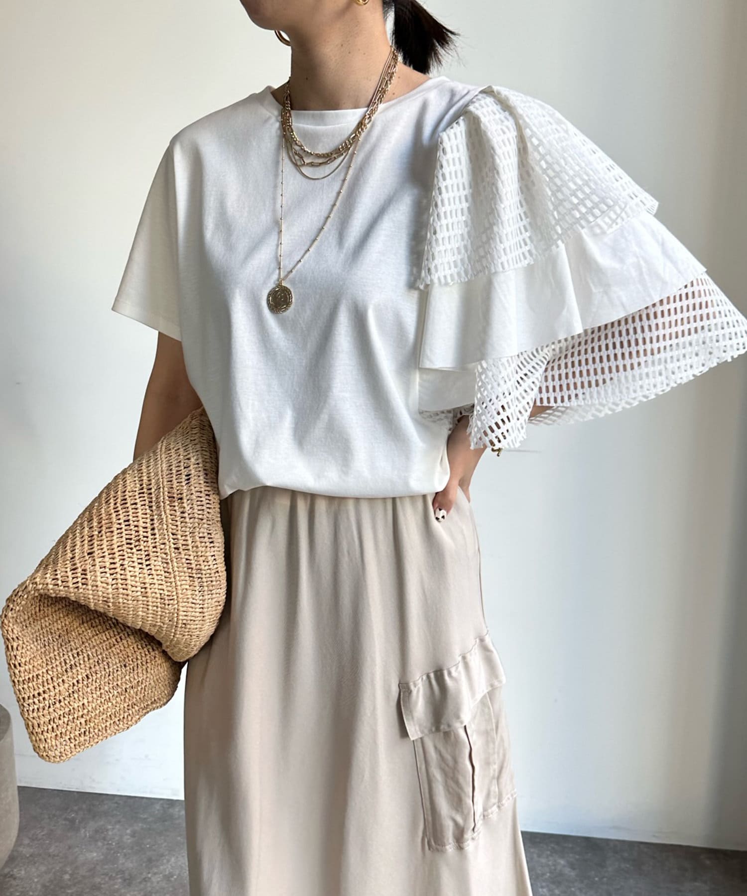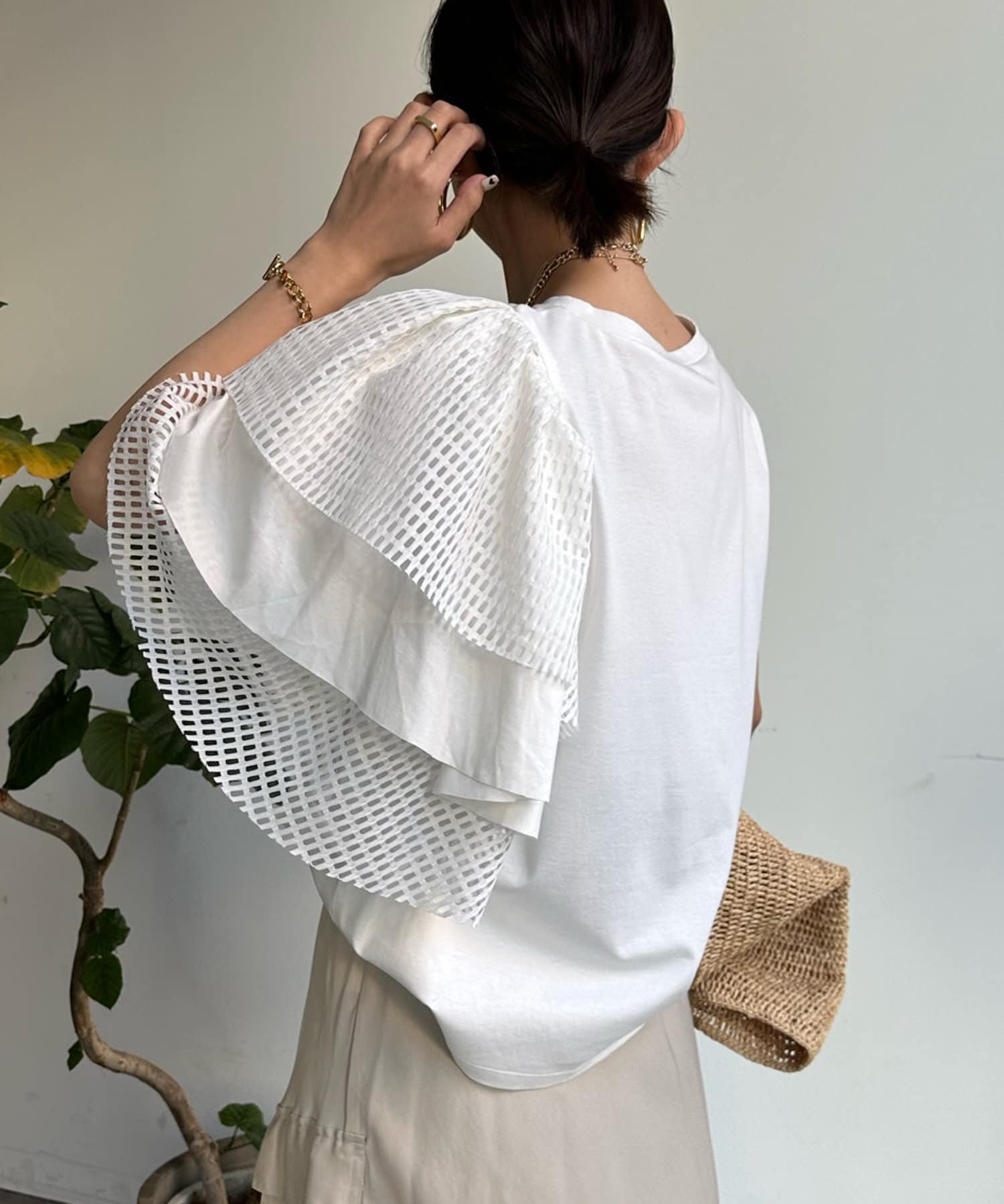 また、ボリュームのあるメッシュデザインが二の腕をさり気なくカバーしてくれるので気軽に着用して頂けますよ◎