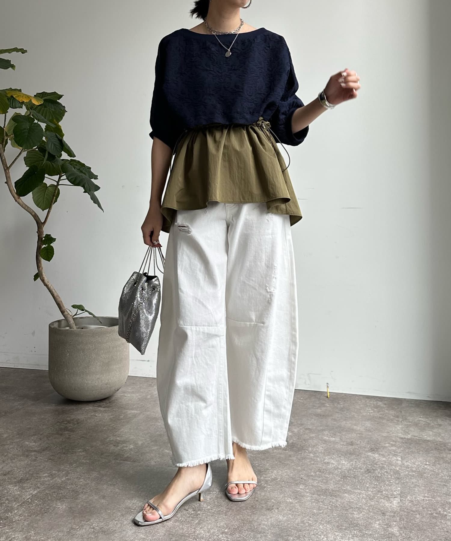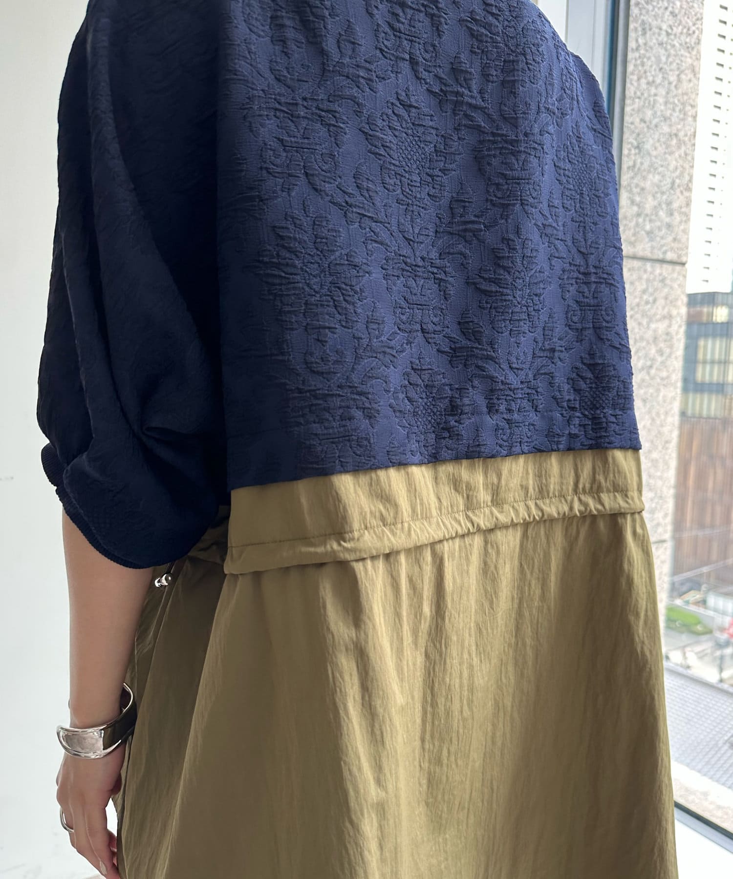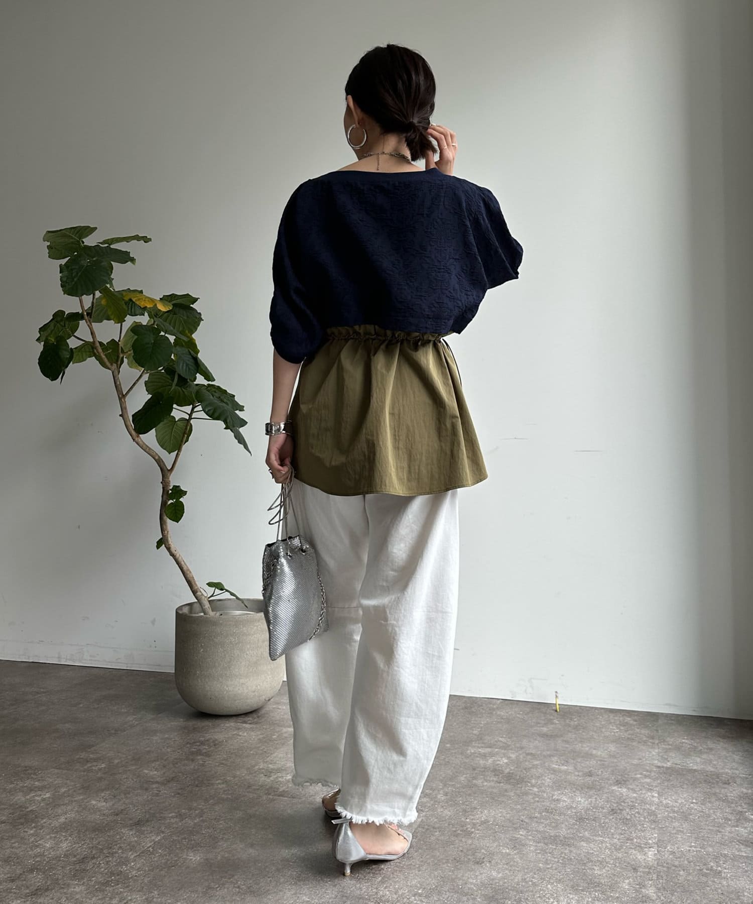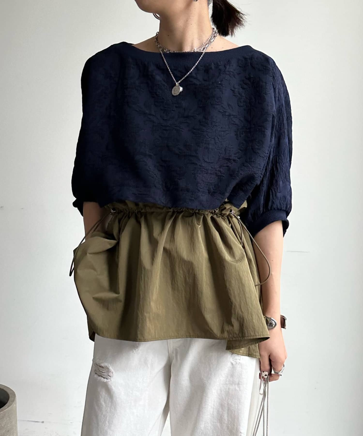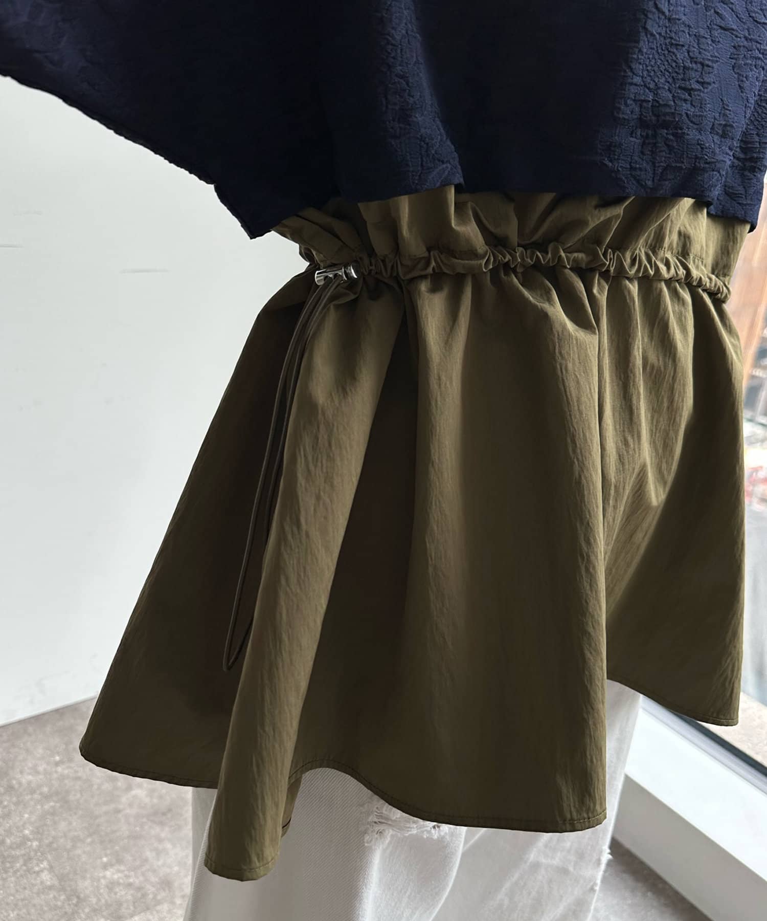 ウエスト下から素材を切り替え、ドロストコードを絞ると広がる裾が女性らしさ抜群。
