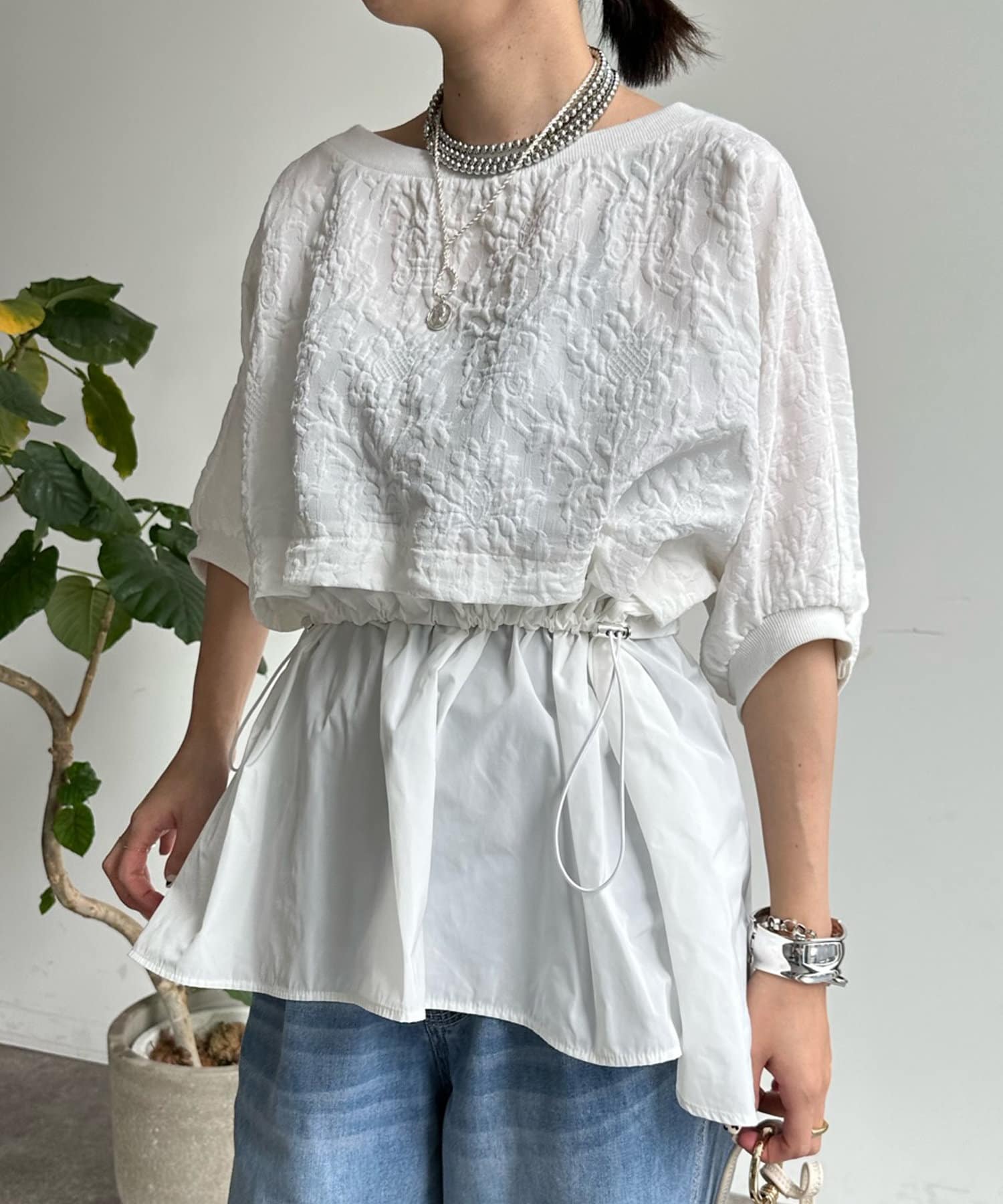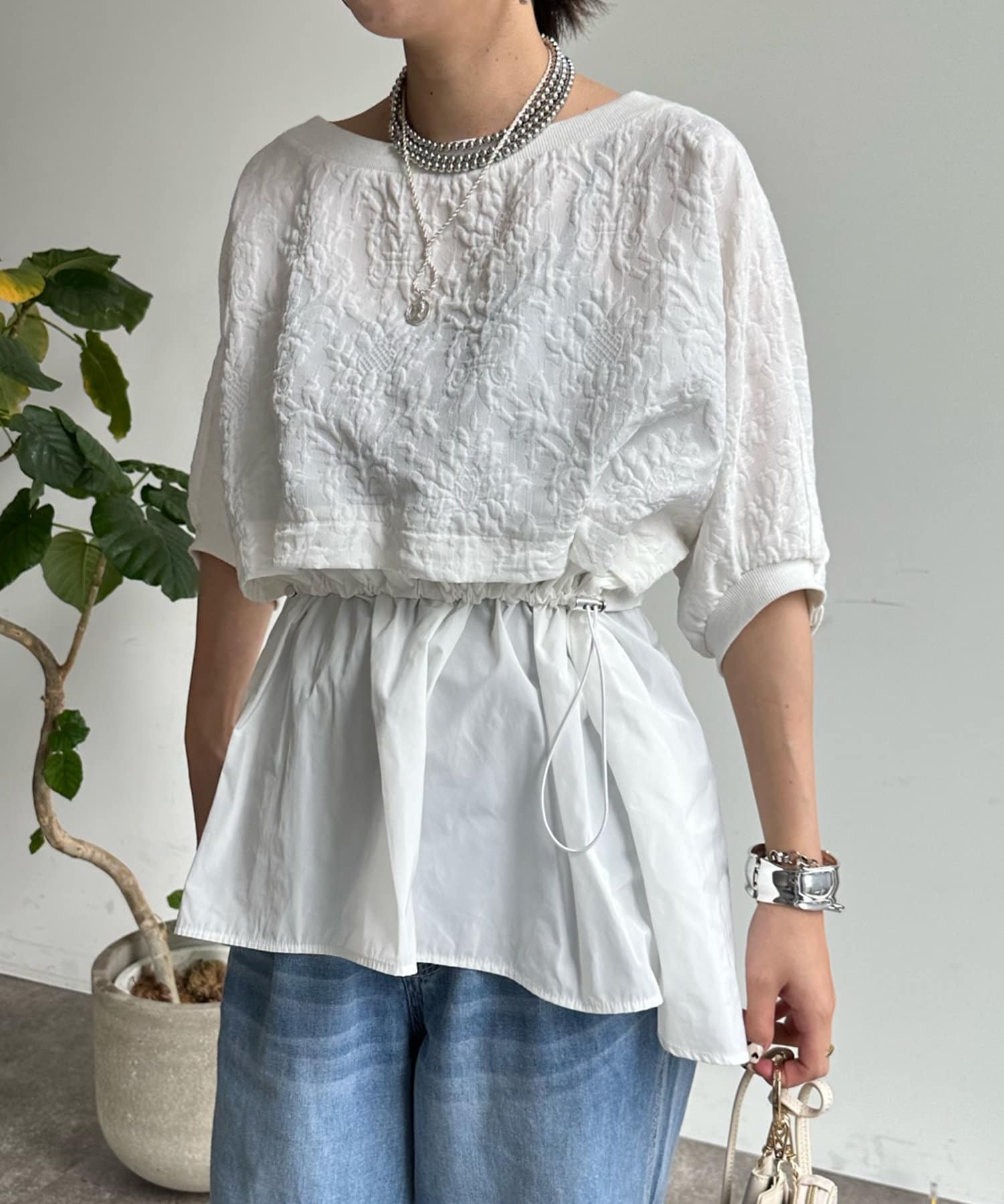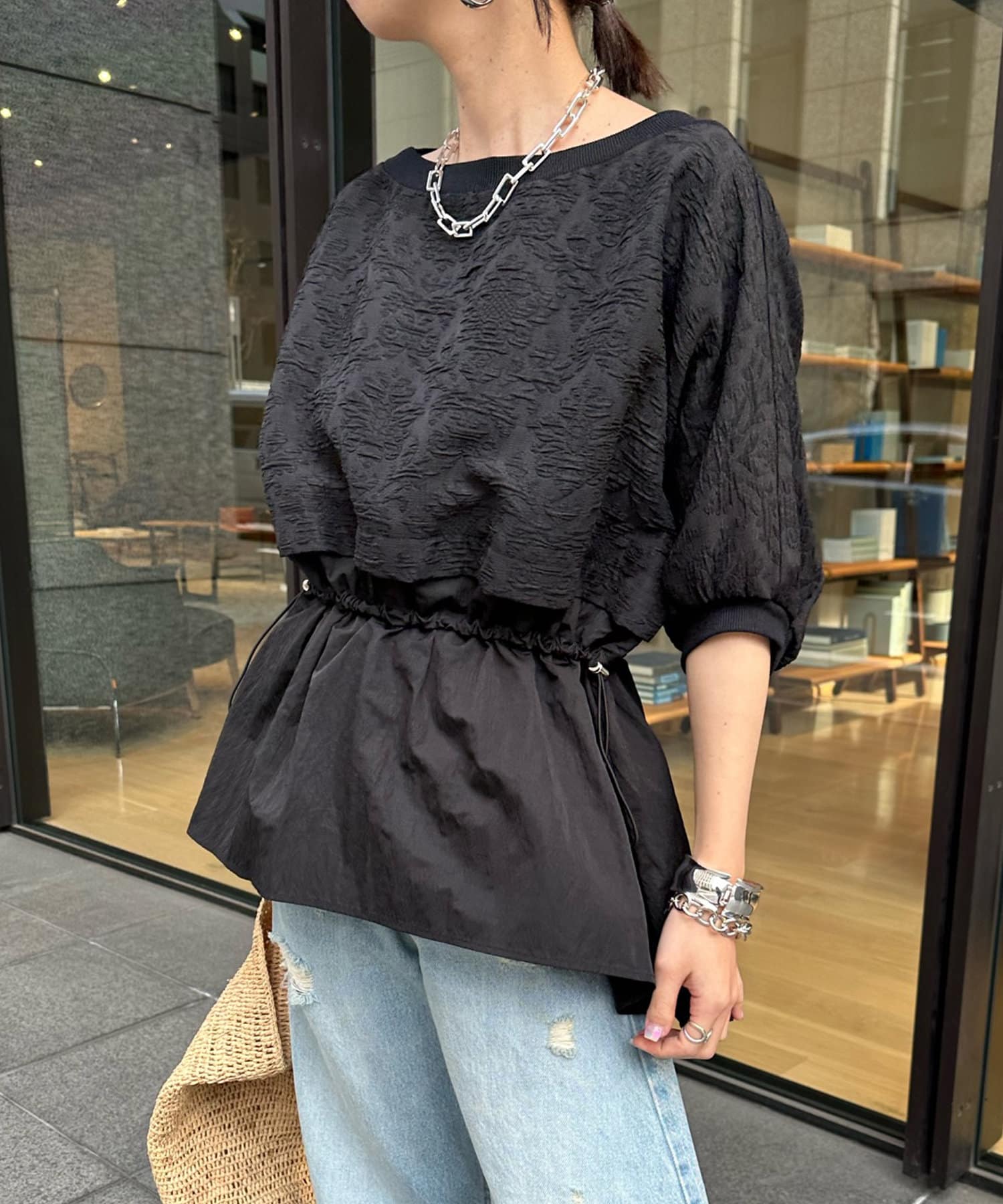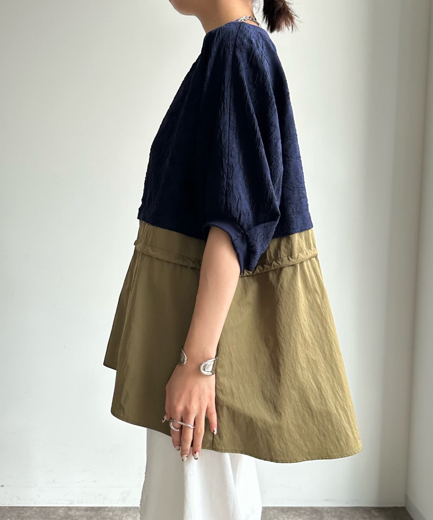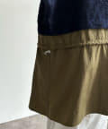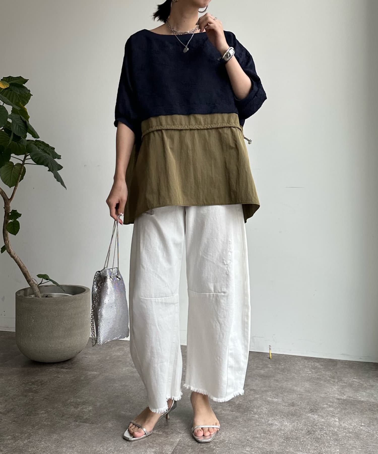 ウエスト下から素材を切り替え、ドロストコードを絞ると広がる裾が女性らしさ抜群。