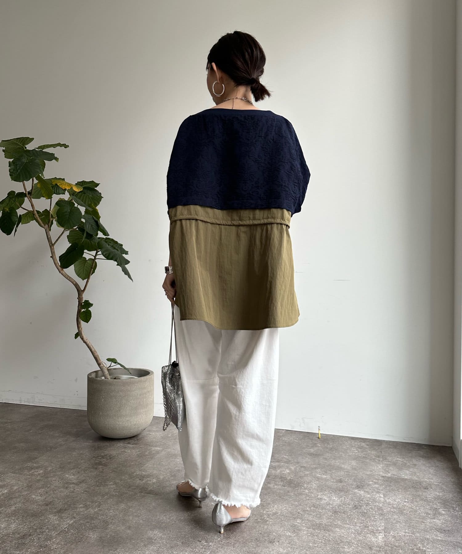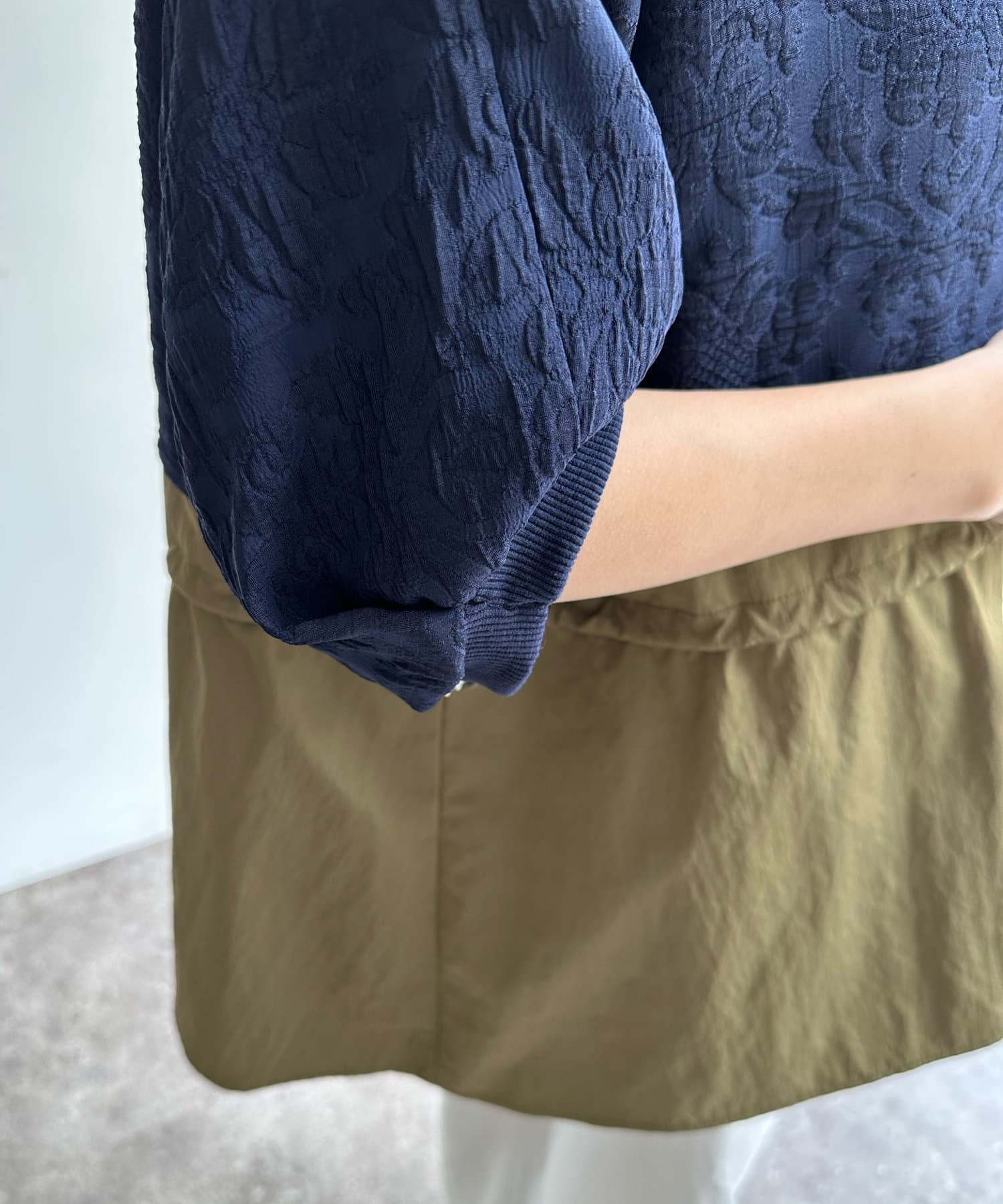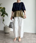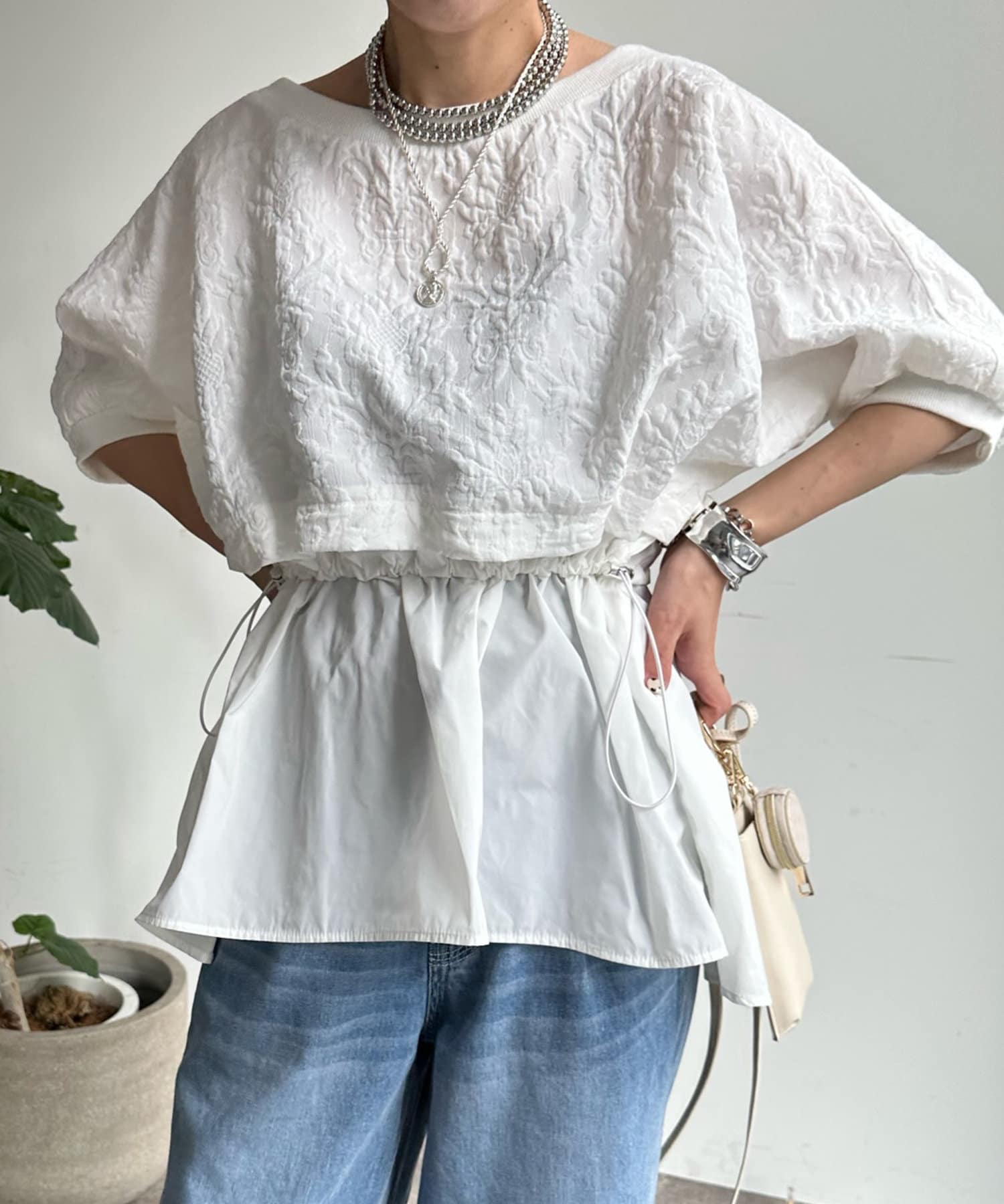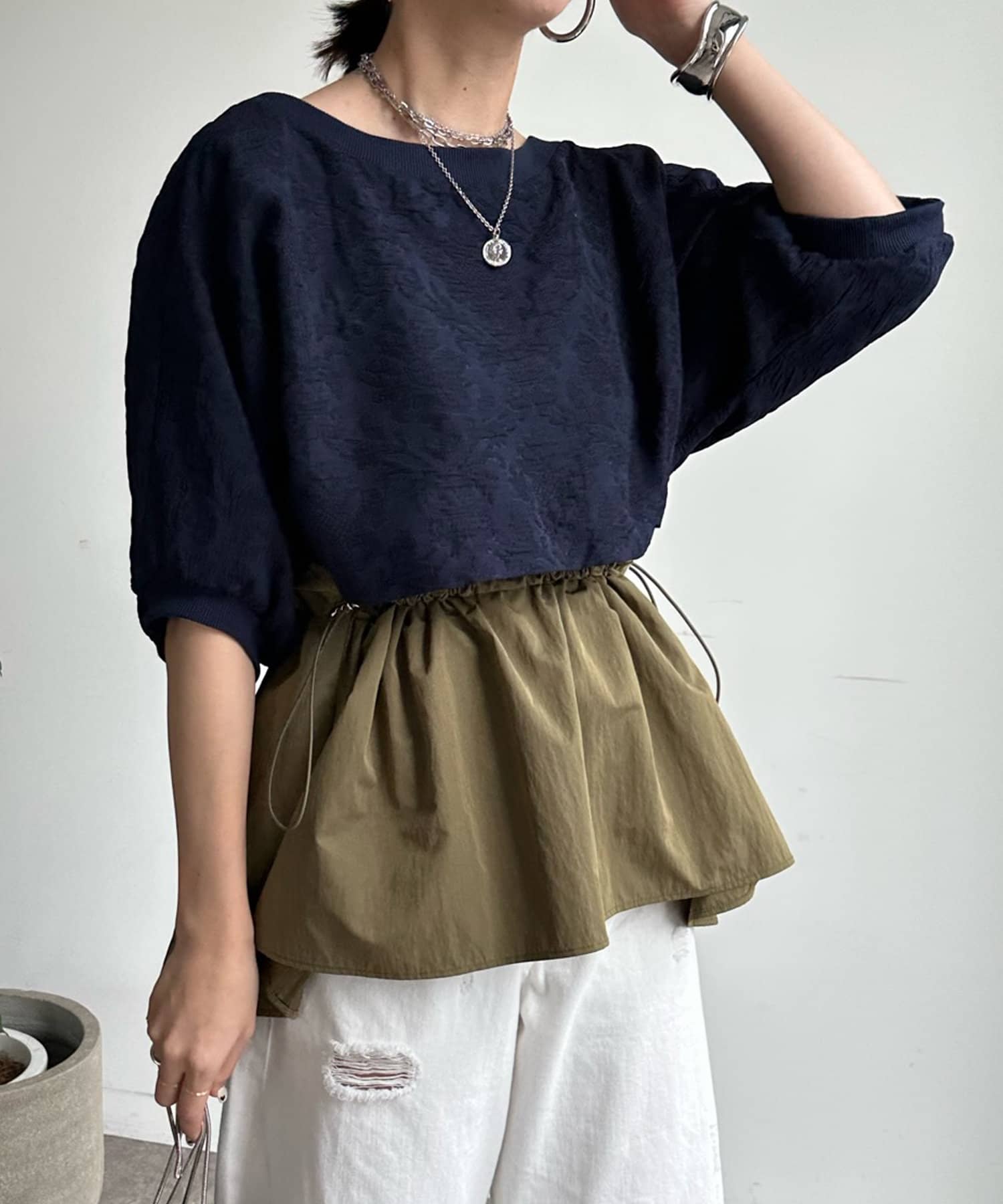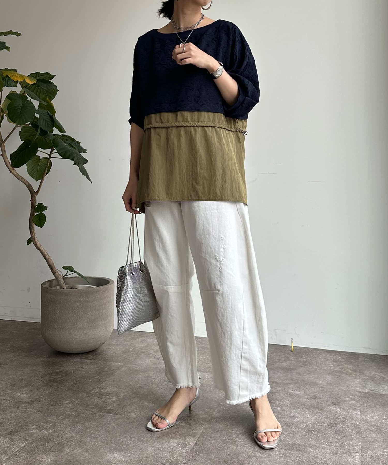 ウエスト下から素材を切り替え、ドロストコードを絞ると広がる裾が女性らしさ抜群。